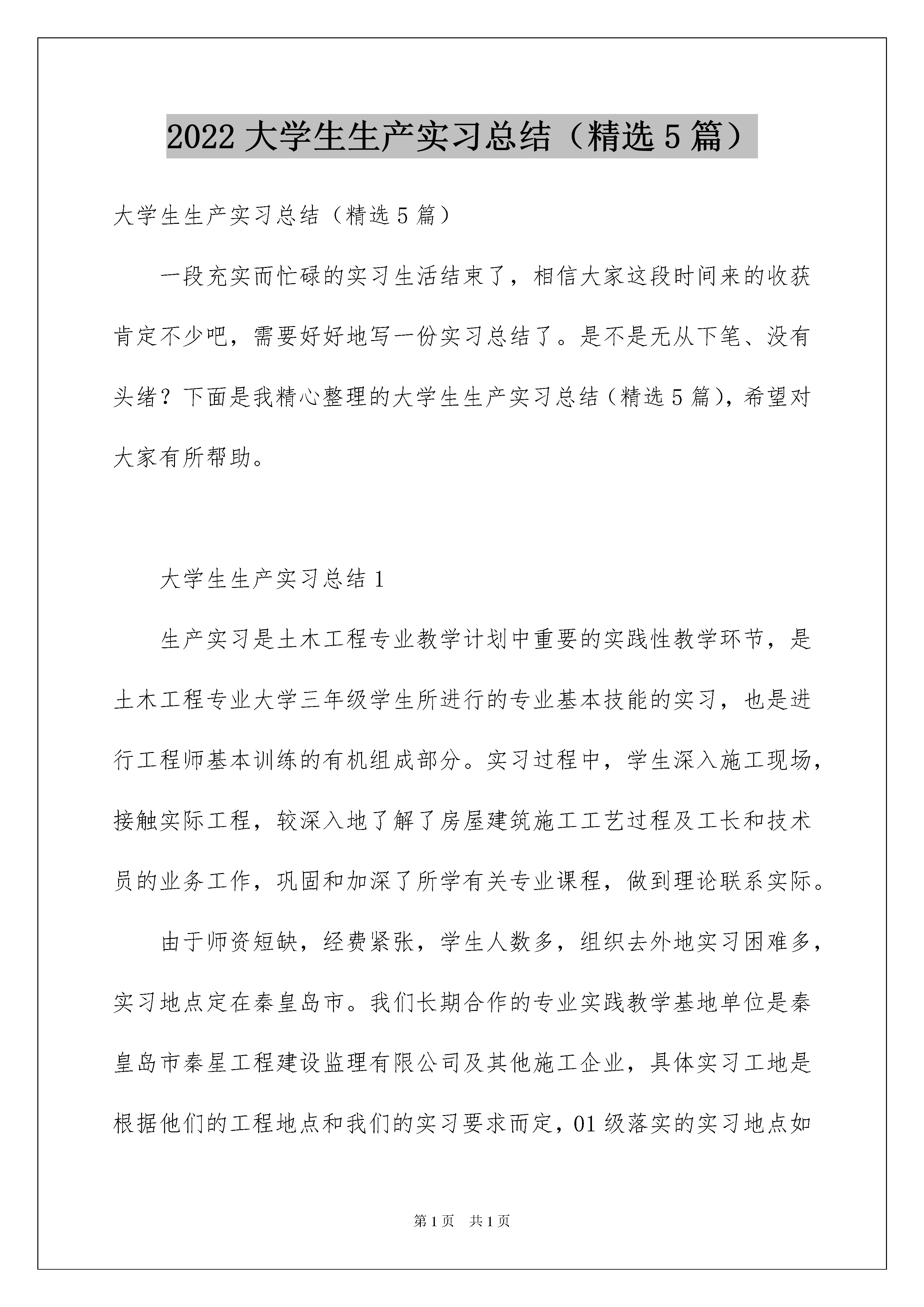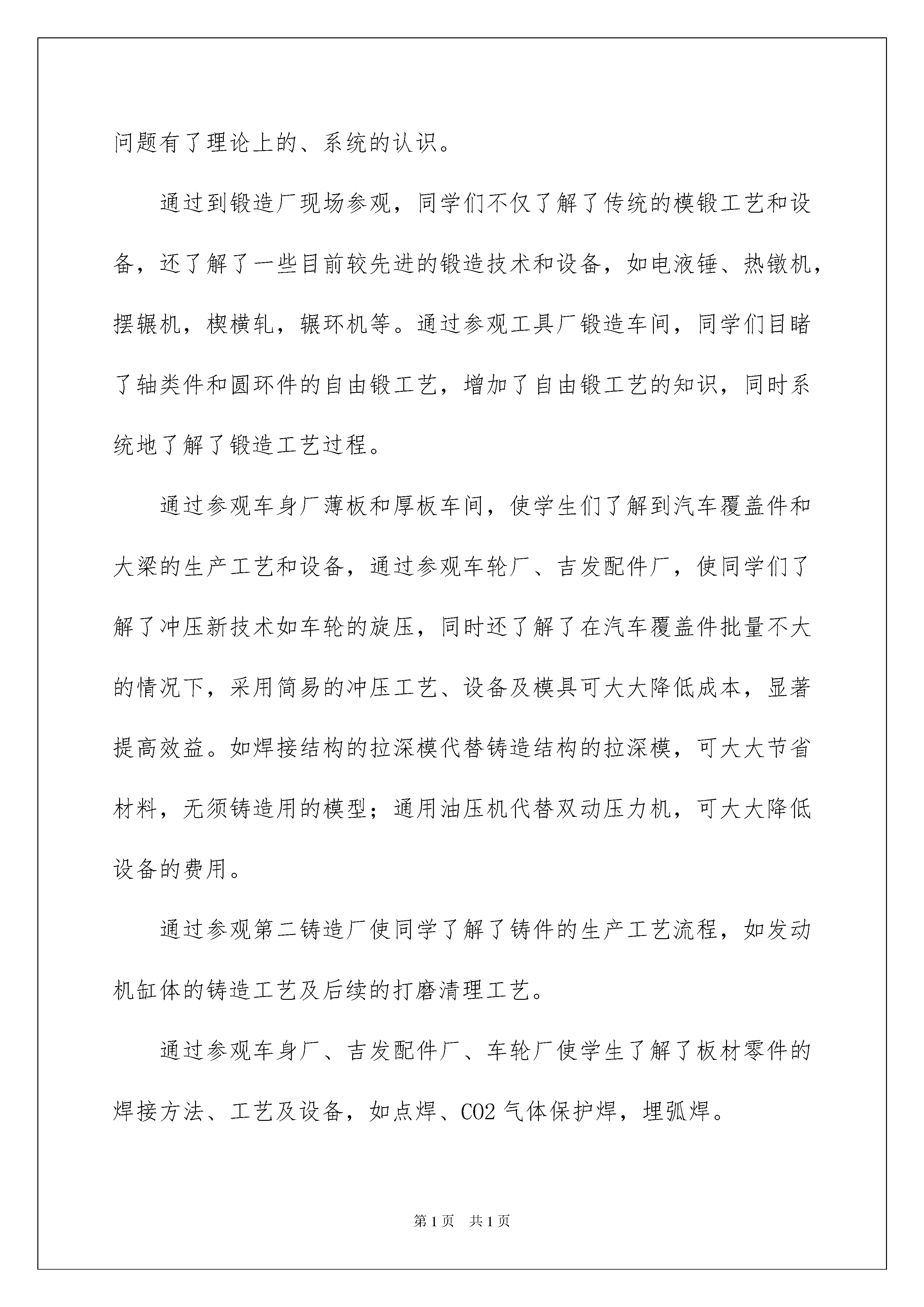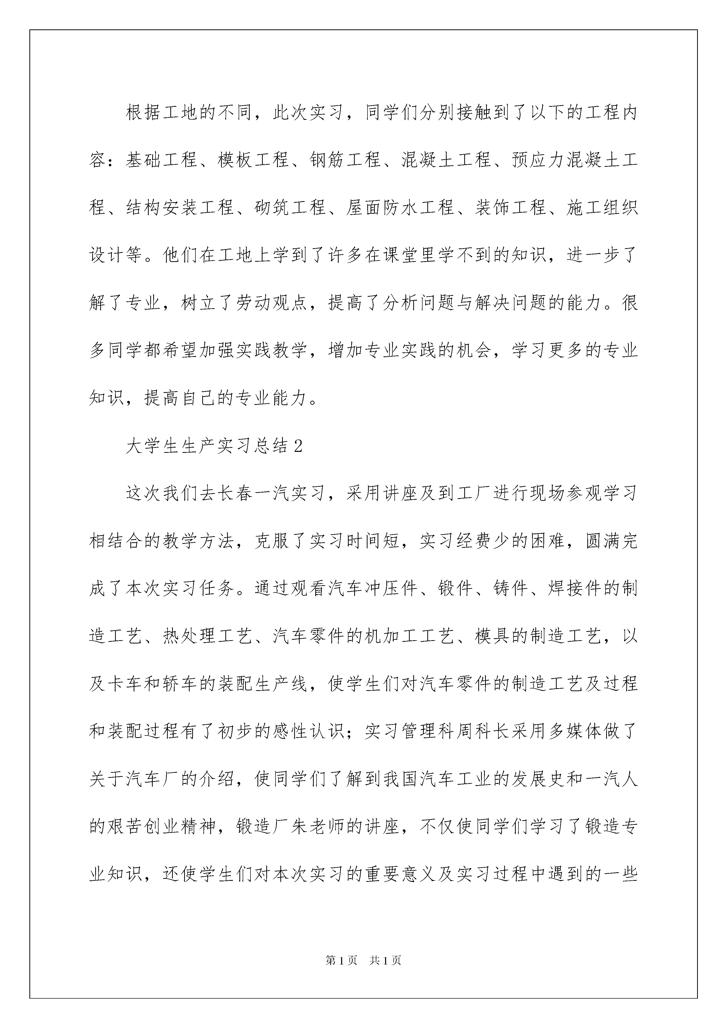 2022大学生生产实习总结(精选5篇)大学生生产实习总结(精选5篇)一段充实而忙碌的实习生活结束了,相信大家这段时间来的收获肯定不少吧,需要好好地写一份实习总结了。是不是无从下笔、没有头绪?下面是我精心整理的大学生生产实习总结(精选5篇),希望对大家有所帮助。大学生生产实习总结1生产实习是土木工程专业教学计划中重要的实践性教学环节,是土木工程专业大学三年级学生所进行的专业基本技能的实习,也是进行工程师基本训练的有机组成部分。实习过程中,学生深入施工现场,接触实际工程,较深入地了解了房屋建筑施工工艺过程及工长和技术员的业务工作,巩固和加深了所学有关专业课程,做到理论联系实际。由于师资短缺,经费紧张,学生人数多,组织去外地实习困难多,实习地点定在秦皇岛市。我们长期合作的专业实践教学基地单位是秦皇岛市秦星工程建设监理有限公司及其他施工企业,具体实习工地是根据他们的工程地点和我们的实习要求而定,01级落实的实习地点如下:开发区专家公寓、天洋新区、报业大厦、清馨家园、海关学校、水果批发市场、三信公司、碧海云天、瑞星雅园、祁连山立交桥、金沙滩、文化广场、建材学校、美雅花园、马房商品房、大秦世家、环保学校、世纪公寓、滨河湾住宅、碧水华庭、渤海皇家花园、秦皇岛中等专业学校等22个工地。实习安排在第六学期期末,《施工技术》与《施工组织》课程结束之后,为期四周,上午七点半出发,下午五点返回,中午在工地休息一小时。每班(按30人计)分成六个实习小组,每组五名学生,每一施工现场安排一组;每2~3名学生由一名现场工长或项目负责人指导;每班安排3名指导教师(每名教师各负责两个工地,工地可能相距较远)负责学生的组织工作,并配合工地负责人指导学生的业务工作。为达到预期的实习效果,并考虑施工现场的复杂性,特制定如下要求和注意事项:1、参加实习的学生应努力完成实习任务,服从实习指导教师和工地指导人的领导。2、学生在施工现场应以工长和技术员助手的身份协助工长和技术员工作,完成工长和技术员分配给自己的生产任务。3、根据实习所在工地的施工阶段,思考《生产实习思考提纲》中的有关问题。4、实习中应虚心向工地技术员和工人师傅学习,遵守施工现场的有关规章制度。5、记好实习日记,写好实习报告。6、按时上下班,不迟到,不早退,因故请假必须经指导教师和工地批准。7、请事假累计不超过三天、病假不超过一周者,可给予延长实习所差时间的机会,否则不得在本次内补偿,不补足所差时间,不能记载实习成绩。8、对于无故旷工达三天以上者,取消本次实习,不得补作,实习成绩按不及格处理。9、注意工地安全,杜绝工伤事故,因违犯操作规程和安全注意事项所造成的一切工伤事故均由自己负责。10、维护学校声誉,搞好与工地的关系,凡对学校声誉造成不良影响者,指导教师有权中断其实习,取消实习资格,实习成绩按不及格处理。根据工地的不同,此次实习,同学们分别接触到了以下的工程内容:基础工程、模板工程、钢筋工程、混凝土工程、预应力混凝土工程、结构安装工程、砌筑工程、屋面防水工程、装饰工程、施工组织设计等。他们在工地上学到了许多在课堂里学不到的知识,进一步了解了专业,树立了劳动观点,提高了分析问题与解决问题的能力。很多同学都希望加强实践教学,增加专业实践的机会,学习更多的专业知识,提高自己的专业能力。大学生生产实习总结2这次我们去长春一汽实习,采用讲座及到工厂进行现场参观学习相结合的教学方法,克服了实习时间短,实习经费少的困难,圆满完成了本次实习任务。通过观看汽车冲压件、锻件、铸件、焊接件的制造工艺、热处理工艺、汽车零件的机加工工艺、模具的制造工艺,以及卡车和轿车的装配生产线,使学生们对汽车零件的制造工艺及过程和装配过程有了初步的感性认识;实习管理科周科长采用多媒体做了关于汽车厂的介绍,使同学们了解到我国汽车工业的发展史和一汽人的艰苦创业精神,锻造厂朱老师的讲座,不仅使同学们学习了锻造专业知识,还使学生们对本次实习的重要意义及实习过程中遇到的一些问题有了理论上的、系统的认识。通过到锻造厂现场参观,同学们不仅了解了传统的模锻工艺和设备,还了解了一些目前较先进的锻造技术和设备,如电液锤、热镦机,摆辗机,楔横轧,辗环机等。通过参观工具厂锻造车间,同学们目睹了轴类件和圆环件的自由锻工艺,增加了自由锻工艺的知识,同时系统地了解了锻造工艺过程。通过参观车身厂薄板和厚板车间,使学生们了解到汽车覆盖件和大梁的生产工艺和设备,通过参观车轮厂、吉发配件厂,使同学们了解了冲压新技术如车轮的旋压,同时还了解了在汽车覆盖件批量不大的情况下,采用简易的冲压工艺、设备及模具可大大降低成本,显著提高效益。