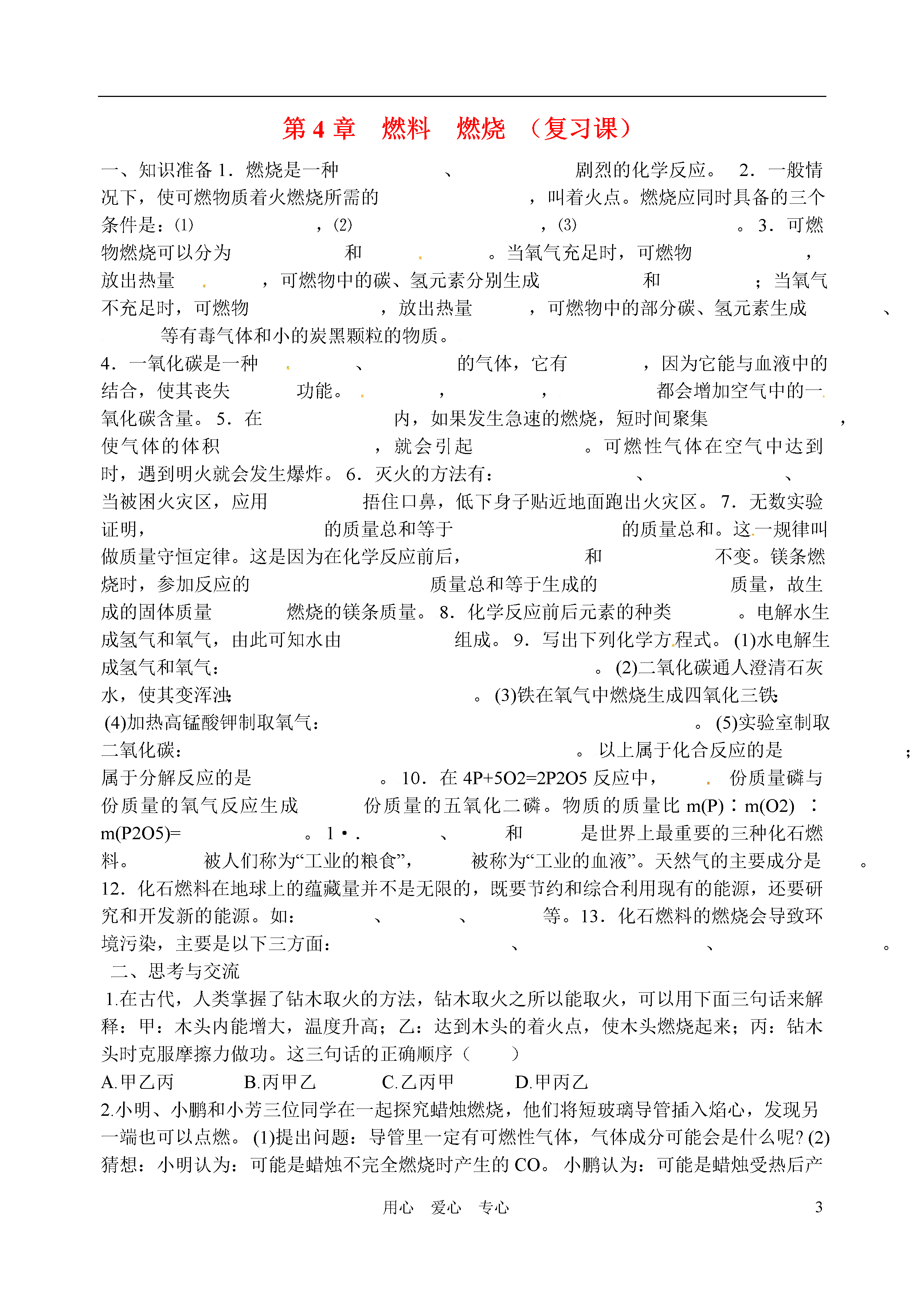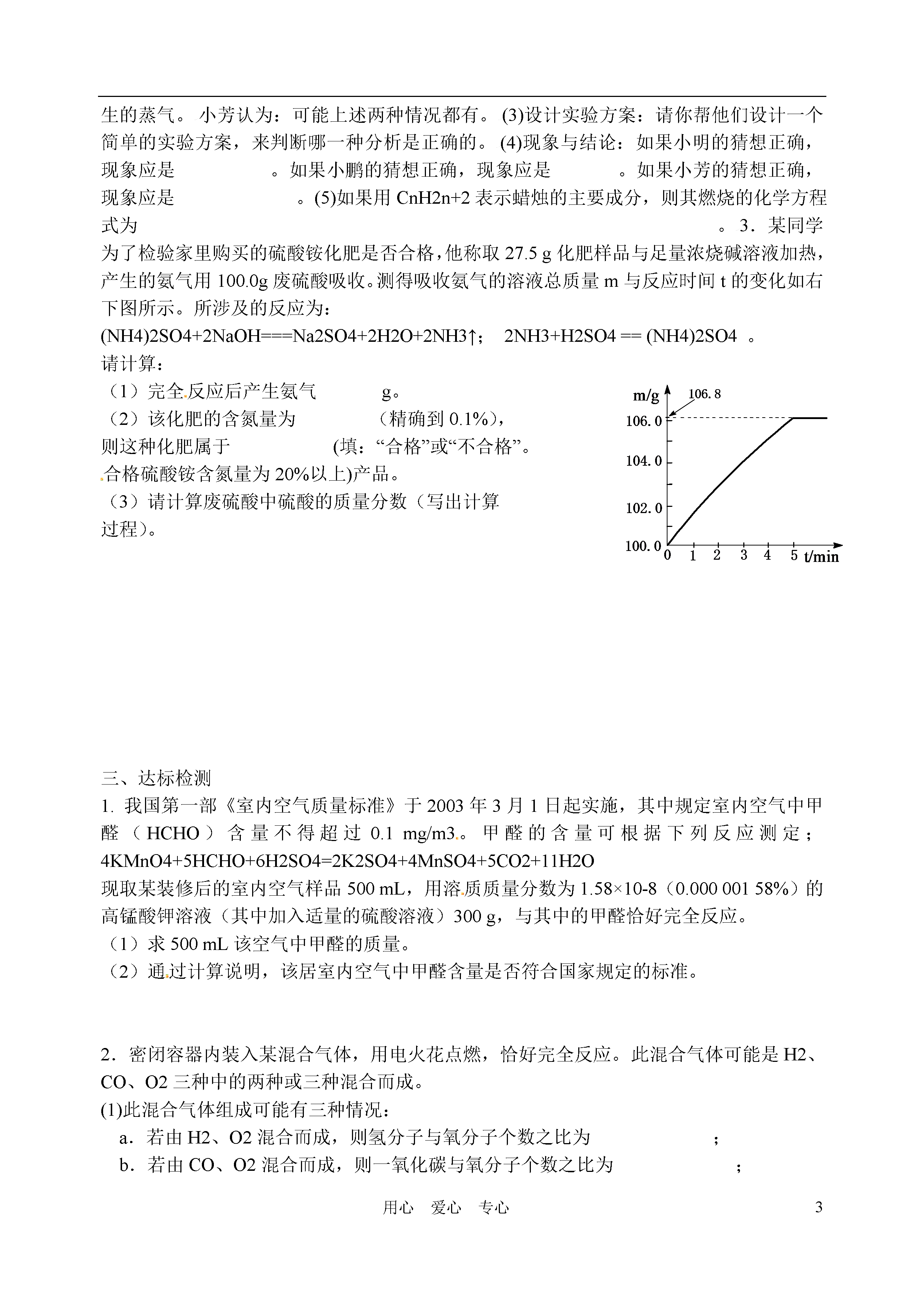 3用心爱心专心第4章燃料燃烧(复习课)一、知识准备1.燃烧是一种、剧烈的化学反应。2.一般情况下,使可燃物质着火燃烧所需的,叫着火点。燃烧应同时具备的三个条件是:⑴,⑵,⑶。3.可燃物燃烧可以分为和。当氧气充足时,可燃物,放出热量,可燃物中的碳、氢元素分别生成和;当氧气不充足时,可燃物,放出热量,可燃物中的部分碳、氢元素生成、等有毒气体和小的炭黑颗粒的物质。4.一氧化碳是一种、的气体,它有,因为它能与血液中的结合,使其丧失功能。,,都会增加空气中的一氧化碳含量。5.在内,如果发生急速的燃烧,短时间聚集,使气体的体积,就会引起。可燃性气体在空气中达到时,遇到明火就会发生爆炸。6.灭火的方法有:、、。当被困火灾区,应用捂住口鼻,低下身子贴近地面跑出火灾区。7.无数实验证明,的质量总和等于的质量总和。这一规律叫做质量守恒定律。这是因为在化学反应前后,和不变。镁条燃烧时,参加反应的质量总和等于生成的质量,故生成的固体质量燃烧的镁条质量。8.化学反应前后元素的种类。电解水生成氢气和氧气,由此可知水由组成。9.写出下列化学方程式。(1)水电解生成氢气和氧气:。(2)二氧化碳通人澄清石灰水,使其变浑浊:。(3)铁在氧气中燃烧生成四氧化三铁:。(4)加热高锰酸钾制取氧气:。(5)实验室制取二氧化碳:。以上属于化合反应的是;属于分解反应的是。10.在4P+5O2=2P2O5反应中,份质量磷与份质量的氧气反应生成份质量的五氧化二磷。物质的质量比m(P)∶m(O2)∶m(P2O5)=。1·.、和是世界上最重要的三种化石燃料。被人们称为“工业的粮食”,被称为“工业的血液”。天然气的主要成分是。12.化石燃料在地球上的蕴藏量并不是无限的,既要节约和综合利用现有的能源,还要研究和开发新的能源。如:、、等。13.化石燃料的燃烧会导致环境污染,主要是以下三方面:、、。二、思考与交流1.在古代,人类掌握了钻木取火的方法,钻木取火之所以能取火,可以用下面三句话来解释:甲:木头内能增大,温度升高;乙:达到木头的着火点,使木头燃烧起来;丙:钻木头时克服摩擦力做功。这三句话的正确顺序()A.甲乙丙B.丙甲乙C.乙丙甲D.甲丙乙2.小明、小鹏和小芳三位同学在一起探究蜡烛燃烧,他们将短玻璃导管插入焰心,发现另一端也可以点燃。(1)提出问题:导管里一定有可燃性气体,气体成分可能会是什么呢?(2)猜想:小明认为:可能是蜡烛不完全燃烧时产生的CO。小鹏认为:可能是蜡烛受热后产生的蒸气。小芳认为:可能上述两种情况都有。(3)设计实验方案:请你帮他们设计一个简单的实验方案,来判断哪一种分析是正确的。(4)现象与结论:如果小明的猜想正确,现象应是。如果小鹏的猜想正确,现象应是。如果小芳的猜想正确,现象应是。(5)如果用CnH2n+2表示蜡烛的主要成分,则其燃烧的化学方程式为。3.某同学为了检验家里购买的硫酸铵化肥是否合格,他称取27.5g化肥样品与足量浓烧碱溶液加热,产生的氨气用100.0g废硫酸吸收。测得吸收氨气的溶液总质量m与反应时间t的变化如右下图所示。所涉及的反应为:(NH4)2SO4+2NaOH===Na2SO4+2H2O+2NH3↑;2NH3+H2SO4==(NH4)2SO4。请计算:(1)完全反应后产生氨气g。(2)该化肥的含氮量为(精确到0.1%),则这种化肥属于(填:“合格”或“不合格”。合格硫酸铵含氮量为20%以上)产品。(3)请计算废硫酸中硫酸的质量分数(写出计算过程)。三、达标检测1.我国第一部《室内空气质量标准》于2003年3月1日起实施,其中规定室内空气中甲醛(HCHO)含量不得超过0.1mg/m3。甲醛的含量可根据下列反应测定;4KMnO4+5HCHO+6H2SO4=2K2SO4+4MnSO4+5CO2+11H2O现取某装修后的室内空气样品500mL,用溶质质量分数为1.58×10-8(0.00000158%)的高锰酸钾溶液(其中加入适量的硫酸溶液)300g,与其中的甲醛恰好完全反应。(1)求500mL该空气中甲醛的质量。(2)通过计算说明,该居室内空气中甲醛含量是否符合国家规定的标准。2.密闭容器内装入某混合气体,用电火花点燃,恰好完全反应。此混合气体可能是H2、CO、O2三种中的两种或三种混合而成。(1)此混合气体组成可能有三种情况:a.若由H2、O2混合而成,则氢分子与氧分子个数之比为;b.若由CO、O2混合而成,则一氧化碳与氧分子个数之比为;c.若由组成,则。(2)若此混合气体肯定由O232g和其他两种气体组成,讨论各成分气体间的质量关系。a.在混合气体总质量为62g这一特定情况下,H2、CO、O2三者质量之比为;b.在混合气体总质量不作规定