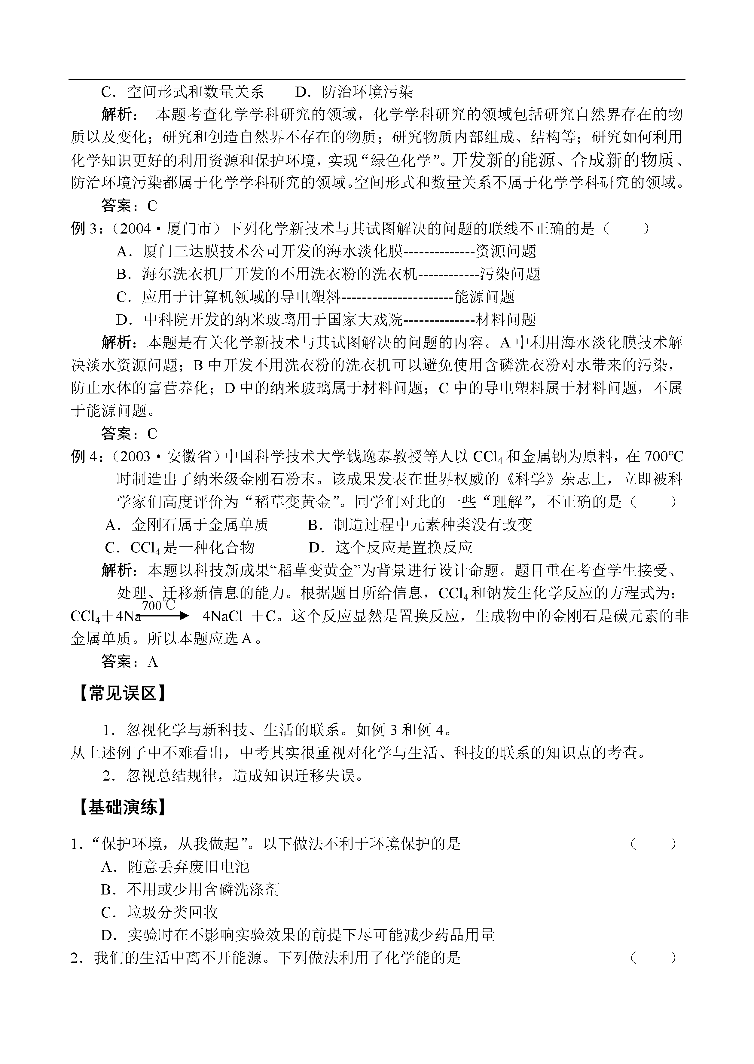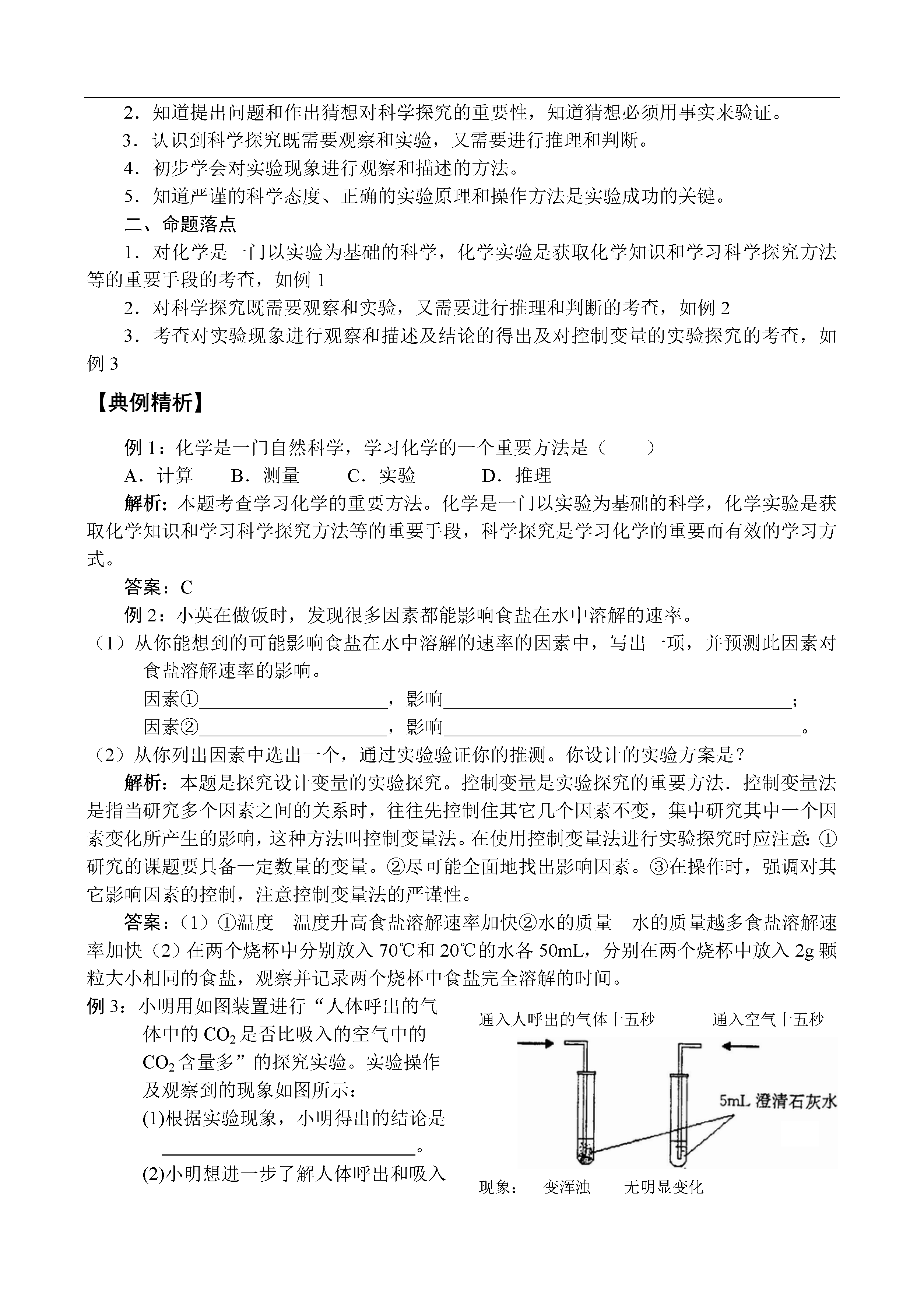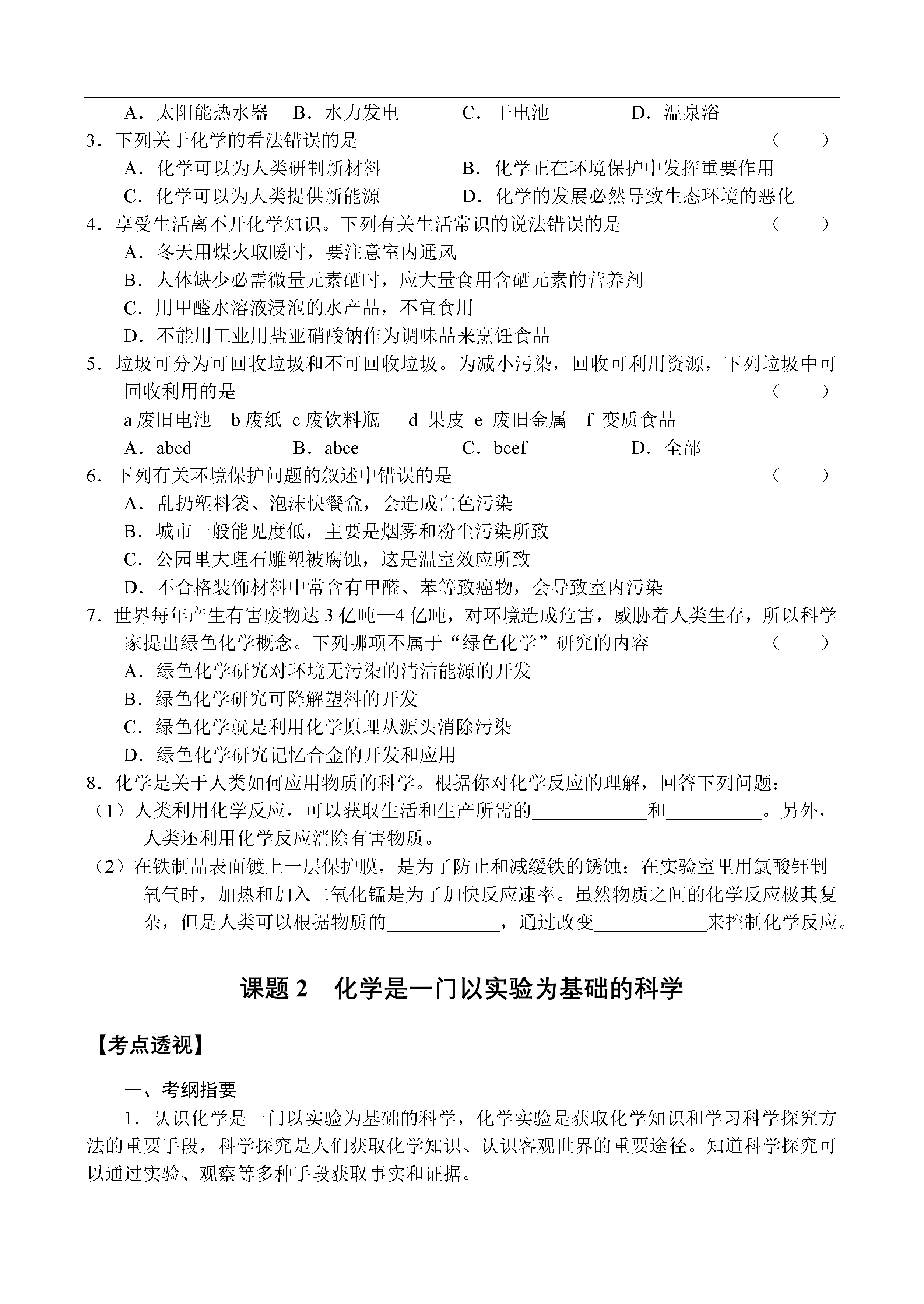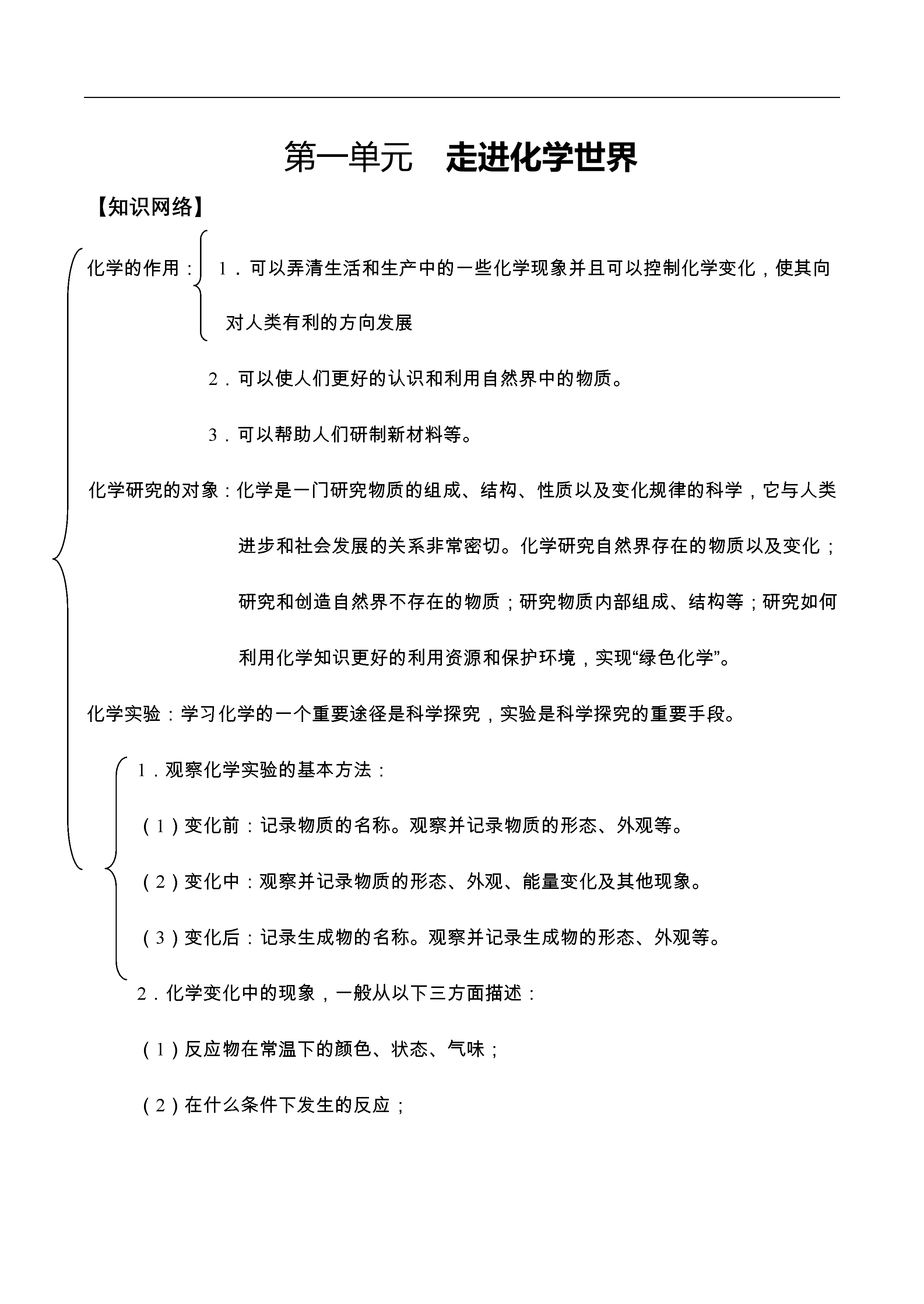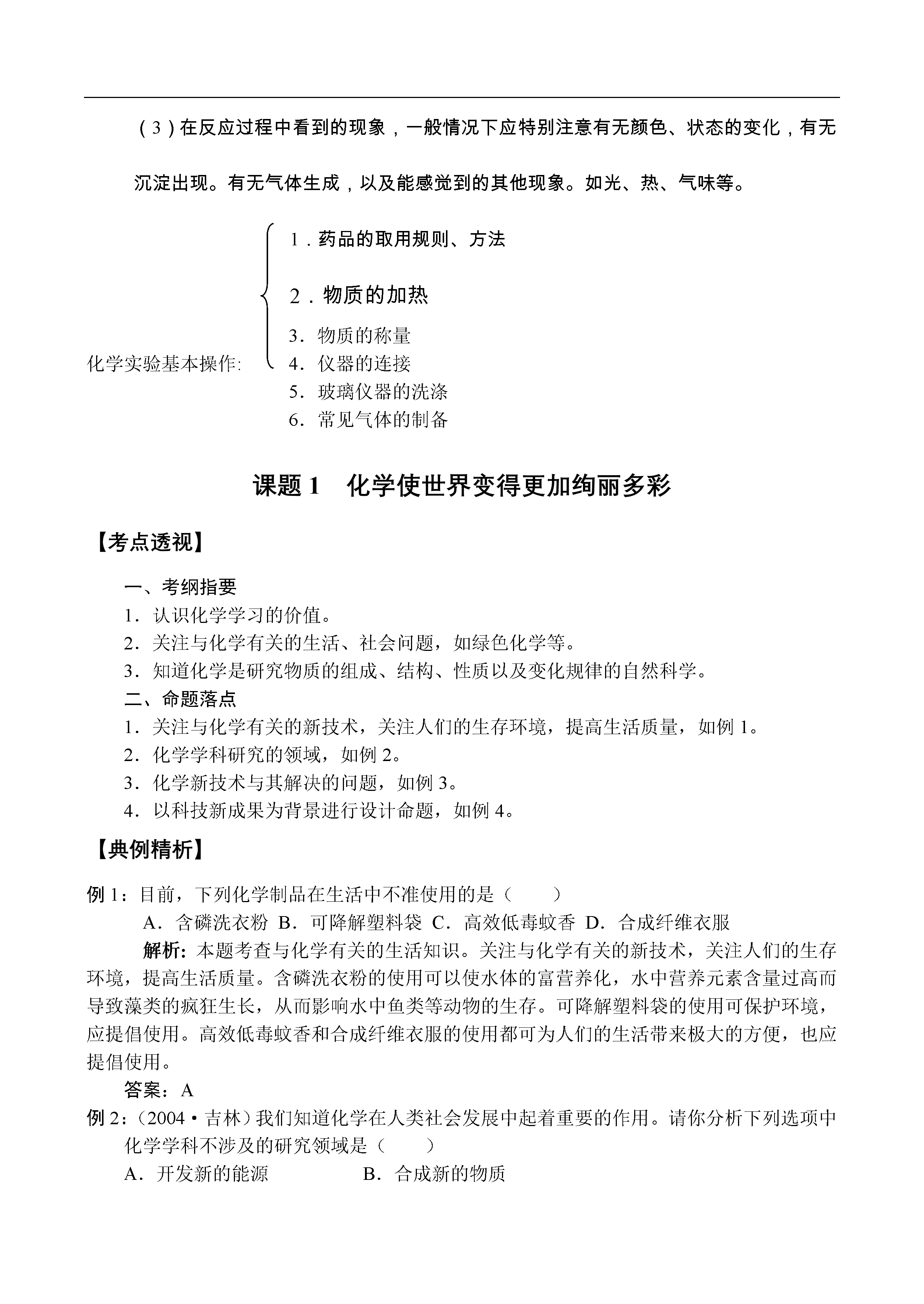 第一单元走进化学世界【知识网络】化学的作用:1.可以弄清生活和生产中的一些化学现象并且可以控制化学变化,使其向对人类有利的方向发展2.可以使人们更好的认识和利用自然界中的物质。3.可以帮助人们研制新材料等。化学研究的对象:化学是一门研究物质的组成、结构、性质以及变化规律的科学,它与人类进步和社会发展的关系非常密切。化学研究自然界存在的物质以及变化;研究和创造自然界不存在的物质;研究物质内部组成、结构等;研究如何利用化学知识更好的利用资源和保护环境,实现“绿色化学”。化学实验:学习化学的一个重要途径是科学探究,实验是科学探究的重要手段。1.观察化学实验的基本方法:(1)变化前:记录物质的名称。观察并记录物质的形态、外观等。(2)变化中:观察并记录物质的形态、外观、能量变化及其他现象。(3)变化后:记录生成物的名称。观察并记录生成物的形态、外观等。2.化学变化中的现象,一般从以下三方面描述:(1)反应物在常温下的颜色、状态、气味;(2)在什么条件下发生的反应;(3)在反应过程中看到的现象,一般情况下应特别注意有无颜色、状态的变化,有无沉淀出现。有无气体生成,以及能感觉到的其他现象。如光、热、气味等。1.药品的取用规则、方法2.物质的加热3.物质的称量化学实验基本操作:4.仪器的连接5.玻璃仪器的洗涤1,3,56.常见气体的制备课题1化学使世界变得更加绚丽多彩【考点透视】一、考纲指要1.认识化学学习的价值。2.关注与化学有关的生活、社会问题,如绿色化学等。3.知道化学是研究物质的组成、结构、性质以及变化规律的自然科学。二、命题落点1.关注与化学有关的新技术,关注人们的生存环境,提高生活质量,如例1。2.化学学科研究的领域,如例2。3.化学新技术与其解决的问题,如例3。4.以科技新成果为背景进行设计命题,如例4。【典例精析】例1:目前,下列化学制品在生活中不准使用的是()A.含磷洗衣粉B.可降解塑料袋C.高效低毒蚊香D.合成纤维衣服解析:本题考查与化学有关的生活知识。关注与化学有关的新技术,关注人们的生存环境,提高生活质量。含磷洗衣粉的使用可以使水体的富营养化,水中营养元素含量过高而导致藻类的疯狂生长,从而影响水中鱼类等动物的生存。可降解塑料袋的使用可保护环境,应提倡使用。高效低毒蚊香和合成纤维衣服的使用都可为人们的生活带来极大的方便,也应提倡使用。答案:A例2:(2004·吉林)我们知道化学在人类社会发展中起着重要的作用。请你分析下列选项中化学学科不涉及的研究领域是()A.开发新的能源B.合成新的物质C.空间形式和数量关系D.防治环境污染解析:本题考查化学学科研究的领域,化学学科研究的领域包括研究自然界存在的物质以及变化;研究和创造自然界不存在的物质;研究物质内部组成、结构等;研究如何利用化学知识更好的利用资源和保护环境,实现“绿色化学”。开发新的能源、合成新的物质、防治环境污染都属于化学学科研究的领域。空间形式和数量关系不属于化学学科研究的领域。答案:C例3:(2004·厦门市)下列化学新技术与其试图解决的问题的联线不正确的是()A.厦门三达膜技术公司开发的海水淡化膜--------------资源问题B.海尔洗衣机厂开发的不用洗衣粉的洗衣机------------污染问题C.应用于计算机领域的导电塑料----------------------能源问题D.中科院开发的纳米玻璃用于国家大戏院--------------材料问题解析:本题是有关化学新技术与其试图解决的问题的内容。A中利用海水淡化膜技术解决淡水资源问题;B中开发不用洗衣粉的洗衣机可以避免使用含磷洗衣粉对水带来的污染,防止水体的富营养化;D中的纳米玻璃属于材料问题;C中的导电塑料属于材料问题,不属于能源问题。答案:C例4:(2003·安徽省)中国科学技术大学钱逸泰教授等人以CCl4和金属钠为原料,在700℃时制造出了纳米级金刚石粉末。该成果发表在世界权威的《科学》杂志上,立即被科学家们高度评价为“稻草变黄金”。同学们对此的一些“理解”,不正确的是()A.金刚石属于金属单质B.制造过程中元素种类没有改变C.CCl4是一种化合物D.这个反应是置换反应解析:本题以科技新成果“稻草变黄金”为背景进行设计命题。题目重在考查学生接受、处理、迁移新信息的能力。根据题目所给信息,CCl4和钠发生化学反应的方程式为:700℃CCl4+4Na4NaCl+C。这个反应显然是置换反应,生成物中的金刚石是碳元素的非金属单质。所以本题应选A。答案:A【常见误区】1.忽视化学与新科技、生活的联系。如例3和例4。从上述例子中不难看出,中考其实很重视对化学与生活、科技的联