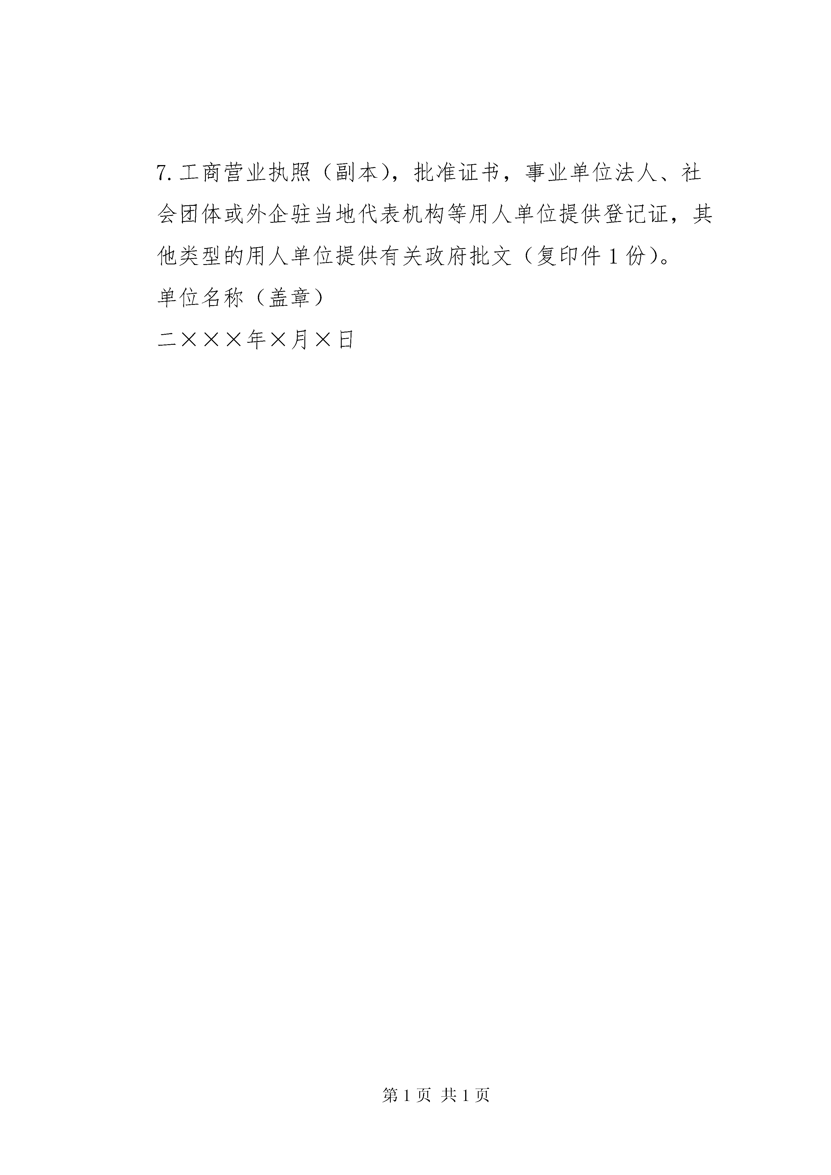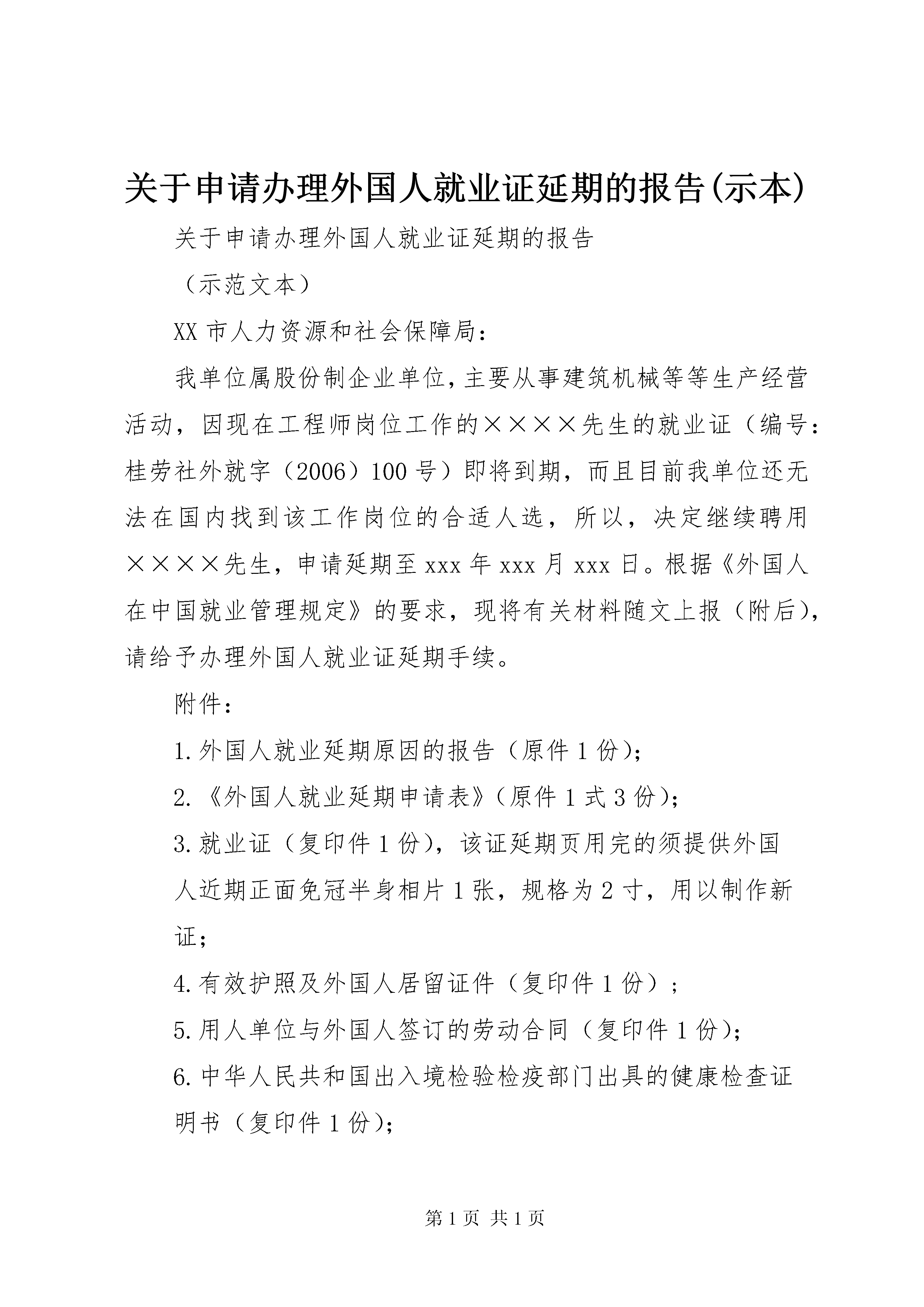 关于申请办理外国人就业证延期的报告(示本)关于申请办理外国人就业证延期的报告(示范文本)XX市人力资源和社会保障局:我单位属股份制企业单位,主要从事建筑机械等等生产经营活动,因现在工程师岗位工作的××××先生的就业证(编号:桂劳社外就字(2006)100号)即将到期,而且目前我单位还无法在国内找到该工作岗位的合适人选,所以,决定继续聘用××××先生,申请延期至xxx年xxx月xxx日。根据《外国人在中国就业管理规定》的要求,现将有关材料随文上报(附后),请给予办理外国人就业证延期手续。附件:1.外国人就业延期原因的报告(原件1份);2.《外国人就业延期申请表》(原件1式3份);3.就业证(复印件1份),该证延期页用完的须提供外国人近期正面免冠半身相片1张,规格为2寸,用以制作新证;4.有效护照及外国人居留证件(复印件1份);5.用人单位与外国人签订的劳动合同(复印件1份);6.中华人民共和国出入境检验检疫部门出具的健康检查证明书(复印件1份);7.工商营业执照(副本),批准证书,事业单位法人、社会团体或外企驻当地代表机构等用人单位提供登记证,其他类型的用人单位提供有关政府批文(复印件1份)。单位名称(盖章)二×××年×月×日