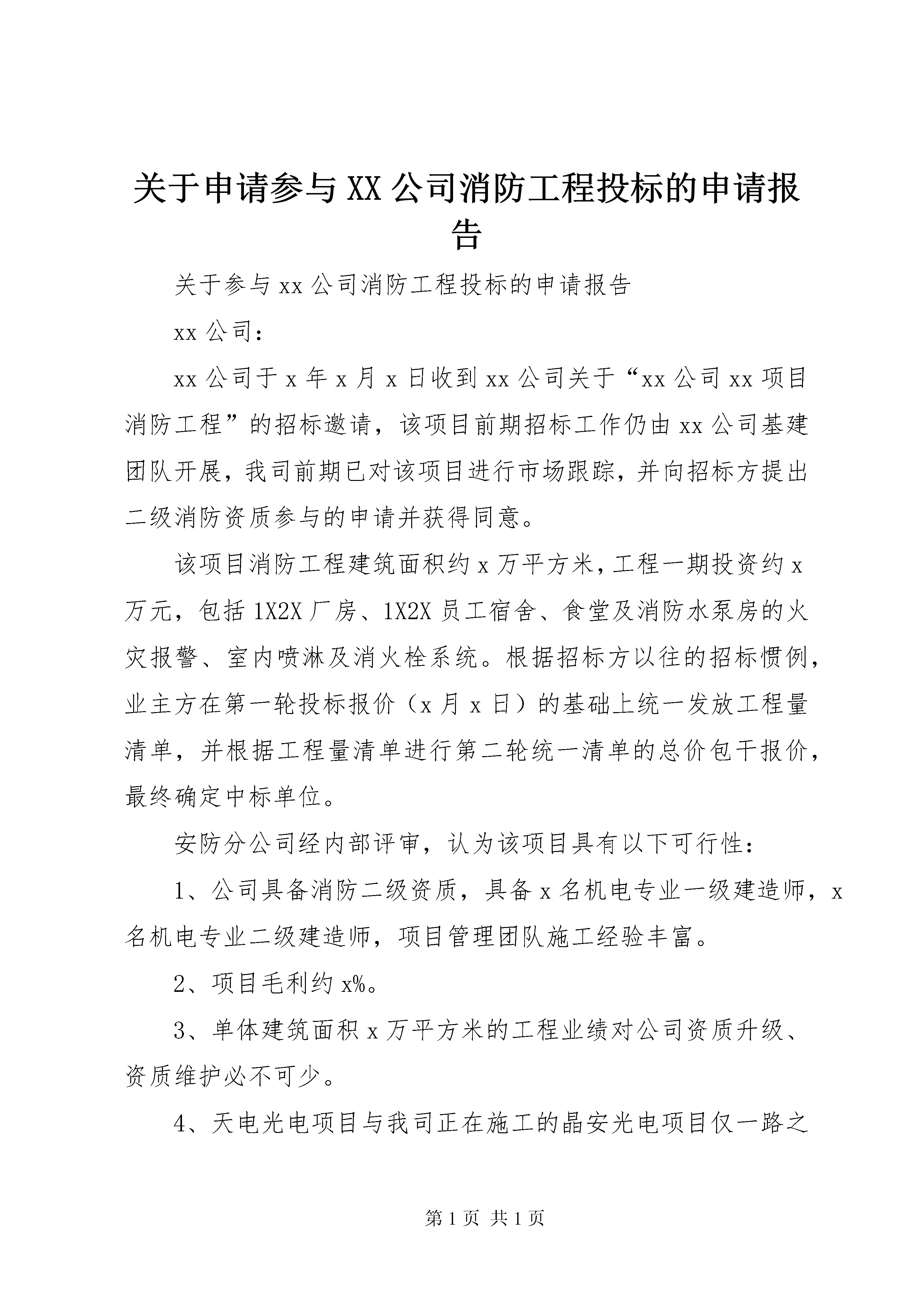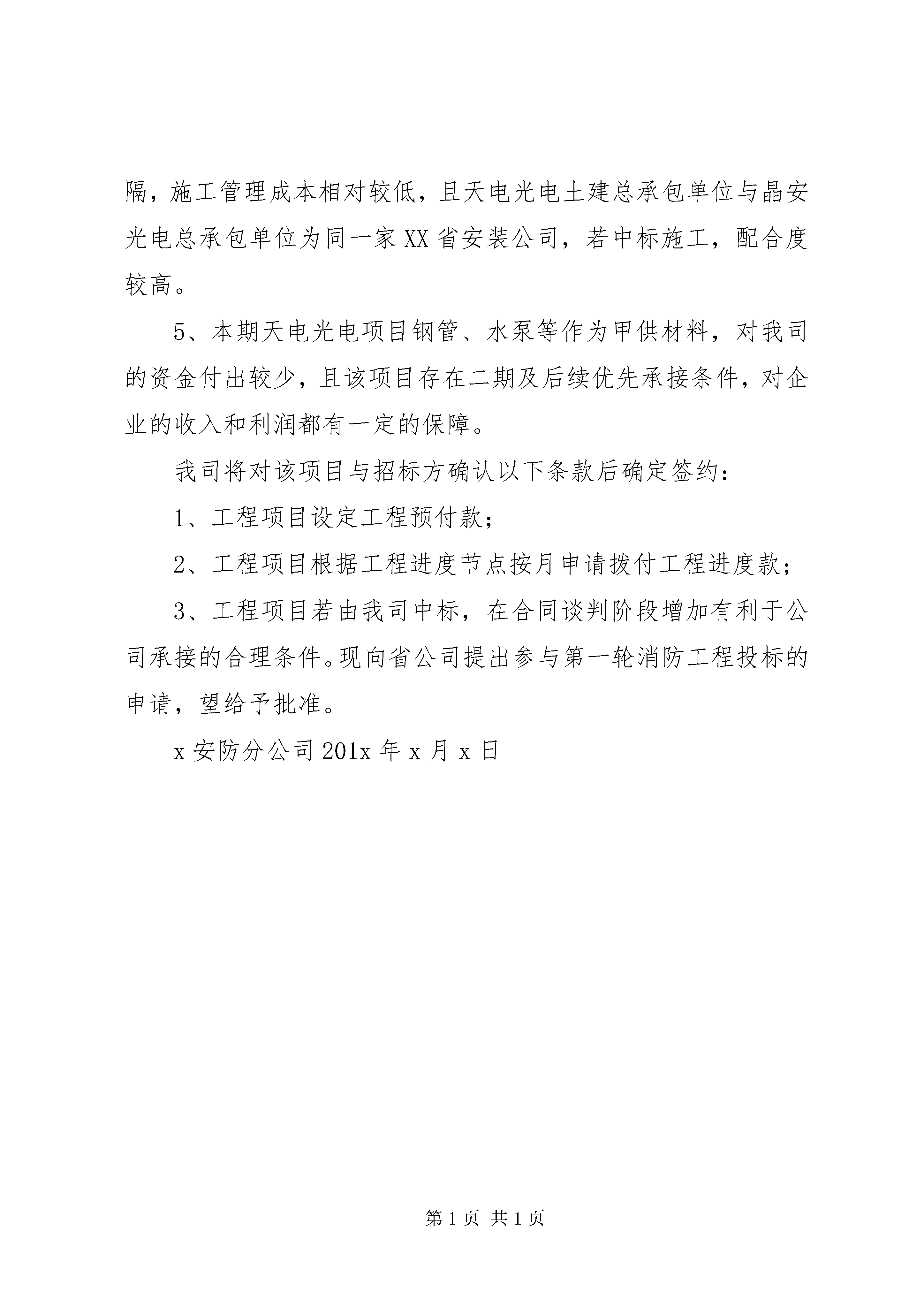 关于申请参与XX公司消防工程投标的申请报告关于参与xx公司消防工程投标的申请报告xx公司:xx公司于x年x月x日收到xx公司关于“xx公司xx项目消防工程”的招标邀请,该项目前期招标工作仍由xx公司基建团队开展,我司前期已对该项目进行市场跟踪,并向招标方提出二级消防资质参与的申请并获得同意。该项目消防工程建筑面积约x万平方米,工程一期投资约x万元,包括1X2X厂房、1X2X员工宿舍、食堂及消防水泵房的火灾报警、室内喷淋及消火栓系统。根据招标方以往的招标惯例,业主方在第一轮投标报价(x月x日)的基础上统一发放工程量清单,并根据工程量清单进行第二轮统一清单的总价包干报价,最终确定中标单位。安防分公司经内部评审,认为该项目具有以下可行性:1、公司具备消防二级资质,具备x名机电专业一级建造师,x名机电专业二级建造师,项目管理团队施工经验丰富。2、项目毛利约x%。3、单体建筑面积x万平方米的工程业绩对公司资质升级、资质维护必不可少。4、天电光电项目与我司正在施工的晶安光电项目仅一路之隔,施工管理成本相对较低,且天电光电土建总承包单位与晶安光电总承包单位为同一家XX省安装公司,若中标施工,配合度较高。5、本期天电光电项目钢管、水泵等作为甲供材料,对我司的资金付出较少,且该项目存在二期及后续优先承接条件,对企业的收入和利润都有一定的保障。我司将对该项目与招标方确认以下条款后确定签约:1、工程项目设定工程预付款;2、工程项目根据工程进度节点按月申请拨付工程进度款;3、工程项目若由我司中标,在合同谈判阶段增加有利于公司承接的合理条件。现向省公司提出参与第一轮消防工程投标的申请,望给予批准。x安防分公司201x年x月x日