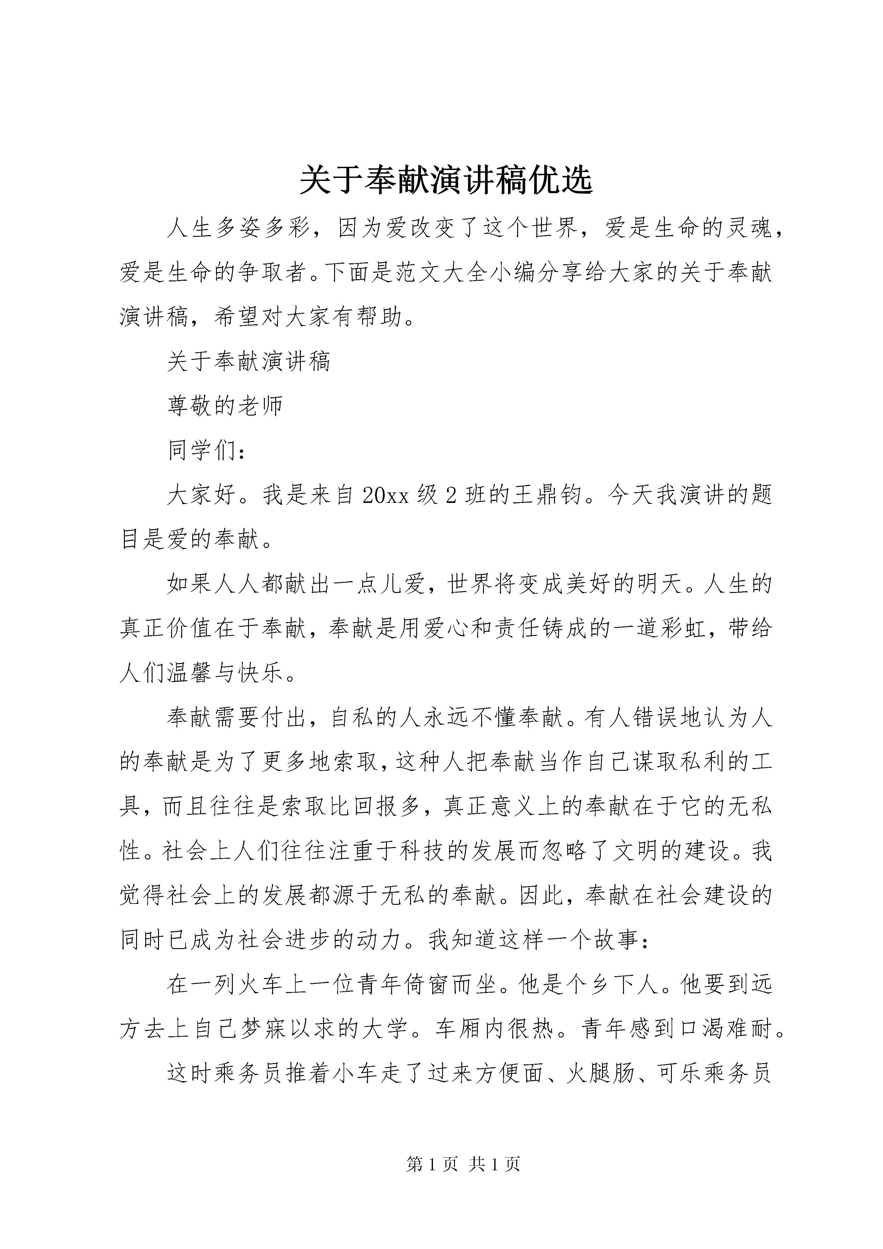关于奉献演讲稿优选人生多姿多彩,因为爱改变了这个世界,爱是生命的灵魂,爱是生命的争取者。下面是范文大全小编分享给大家的关于奉献演讲稿,希望对大家有帮助。关于奉献演讲稿尊敬的老师同学们:大家好。我是来自20xx级2班的王鼎钧。今天我演讲的题目是爱的奉献。如果人人都献出一点儿爱,世界将变成美好的明天。人生的真正价值在于奉献,奉献是用爱心和责任铸成的一道彩虹,带给人们温馨与快乐。奉献需要付出,自私的人永远不懂奉献。有人错误地认为人的奉献是为了更多地索取,这种人把奉献当作自己谋取私利的工具,而且往往是索取比回报多,真正意义上的奉献在于它的无私性。社会上人们往往注重于科技的发展而忽略了文明的建设。我觉得社会上的发展都源于无私的奉献。因此,奉献在社会建设的同时已成为社会进步的动力。我知道这样一个故事:在一列火车上一位青年倚窗而坐。他是个乡下人。他要到远方去上自己梦寐以求的大学。车厢内很热。青年感到口渴难耐。这时乘务员推着小车走了过来方便面、火腿肠、可乐乘务员大声反复叫卖着。青年知道,可乐是一种极奢侈的饮料。爸妈从来没给自己买过。如今,衣兜里有些自己可以支配的零花钱。犹豫再三,他从衣兜里摸出一张皱巴巴的5元,递给了乘务员。青年不知道如何开启这听饮料。他把可乐拿在手里,颠来倒去地仔细看了看。最后,他把目光定在了拉环的位置。迟疑了一会儿,他企图用手在拉环的位置把可乐撬开,撬了两下,无济于事便停了下来。这时,对面的妇女对女儿说童童,快把可乐拿给妈妈。小女孩说可妈妈,你刚喝了水,怎么又渴了。快。听话。小男孩便从车窗旁边挂着的塑料袋里拿出了可乐。妇女把可乐拿在手中,只听砰地一声,可乐打开了。随之,青年的可乐也打开了。妇女微微地笑了一下,喝了一口,就把可乐放在了茶几上。显然,她并不渴。青年望着这位素不相识的妇女,咧开嘴笑了。在他眼里,妇女的举动是一种小小的善。他们以无私的奉献实现了自己的人生价值,为社会进步做出巨大贡献,被世人称颂,为社会献着美丽光芒。其实还有更多的人在默默地奉献。奉献的火焰并没熄灭。在社会的每一个角落里,它,曾与我们擦身而过。落红不是无情物,化作春泥更护花。人并非为获取而给予;给予本身即是无与伦比的欢乐;对人来说,的欢乐,的幸福是把自己的精神力量奉献给他人。我的演讲完了谢谢大家。关于奉献演讲稿尊敬各位评委、各位朋友:大家好。我叫张彩霞来自松林小学今天我演讲题目是《青春在奉献中闪光》一年年春华秋实一载载桃李芬芳在这草长莺飞、生机盎然美丽季节在博爱教育蒸蒸日上、跨越发展今天我作为博爱教育战线上普通一员心情无比激动捧着一颗心来不带半根草去在如诗如歌教育岁月里我和我同事们醉心于三尺讲台徜徉于课堂之间以教书育人为荣以爱岗敬业为乐付出真情奉献爱心播撒希望收获感动用青春与热血谱写无悔赞歌松林小学是我工作成长地方更是孩子们心仪精神家园这里有优秀群体到处是爱校如家爱生如子楷模追求是人生动力强烈事业心、高度责任感是成功基础这是我校校长张景财多年来恪守不渝座右铭他常说:家长把孩子送到学校把家庭全部希望托付给了学校肩上责任重大。让每个学生都有进步为学生一生发展奠基是永恒追求。他每天伴着晨曦而来踏着锈而去不辞辛苦无怨无悔他坚持在人品道德、学识修养等为作出榜样:地上有了垃圾他不厌其烦地弯腰捡起;下水道偶尔被堵他挽起袖子及时疏通;遇到教学上疑难他身先士卒查阅资料与共闯难关他还时刻把学生吃住、安全等问题放在心头坚持24小时值班制无论谁当班他总是每天晚上按时查夜遇到刮风下雨总要多查几遍看学生被子是否盖严实看学生睡得是否安稳都情不自禁地说:张校长学校您家。您学校守护神呐。他听了只是微微一笑说:为每位学生负责是义不容辞责任张校长用崇高师德影响并感动着身边每人;用无声语言带出了一支业务精湛、敢打敢拼教师团队迎朝霞送夕阳岁岁年年;顶严寒冒酷暑风雨兼程建校十年来我常常被老师盲作热情所感动:感动于老师们那拼搏向上干劲;感动于老师们和赛跑执着;感动于老师们无私奉献精神;感动于学校团队无穷榜样力量冰心曾说过爱在左责任在右把太多爱给了学生却在孩子最需要时候含着眼泪离开刘琳老师常年担任毕业班教学年幼孩子发高烧输液而刘老师依然在三尺讲台上快乐着学生快乐、幸福着学生幸福她班级形成了高度凝聚力被评为省级文明班级张艳红老师声带小节可刚刚恢复就重返校园坚持给学生改作业、上晚自习;晁西兮老师急学生所急想学生所想用心呵护学生心灵孩子们第二位父母孙丽娜、赵玲玲老师把学生当成孩子精心呵护倍加关怀被学生亲切地称呼为老师妈妈;皇趁霞、侯玉仙老师放弃节假日休息组织学生排练英语短剧多次在省英语短剧展评中荣获一等奖;体育教师王小艳、乔忠义不是顶着炎炎烈日冒着刺骨严寒带领学校田径队进行训练他们坚信:宝剑锋从磨砺出,梅花香自苦寒来当获得县田径运动会团体第一名消息传来,孩子们都流下了幸福眼泪一桩