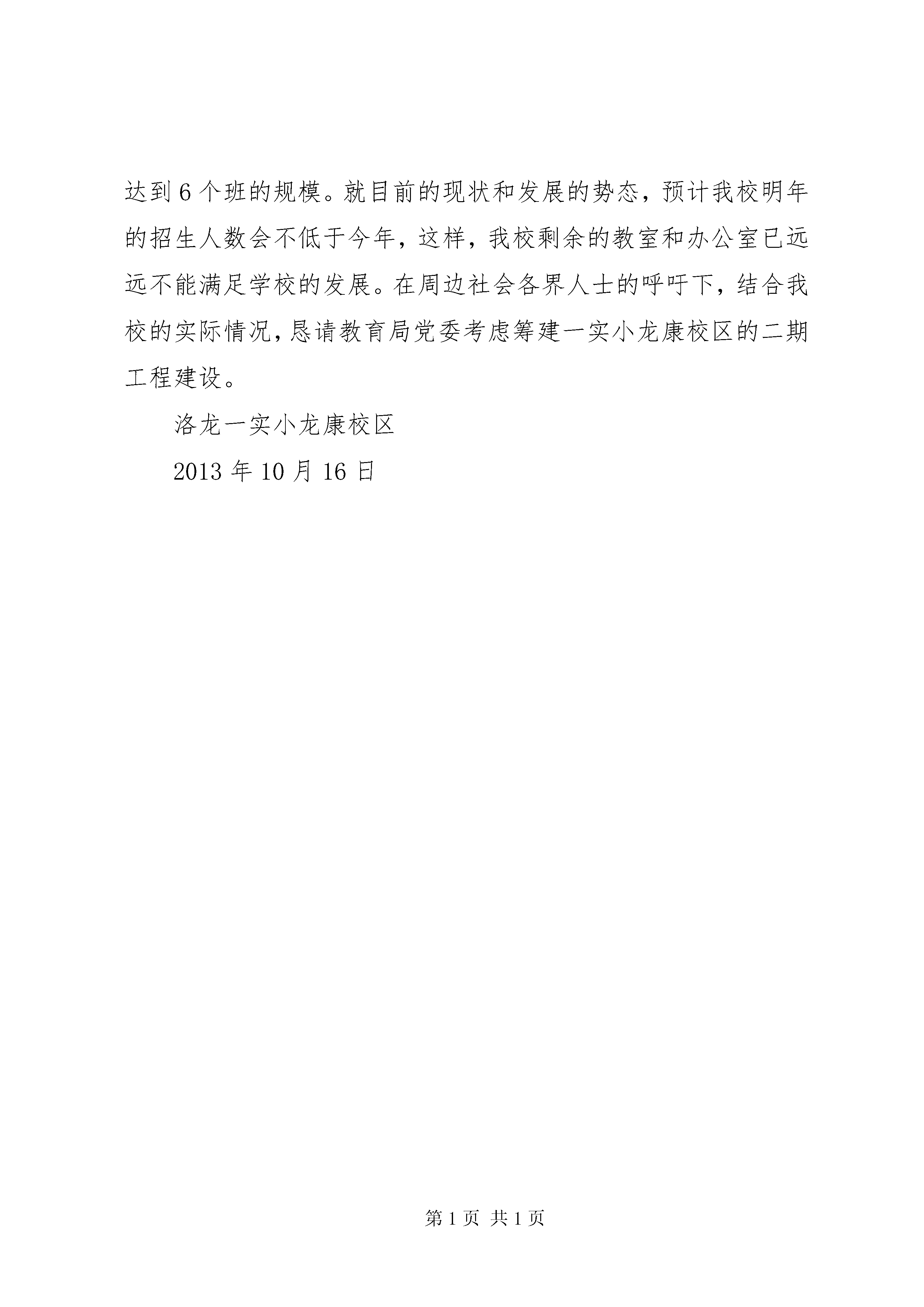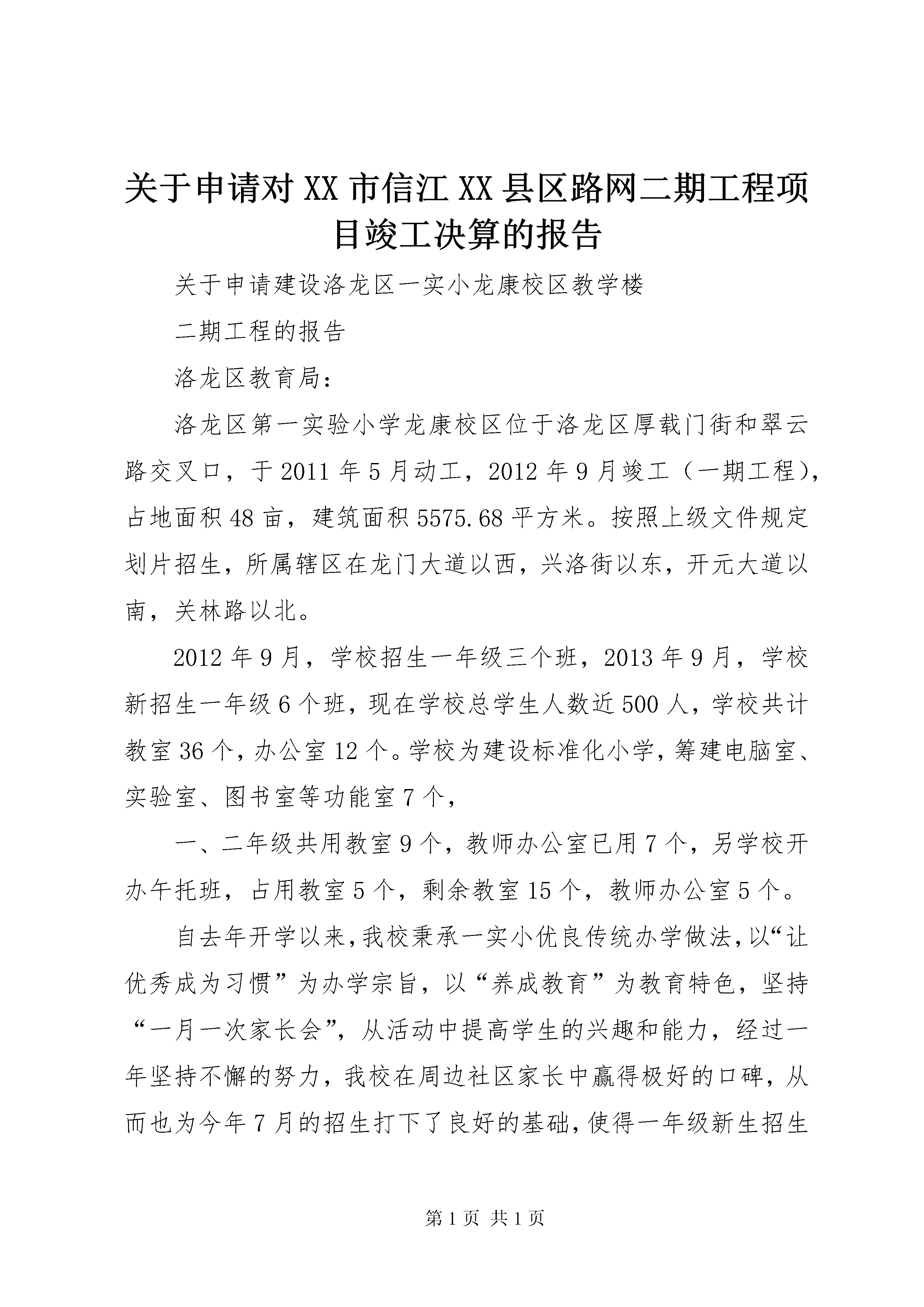 关于申请对XX市信江XX县区路网二期工程项目竣工决算的报告关于申请建设洛龙区一实小龙康校区教学楼二期工程的报告洛龙区教育局:洛龙区第一实验小学龙康校区位于洛龙区厚载门街和翠云路交叉口,于2011年5月动工,2012年9月竣工(一期工程),占地面积48亩,建筑面积5575.68平方米。按照上级文件规定划片招生,所属辖区在龙门大道以西,兴洛街以东,开元大道以南,关林路以北。2012年9月,学校招生一年级三个班,2013年9月,学校新招生一年级6个班,现在学校总学生人数近500人,学校共计教室36个,办公室12个。学校为建设标准化小学,筹建电脑室、实验室、图书室等功能室7个,一、二年级共用教室9个,教师办公室已用7个,另学校开办午托班,占用教室5个,剩余教室15个,教师办公室5个。自去年开学以来,我校秉承一实小优良传统办学做法,以“让优秀成为习惯”为办学宗旨,以“养成教育”为教育特色,坚持“一月一次家长会”,从活动中提高学生的兴趣和能力,经过一年坚持不懈的努力,我校在周边社区家长中赢得极好的口碑,从而也为今年7月的招生打下了良好的基础,使得一年级新生招生达到6个班的规模。就目前的现状和发展的势态,预计我校明年的招生人数会不低于今年,这样,我校剩余的教室和办公室已远远不能满足学校的发展。在周边社会各界人士的呼吁下,结合我校的实际情况,恳请教育局党委考虑筹建一实小龙康校区的二期工程建设。洛龙一实小龙康校区2013年10月16日