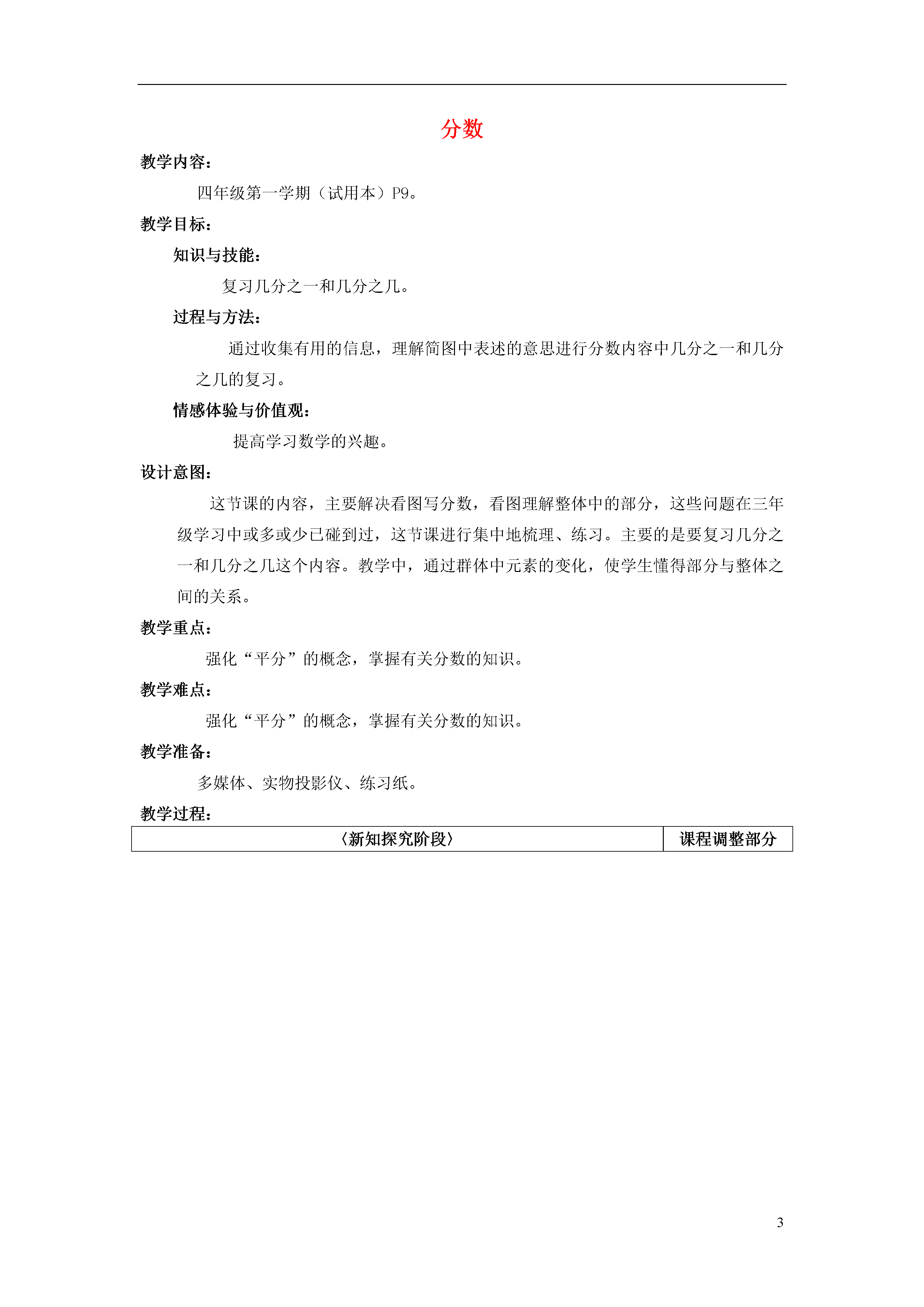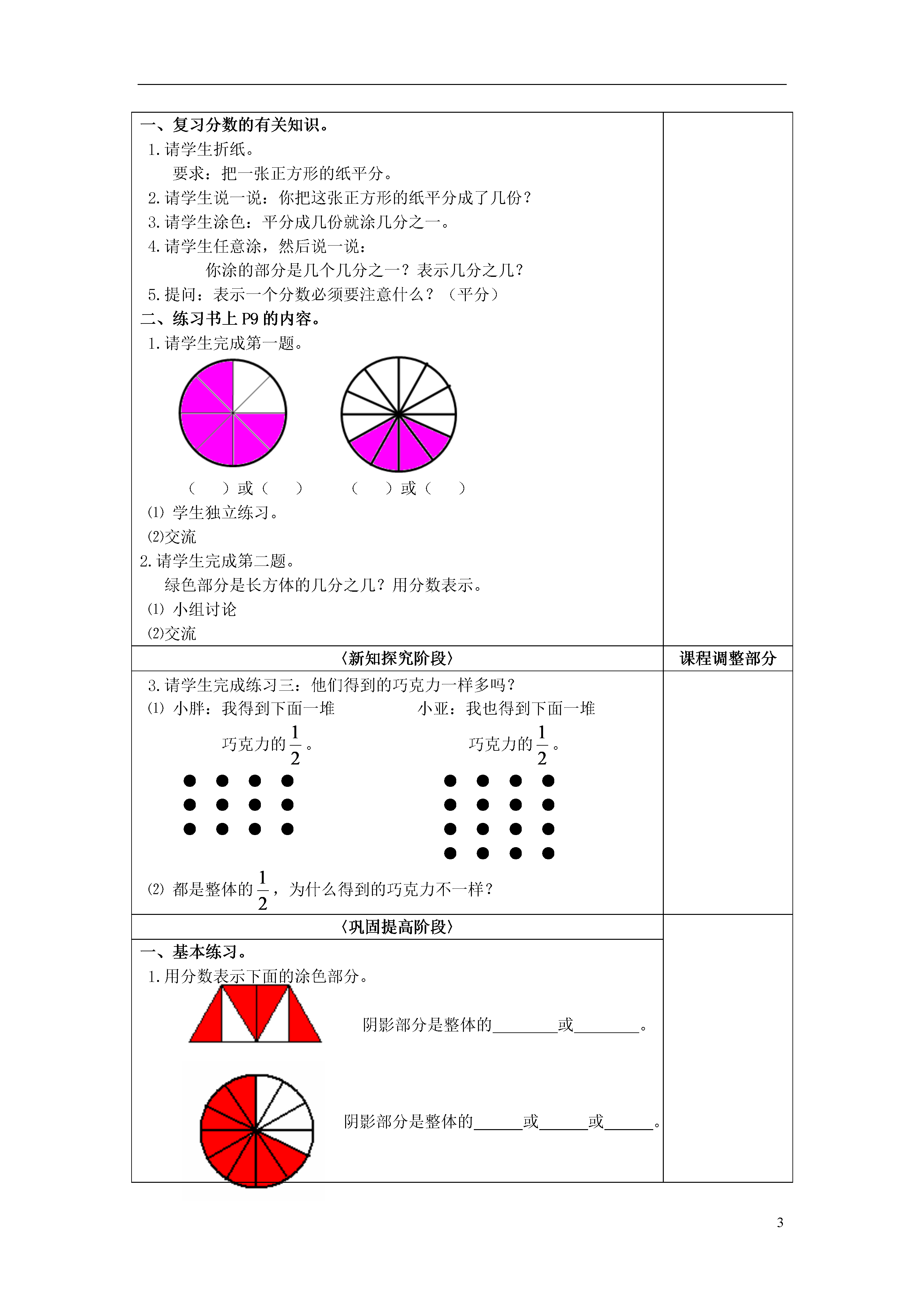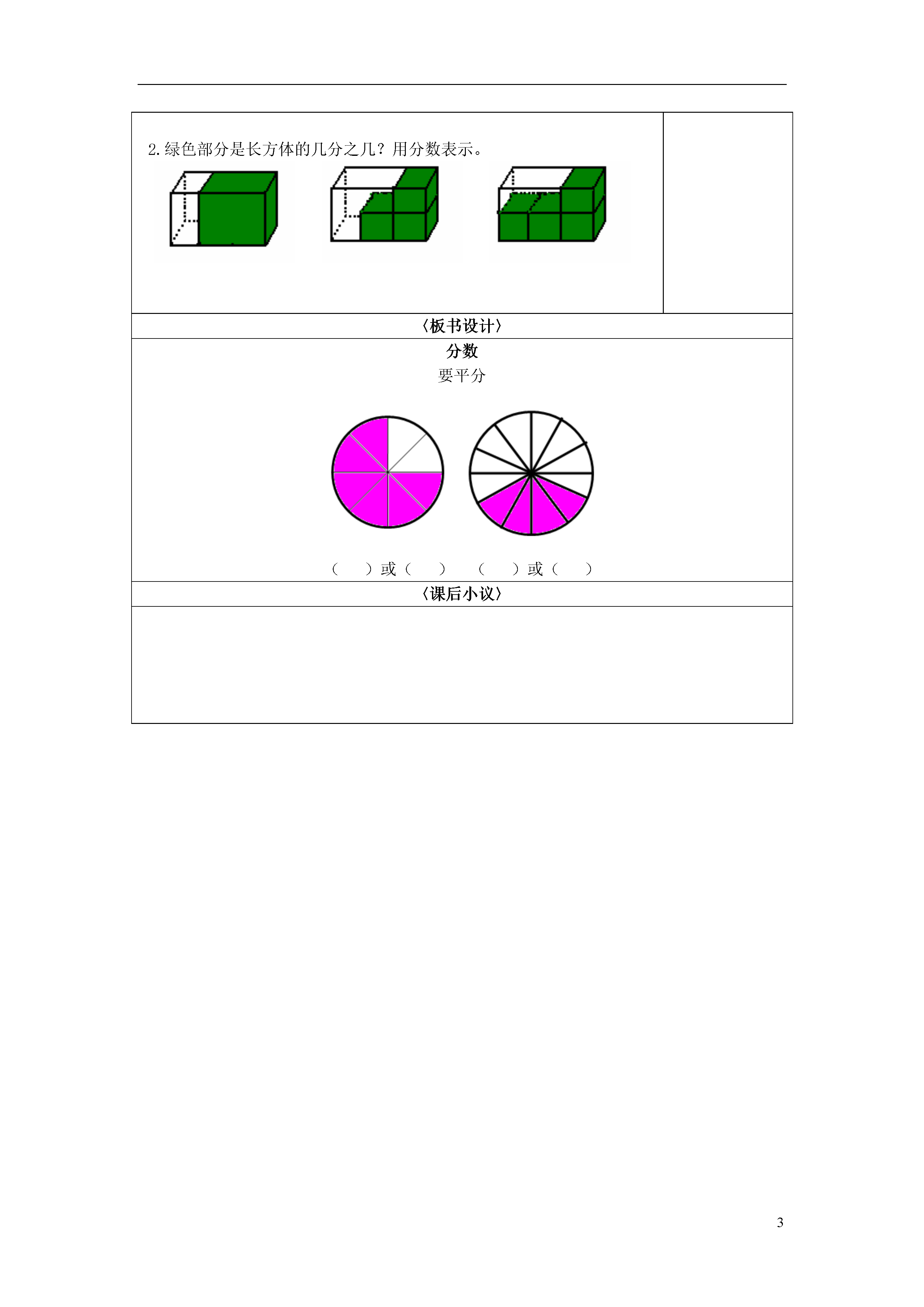 3分数教学内容:四年级第一学期(试用本)P9。教学目标:知识与技能:复习几分之一和几分之几。过程与方法:通过收集有用的信息,理解简图中表述的意思进行分数内容中几分之一和几分之几的复习。情感体验与价值观:提高学习数学的兴趣。设计意图:这节课的内容,主要解决看图写分数,看图理解整体中的部分,这些问题在三年级学习中或多或少已碰到过,这节课进行集中地梳理、练习。主要的是要复习几分之一和几分之几这个内容。教学中,通过群体中元素的变化,使学生懂得部分与整体之间的关系。教学重点:强化“平分”的概念,掌握有关分数的知识。教学难点:强化“平分”的概念,掌握有关分数的知识。教学准备:多媒体、实物投影仪、练习纸。教学过程:〈新知探究阶段〉课程调整部分一、复习分数的有关知识。1.请学生折纸。要求:把一张正方形的纸平分。2.请学生说一说:你把这张正方形的纸平分成了几份?3.请学生涂色:平分成几份就涂几分之一。4.请学生任意涂,然后说一说:你涂的部分是几个几分之一?表示几分之几?5.提问:表示一个分数必须要注意什么?(平分)二、练习书上P9的内容。1.请学生完成第一题。()或()()或()⑴学生独立练习。⑵交流2.请学生完成第二题。绿色部分是长方体的几分之几?用分数表示。⑴小组讨论⑵交流〈新知探究阶段〉课程调整部分3.请学生完成练习三:他们得到的巧克力一样多吗?⑴小胖:我得到下面一堆小亚:我也得到下面一堆巧克力的。巧克力的。●●●●●●●●●●●●●●●●●●●●●●●●●⑵都是整体的,为什么得到的巧克力不一样?〈巩固提高阶段〉一、基本练习。1.用分数表示下面的涂色部分。阴影部分是整体的或。阴影部分是整体的或或。2.绿色部分是长方体的几分之几?用分数表示。〈板书设计〉分数要平分()或()()或()〈课后小议〉