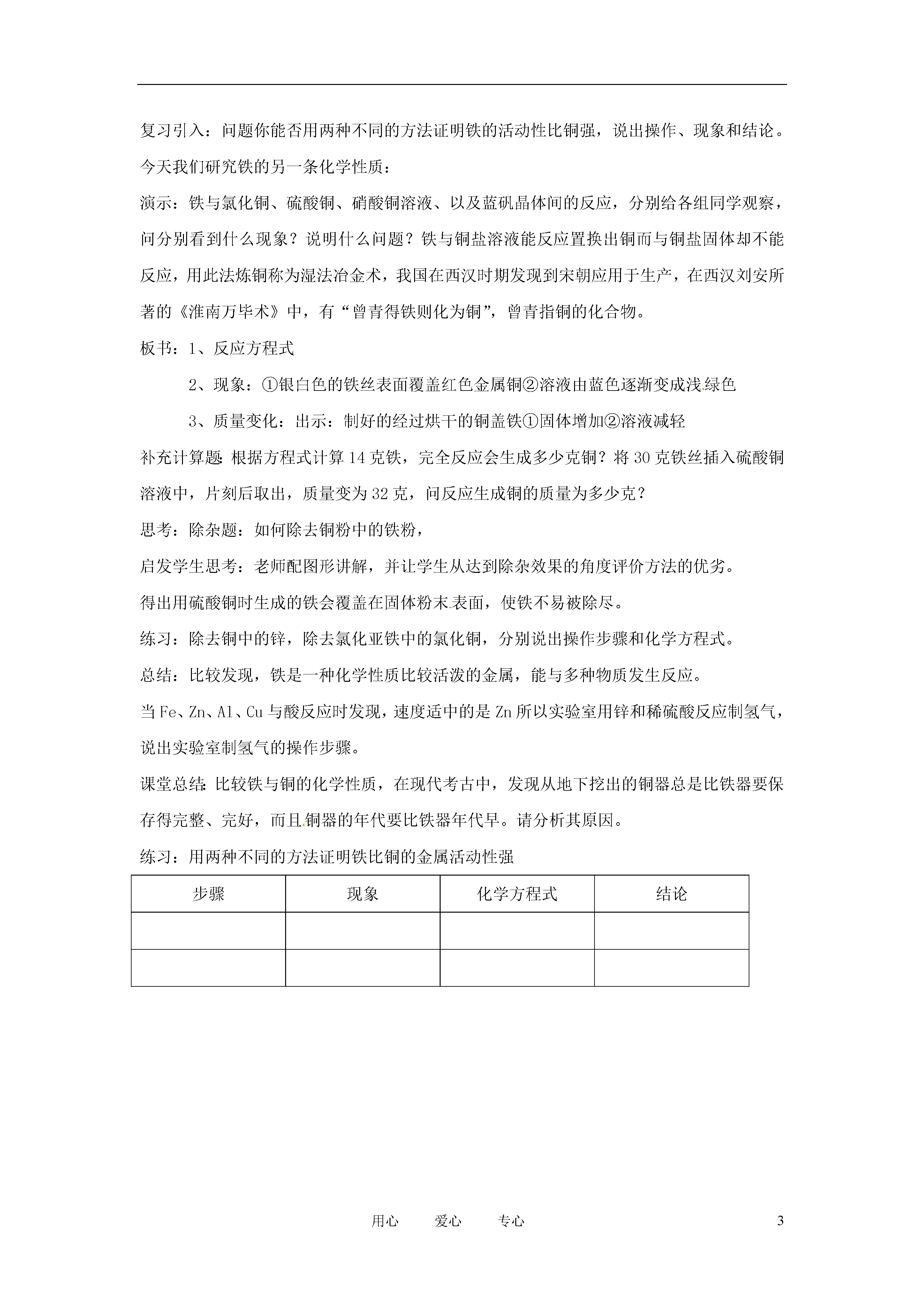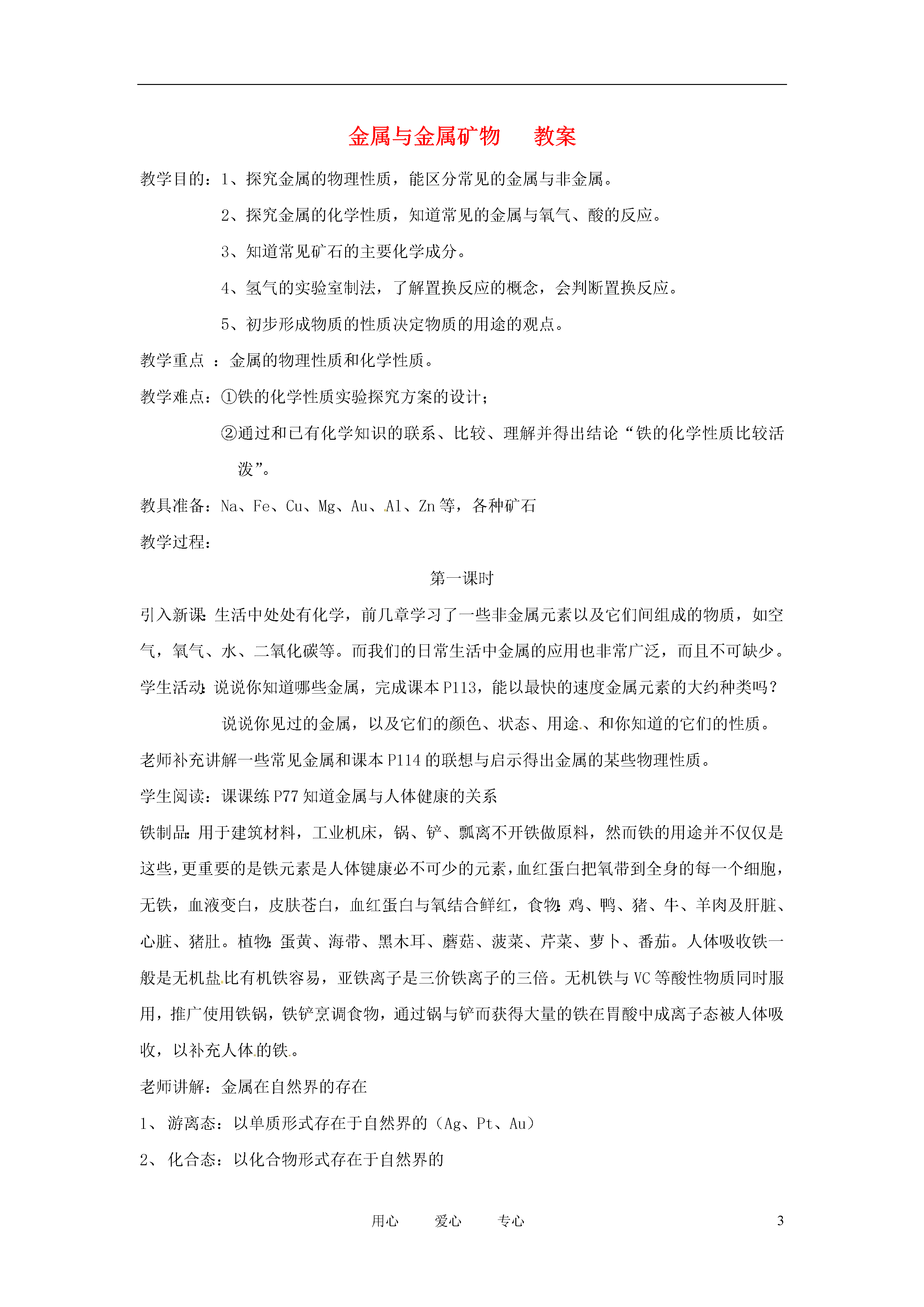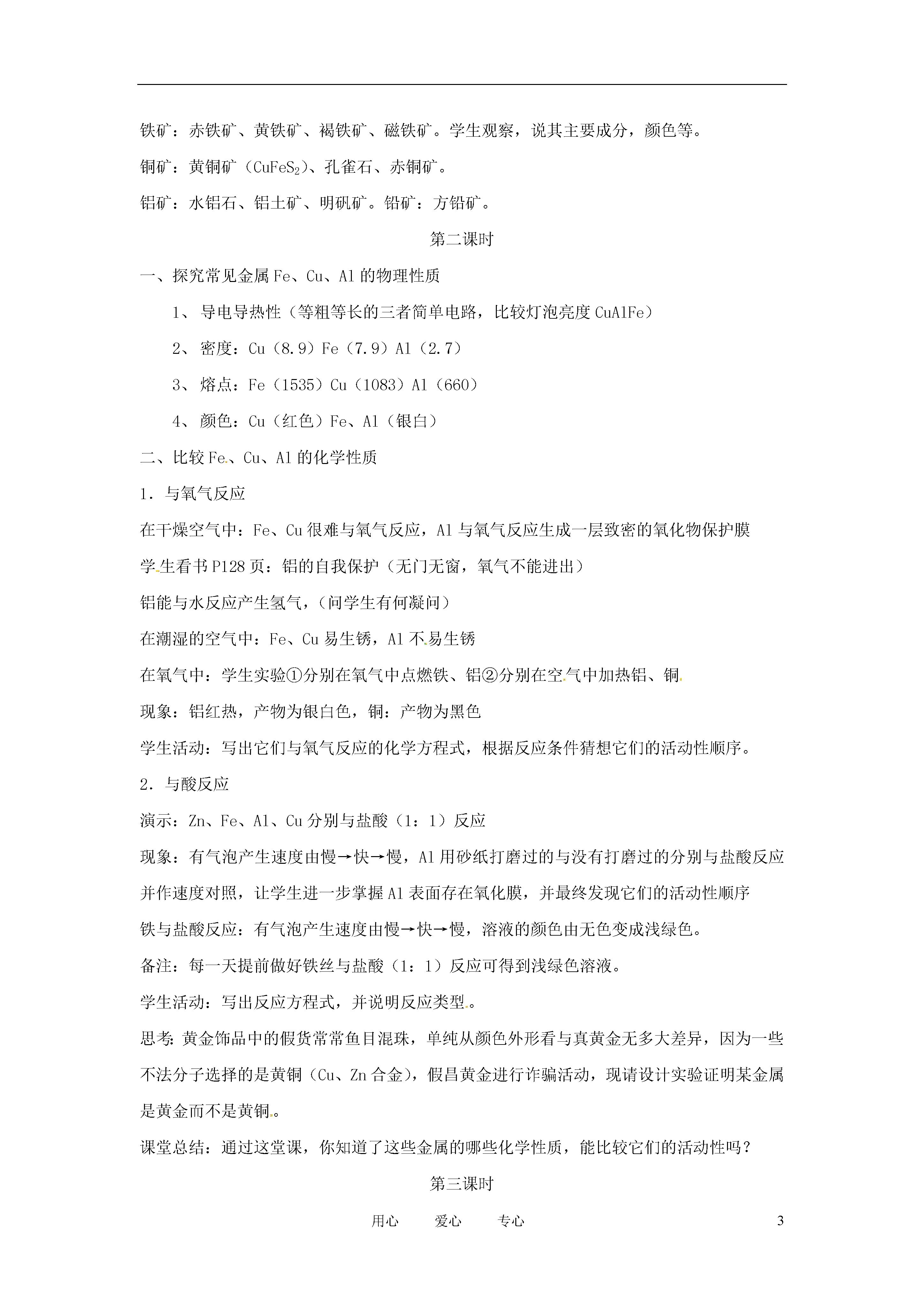 3用心爱心专心金属与金属矿物教案教学目的:1、探究金属的物理性质,能区分常见的金属与非金属。2、探究金属的化学性质,知道常见的金属与氧气、酸的反应。3、知道常见矿石的主要化学成分。4、氢气的实验室制法,了解置换反应的概念,会判断置换反应。5、初步形成物质的性质决定物质的用途的观点。教学重点:金属的物理性质和化学性质。教学难点:①铁的化学性质实验探究方案的设计;②通过和已有化学知识的联系、比较、理解并得出结论“铁的化学性质比较活泼”。教具准备:Na、Fe、Cu、Mg、Au、Al、Zn等,各种矿石教学过程:第一课时引入新课:生活中处处有化学,前几章学习了一些非金属元素以及它们间组成的物质,如空气,氧气、水、二氧化碳等。而我们的日常生活中金属的应用也非常广泛,而且不可缺少。学生活动:说说你知道哪些金属,完成课本P113,能以最快的速度金属元素的大约种类吗?说说你见过的金属,以及它们的颜色、状态、用途、和你知道的它们的性质。老师补充讲解一些常见金属和课本P114的联想与启示得出金属的某些物理性质。学生阅读:课课练P77知道金属与人体健康的关系铁制品:用于建筑材料,工业机床,锅、铲、瓢离不开铁做原料,然而铁的用途并不仅仅是这些,更重要的是铁元素是人体键康必不可少的元素,血红蛋白把氧带到全身的每一个细胞,无铁,血液变白,皮肤苍白,血红蛋白与氧结合鲜红,食物:鸡、鸭、猪、牛、羊肉及肝脏、心脏、猪肚。植物:蛋黄、海带、黑木耳、蘑菇、菠菜、芹菜、萝卜、番茄。人体吸收铁一般是无机盐比有机铁容易,亚铁离子是三价铁离子的三倍。无机铁与VC等酸性物质同时服用,推广使用铁锅,铁铲烹调食物,通过锅与铲而获得大量的铁在胃酸中成离子态被人体吸收,以补充人体的铁。老师讲解:金属在自然界的存在游离态:以单质形式存在于自然界的(Ag、Pt、Au)化合态:以化合物形式存在于自然界的铁矿:赤铁矿、黄铁矿、褐铁矿、磁铁矿。学生观察,说其主要成分,颜色等。铜矿:黄铜矿(CuFeS2)、孔雀石、赤铜矿。铝矿:水铝石、铝土矿、明矾矿。铅矿:方铅矿。第二课时探究常见金属Fe、Cu、Al的物理性质导电导热性(等粗等长的三者简单电路,比较灯泡亮度CuAlFe)密度:Cu(8.9)Fe(7.9)Al(2.7)熔点:Fe(1535)Cu(1083)Al(660)颜色:Cu(红色)Fe、Al(银白)比较Fe、Cu、Al的化学性质1.与氧气反应在干燥空气中:Fe、Cu很难与氧气反应,Al与氧气反应生成一层致密的氧化物保护膜学生看书P128页:铝的自我保护(无门无窗,氧气不能进出)铝能与水反应产生氢气,(问学生有何凝问)在潮湿的空气中:Fe、Cu易生锈,Al不易生锈在氧气中:学生实验①分别在氧气中点燃铁、铝②分别在空气中加热铝、铜现象:铝红热,产物为银白色,铜:产物为黑色学生活动:写出它们与氧气反应的化学方程式,根据反应条件猜想它们的活动性顺序。2.与酸反应演示:Zn、Fe、Al、Cu分别与盐酸(1:1)反应现象:有气泡产生速度由慢→快→慢,Al用砂纸打磨过的与没有打磨过的分别与盐酸反应并作速度对照,让学生进一步掌握Al表面存在氧化膜,并最终发现它们的活动性顺序铁与盐酸反应:有气泡产生速度由慢→快→慢,溶液的颜色由无色变成浅绿色。备注:每一天提前做好铁丝与盐酸(1:1)反应可得到浅绿色溶液。学生活动:写出反应方程式,并说明反应类型。思考:黄金饰品中的假货常常鱼目混珠,单纯从颜色外形看与真黄金无多大差异,因为一些不法分子选择的是黄铜(Cu、Zn合金),假昌黄金进行诈骗活动,现请设计实验证明某金属是黄金而不是黄铜。课堂总结:通过这堂课,你知道了这些金属的哪些化学性质,能比较它们的活动性吗?第三课时复习引入:问题你能否用两种不同的方法证明铁的活动性比铜强,说出操作、现象和结论。今天我们研究铁的另一条化学性质:演示:铁与氯化铜、硫酸铜、硝酸铜溶液、以及蓝矾晶体间的反应,分别给各组同学观察,问分别看到什么现象?说明什么问题?铁与铜盐溶液能反应置换出铜而与铜盐固体却不能反应,用此法炼铜称为湿法冶金术,我国在西汉时期发现到宋朝应用于生产,在西汉刘安所著的《淮南万毕术》中,有“曾青得铁则化为铜”,曾青指铜的化合物。板书:1、反应方程式2、现象:①银白色的铁丝表面覆盖红色金属铜②溶液由蓝色逐渐变成浅绿色3、质量变化:出示:制好的经过烘干的铜盖铁①固体增加②溶液减轻补充计算题:根据方程式计算14克铁,完全反应会生成多少克铜?将30克铁丝插入硫酸铜溶液中,片刻后取出,质量变为32克,问反应生成铜的质量为多少克?思考:除杂题:如何除去铜粉中的铁粉,启发学生思考:老师配图形讲解,并让学生从达到