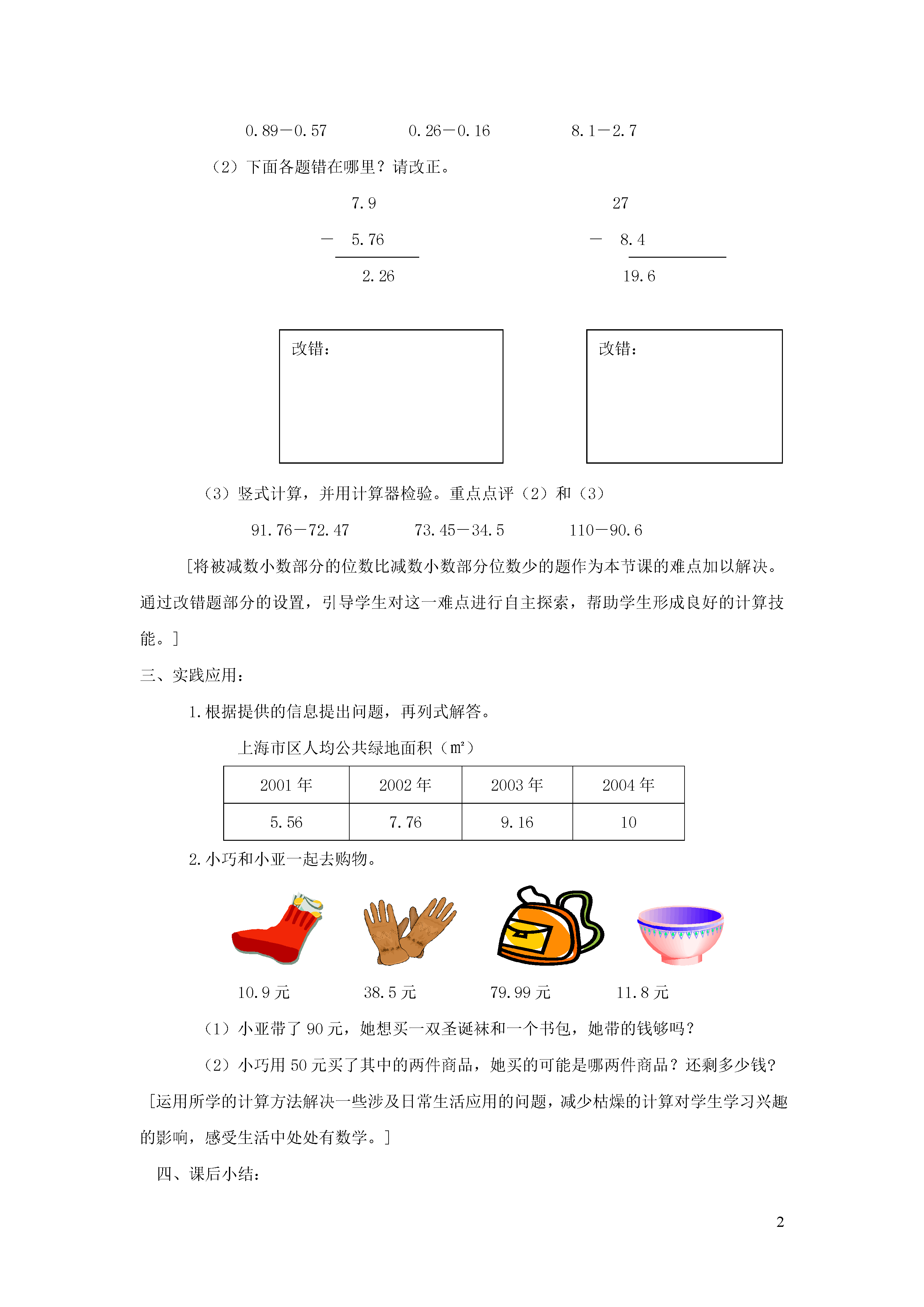 2小数加减法教学目标:知识与技能:1.理解掌握小数减法的计算方法。2.会正确地计算小数减法。过程与方法:由生活实例着手,讨论并总结小数加法运算的方法。通过让学生亲身经历计算方法的获得过程,培养他们的算法思维。情感与态度:通过观察、比较、讨论等活动,学习运用数学语言进行表达和交流。教学过程:一、续前深入探究:1.出示上次比赛题:(改变已知条件与问题)前掷后掷总成绩第一组第二组第三组第四组(1)小组讨论解题方法:(2)请代表口述解题方法并板演:[继续前一课时所收集的材料探究,注重知识的连续性。]2.集体评析:3.小结:(1)计算小数的减法,只要把小数点对齐,相同的数位也就对齐了。(2)然后按照整数减法的法则做,不够减向前一位数借一作十继续减。(3)得数中的小数点要与横线上的小数点对齐[在这一教学过程中,教师注意引导学生将整数减法的知识迁移到小数减法中,鼓励学生自主探索、合作交流,亲身经历计算方法的获得过程,培养他们的算法思维]二、独立练习:(1)9.1-4.56.9-4.99.3-30.89-0.570.26-0.168.1-2.7(2)下面各题错在哪里?请改正。7.927-5.76-8.42.2619.6改错:改错:(3)竖式计算,并用计算器检验。重点点评(2)和(3)91.76-72.4773.45-34.5110-90.6[将被减数小数部分的位数比减数小数部分位数少的题作为本节课的难点加以解决。通过改错题部分的设置,引导学生对这一难点进行自主探索,帮助学生形成良好的计算技能。]三、实践应用:1.根据提供的信息提出问题,再列式解答。上海市区人均公共绿地面积(㎡)2001年2002年2003年2004年5.567.769.16102.小巧和小亚一起去购物。10.9元38.5元79.99元11.8元(1)小亚带了90元,她想买一双圣诞袜和一个书包,她带的钱够吗?(2)小巧用50元买了其中的两件商品,她买的可能是哪两件商品?还剩多少钱?[运用所学的计算方法解决一些涉及日常生活应用的问题,减少枯燥的计算对学生学习兴趣的影响,感受生活中处处有数学。]四、课后小结:生讲(方法和注意点)。同时出示课题:小数减法