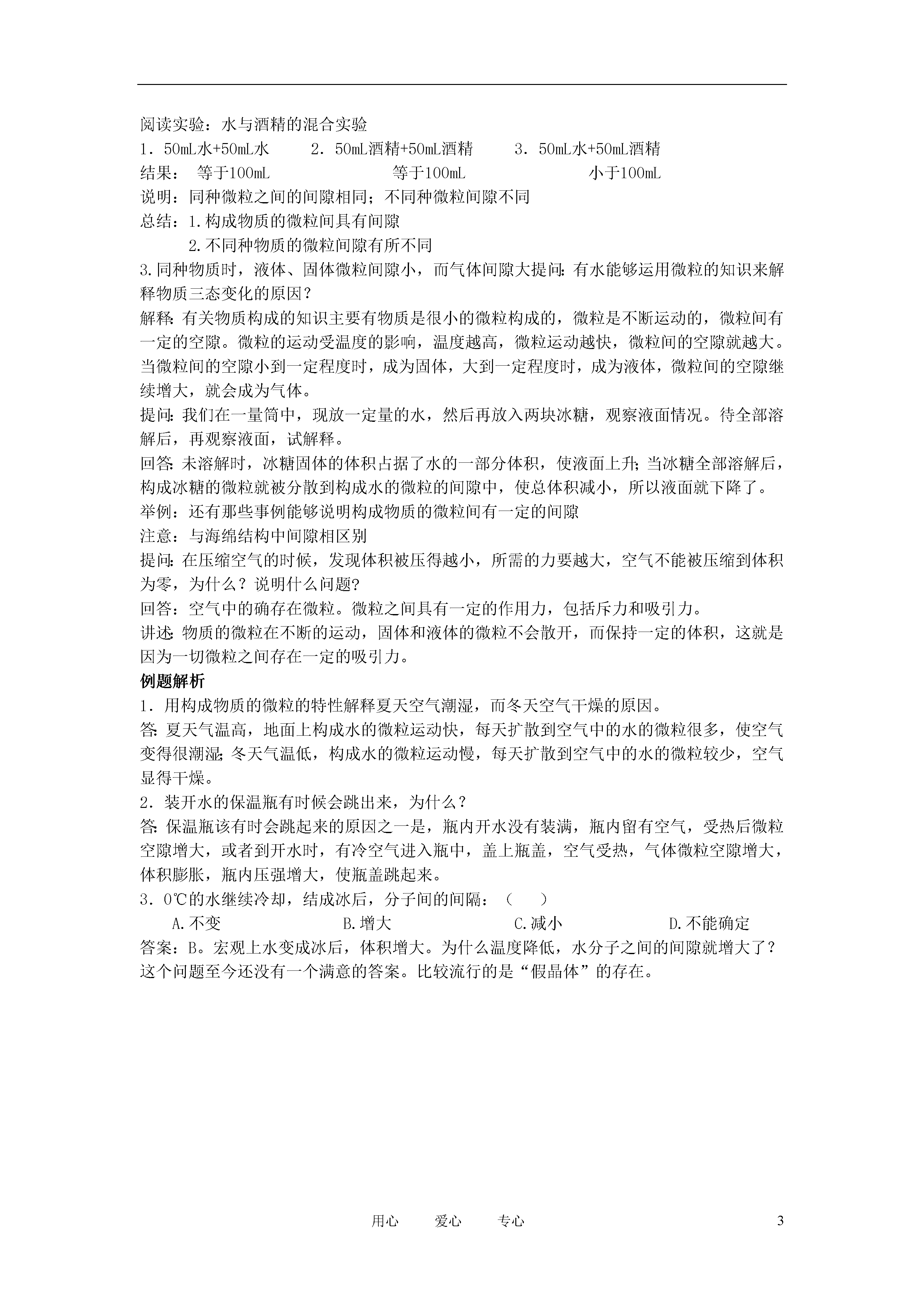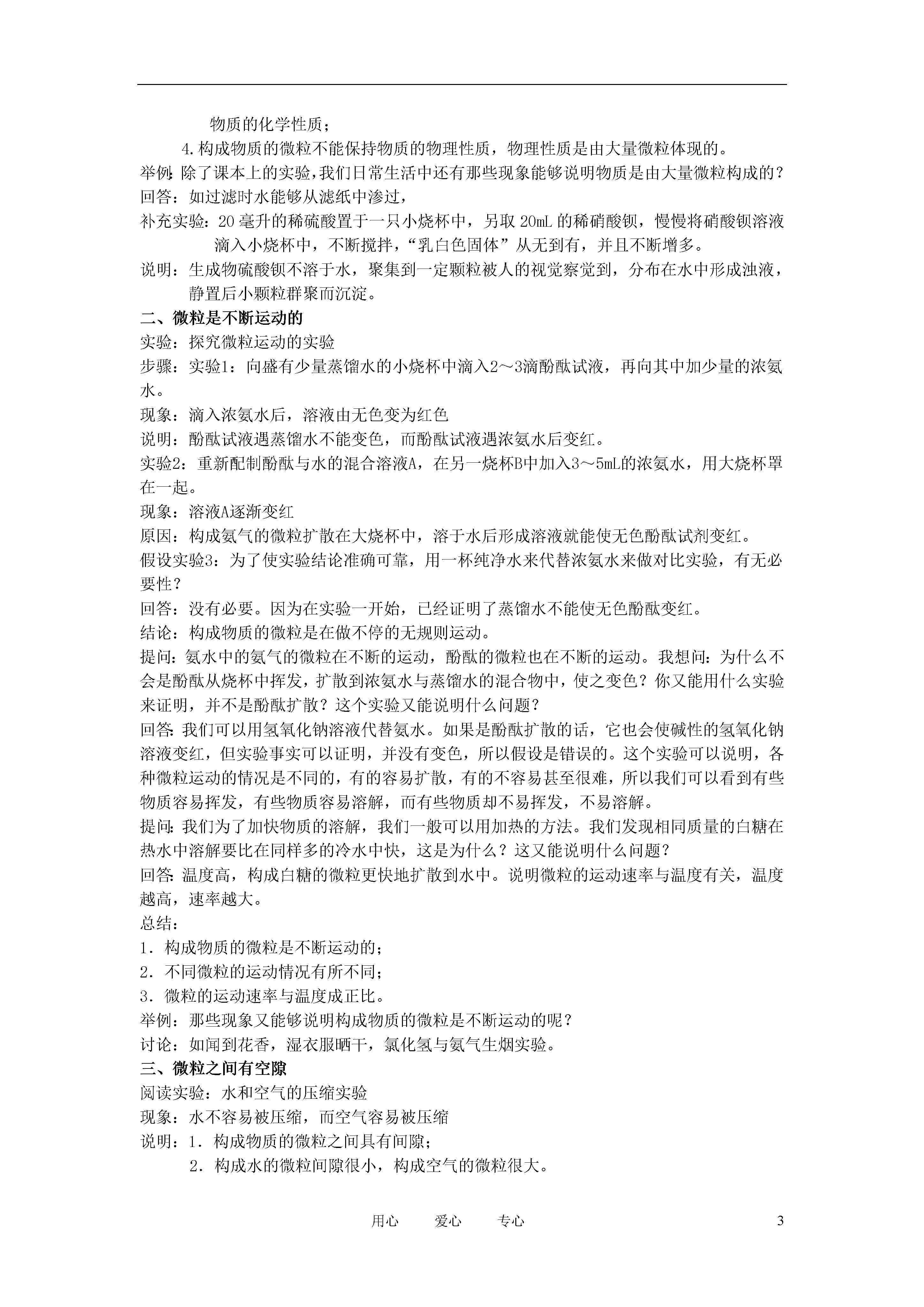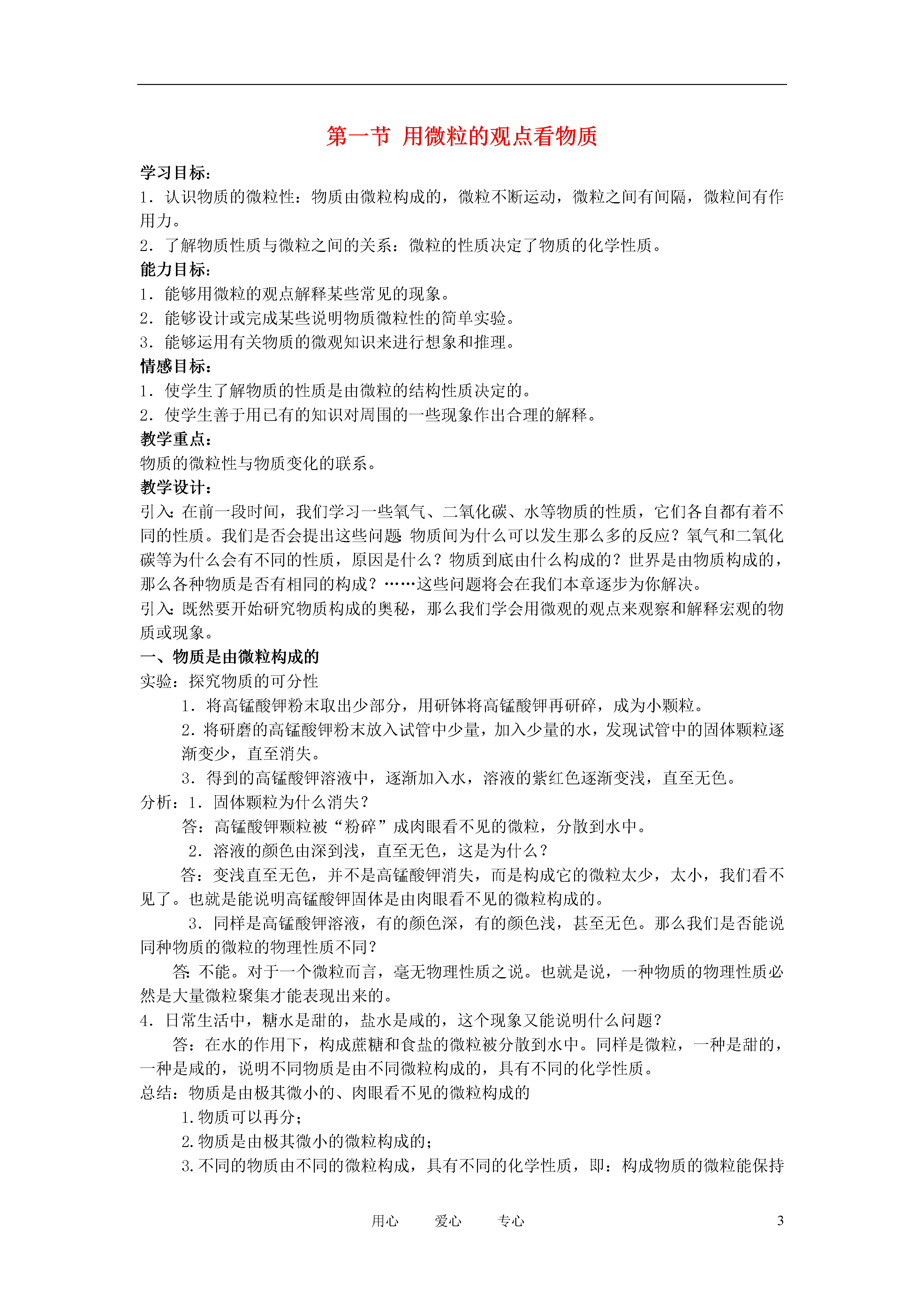 3用心爱心专心第一节用微粒的观点看物质学习目标:1.认识物质的微粒性:物质由微粒构成的,微粒不断运动,微粒之间有间隔,微粒间有作用力。2.了解物质性质与微粒之间的关系:微粒的性质决定了物质的化学性质。能力目标:1.能够用微粒的观点解释某些常见的现象。2.能够设计或完成某些说明物质微粒性的简单实验。3.能够运用有关物质的微观知识来进行想象和推理。情感目标:1.使学生了解物质的性质是由微粒的结构性质决定的。2.使学生善于用已有的知识对周围的一些现象作出合理的解释。教学重点:物质的微粒性与物质变化的联系。教学设计:引入:在前一段时间,我们学习一些氧气、二氧化碳、水等物质的性质,它们各自都有着不同的性质。我们是否会提出这些问题:物质间为什么可以发生那么多的反应?氧气和二氧化碳等为什么会有不同的性质,原因是什么?物质到底由什么构成的?世界是由物质构成的,那么各种物质是否有相同的构成?……这些问题将会在我们本章逐步为你解决。引入:既然要开始研究物质构成的奥秘,那么我们学会用微观的观点来观察和解释宏观的物质或现象。一、物质是由微粒构成的实验:探究物质的可分性1.将高锰酸钾粉末取出少部分,用研钵将高锰酸钾再研碎,成为小颗粒。2.将研磨的高锰酸钾粉末放入试管中少量,加入少量的水,发现试管中的固体颗粒逐渐变少,直至消失。3.得到的高锰酸钾溶液中,逐渐加入水,溶液的紫红色逐渐变浅,直至无色。分析:1.固体颗粒为什么消失?答:高锰酸钾颗粒被“粉碎”成肉眼看不见的微粒,分散到水中。2.溶液的颜色由深到浅,直至无色,这是为什么?答:变浅直至无色,并不是高锰酸钾消失,而是构成它的微粒太少,太小,我们看不见了。也就是能说明高锰酸钾固体是由肉眼看不见的微粒构成的。3.同样是高锰酸钾溶液,有的颜色深,有的颜色浅,甚至无色。那么我们是否能说同种物质的微粒的物理性质不同?答:不能。对于一个微粒而言,毫无物理性质之说。也就是说,一种物质的物理性质必然是大量微粒聚集才能表现出来的。4.日常生活中,糖水是甜的,盐水是咸的,这个现象又能说明什么问题?答:在水的作用下,构成蔗糖和食盐的微粒被分散到水中。同样是微粒,一种是甜的,一种是咸的,说明不同物质是由不同微粒构成的,具有不同的化学性质。总结:物质是由极其微小的、肉眼看不见的微粒构成的1.物质可以再分;2.物质是由极其微小的微粒构成的;3.不同的物质由不同的微粒构成,具有不同的化学性质,即:构成物质的微粒能保持物质的化学性质;4.构成物质的微粒不能保持物质的物理性质,物理性质是由大量微粒体现的。举例:除了课本上的实验,我们日常生活中还有那些现象能够说明物质是由大量微粒构成的?回答:如过滤时水能够从滤纸中渗过,补充实验:20毫升的稀硫酸置于一只小烧杯中,另取20mL的稀硝酸钡,慢慢将硝酸钡溶液滴入小烧杯中,不断搅拌,“乳白色固体”从无到有,并且不断增多。说明:生成物硫酸钡不溶于水,聚集到一定颗粒被人的视觉察觉到,分布在水中形成浊液,静置后小颗粒群聚而沉淀。二、微粒是不断运动的实验:探究微粒运动的实验步骤:实验1:向盛有少量蒸馏水的小烧杯中滴入2~3滴酚酞试液,再向其中加少量的浓氨水。现象:滴入浓氨水后,溶液由无色变为红色说明:酚酞试液遇蒸馏水不能变色,而酚酞试液遇浓氨水后变红。实验2:重新配制酚酞与水的混合溶液A,在另一烧杯B中加入3~5mL的浓氨水,用大烧杯罩在一起。现象:溶液A逐渐变红原因:构成氨气的微粒扩散在大烧杯中,溶于水后形成溶液就能使无色酚酞试剂变红。假设实验3:为了使实验结论准确可靠,用一杯纯净水来代替浓氨水来做对比实验,有无必要性?回答:没有必要。因为在实验一开始,已经证明了蒸馏水不能使无色酚酞变红。结论:构成物质的微粒是在做不停的无规则运动。提问:氨水中的氨气的微粒在不断的运动,酚酞的微粒也在不断的运动。我想问:为什么不会是酚酞从烧杯中挥发,扩散到浓氨水与蒸馏水的混合物中,使之变色?你又能用什么实验来证明,并不是酚酞扩散?这个实验又能说明什么问题?回答:我们可以用氢氧化钠溶液代替氨水。如果是酚酞扩散的话,它也会使碱性的氢氧化钠溶液变红,但实验事实可以证明,并没有变色,所以假设是错误的。这个实验可以说明,各种微粒运动的情况是不同的,有的容易扩散,有的不容易甚至很难,所以我们可以看到有些物质容易挥发,有些物质容易溶解,而有些物质却不易挥发,不易溶解。提问:我们为了加快物质的溶解,我们一般可以用加热的方法。我们发现相同质量的白糖在热水中溶解要比在同样多的冷水中快,这是为什么?这又能说明什么问题?回答:温度高,构成白糖的微粒更快地扩散到水中。说明微粒的运动速率与温度有关,温度越高,速率越大。总结: