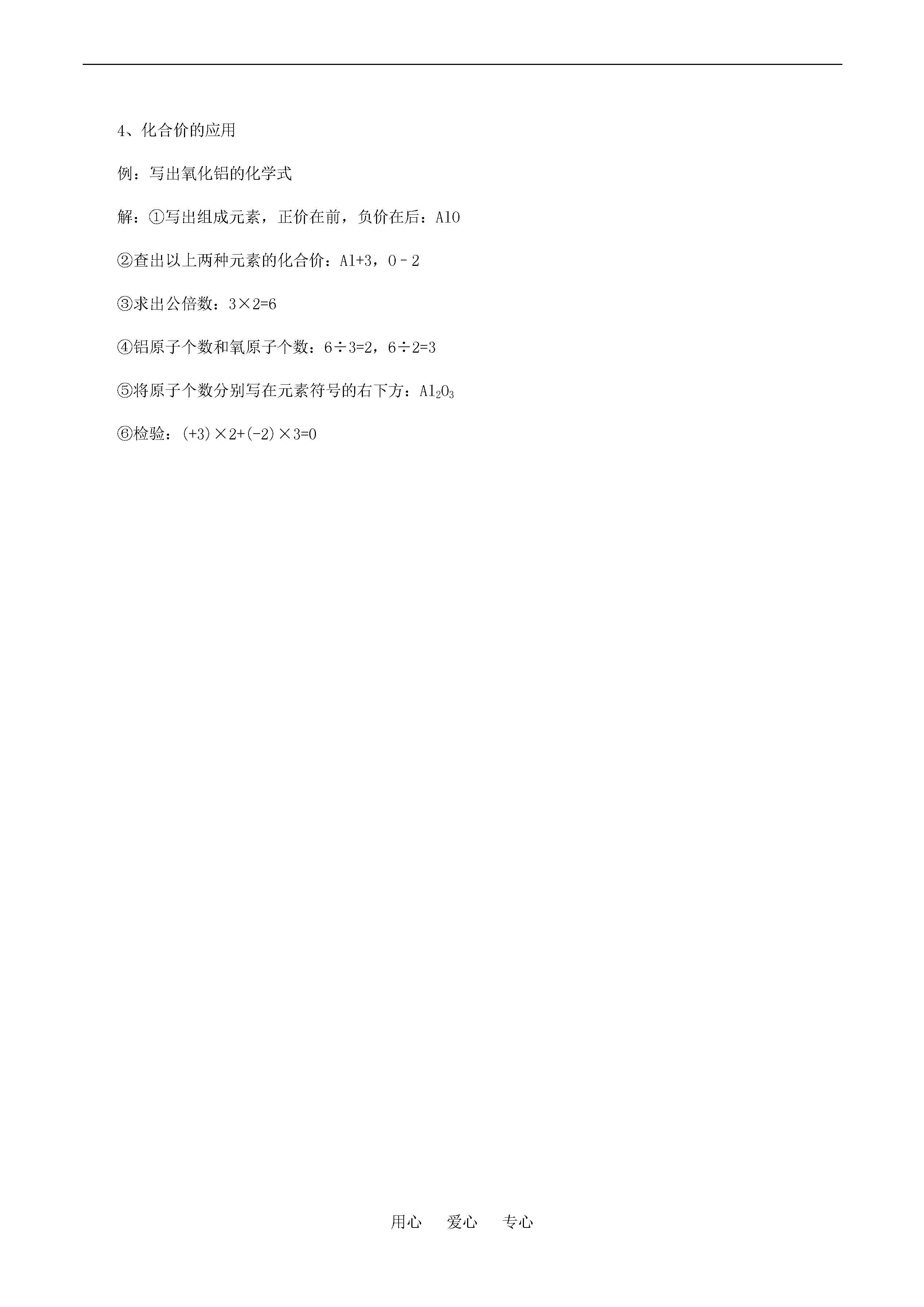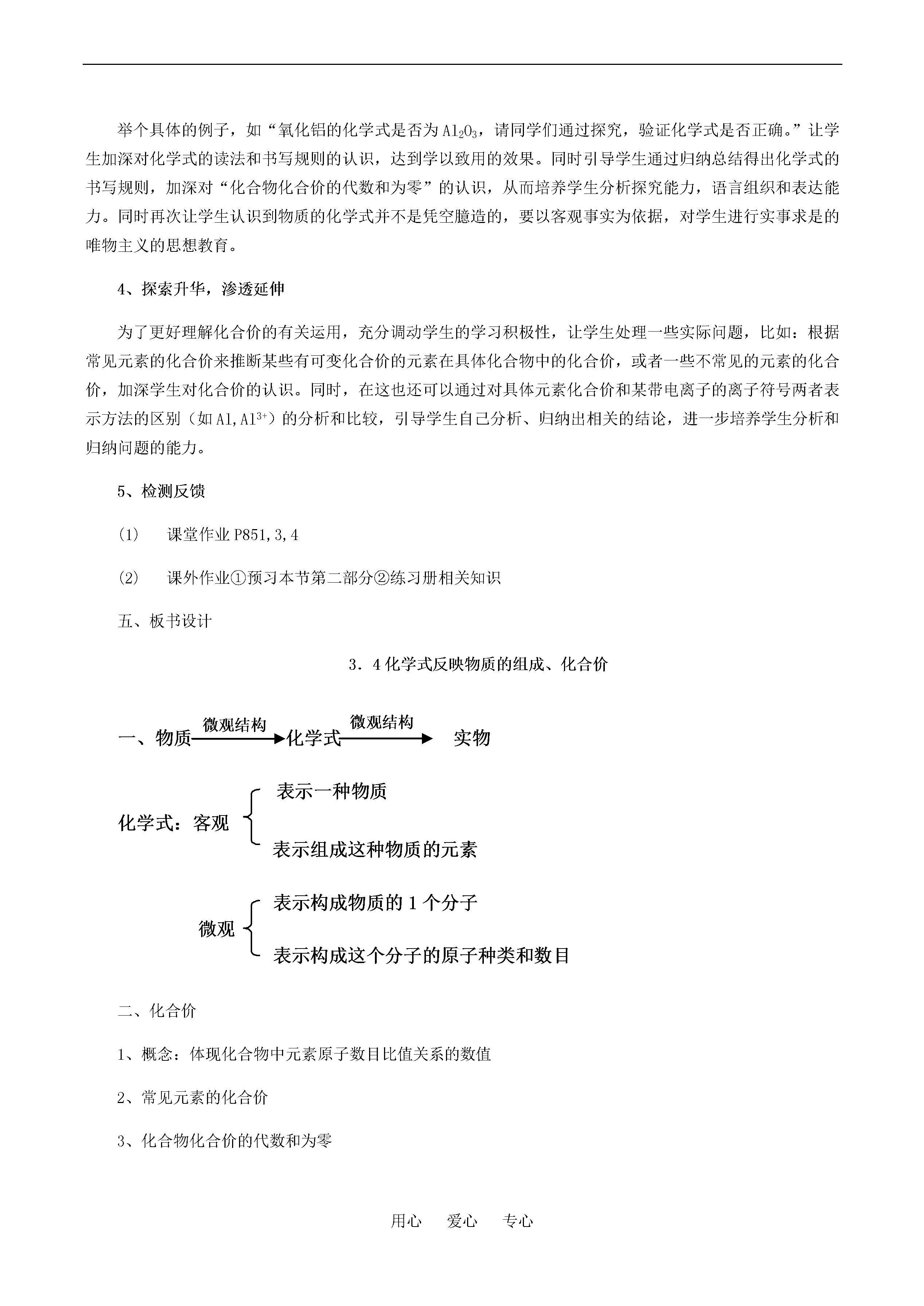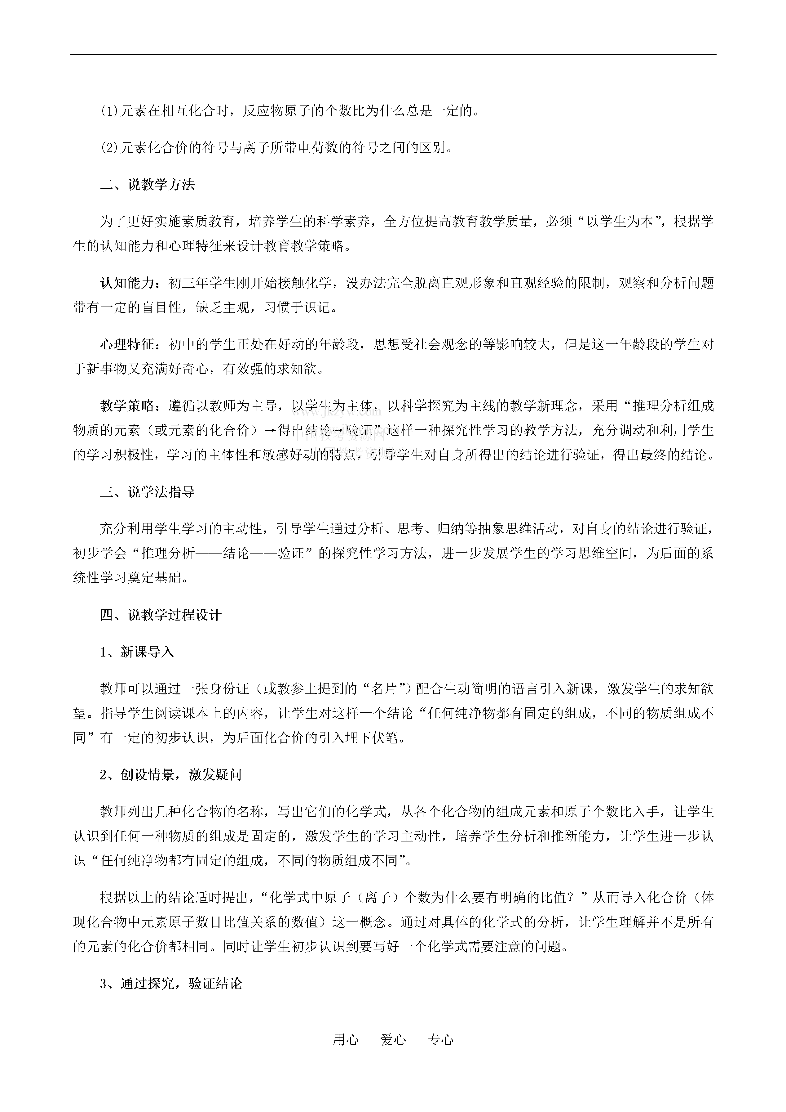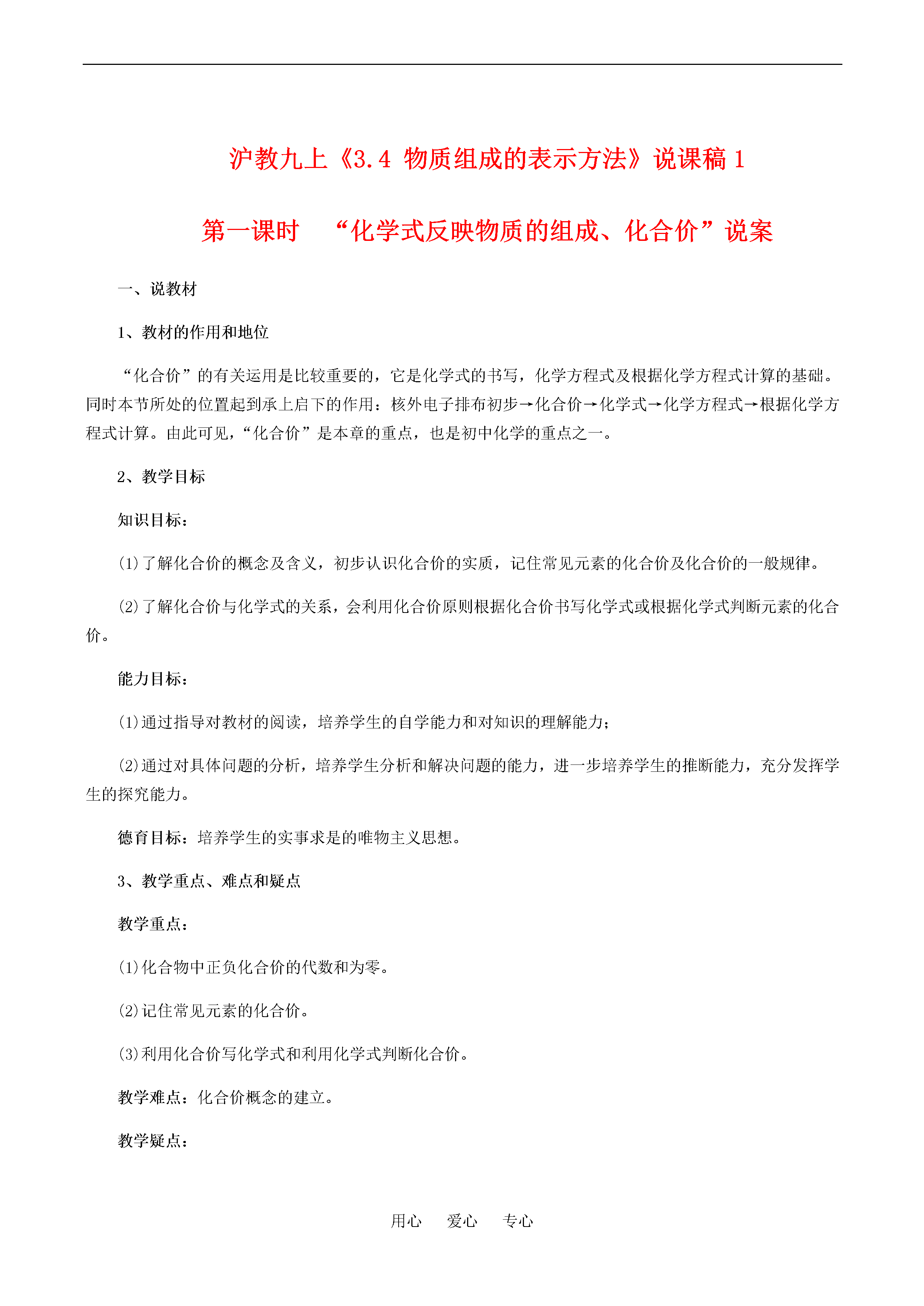 用心爱心专心沪教九上《3.4物质组成的表示方法》说课稿1第一课时“化学式反映物质的组成、化合价”说案一、说教材1、教材的作用和地位“化合价”的有关运用是比较重要的,它是化学式的书写,化学方程式及根据化学方程式计算的基础。同时本节所处的位置起到承上启下的作用:核外电子排布初步→化合价→化学式→化学方程式→根据化学方程式计算。由此可见,“化合价”是本章的重点,也是初中化学的重点之一。2、教学目标知识目标:(1)了解化合价的概念及含义,初步认识化合价的实质,记住常见元素的化合价及化合价的一般规律。(2)了解化合价与化学式的关系,会利用化合价原则根据化合价书写化学式或根据化学式判断元素的化合价。能力目标:(1)通过指导对教材的阅读,培养学生的自学能力和对知识的理解能力;(2)通过对具体问题的分析,培养学生分析和解决问题的能力,进一步培养学生的推断能力,充分发挥学生的探究能力。德育目标:培养学生的实事求是的唯物主义思想。3、教学重点、难点和疑点教学重点:(1)化合物中正负化合价的代数和为零。(2)记住常见元素的化合价。(3)利用化合价写化学式和利用化学式判断化合价。教学难点:化合价概念的建立。教学疑点:(1)元素在相互化合时,反应物原子的个数比为什么总是一定的。(2)元素化合价的符号与离子所带电荷数的符号之间的区别。二、说教学方法为了更好实施素质教育,培养学生的科学素养,全方位提高教育教学质量,必须“以学生为本”,根据学生的认知能力和心理特征来设计教育教学策略。认知能力:初三年学生刚开始接触化学,没办法完全脱离直观形象和直观经验的限制,观察和分析问题带有一定的盲目性,缺乏主观,习惯于识记。www.jkzyw.com中国教考资源网心理特征:初中的学生正处在好动的年龄段,思想受社会观念的等影响较大,但是这一年龄段的学生对于新事物又充满好奇心,有效强的求知欲。www.jkzyw.com中国教考资源网教学策略:遵循以教师为主导,以学生为主体,以科学探究为主线的教学新理念,采用“推理分析组成物质的元素(或元素的化合价)→得出结论→验证”这样一种探究性学习的教学方法,充分调动和利用学生的学习积极性,学习的主体性和敏感好动的特点,引导学生对自身所得出的结论进行验证,得出最终的结论。三、说学法指导充分利用学生学习的主动性,引导学生通过分析、思考、归纳等抽象思维活动,对自身的结论进行验证,初步学会“推理分析——结论——验证”的探究性学习方法,进一步发展学生的学习思维空间,为后面的系统性学习奠定基础。四、说教学过程设计1、新课导入教师可以通过一张身份证(或教参上提到的“名片”)配合生动简明的语言引入新课,激发学生的求知欲望。指导学生阅读课本上的内容,让学生对这样一个结论“任何纯净物都有固定的组成,不同的物质组成不同”有一定的初步认识,为后面化合价的引入埋下伏笔。2、创设情景,激发疑问教师列出几种化合物的名称,写出它们的化学式,从各个化合物的组成元素和原子个数比入手,让学生认识到任何一种物质的组成是固定的,激发学生的学习主动性,培养学生分析和推断能力,让学生进一步认识“任何纯净物都有固定的组成,不同的物质组成不同”。根据以上的结论适时提出,“化学式中原子(离子)个数为什么要有明确的比值?”从而导入化合价(体现化合物中元素原子数目比值关系的数值)这一概念。通过对具体的化学式的分析,让学生理解并不是所有的元素的化合价都相同。同时让学生初步认识到要写好一个化学式需要注意的问题。3、通过探究,验证结论举个具体的例子,如“氧化铝的化学式是否为Al2O3,请同学们通过探究,验证化学式是否正确。”让学生加深对化学式的读法和书写规则的认识,达到学以致用的效果。同时引导学生通过归纳总结得出化学式的书写规则,加深对“化合物化合价的代数和为零”的认识,从而培养学生分析探究能力,语言组织和表达能力。同时再次让学生认识到物质的化学式并不是凭空臆造的,要以客观事实为依据,对学生进行实事求是的唯物主义的思想教育。4、探索升华,渗透延伸为了更好理解化合价的有关运用,充分调动学生的学习积极性,让学生处理一些实际问题,比如:根据常见元素的化合价来推断某些有可变化合价的元素在具体化合物中的化合价,或者一些不常见的元素的化合价,加深学生对化合价的认识。同时,在这也还可以通过对具体元素化合价和某带电离子的离子符号两者表示方法的区别(如Al,Al3+)的分析和比较,引导学生自己分析、归纳出相关的结论,进一步培养学生分析和归纳问题的能力。5、检测反馈课堂作业P851,3,4课外作业①预习本节第二部分②练习册相关知识五、板书设计3.4化学式反映物质的组成、化合价二、化合价1、概念:体现化合物