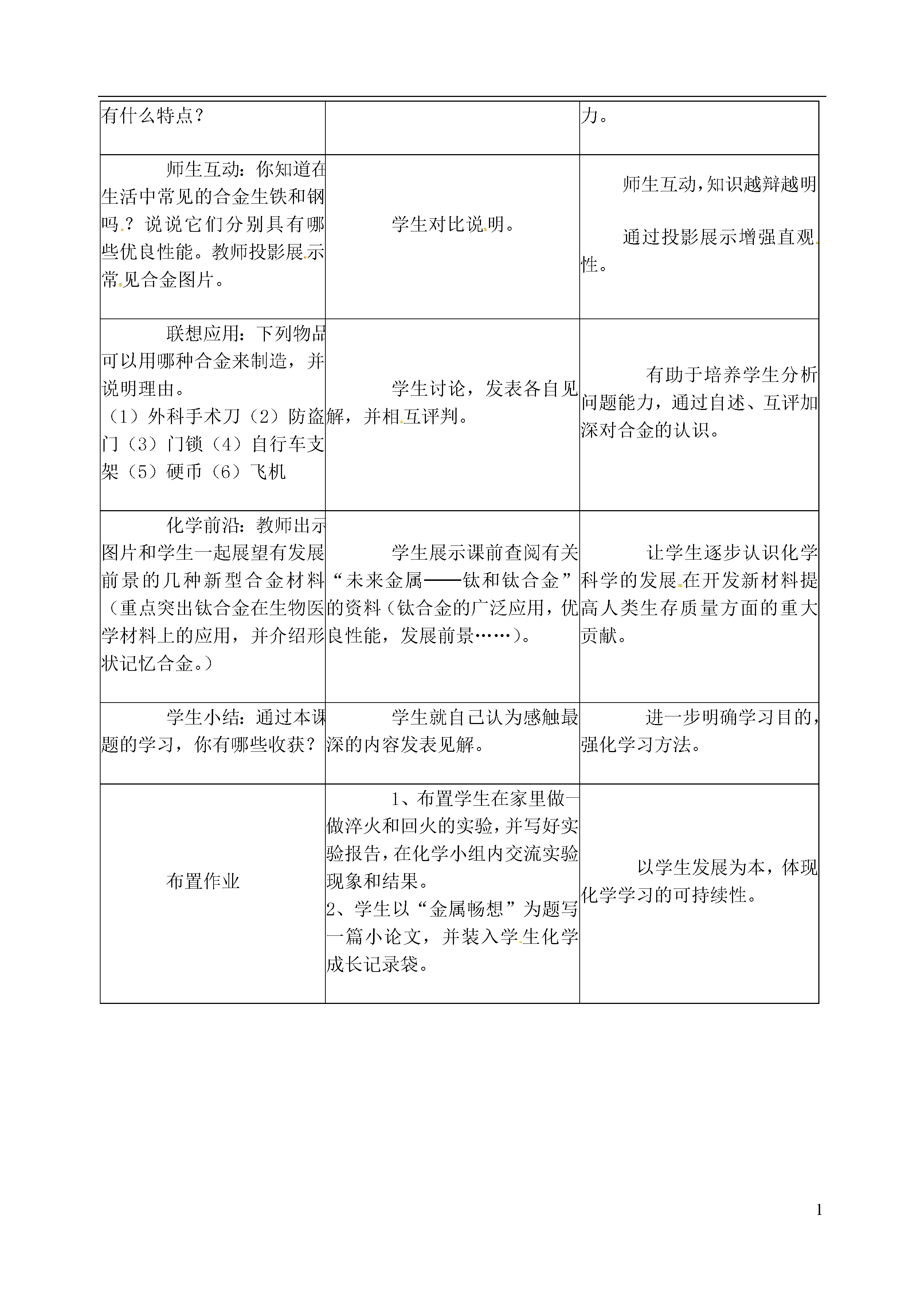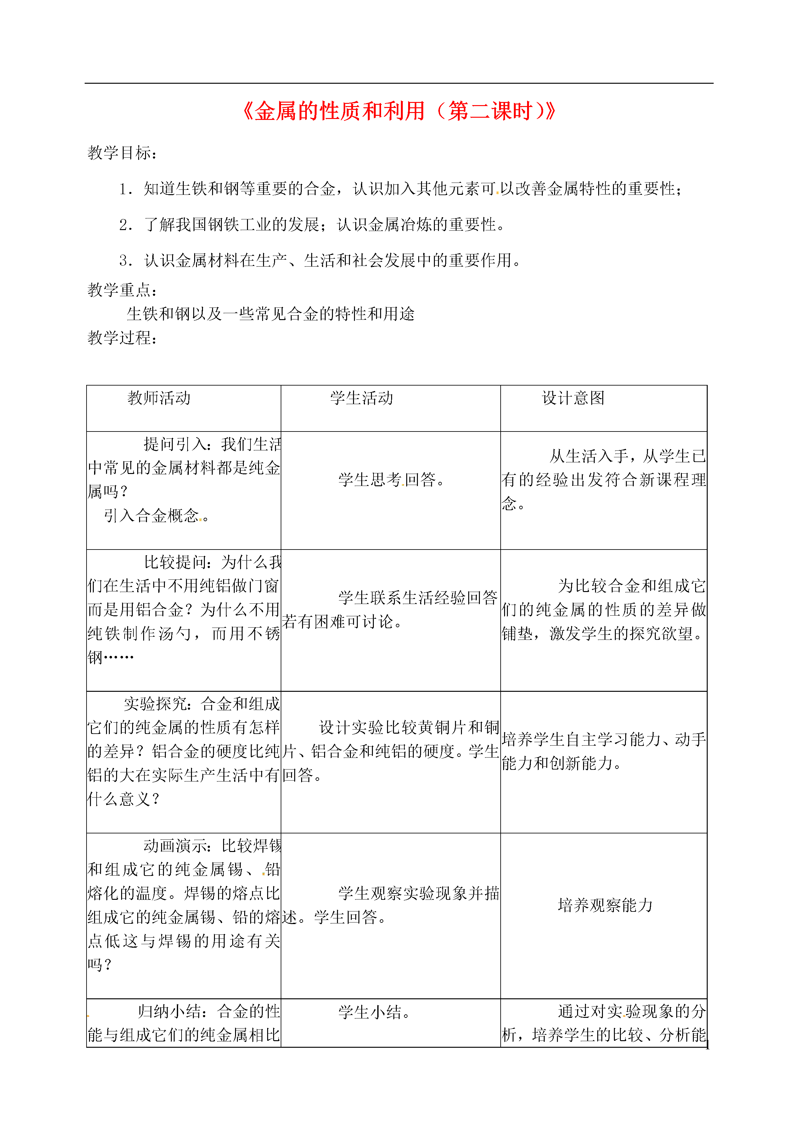 1《金属的性质和利用(第二课时)》教学目标:1.知道生铁和钢等重要的合金,认识加入其他元素可以改善金属特性的重要性;2.了解我国钢铁工业的发展;认识金属冶炼的重要性。3.认识金属材料在生产、生活和社会发展中的重要作用。教学重点:生铁和钢以及一些常见合金的特性和用途教学过程:教师活动学生活动设计意图提问引入:我们生活中常见的金属材料都是纯金属吗?引入合金概念。学生思考回答。从生活入手,从学生已有的经验出发符合新课程理念。比较提问:为什么我们在生活中不用纯铝做门窗,而是用铝合金?为什么不用纯铁制作汤勺,而用不锈钢……学生联系生活经验回答。若有困难可讨论。为比较合金和组成它们的纯金属的性质的差异做铺垫,激发学生的探究欲望。实验探究:合金和组成它们的纯金属的性质有怎样的差异?铝合金的硬度比纯铝的大在实际生产生活中有什么意义?设计实验比较黄铜片和铜片、铝合金和纯铝的硬度。学生回答。培养学生自主学习能力、动手能力和创新能力。动画演示:比较焊锡和组成它的纯金属锡、铅熔化的温度。焊锡的熔点比组成它的纯金属锡、铅的熔点低这与焊锡的用途有关吗?学生观察实验现象并描述。学生回答。培养观察能力归纳小结:合金的性能与组成它们的纯金属相比有什么特点?学生小结。通过对实验现象的分析,培养学生的比较、分析能力。师生互动:你知道在生活中常见的合金生铁和钢吗?说说它们分别具有哪些优良性能。教师投影展示常见合金图片。学生对比说明。师生互动,知识越辩越明。通过投影展示增强直观性。联想应用:下列物品可以用哪种合金来制造,并说明理由。(1)外科手术刀(2)防盗门(3)门锁(4)自行车支架(5)硬币(6)飞机学生讨论,发表各自见解,并相互评判。有助于培养学生分析问题能力,通过自述、互评加深对合金的认识。化学前沿:教师出示图片和学生一起展望有发展前景的几种新型合金材料(重点突出钛合金在生物医学材料上的应用,并介绍形状记忆合金。)学生展示课前查阅有关“未来金属──钛和钛合金”的资料(钛合金的广泛应用,优良性能,发展前景……)。让学生逐步认识化学科学的发展在开发新材料提高人类生存质量方面的重大贡献。学生小结:通过本课题的学习,你有哪些收获?学生就自己认为感触最深的内容发表见解。进一步明确学习目的,强化学习方法。布置作业1、布置学生在家里做一做淬火和回火的实验,并写好实验报告,在化学小组内交流实验现象和结果。2、学生以“金属畅想”为题写一篇小论文,并装入学生化学成长记录袋。以学生发展为本,体现化学学习的可持续性。
