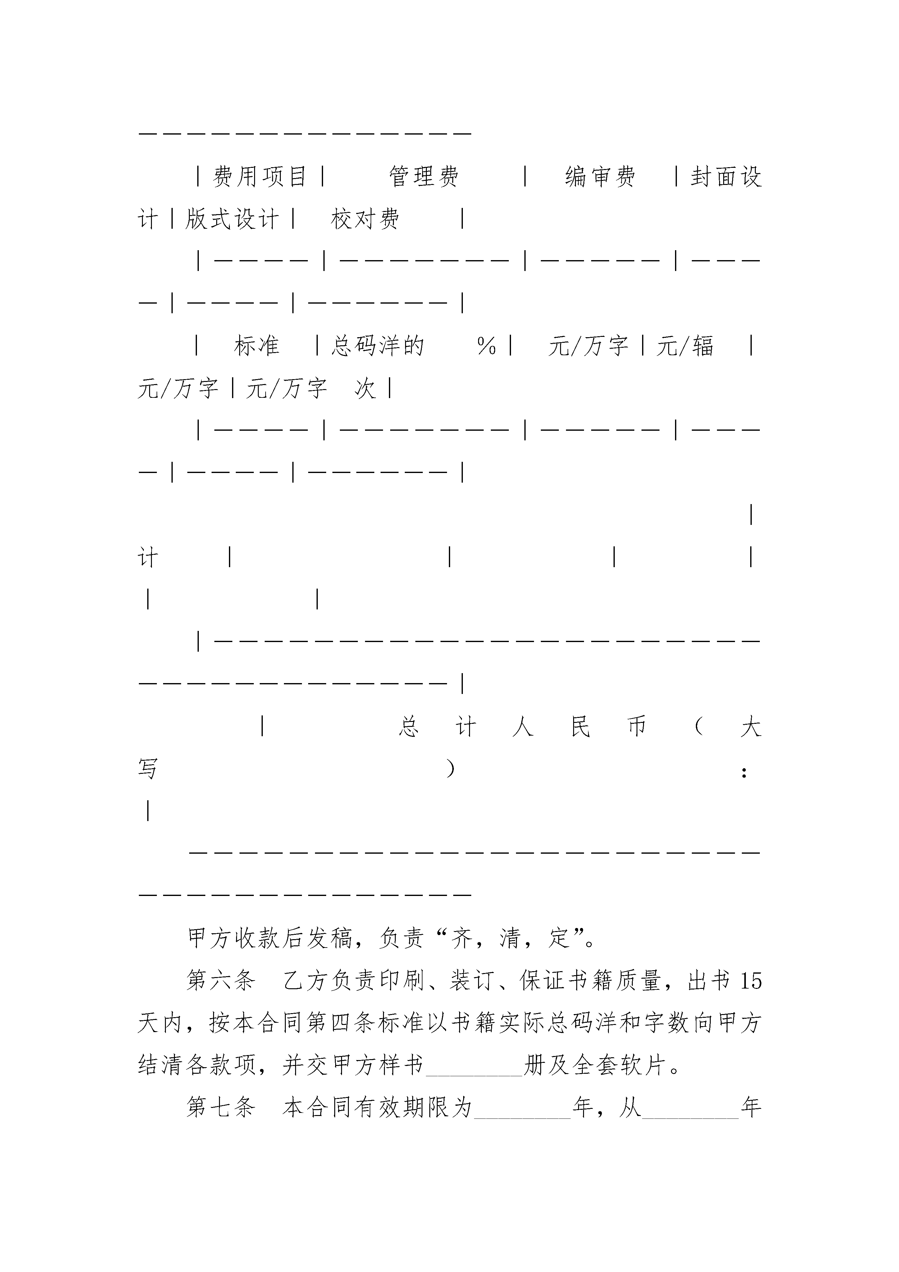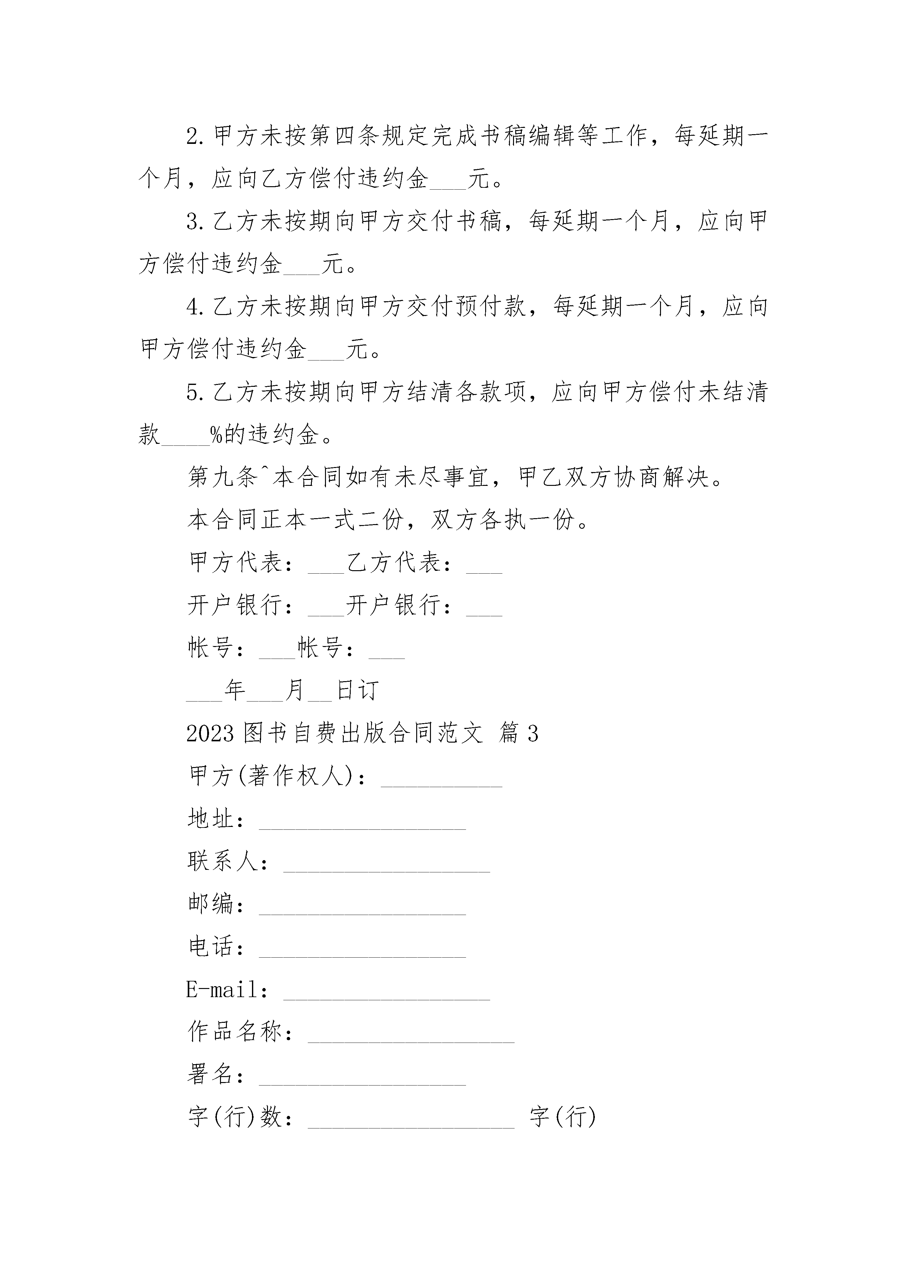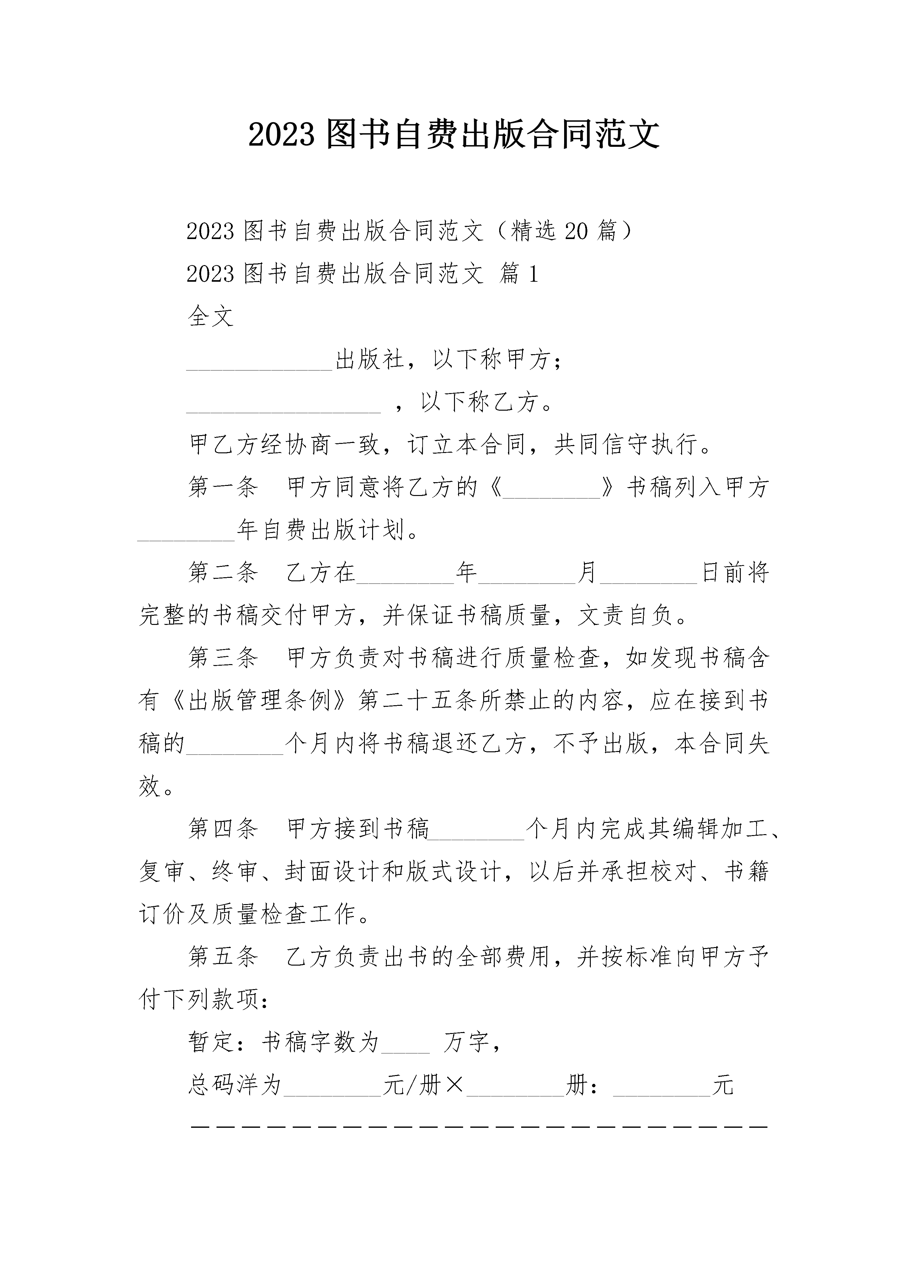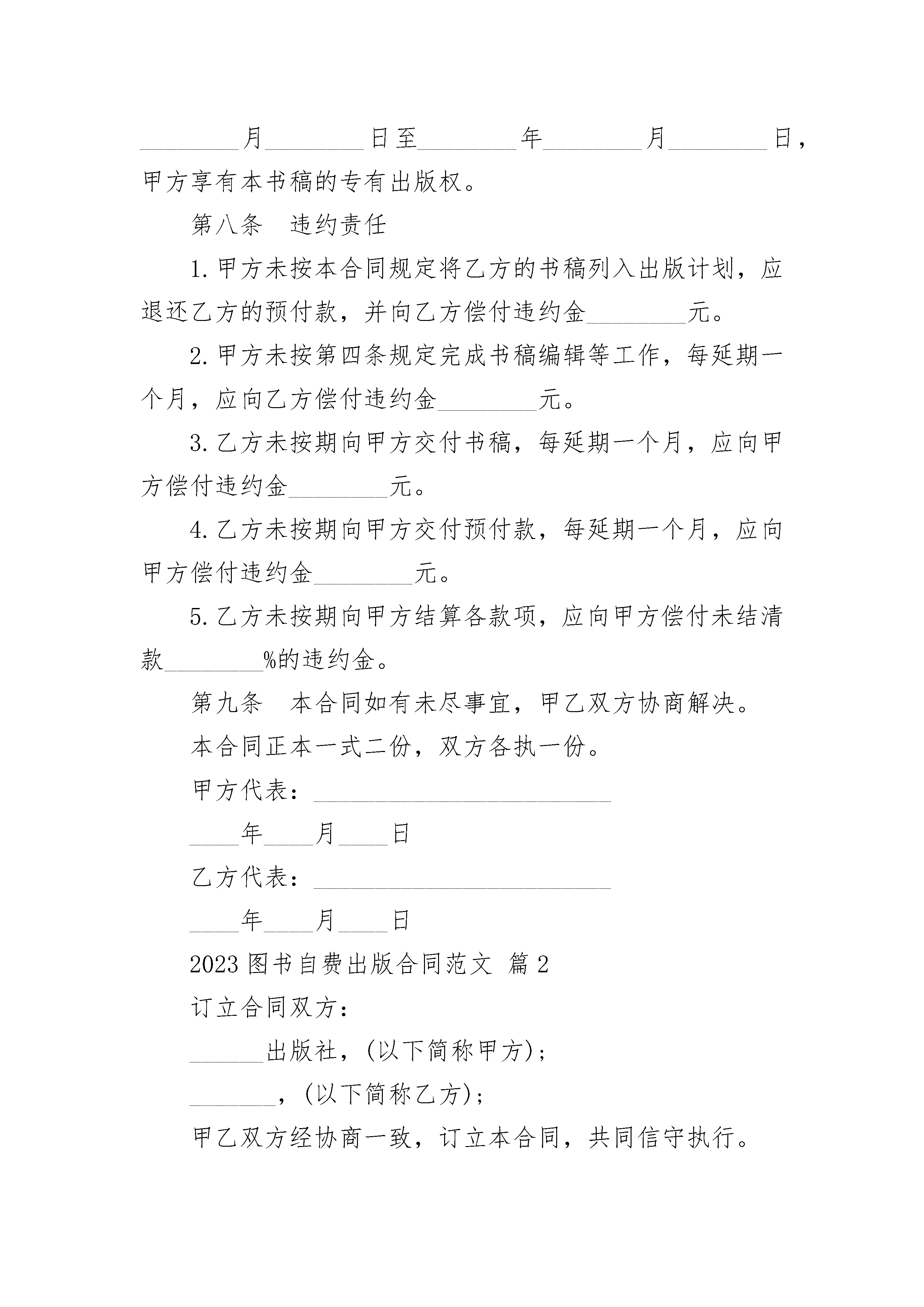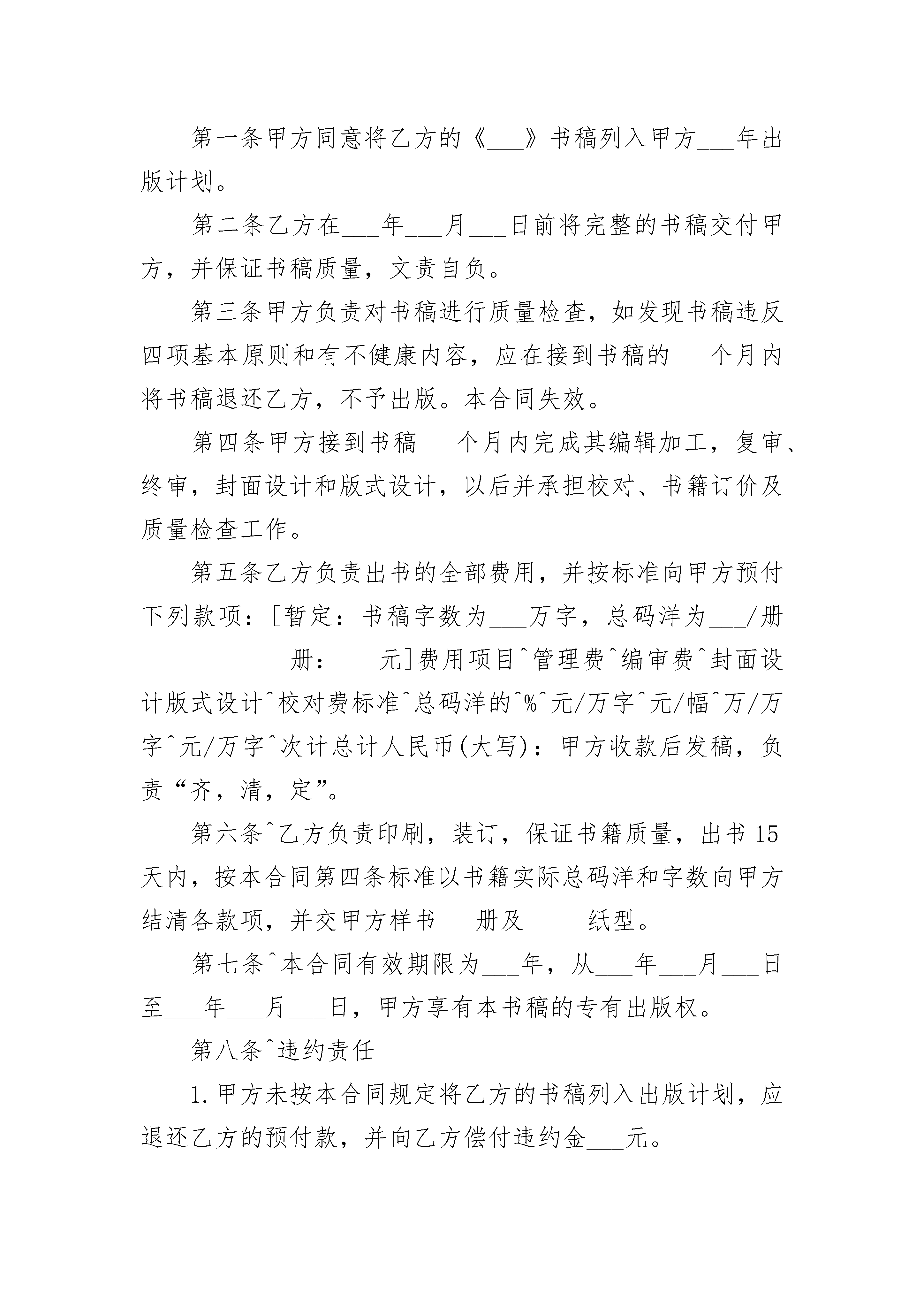 2023图书自费出版合同范文2023图书自费出版合同范文(精选20篇)2023图书自费出版合同范文篇1全文____________出版社,以下称甲方;________________,以下称乙方。甲乙方经协商一致,订立本合同,共同信守执行。第一条甲方同意将乙方的《________》书稿列入甲方________年自费出版计划。第二条乙方在________年________月________日前将完整的书稿交付甲方,并保证书稿质量,文责自负。第三条甲方负责对书稿进行质量检查,如发现书稿含有《出版管理条例》第二十五条所禁止的内容,应在接到书稿的________个月内将书稿退还乙方,不予出版,本合同失效。第四条甲方接到书稿________个月内完成其编辑加工、复审、终审、封面设计和版式设计,以后并承担校对、书籍订价及质量检查工作。第五条乙方负责出书的全部费用,并按标准向甲方予付下列款项:暂定:书稿字数为____万字,总码洋为________元/册×________册:________元-------------------------------------|费用项目|管理费|编审费|封面设计|版式设计|校对费||----|-------|-----|----|----|------||标准|总码洋的%|元/万字|元/辐|元/万字|元/万字次||----|-------|-----|----|----|------||计|||||||-----------------------------------||总计人民币(大写):|-------------------------------------甲方收款后发稿,负责“齐,清,定”。第六条乙方负责印刷、装订、保证书籍质量,出书15天内,按本合同第四条标准以书籍实际总码洋和字数向甲方结清各款项,并交甲方样书________册及全套软片。第七条本合同有效期限为________年,从________年________月________日至________年________月________日,甲方享有本书稿的专有出版权。第八条违约责任1.甲方未按本合同规定将乙方的书稿列入出版计划,应退还乙方的预付款,并向乙方偿付违约金________元。2.甲方未按第四条规定完成书稿编辑等工作,每延期一个月,应向乙方偿付违约金________元。3.乙方未按期向甲方交付书稿,每延期一个月,应向甲方偿付违约金________元。4.乙方未按期向甲方交付预付款,每延期一个月,应向甲方偿付违约金________元。5.乙方未按期向甲方结算各款项,应向甲方偿付未结清款________%的违约金。第九条本合同如有未尽事宜,甲乙双方协商解决。本合同正本一式二份,双方各执一份。甲方代表:____________________________年____月____日乙方代表:____________________________年____月____日2023图书自费出版合同范文篇2订立合同双方:______出版社,(以下简称甲方);_______,(以下简称乙方);甲乙双方经协商一致,订立本合同,共同信守执行。第一条甲方同意将乙方的《___》书稿列入甲方___年出版计划。第二条乙方在___年___月___日前将完整的书稿交付甲方,并保证书稿质量,文责自负。第三条甲方负责对书稿进行质量检查,如发现书稿违反四项基本原则和有不健康内容,应在接到书稿的___个月内将书稿退还乙方,不予出版。本合同失效。第四条甲方接到书稿___个月内完成其编辑加工,复审、终审,封面设计和版式设计,以后并承担校对、书籍订价及质量检查工作。第五条乙方负责出书的全部费用,并按标准向甲方预付下列款项:[暂定:书稿字数为___万字,总码洋为___/册____________册:___元]费用项目^管理费^编审费^封面设计版式设计^校对费标准^总码洋的^%^元/万字^元/幅^万/万字^元/万字^次计总计人民币(大写):甲方收款后发稿,负责“齐,清,定”。第六条^乙方负责印刷,装订,保证书籍质量,出书15天内,按本合同第四条标准以书籍实际总码洋和字数向甲方结清各款项,并交甲方样书___册及_____纸型。第七条^本合同有效期限为___年,从___年___月___日至___年___月___日,甲方享有本书稿的专有出版权。第八条^违约责任1.甲方未按本合同规定将乙方的书稿列入出版计划,应退还乙方的预付款,并向乙方偿付违约金___元。2.甲方未按第四条规定完成书稿编辑等工作,每延期一个月,应向乙方偿付违约金___元。3.乙方未按期向甲方交付书稿,每延期一个月,应向甲方偿付违约金___元。4.乙方未按期向甲方交付预付款,每延期一个月,应向甲方偿付违约金___元。