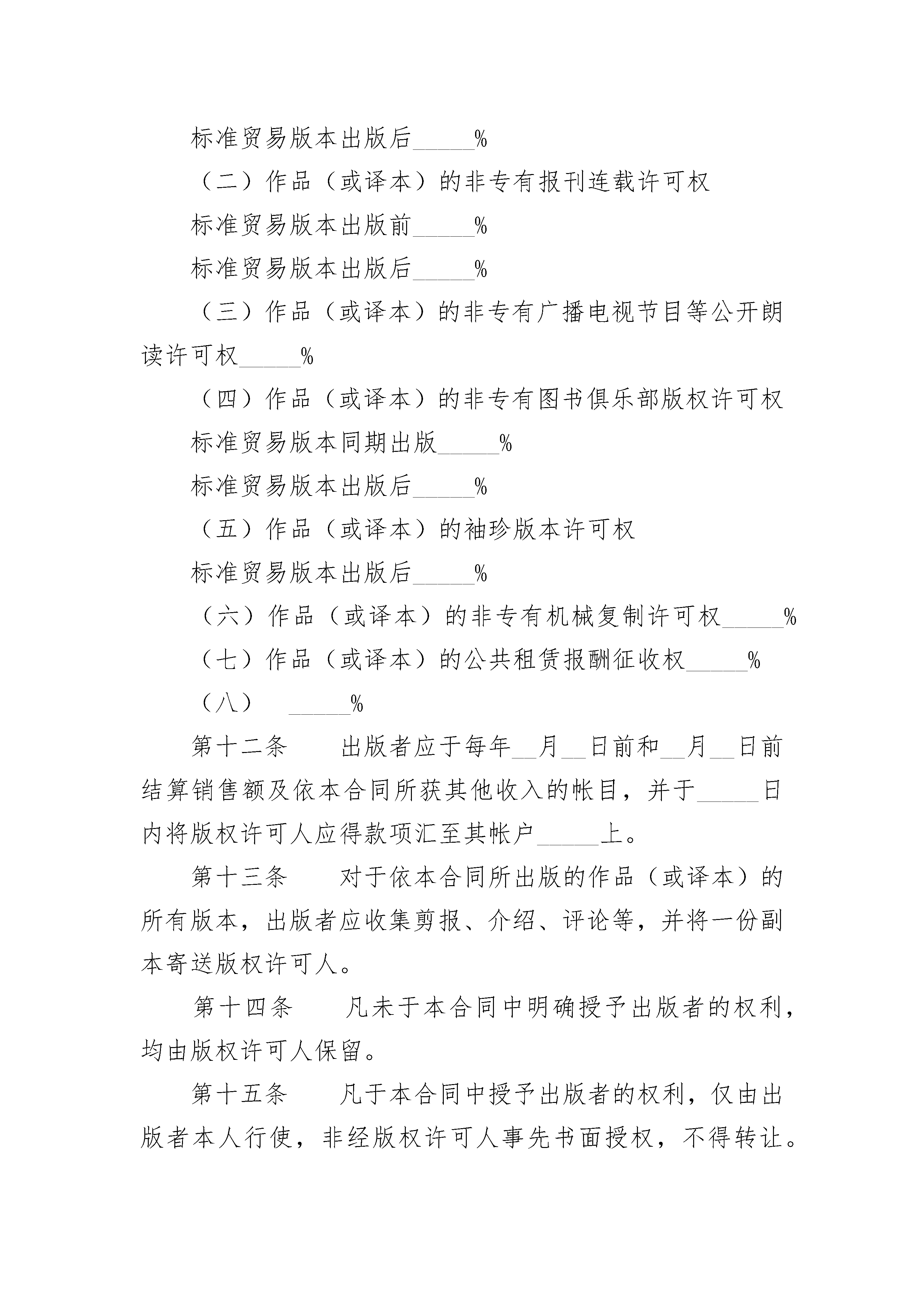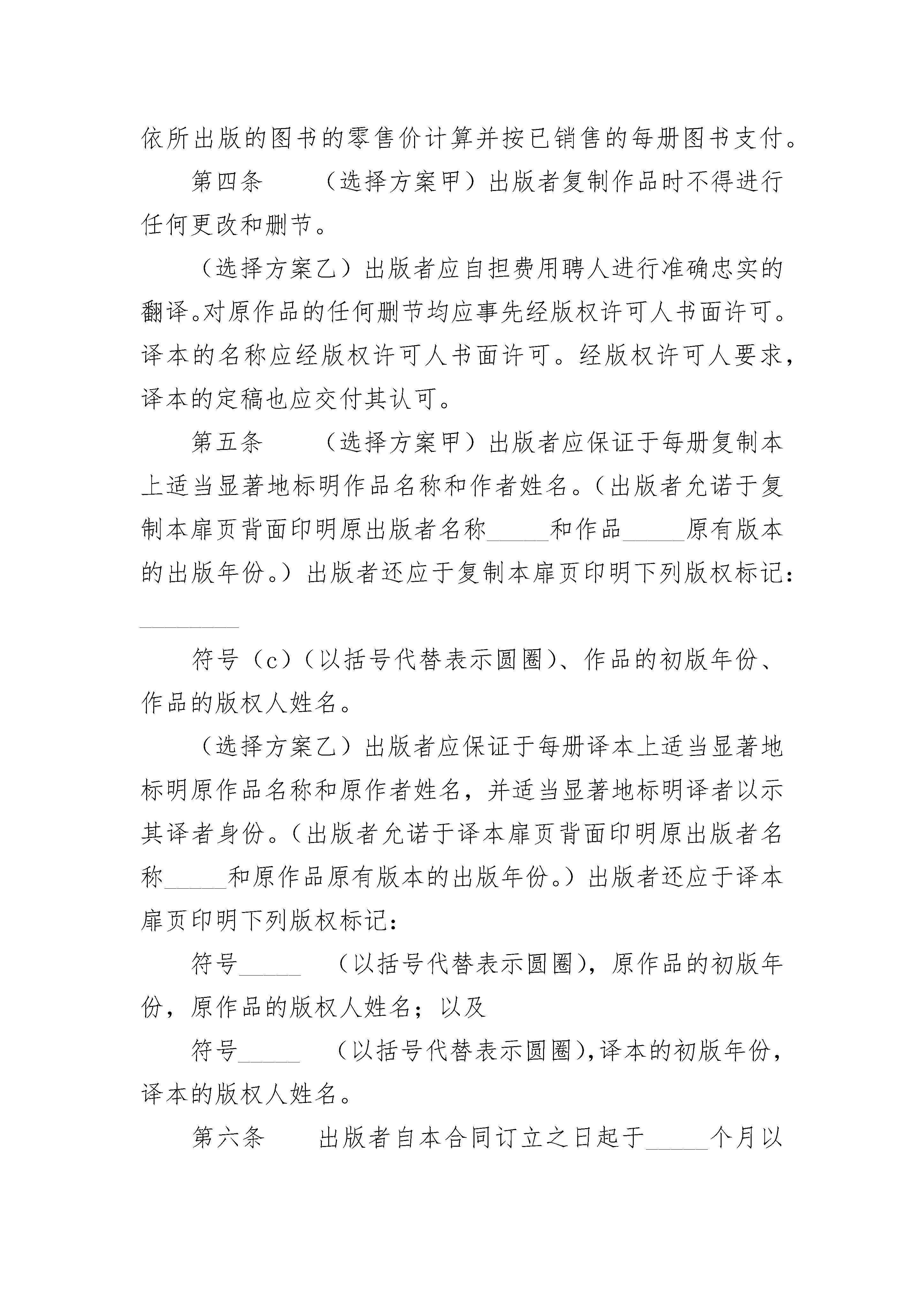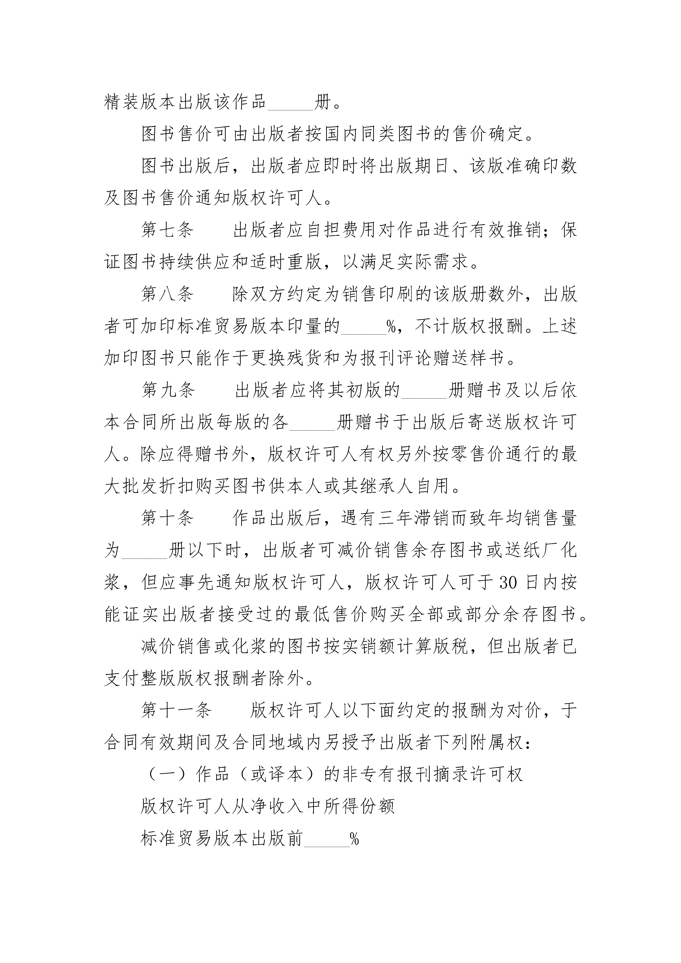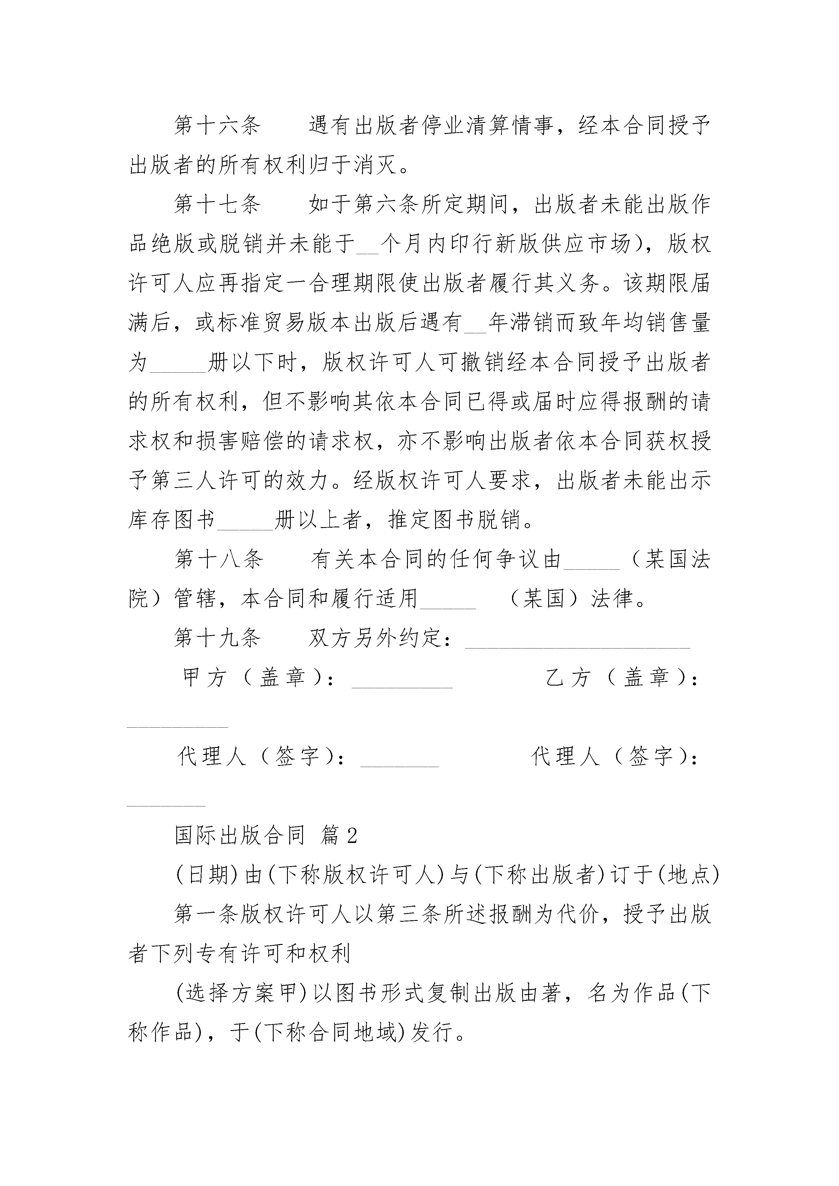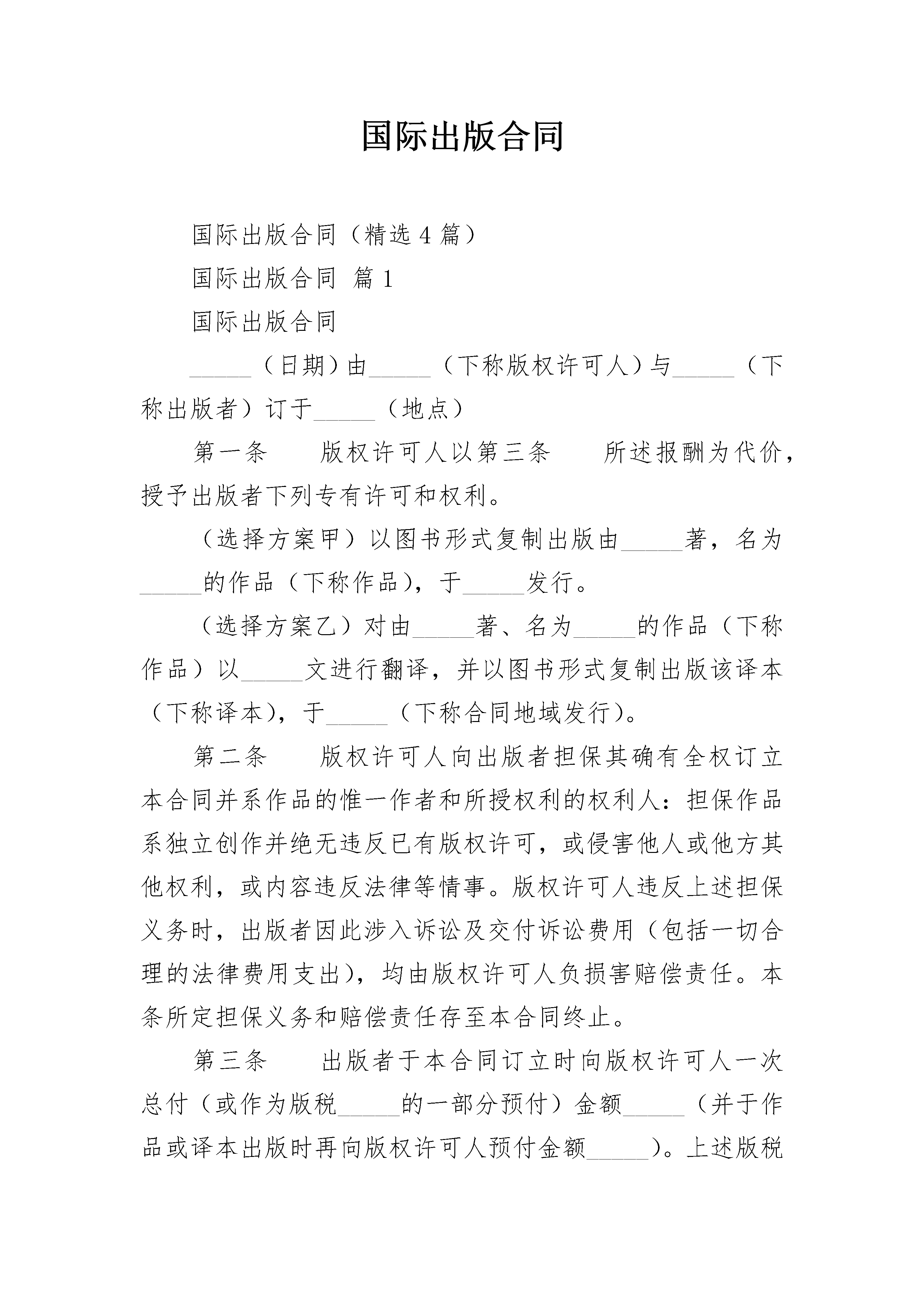 国际出版合同国际出版合同(精选4篇)国际出版合同篇1国际出版合同_____(日期)由_____(下称版权许可人)与_____(下称出版者)订于_____(地点)第一条版权许可人以第三条所述报酬为代价,授予出版者下列专有许可和权利。(选择方案甲)以图书形式复制出版由_____著,名为_____的作品(下称作品),于_____发行。(选择方案乙)对由_____著、名为_____的作品(下称作品)以_____文进行翻译,并以图书形式复制出版该译本(下称译本),于_____(下称合同地域发行)。第二条版权许可人向出版者担保其确有全权订立本合同并系作品的惟一作者和所授权利的权利人:担保作品系独立创作并绝无违反已有版权许可,或侵害他人或他方其他权利,或内容违反法律等情事。版权许可人违反上述担保义务时,出版者因此涉入诉讼及交付诉讼费用(包括一切合理的法律费用支出),均由版权许可人负损害赔偿责任。本条所定担保义务和赔偿责任存至本合同终止。第三条出版者于本合同订立时向版权许可人一次总付(或作为版税_____的一部分预付)金额_____(并于作品或译本出版时再向版权许可人预付金额_____)。上述版税依所出版的图书的零售价计算并按已销售的每册图书支付。第四条(选择方案甲)出版者复制作品时不得进行任何更改和删节。(选择方案乙)出版者应自担费用聘人进行准确忠实的翻译。对原作品的任何删节均应事先经版权许可人书面许可。译本的名称应经版权许可人书面许可。经版权许可人要求,译本的定稿也应交付其认可。第五条(选择方案甲)出版者应保证于每册复制本上适当显著地标明作品名称和作者姓名。(出版者允诺于复制本扉页背面印明原出版者名称_____和作品_____原有版本的出版年份。)出版者还应于复制本扉页印明下列版权标记:________符号(c)(以括号代替表示圆圈)、作品的初版年份、作品的版权人姓名。(选择方案乙)出版者应保证于每册译本上适当显著地标明原作品名称和原作者姓名,并适当显著地标明译者以示其译者身份。(出版者允诺于译本扉页背面印明原出版者名称_____和原作品原有版本的出版年份。)出版者还应于译本扉页印明下列版权标记:符号_____(以括号代替表示圆圈),原作品的初版年份,原作品的版权人姓名;以及符号_____(以括号代替表示圆圈),译本的初版年份,译本的版权人姓名。第六条出版者自本合同订立之日起于_____个月以精装版本出版该作品_____册。图书售价可由出版者按国内同类图书的售价确定。图书出版后,出版者应即时将出版期日、该版准确印数及图书售价通知版权许可人。第七条出版者应自担费用对作品进行有效推销;保证图书持续供应和适时重版,以满足实际需求。第八条除双方约定为销售印刷的该版册数外,出版者可加印标准贸易版本印量的_____%,不计版权报酬。上述加印图书只能作于更换残货和为报刊评论赠送样书。第九条出版者应将其初版的_____册赠书及以后依本合同所出版每版的各_____册赠书于出版后寄送版权许可人。除应得赠书外,版权许可人有权另外按零售价通行的最大批发折扣购买图书供本人或其继承人自用。第十条作品出版后,遇有三年滞销而致年均销售量为_____册以下时,出版者可减价销售余存图书或送纸厂化浆,但应事先通知版权许可人,版权许可人可于30日内按能证实出版者接受过的最低售价购买全部或部分余存图书。减价销售或化浆的图书按实销额计算版税,但出版者已支付整版版权报酬者除外。第十一条版权许可人以下面约定的报酬为对价,于合同有效期间及合同地域内另授予出版者下列附属权:(一)作品(或译本)的非专有报刊摘录许可权版权许可人从净收入中所得份额标准贸易版本出版前_____%标准贸易版本出版后_____%(二)作品(或译本)的非专有报刊连载许可权标准贸易版本出版前_____%标准贸易版本出版后_____%(三)作品(或译本)的非专有广播电视节目等公开朗读许可权_____%(四)作品(或译本)的非专有图书俱乐部版权许可权标准贸易版本同期出版_____%标准贸易版本出版后_____%(五)作品(或译本)的袖珍版本许可权标准贸易版本出版后_____%(六)作品(或译本)的非专有机械复制许可权_____%(七)作品(或译本)的公共租赁报酬征收权_____%(八)_____%第十二条出版者应于每年__月__日前和__月__日前结算销售额及依本合同所获其他收入的帐目,并于_____日内将版权许可人应得款项汇至其帐户_____上。第十三条对于依本合同所出版的作品(或译本)的所有版本,出版者应收集剪报、介绍、评论等,并将一份副本寄送版权许可人。第十四条凡未于本合同中明确授予出版者的权利,均由版权许可人保留。第十五条凡于本合同中授予出版者