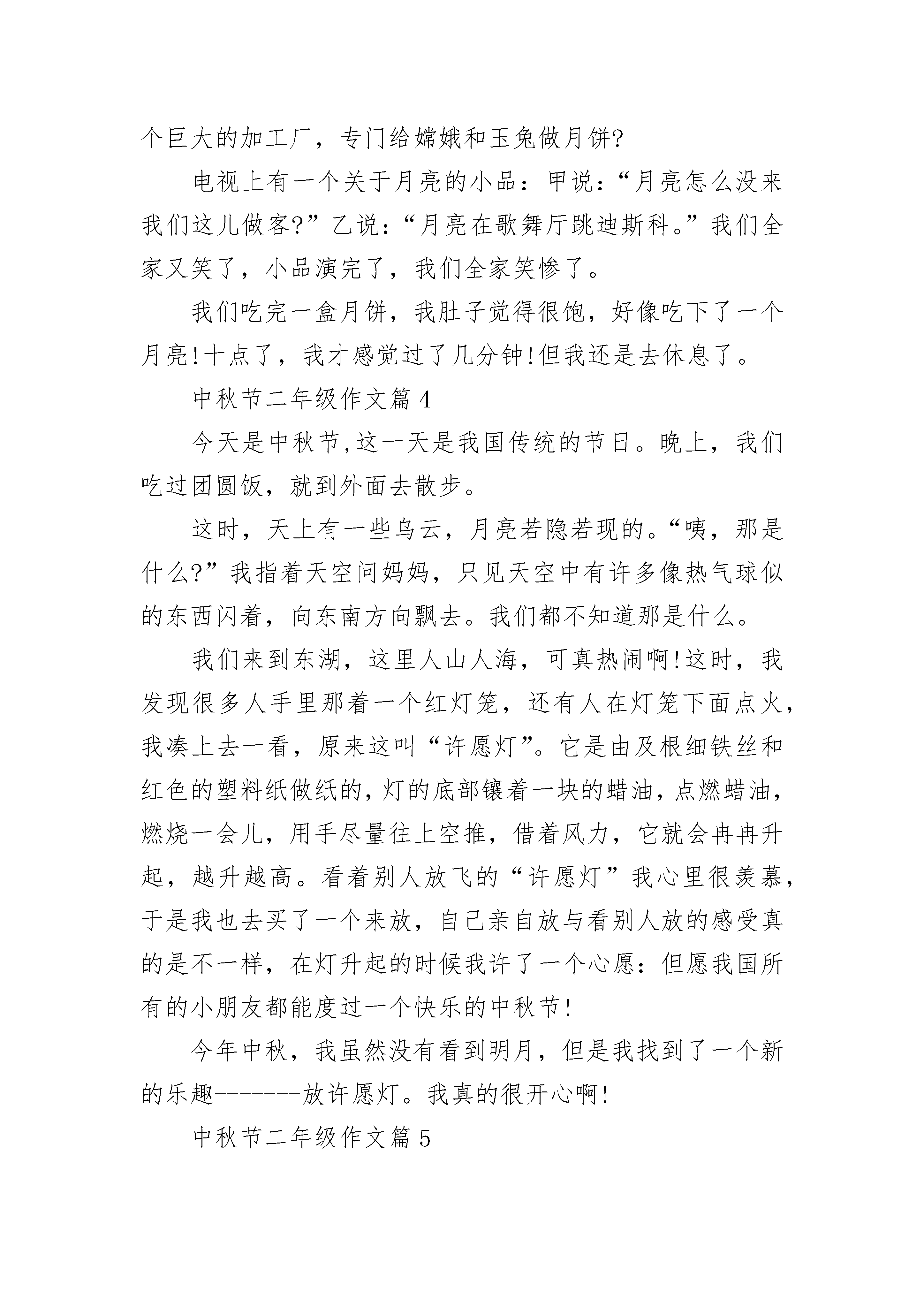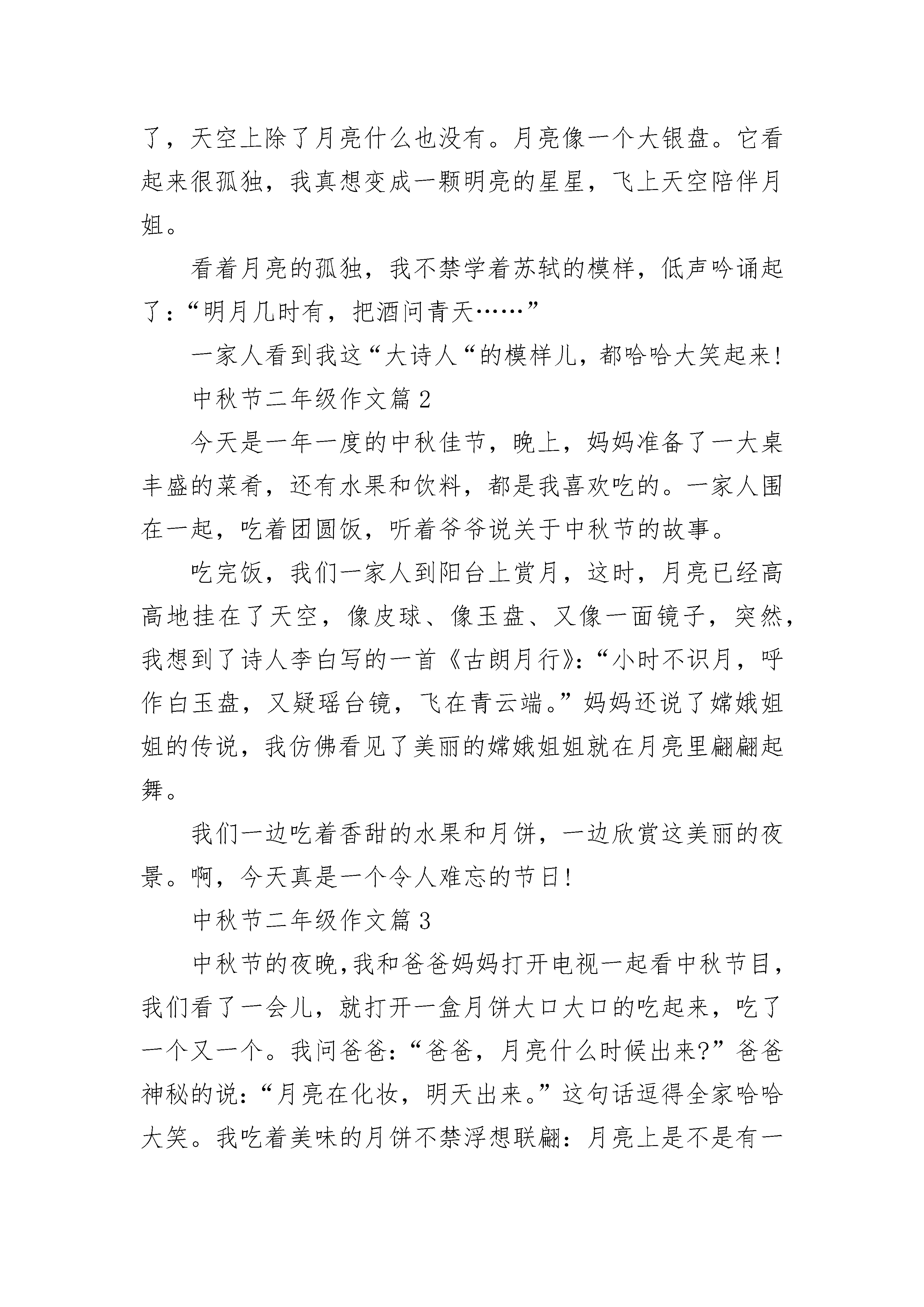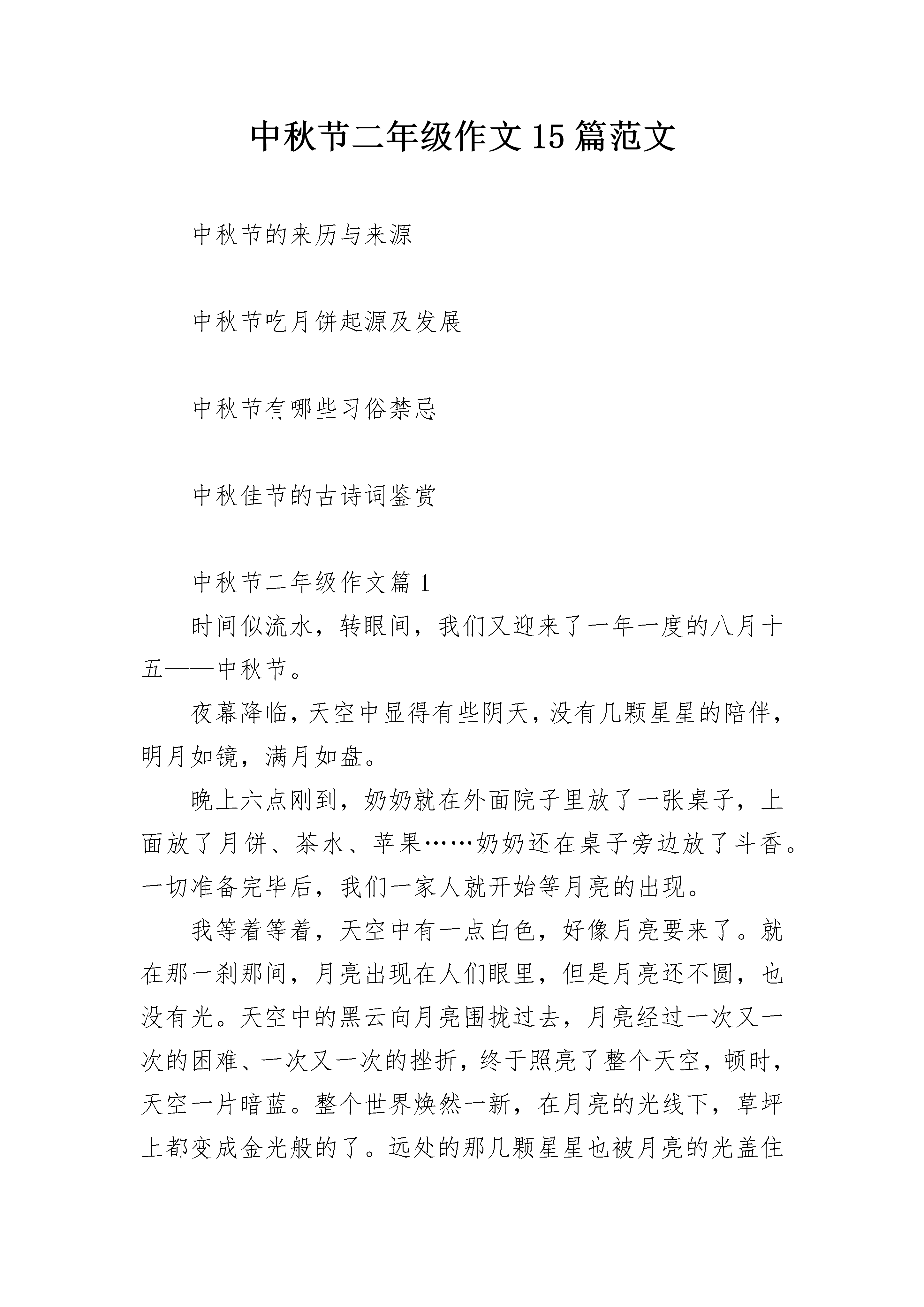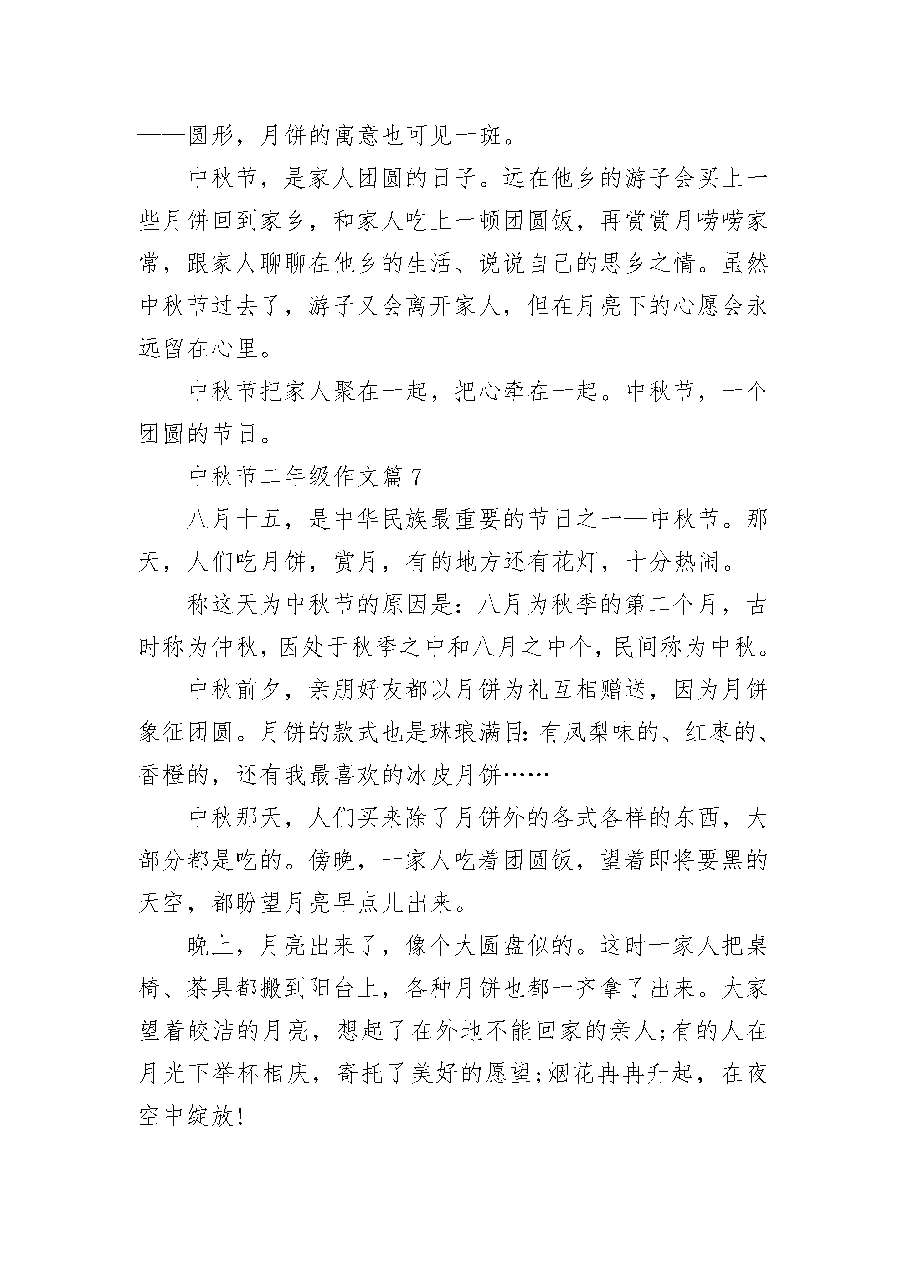 中秋节二年级作文15篇范文中秋节的来历与来源中秋节吃月饼起源及发展中秋节有哪些习俗禁忌中秋佳节的古诗词鉴赏中秋节二年级作文篇1时间似流水,转眼间,我们又迎来了一年一度的八月十五——中秋节。夜幕降临,天空中显得有些阴天,没有几颗星星的陪伴,明月如镜,满月如盘。晚上六点刚到,奶奶就在外面院子里放了一张桌子,上面放了月饼、茶水、苹果……奶奶还在桌子旁边放了斗香。一切准备完毕后,我们一家人就开始等月亮的出现。我等着等着,天空中有一点白色,好像月亮要来了。就在那一刹那间,月亮出现在人们眼里,但是月亮还不圆,也没有光。天空中的黑云向月亮围拢过去,月亮经过一次又一次的困难、一次又一次的挫折,终于照亮了整个天空,顿时,天空一片暗蓝。整个世界焕然一新,在月亮的光线下,草坪上都变成金光般的了。远处的那几颗星星也被月亮的光盖住了,天空上除了月亮什么也没有。月亮像一个大银盘。它看起来很孤独,我真想变成一颗明亮的星星,飞上天空陪伴月姐。看着月亮的孤独,我不禁学着苏轼的模样,低声吟诵起了:“明月几时有,把酒问青天……”一家人看到我这“大诗人“的模样儿,都哈哈大笑起来!中秋节二年级作文篇2今天是一年一度的中秋佳节,晚上,妈妈准备了一大桌丰盛的菜肴,还有水果和饮料,都是我喜欢吃的。一家人围在一起,吃着团圆饭,听着爷爷说关于中秋节的故事。吃完饭,我们一家人到阳台上赏月,这时,月亮已经高高地挂在了天空,像皮球、像玉盘、又像一面镜子,突然,我想到了诗人李白写的一首《古朗月行》:“小时不识月,呼作白玉盘,又疑瑶台镜,飞在青云端。”妈妈还说了嫦娥姐姐的传说,我仿佛看见了美丽的嫦娥姐姐就在月亮里翩翩起舞。我们一边吃着香甜的水果和月饼,一边欣赏这美丽的夜景。啊,今天真是一个令人难忘的节日!中秋节二年级作文篇3中秋节的夜晚,我和爸爸妈妈打开电视一起看中秋节目,我们看了一会儿,就打开一盒月饼大口大口的吃起来,吃了一个又一个。我问爸爸:“爸爸,月亮什么时候出来?”爸爸神秘的说:“月亮在化妆,明天出来。”这句话逗得全家哈哈大笑。我吃着美味的月饼不禁浮想联翩:月亮上是不是有一个巨大的加工厂,专门给嫦娥和玉兔做月饼?电视上有一个关于月亮的小品:甲说:“月亮怎么没来我们这儿做客?”乙说:“月亮在歌舞厅跳迪斯科。”我们全家又笑了,小品演完了,我们全家笑惨了。我们吃完一盒月饼,我肚子觉得很饱,好像吃下了一个月亮!十点了,我才感觉过了几分钟!但我还是去休息了。中秋节二年级作文篇4今天是中秋节,这一天是我国传统的节日。晚上,我们吃过团圆饭,就到外面去散步。这时,天上有一些乌云,月亮若隐若现的。“咦,那是什么?”我指着天空问妈妈,只见天空中有许多像热气球似的东西闪着,向东南方向飘去。我们都不知道那是什么。我们来到东湖,这里人山人海,可真热闹啊!这时,我发现很多人手里那着一个红灯笼,还有人在灯笼下面点火,我凑上去一看,原来这叫“许愿灯”。它是由及根细铁丝和红色的塑料纸做纸的,灯的底部镶着一块的蜡油,点燃蜡油,燃烧一会儿,用手尽量往上空推,借着风力,它就会冉冉升起,越升越高。看着别人放飞的“许愿灯”我心里很羡慕,于是我也去买了一个来放,自己亲自放与看别人放的感受真的是不一样,在灯升起的时候我许了一个心愿:但愿我国所有的小朋友都能度过一个快乐的中秋节!今年中秋,我虽然没有看到明月,但是我找到了一个新的乐趣-------放许愿灯。我真的很开心啊!中秋节二年级作文篇5爸爸带我去富山水库过中秋节,我高兴极了!在路上,我看见了田野、池塘等等很多,美丽极了。到了富山水库我看见有人在钓鱼,后来我和妈妈一起抓鱼网虾,我看见妈妈网的虾一只脚大一只脚小有趣极了。吃过晚饭,我们给一个叫叶星汝的小女孩过生日还给她唱生日歌,叶星汝高兴得眉开眼笑,晚上睡觉的时候我看见两位叔叔带着一个哥哥搭了两个帐蓬睡在里面。早上,我起来看见水库上有一层大雾,等雾散了,我就去钓鱼,第一次钓上了鱼我很高兴,没想到那些鱼那么狡猾,鱼饵没了,鱼也没钓上。后来我们去烧烤准备好食物就开始烤了我拿了一串鸡翅去烤,翻来翻去就怕烫到手。烧烤结束后我以为烧烤就是午饭没想到午饭是自己钓的鱼,自己钓的鱼还挺好吃的,到了晚上,我们去水洋吃饭,饭后开开心心地回家了。中秋节二年级作文篇6中秋节,一个花好月圆的节日。在这个节日里,月亮满盈,家家团圆。夜晚,玉盘似的月亮高高挂在天上。嫦娥端坐在桌前眺望人间,寻找着后羿;玉兔伴在嫦娥身边,不停地捣着药;吴刚砍树,一边想着,何时才能回家。这时的月亮比往日的更亮、更圆,云再也挡不住她的光芒,边上的星星也悄悄藏了起来,她成了夜空里的太阳,给夜多添了几分宁静。中秋节,月饼是不可或缺的。随着时光的推移,经过多年变迁,月饼的口味越来越多,但它的形状是永远不变的——圆形,月饼的寓意也可见一斑。中秋节,是家人团圆的日子。远在他乡的游子会买上