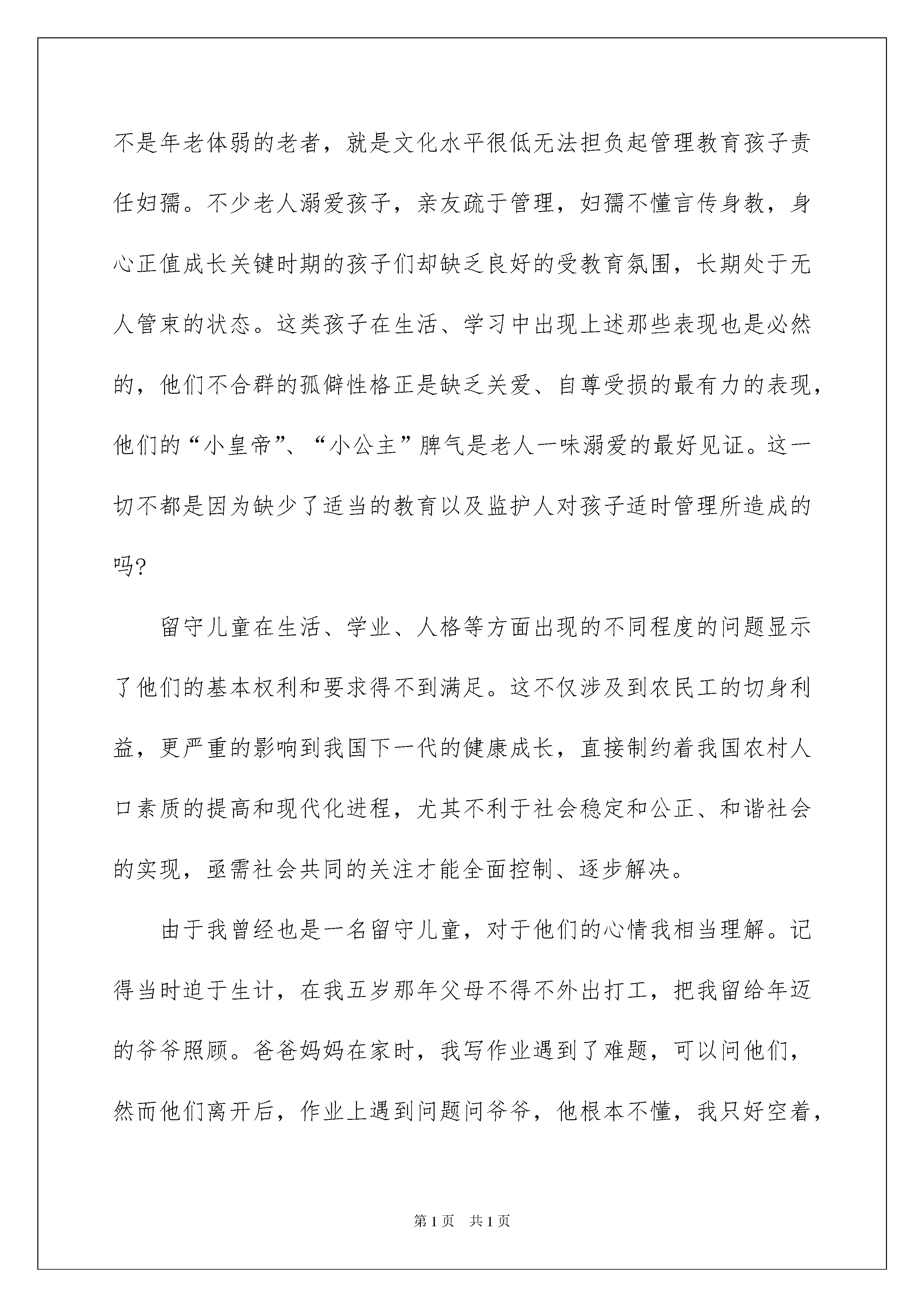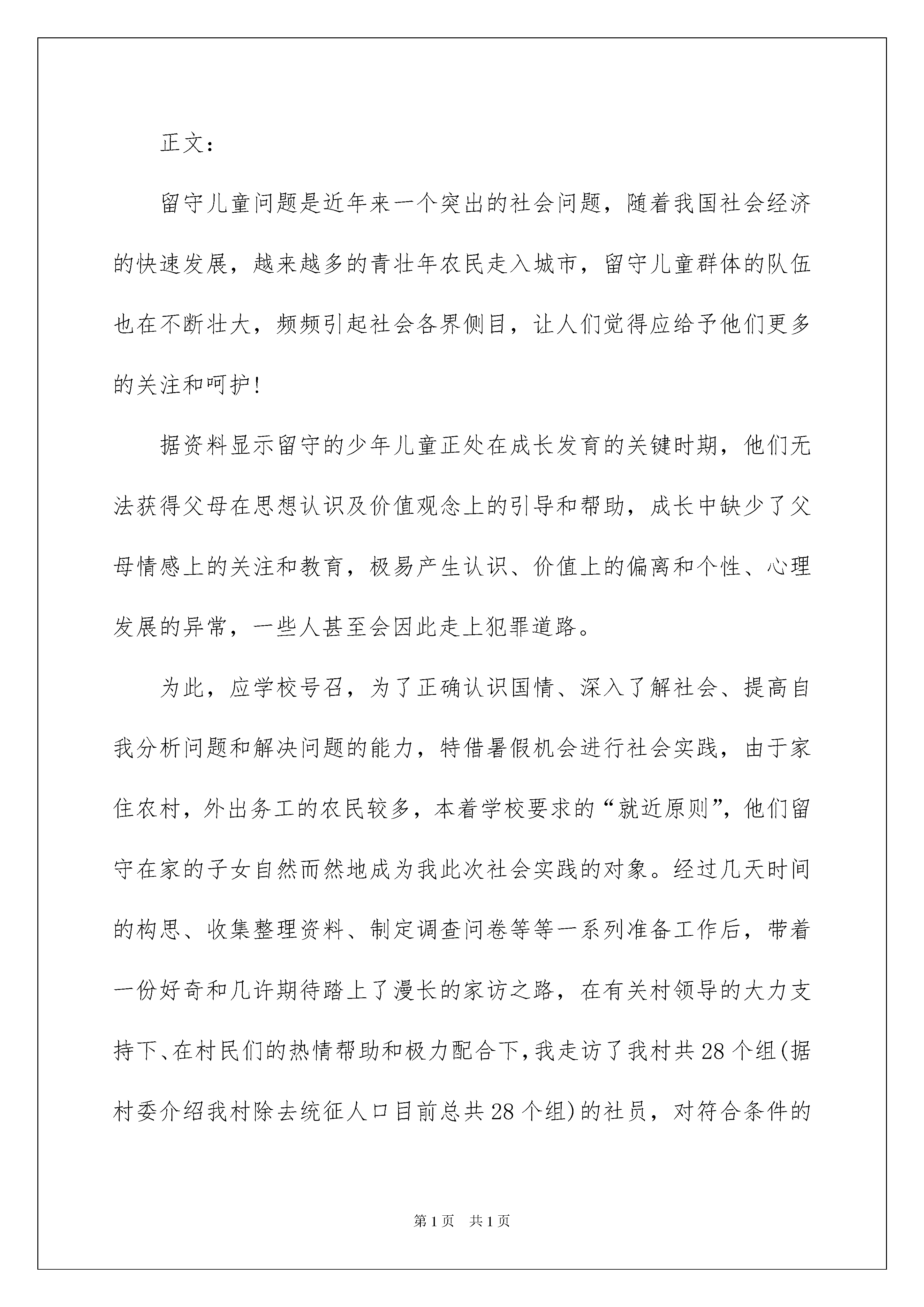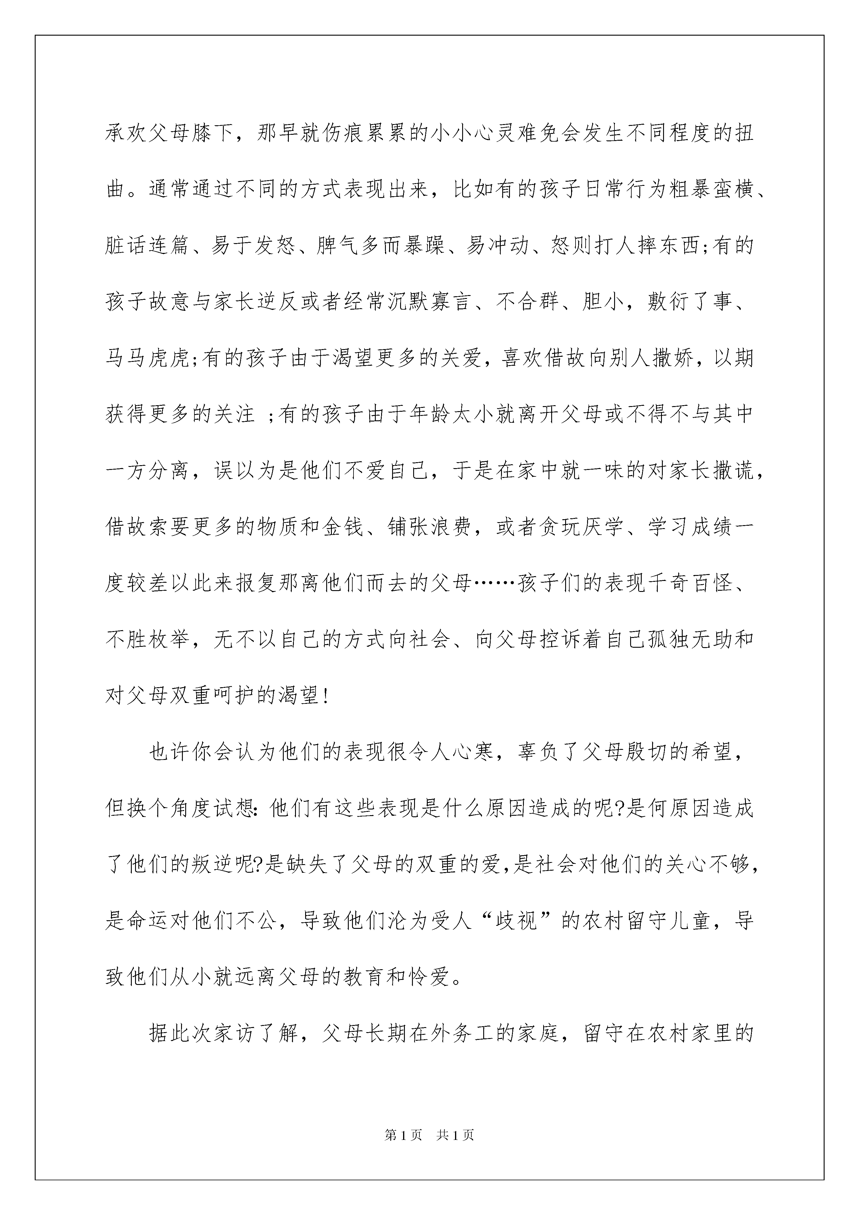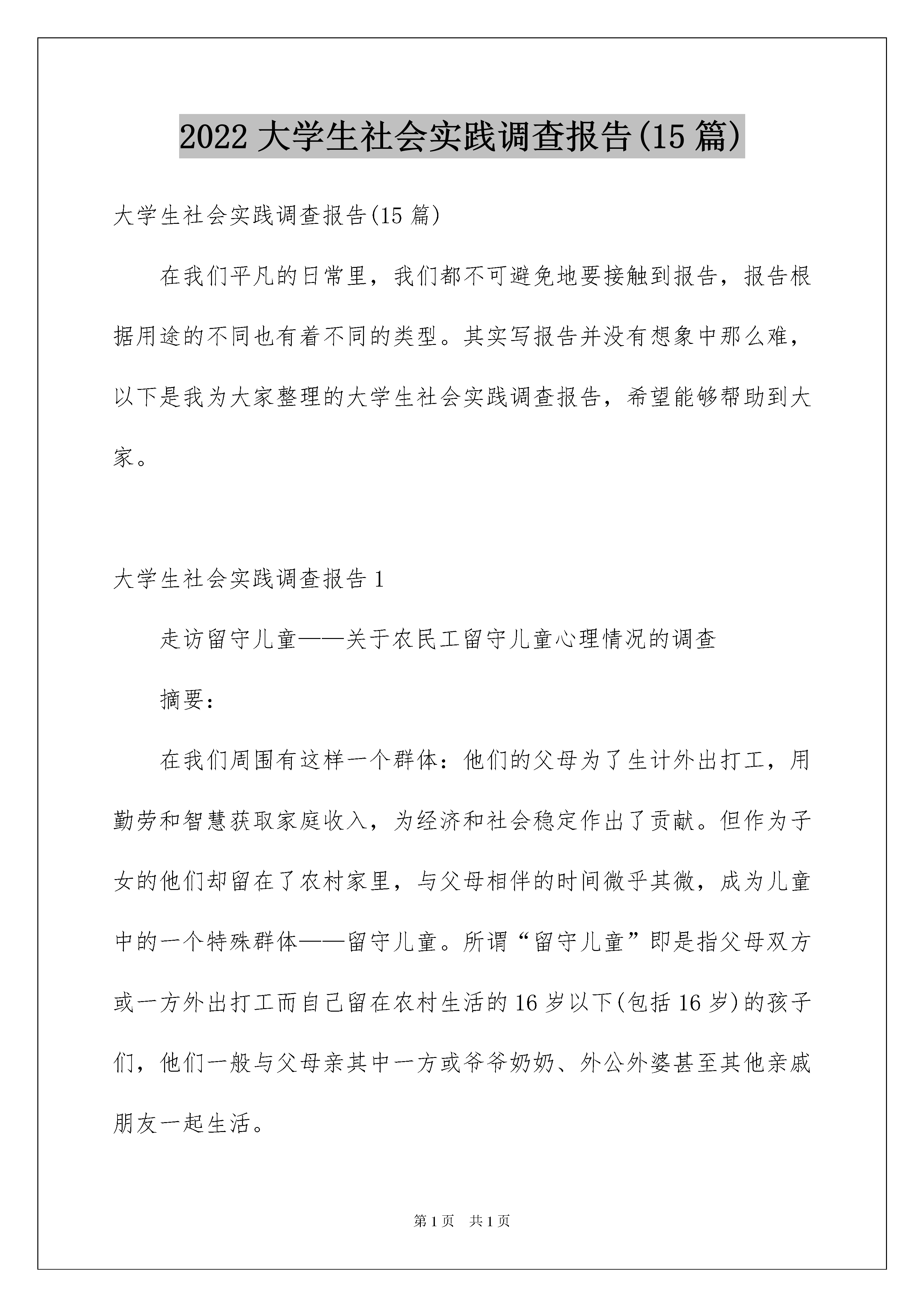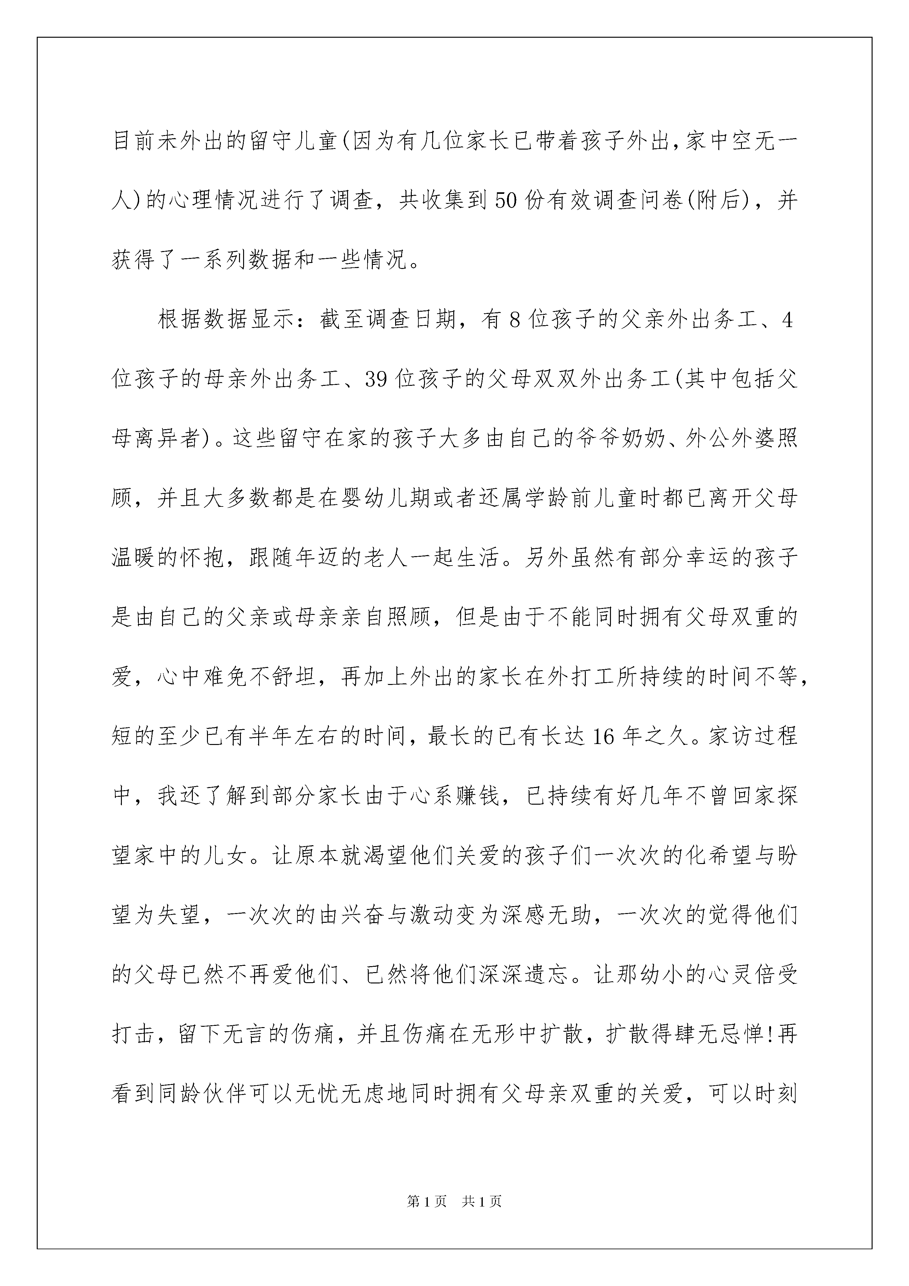 2022大学生社会实践调查报告(15篇)大学生社会实践调查报告(15篇)在我们平凡的日常里,我们都不可避免地要接触到报告,报告根据用途的不同也有着不同的类型。其实写报告并没有想象中那么难,以下是我为大家整理的大学生社会实践调查报告,希望能够帮助到大家。大学生社会实践调查报告1走访留守儿童——关于农民工留守儿童心理情况的调查摘要:在我们周围有这样一个群体:他们的父母为了生计外出打工,用勤劳和智慧获取家庭收入,为经济和社会稳定作出了贡献。但作为子女的他们却留在了农村家里,与父母相伴的时间微乎其微,成为儿童中的一个特殊群体——留守儿童。所谓“留守儿童”即是指父母双方或一方外出打工而自己留在农村生活的16岁以下(包括16岁)的孩子们,他们一般与父母亲其中一方或爷爷奶奶、外公外婆甚至其他亲戚朋友一起生活。正文:留守儿童问题是近年来一个突出的社会问题,随着我国社会经济的快速发展,越来越多的青壮年农民走入城市,留守儿童群体的队伍也在不断壮大,频频引起社会各界侧目,让人们觉得应给予他们更多的关注和呵护!据资料显示留守的少年儿童正处在成长发育的关键时期,他们无法获得父母在思想认识及价值观念上的引导和帮助,成长中缺少了父母情感上的关注和教育,极易产生认识、价值上的偏离和个性、心理发展的异常,一些人甚至会因此走上犯罪道路。为此,应学校号召,为了正确认识国情、深入了解社会、提高自我分析问题和解决问题的能力,特借暑假机会进行社会实践,由于家住农村,外出务工的农民较多,本着学校要求的“就近原则”,他们留守在家的子女自然而然地成为我此次社会实践的对象。经过几天时间的构思、收集整理资料、制定调查问卷等等一系列准备工作后,带着一份好奇和几许期待踏上了漫长的家访之路,在有关村领导的大力支持下、在村民们的热情帮助和极力配合下,我走访了我村共28个组(据村委介绍我村除去统征人口目前总共28个组)的社员,对符合条件的目前未外出的留守儿童(因为有几位家长已带着孩子外出,家中空无一人)的心理情况进行了调查,共收集到50份有效调查问卷(附后),并获得了一系列数据和一些情况。根据数据显示:截至调查日期,有8位孩子的父亲外出务工、4位孩子的母亲外出务工、39位孩子的父母双双外出务工(其中包括父母离异者)。这些留守在家的孩子大多由自己的爷爷奶奶、外公外婆照顾,并且大多数都是在婴幼儿期或者还属学龄前儿童时都已离开父母温暖的怀抱,跟随年迈的老人一起生活。另外虽然有部分幸运的孩子是由自己的父亲或母亲亲自照顾,但是由于不能同时拥有父母双重的爱,心中难免不舒坦,再加上外出的家长在外打工所持续的时间不等,短的至少已有半年左右的时间,最长的已有长达16年之久。家访过程中,我还了解到部分家长由于心系赚钱,已持续有好几年不曾回家探望家中的儿女。让原本就渴望他们关爱的孩子们一次次的化希望与盼望为失望,一次次的由兴奋与激动变为深感无助,一次次的觉得他们的父母已然不再爱他们、已然将他们深深遗忘。让那幼小的心灵倍受打击,留下无言的伤痛,并且伤痛在无形中扩散,扩散得肆无忌惮!再看到同龄伙伴可以无忧无虑地同时拥有父母亲双重的关爱,可以时刻承欢父母膝下,那早就伤痕累累的小小心灵难免会发生不同程度的扭曲。通常通过不同的方式表现出来,比如有的孩子日常行为粗暴蛮横、脏话连篇、易于发怒、脾气多而暴躁、易冲动、怒则打人摔东西;有的孩子故意与家长逆反或者经常沉默寡言、不合群、胆小,敷衍了事、马马虎虎;有的孩子由于渴望更多的关爱,喜欢借故向别人撒娇,以期获得更多的关注;有的孩子由于年龄太小就离开父母或不得不与其中一方分离,误以为是他们不爱自己,于是在家中就一味的对家长撒谎,借故索要更多的物质和金钱、铺张浪费,或者贪玩厌学、学习成绩一度较差以此来报复那离他们而去的父母……孩子们的表现千奇百怪、不胜枚举,无不以自己的方式向社会、向父母控诉着自己孤独无助和对父母双重呵护的渴望!也许你会认为他们的表现很令人心寒,辜负了父母殷切的希望,但换个角度试想:他们有这些表现是什么原因造成的呢?是何原因造成了他们的叛逆呢?是缺失了父母的双重的爱,是社会对他们的关心不够,是命运对他们不公,导致他们沦为受人“歧视”的农村留守儿童,导致他们从小就远离父母的教育和怜爱。据此次家访了解,父母长期在外务工的家庭,留守在农村家里的不是年老体弱的老者,就是文化水平很低无法担负起管理教育孩子责任妇孺。不少老人溺爱孩子,亲友疏于管理,妇孺不懂言传身教,身心正值成长关键时期的孩子们却缺乏良好的受教育氛围,长期处于无人管束的状态。这类孩子在生活、学习中出现上述那些表现也是必然的,他们不合群的孤僻性格正是缺乏关爱、