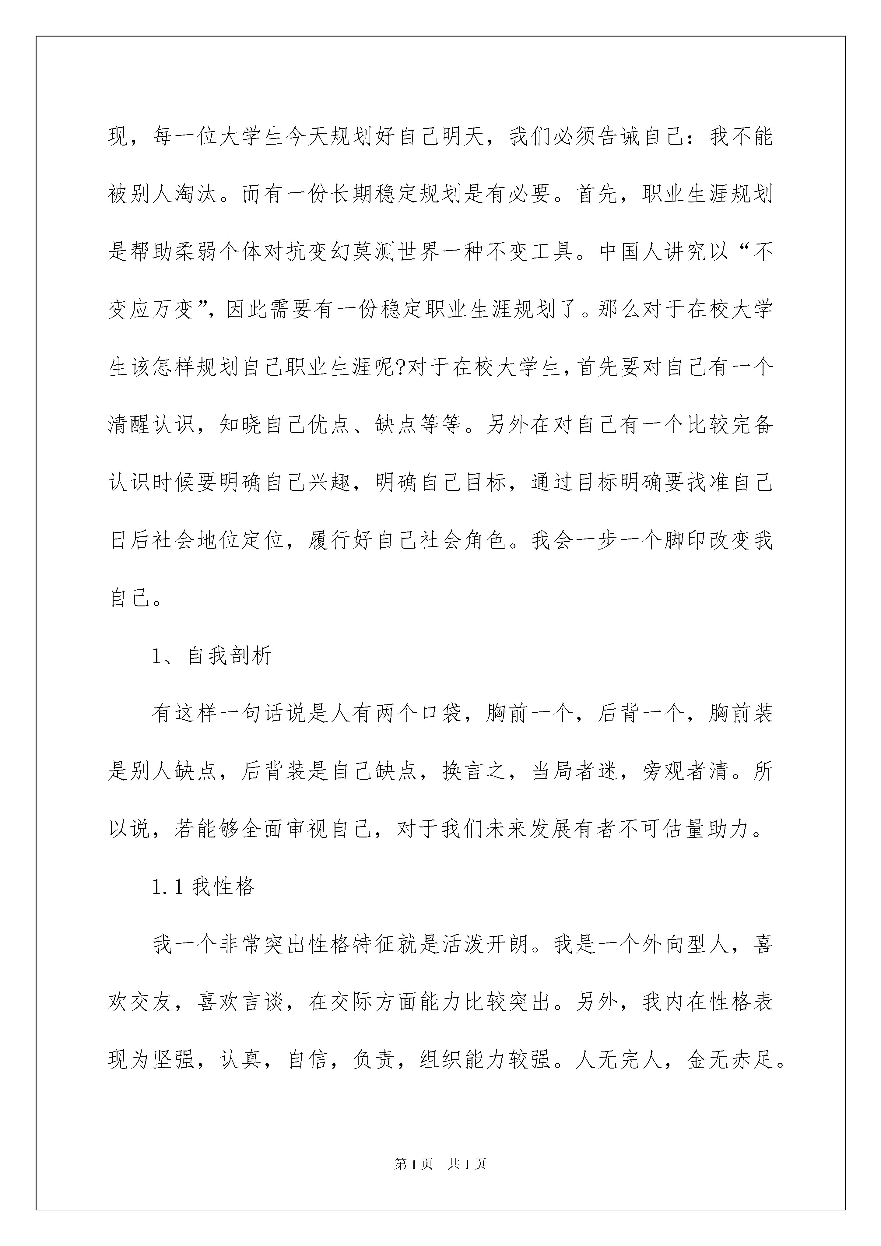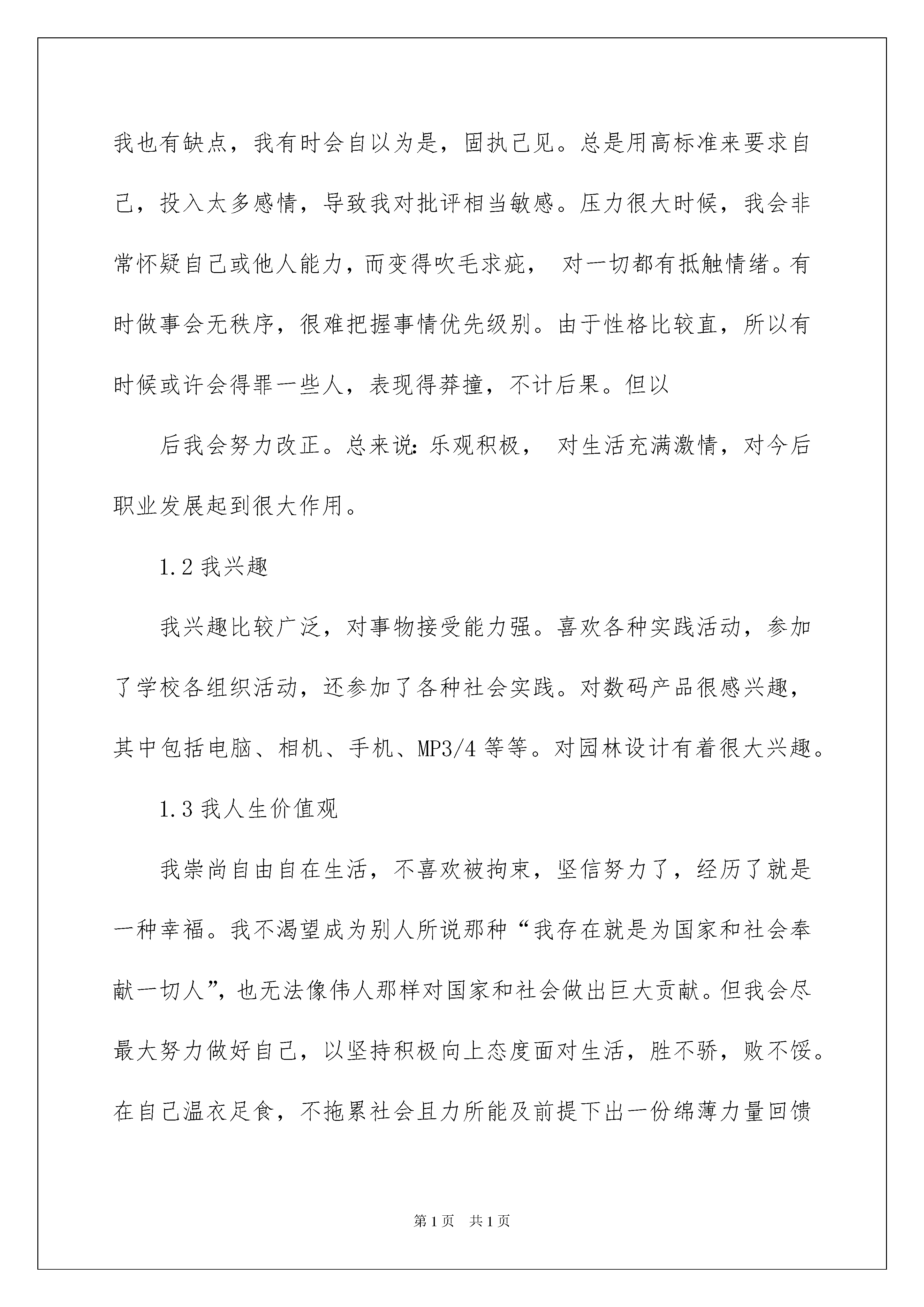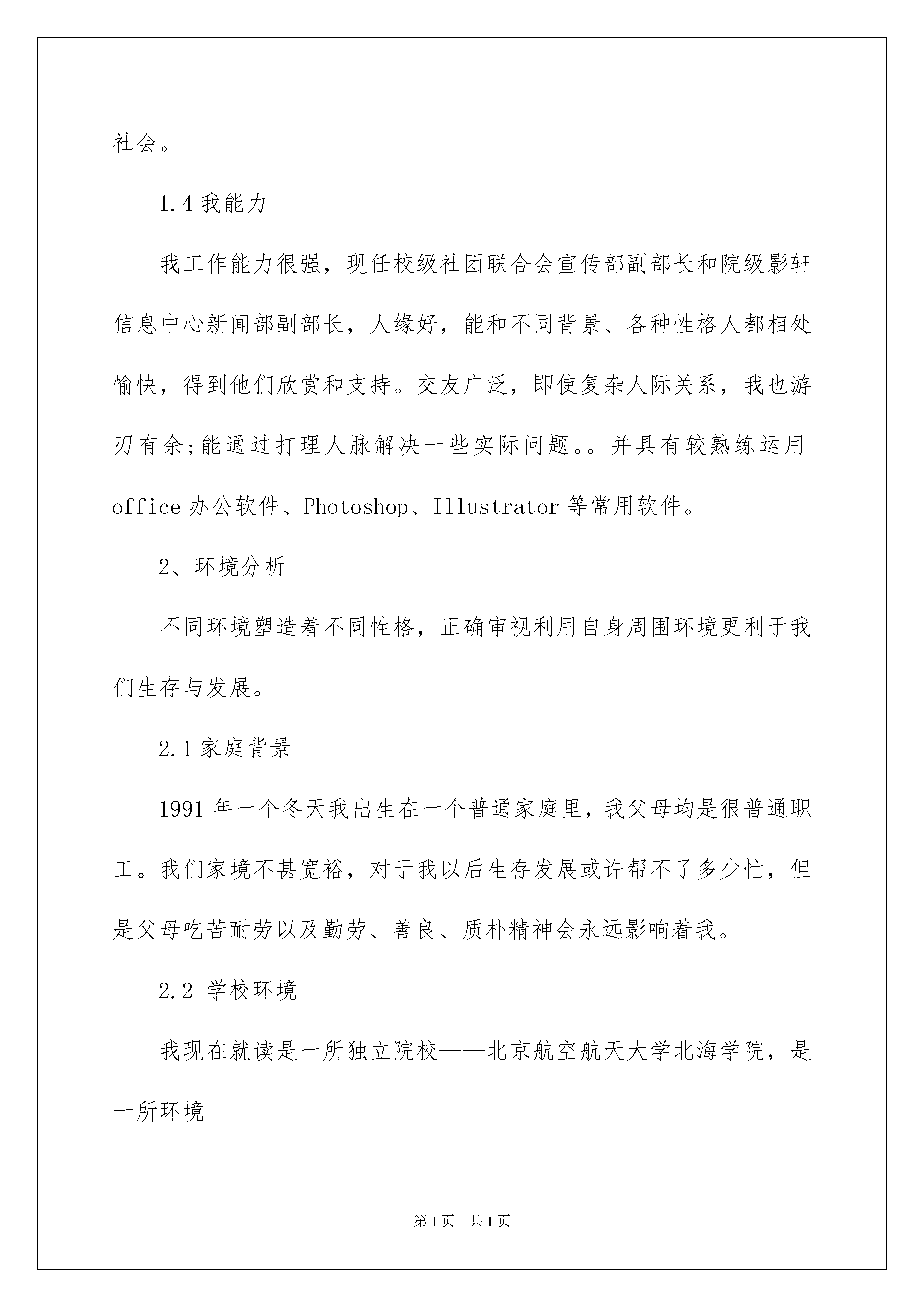 2022大学生职业规划六篇大学生职业规划六篇日子总是像从指尖流过的细沙,在不经意间悄然滑落,我们又将抒写新的诗篇,让我们对今后的职业发展方向做个计划吧。你知道怎样的职业规划才是适合自己的吗?下面是我为大家整理的大学生职业规划6篇,欢迎大家分享。大学生职业规划篇1摘要:在今天这个人才竞争时代,职业生涯规划开始成为在人争夺战中另一重要利器,对企业而言,如何体现公司“以人为本”人才理念,关注员工人才理念,关注员工持续成长,职业生涯规划是一种有效手段;而对每个人而言,职业生命是有限,如果不进行有效规划,势必会造成生命和时间浪费。关键字:职业规划大学生前言:我未来不是梦,因为我选择了我喜欢园林专业,我梦想就可以实现,每一位大学生今天规划好自己明天,我们必须告诫自己:我不能被别人淘汰。而有一份长期稳定规划是有必要。首先,职业生涯规划是帮助柔弱个体对抗变幻莫测世界一种不变工具。中国人讲究以“不变应万变”,因此需要有一份稳定职业生涯规划了。那么对于在校大学生该怎样规划自己职业生涯呢?对于在校大学生,首先要对自己有一个清醒认识,知晓自己优点、缺点等等。另外在对自己有一个比较完备认识时候要明确自己兴趣,明确自己目标,通过目标明确要找准自己日后社会地位定位,履行好自己社会角色。我会一步一个脚印改变我自己。1、自我剖析有这样一句话说是人有两个口袋,胸前一个,后背一个,胸前装是别人缺点,后背装是自己缺点,换言之,当局者迷,旁观者清。所以说,若能够全面审视自己,对于我们未来发展有者不可估量助力。1.1我性格我一个非常突出性格特征就是活泼开朗。我是一个外向型人,喜欢交友,喜欢言谈,在交际方面能力比较突出。另外,我内在性格表现为坚强,认真,自信,负责,组织能力较强。人无完人,金无赤足。我也有缺点,我有时会自以为是,固执己见。总是用高标准来要求自己,投入太多感情,导致我对批评相当敏感。压力很大时候,我会非常怀疑自己或他人能力,而变得吹毛求疵,对一切都有抵触情绪。有时做事会无秩序,很难把握事情优先级别。由于性格比较直,所以有时候或许会得罪一些人,表现得莽撞,不计后果。但以后我会努力改正。总来说:乐观积极,对生活充满激情,对今后职业发展起到很大作用。1.2我兴趣我兴趣比较广泛,对事物接受能力强。喜欢各种实践活动,参加了学校各组织活动,还参加了各种社会实践。对数码产品很感兴趣,其中包括电脑、相机、手机、MP3/4等等。对园林设计有着很大兴趣。1.3我人生价值观我崇尚自由自在生活,不喜欢被拘束,坚信努力了,经历了就是一种幸福。我不渴望成为别人所说那种“我存在就是为国家和社会奉献一切人”,也无法像伟人那样对国家和社会做出巨大贡献。但我会尽最大努力做好自己,以坚持积极向上态度面对生活,胜不骄,败不馁。在自己温衣足食,不拖累社会且力所能及前提下出一份绵薄力量回馈社会。1.4我能力我工作能力很强,现任校级社团联合会宣传部副部长和院级影轩信息中心新闻部副部长,人缘好,能和不同背景、各种性格人都相处愉快,得到他们欣赏和支持。交友广泛,即使复杂人际关系,我也游刃有余;能通过打理人脉解决一些实际问题。。并具有较熟练运用office办公软件、Photoshop、Illustrator等常用软件。2、环境分析不同环境塑造着不同性格,正确审视利用自身周围环境更利于我们生存与发展。2.1家庭背景1991年一个冬天我出生在一个普通家庭里,我父母均是很普通职工。我们家境不甚宽裕,对于我以后生存发展或许帮不了多少忙,但是父母吃苦耐劳以及勤劳、善良、质朴精神会永远影响着我。2.2学校环境我现在就读是一所独立院校——北京航空航天大学北海学院,是一所环境优美,师资力量雄厚,有着先进教育教学设备和实践技能训练基地以及严谨教学管理方式,特别是生活卫生方面要求甚严。2.3社会环境当社会人才竞争激烈,就业形势可谓相当严峻,尤其是当前大学生日益增多,又缺乏实际操作能力前提下,就业难早已印证在每个大学生心中,甚至可以说大学毕业即是失业。社会竞争范围空前扩张,其广度,深度和激烈程度前所未有,但随着中国经济腾飞,城乡一体化建设发展,人们追求精神文明日益高涨,园林专业发展环境还是不错。3、专业分析及就业前景和就业方向随着生态环境发展趋势恶化,园林这一产业可谓有着蓬勃发展趋势。3.1专业分析我目前所读专业是园林,园林算不上新兴产业,因为园林发展与生态环境相辅相成。现代社会重视生态程度愈益提高,绿色成为时代主旋律,世界环境卫生组织推出《21世纪议程》就有力说明了生态潮流发展。3.2就业前景说起就业前景,很多人马上联想到专业冷热门直接影响着就业前景,其实不然,专业无所谓冷