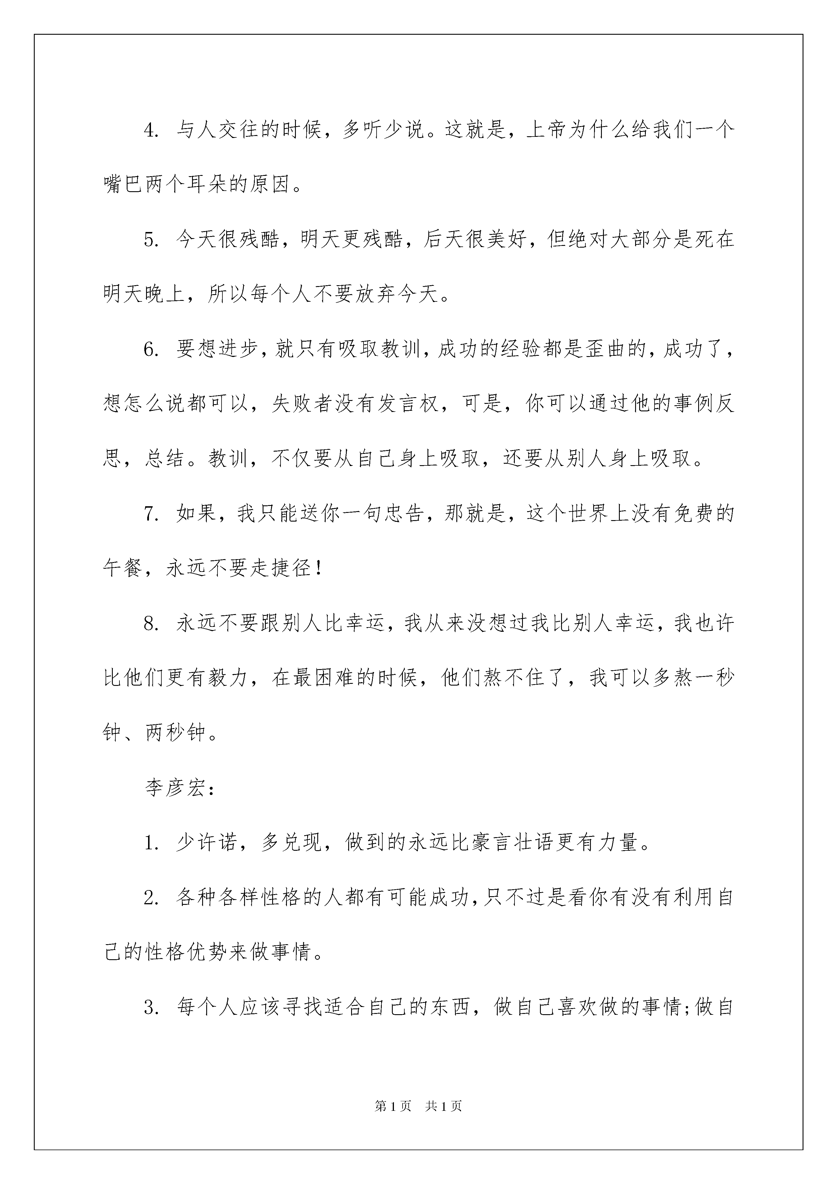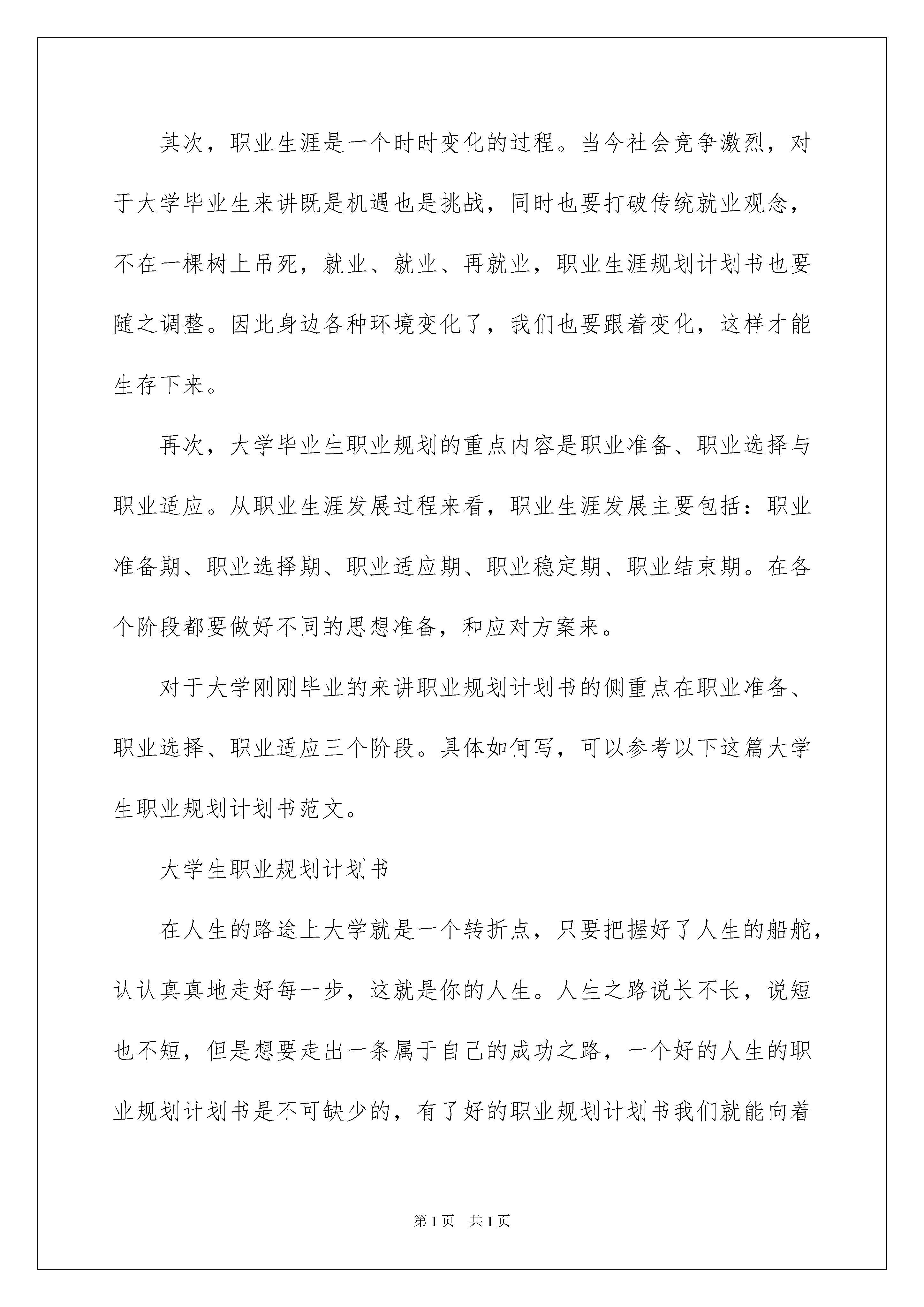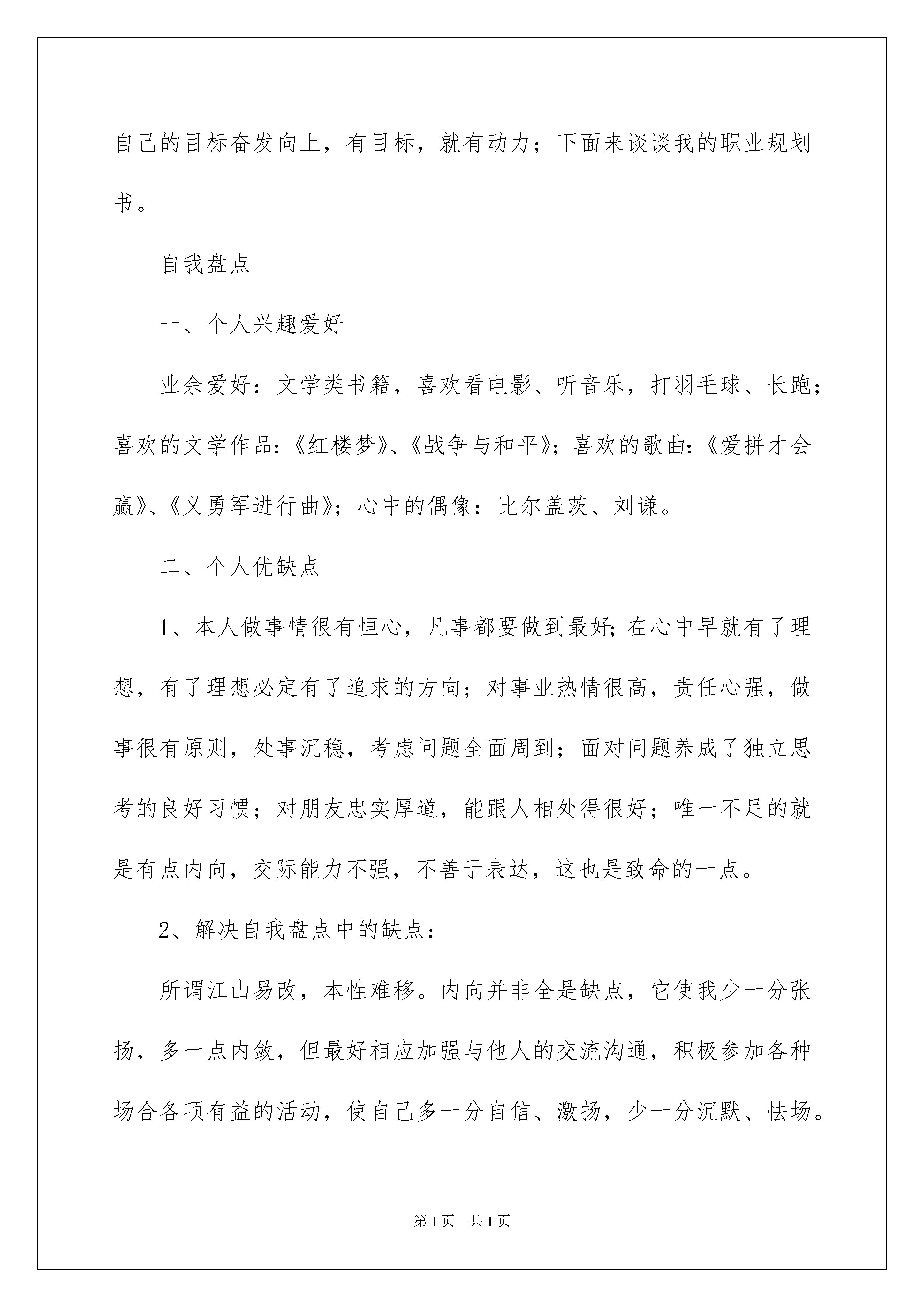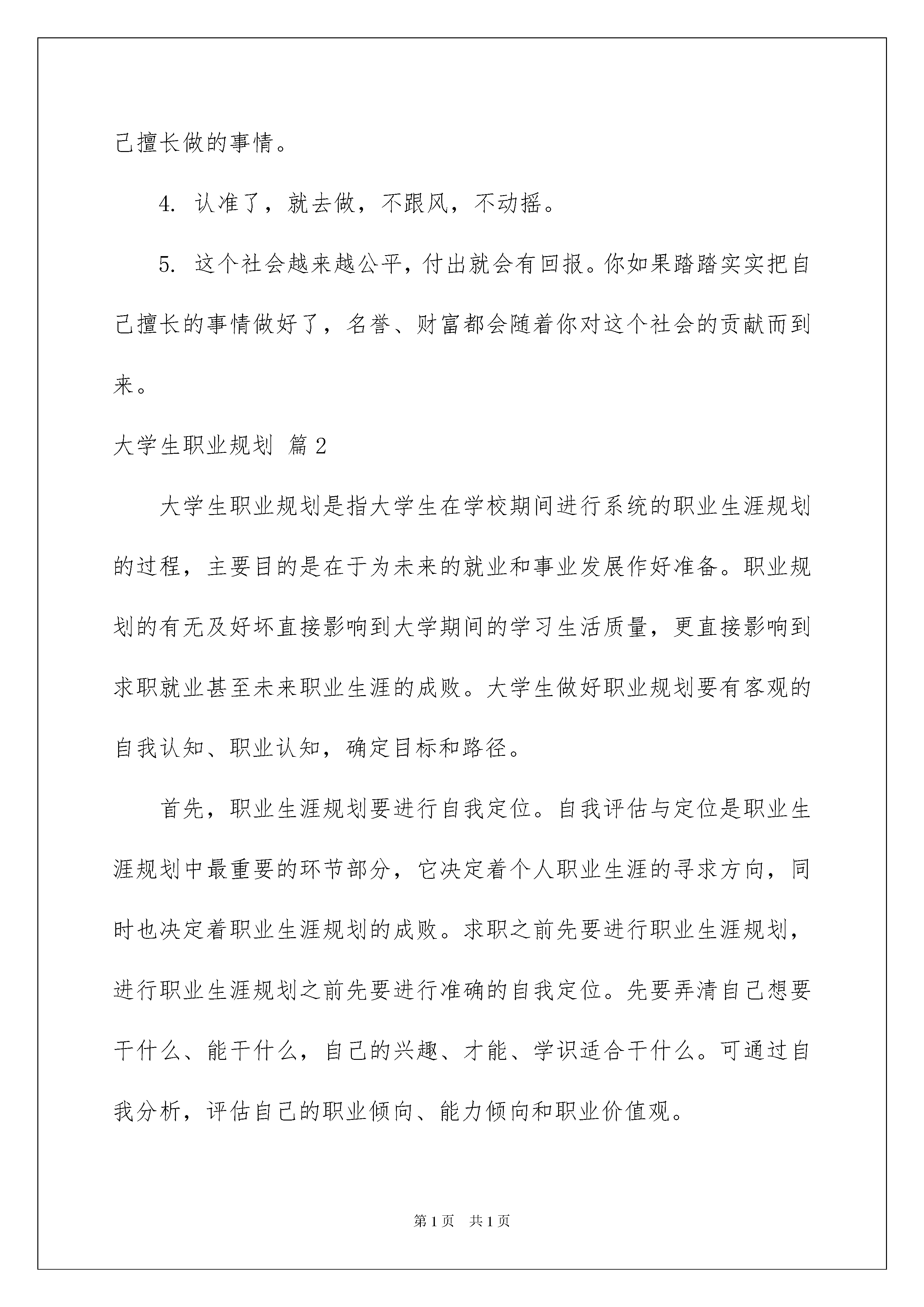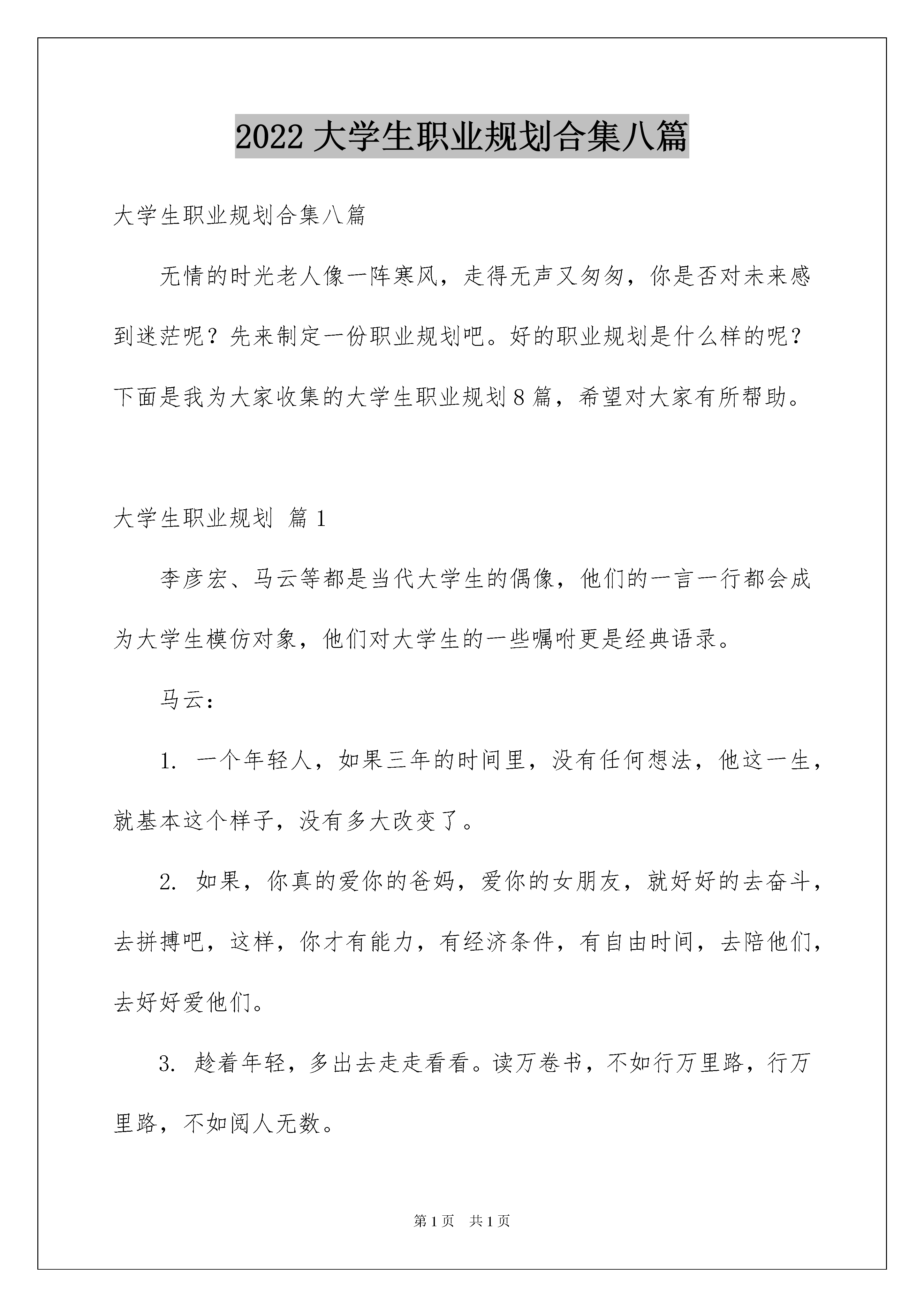2022大学生职业规划合集八篇大学生职业规划合集八篇无情的时光老人像一阵寒风,走得无声又匆匆,你是否对未来感到迷茫呢?先来制定一份职业规划吧。好的职业规划是什么样的呢?下面是我为大家收集的大学生职业规划8篇,希望对大家有所帮助。大学生职业规划篇1李彦宏、马云等都是当代大学生的偶像,他们的一言一行都会成为大学生模仿对象,他们对大学生的一些嘱咐更是经典语录。马云:1.一个年轻人,如果三年的时间里,没有任何想法,他这一生,就基本这个样子,没有多大改变了。2.如果,你真的爱你的爸妈,爱你的女朋友,就好好的去奋斗,去拼搏吧,这样,你才有能力,有经济条件,有自由时间,去陪他们,去好好爱他们。3.趁着年轻,多出去走走看看。读万卷书,不如行万里路,行万里路,不如阅人无数。4.与人交往的时候,多听少说。这就是,上帝为什么给我们一个嘴巴两个耳朵的原因。5.今天很残酷,明天更残酷,后天很美好,但绝对大部分是死在明天晚上,所以每个人不要放弃今天。6.要想进步,就只有吸取教训,成功的经验都是歪曲的,成功了,想怎么说都可以,失败者没有发言权,可是,你可以通过他的事例反思,总结。教训,不仅要从自己身上吸取,还要从别人身上吸取。7.如果,我只能送你一句忠告,那就是,这个世界上没有免费的午餐,永远不要走捷径!8.永远不要跟别人比幸运,我从来没想过我比别人幸运,我也许比他们更有毅力,在最困难的时候,他们熬不住了,我可以多熬一秒钟、两秒钟。李彦宏:1.少许诺,多兑现,做到的永远比豪言壮语更有力量。2.各种各样性格的人都有可能成功,只不过是看你有没有利用自己的性格优势来做事情。3.每个人应该寻找适合自己的东西,做自己喜欢做的事情;做自己擅长做的事情。4.认准了,就去做,不跟风,不动摇。5.这个社会越来越公平,付出就会有回报。你如果踏踏实实把自己擅长的事情做好了,名誉、财富都会随着你对这个社会的贡献而到来。大学生职业规划篇2大学生职业规划是指大学生在学校期间进行系统的职业生涯规划的过程,主要目的是在于为未来的就业和事业发展作好准备。职业规划的有无及好坏直接影响到大学期间的学习生活质量,更直接影响到求职就业甚至未来职业生涯的成败。大学生做好职业规划要有客观的自我认知、职业认知,确定目标和路径。首先,职业生涯规划要进行自我定位。自我评估与定位是职业生涯规划中最重要的环节部分,它决定着个人职业生涯的寻求方向,同时也决定着职业生涯规划的成败。求职之前先要进行职业生涯规划,进行职业生涯规划之前先要进行准确的自我定位。先要弄清自己想要干什么、能干什么,自己的兴趣、才能、学识适合干什么。可通过自我分析,评估自己的职业倾向、能力倾向和职业价值观。其次,职业生涯是一个时时变化的过程。当今社会竞争激烈,对于大学毕业生来讲既是机遇也是挑战,同时也要打破传统就业观念,不在一棵树上吊死,就业、就业、再就业,职业生涯规划计划书也要随之调整。因此身边各种环境变化了,我们也要跟着变化,这样才能生存下来。再次,大学毕业生职业规划的重点内容是职业准备、职业选择与职业适应。从职业生涯发展过程来看,职业生涯发展主要包括:职业准备期、职业选择期、职业适应期、职业稳定期、职业结束期。在各个阶段都要做好不同的思想准备,和应对方案来。对于大学刚刚毕业的来讲职业规划计划书的侧重点在职业准备、职业选择、职业适应三个阶段。具体如何写,可以参考以下这篇大学生职业规划计划书范文。大学生职业规划计划书在人生的路途上大学就是一个转折点,只要把握好了人生的船舵,认认真真地走好每一步,这就是你的人生。人生之路说长不长,说短也不短,但是想要走出一条属于自己的成功之路,一个好的人生的职业规划计划书是不可缺少的,有了好的职业规划计划书我们就能向着自己的目标奋发向上,有目标,就有动力;下面来谈谈我的职业规划书。自我盘点一、个人兴趣爱好业余爱好:文学类书籍,喜欢看电影、听音乐,打羽毛球、长跑;喜欢的文学作品:《红楼梦》、《战争与和平》;喜欢的歌曲:《爱拼才会赢》、《义勇军进行曲》;心中的偶像:比尔盖茨、刘谦。二、个人优缺点1、本人做事情很有恒心,凡事都要做到最好;在心中早就有了理想,有了理想必定有了追求的方向;对事业热情很高,责任心强,做事很有原则,处事沉稳,考虑问题全面周到;面对问题养成了独立思考的良好习惯;对朋友忠实厚道,能跟人相处得很好;唯一不足的就是有点内向,交际能力不强,不善于表达,这也是致命的一点。2、解决自我盘点中的缺点:所谓江山易改,本性难移。内向并非全是缺点,它使我少一分张扬,多一点内敛,但最好相应加强与他人的交流沟通,积极参加各种场合各项有益的活动,使自己多一分自信、