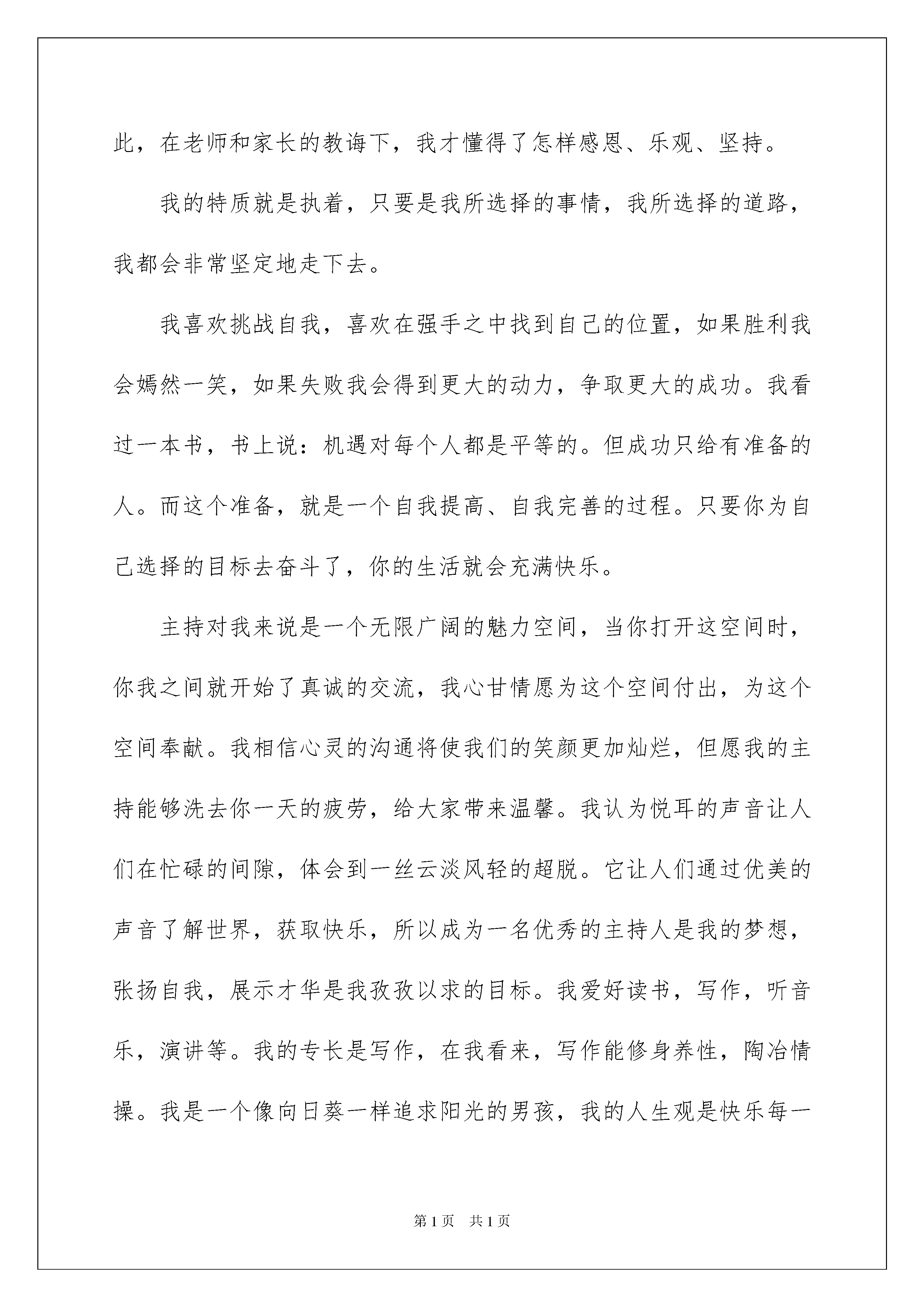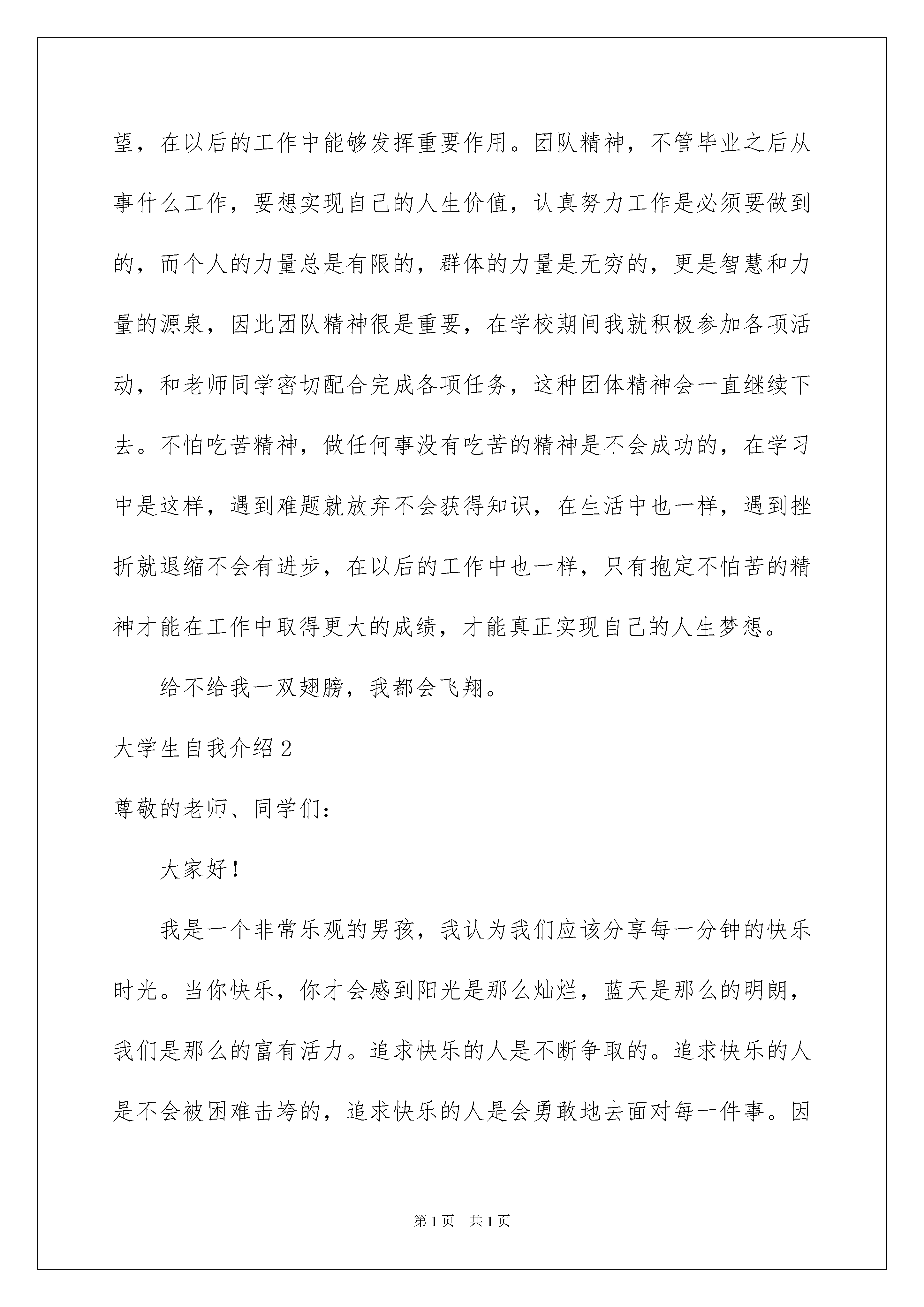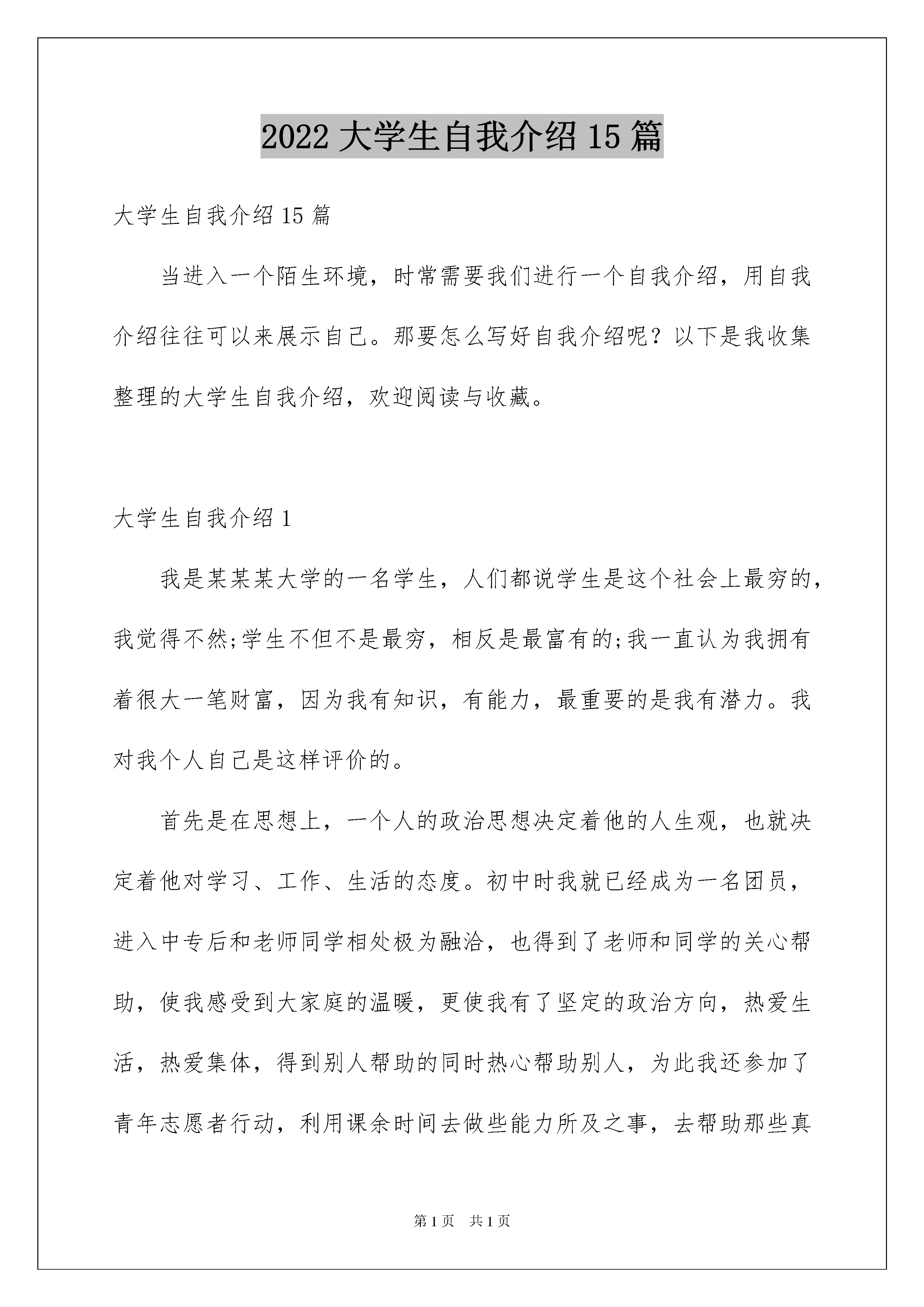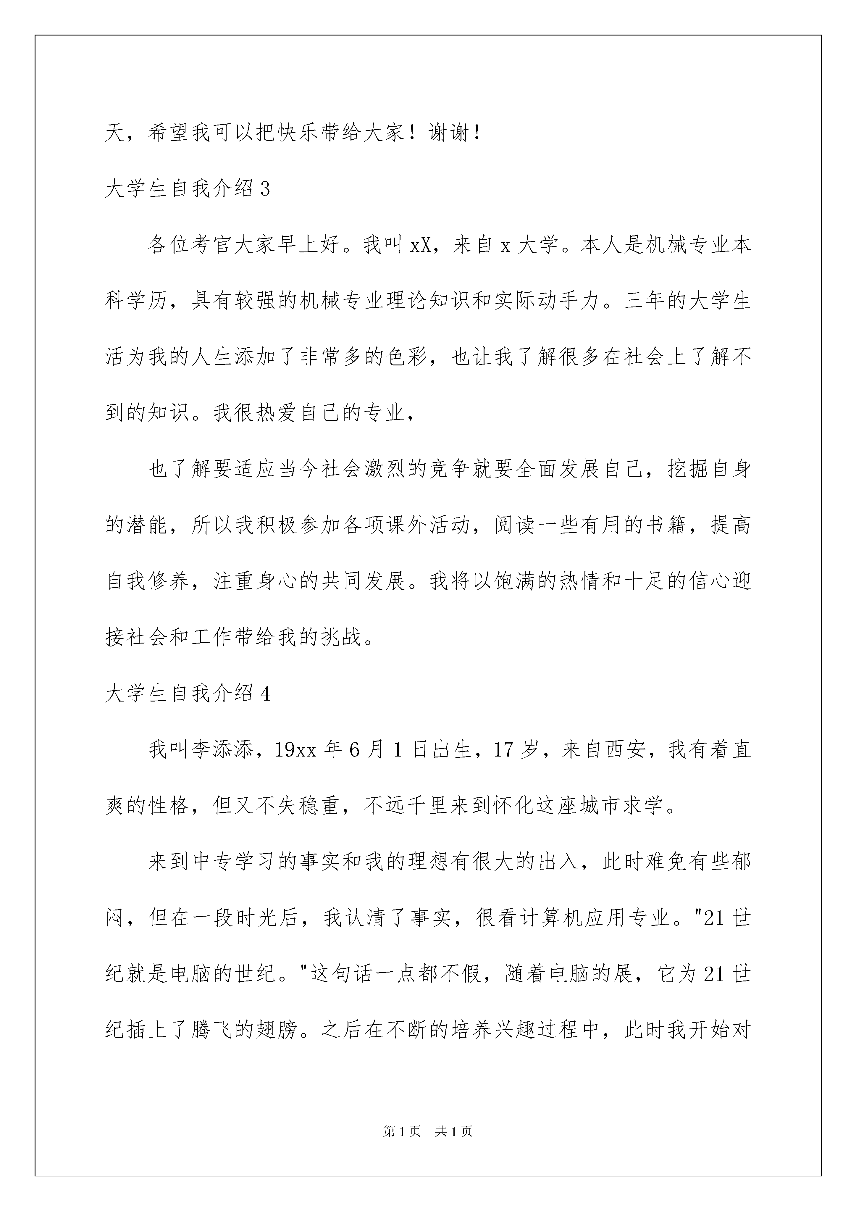 2022大学生自我介绍15篇大学生自我介绍15篇当进入一个陌生环境,时常需要我们进行一个自我介绍,用自我介绍往往可以来展示自己。那要怎么写好自我介绍呢?以下是我收集整理的大学生自我介绍,欢迎阅读与收藏。大学生自我介绍1我是某某某大学的一名学生,人们都说学生是这个社会上最穷的,我觉得不然;学生不但不是最穷,相反是最富有的;我一直认为我拥有着很大一笔财富,因为我有知识,有能力,最重要的是我有潜力。我对我个人自己是这样评价的。首先是在思想上,一个人的政治思想决定着他的人生观,也就决定着他对学习、工作、生活的态度。初中时我就已经成为一名团员,进入中专后和老师同学相处极为融洽,也得到了老师和同学的关心帮助,使我感受到大家庭的温暖,更使我有了坚定的政治方向,热爱生活,热爱集体,得到别人帮助的同时热心帮助别人,为此我还参加了青年志愿者行动,利用课余时间去做些能力所及之事,去帮助那些真正需要帮助的人。课余积极踊跃参加学校班级组织的各项活动,()能够在学习生活中能够尊敬师长,帮助老师和同学做些力所能及的事,和大家和谐相处。这些培养了我较强的集体荣誉感和团队精神,使我在学习生活中受益匪浅,不只在思想觉悟上取得了很大进步,也使我对自己、对未来充满了信心和希望。生活中我遵循简朴大方、严以律已、宽以待人的原则,不与同学比吃穿,而是比学习、比进步程度。对自己在学习生活中严格要求,遇到问题决不退缩,向老师、家长和同学虚心请教,知难而上,遇到错误不姑息迁就,分析错误原因,做到知错就改,能够遵守校纪校规,认真履行学生职责,做好每一件小事,热爱劳动,讲究卫生。我所在学校距离家乡路途遥远,我时常给家里打电话、写信,汇报学习生活情况,有什么思想问题也及时和父母沟通,使父母时刻感受到女儿的牵挂,也使我时刻感受着来自家庭的温暖,更多的是鼓励和支持。工作上。学习精神,知识型社会已不再是过去学一技而用终生的时代,必须时时处处学习,时时更新自己的知识体系,为此我经常上网查阅各方面信息,拓宽视野的同时也增加了信息量和知识量,养成独立思考、分辩事非的思维能力,越是学习,越是有信心,越是有希望,在以后的工作中能够发挥重要作用。团队精神,不管毕业之后从事什么工作,要想实现自己的人生价值,认真努力工作是必须要做到的,而个人的力量总是有限的,群体的力量是无穷的,更是智慧和力量的源泉,因此团队精神很是重要,在学校期间我就积极参加各项活动,和老师同学密切配合完成各项任务,这种团体精神会一直继续下去。不怕吃苦精神,做任何事没有吃苦的精神是不会成功的,在学习中是这样,遇到难题就放弃不会获得知识,在生活中也一样,遇到挫折就退缩不会有进步,在以后的工作中也一样,只有抱定不怕苦的精神才能在工作中取得更大的成绩,才能真正实现自己的人生梦想。给不给我一双翅膀,我都会飞翔。大学生自我介绍2尊敬的老师、同学们:大家好!我是一个非常乐观的男孩,我认为我们应该分享每一分钟的快乐时光。当你快乐,你才会感到阳光是那么灿烂,蓝天是那么的明朗,我们是那么的富有活力。追求快乐的人是不断争取的。追求快乐的人是不会被困难击垮的,追求快乐的人是会勇敢地去面对每一件事。因此,在老师和家长的教诲下,我才懂得了怎样感恩、乐观、坚持。我的特质就是执着,只要是我所选择的事情,我所选择的道路,我都会非常坚定地走下去。我喜欢挑战自我,喜欢在强手之中找到自己的位置,如果胜利我会嫣然一笑,如果失败我会得到更大的动力,争取更大的成功。我看过一本书,书上说:机遇对每个人都是平等的。但成功只给有准备的人。而这个准备,就是一个自我提高、自我完善的过程。只要你为自己选择的目标去奋斗了,你的生活就会充满快乐。主持对我来说是一个无限广阔的魅力空间,当你打开这空间时,你我之间就开始了真诚的交流,我心甘情愿为这个空间付出,为这个空间奉献。我相信心灵的沟通将使我们的笑颜更加灿烂,但愿我的主持能够洗去你一天的疲劳,给大家带来温馨。我认为悦耳的声音让人们在忙碌的间隙,体会到一丝云淡风轻的超脱。它让人们通过优美的声音了解世界,获取快乐,所以成为一名优秀的主持人是我的梦想,张扬自我,展示才华是我孜孜以求的目标。我爱好读书,写作,听音乐,演讲等。我的专长是写作,在我看来,写作能修身养性,陶冶情操。我是一个像向日葵一样追求阳光的男孩,我的人生观是快乐每一天,希望我可以把快乐带给大家!谢谢!大学生自我介绍3各位考官大家早上好。我叫xX,来自x大学。本人是机械专业本科学历,具有较强的机械专业理论知识和实际动手力。三年的大学生活为我的人生添加了非常多的色彩,也让我了解很多在社会上了解不到的知识。我很热爱自己的专业,也了解要适应当
