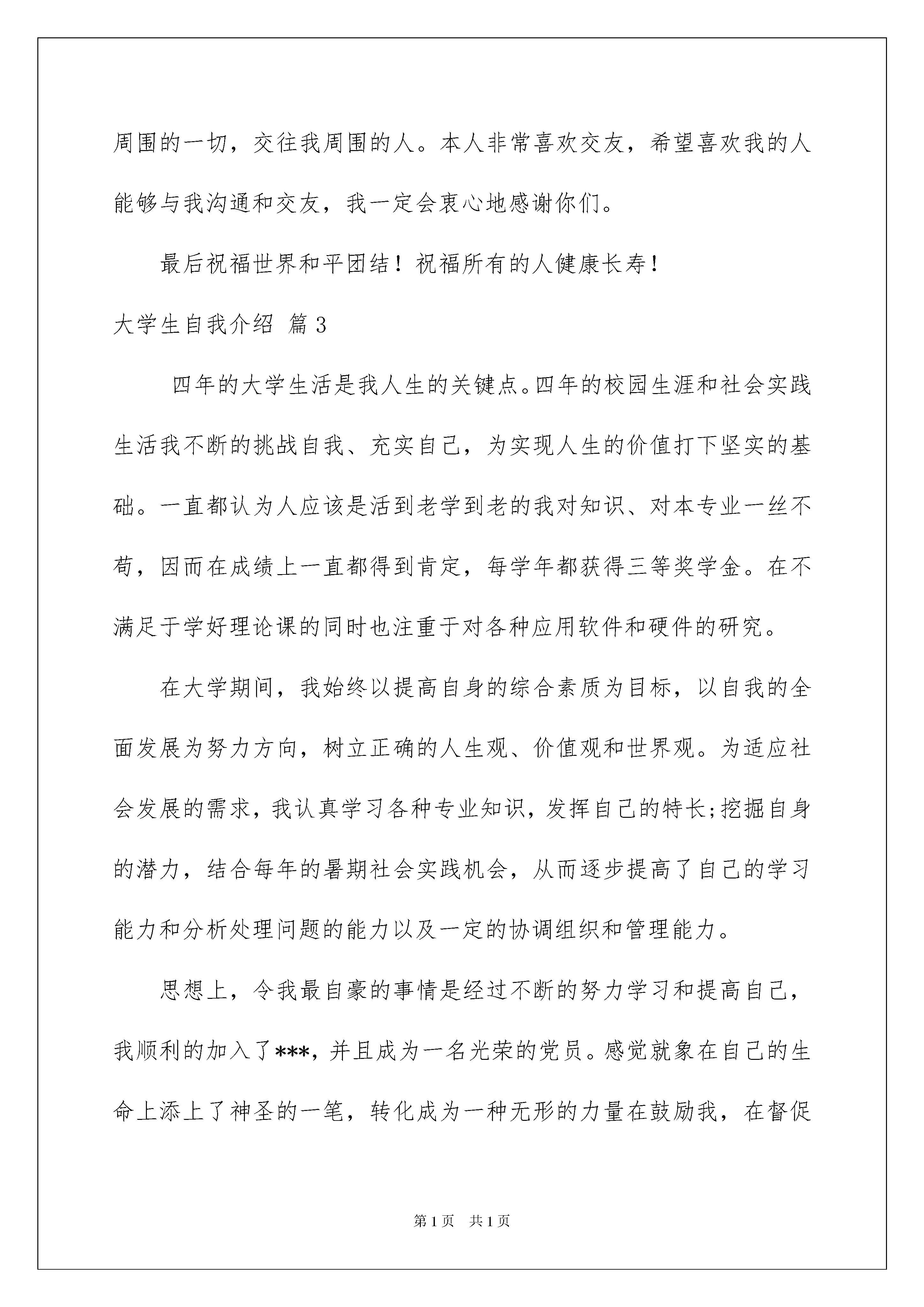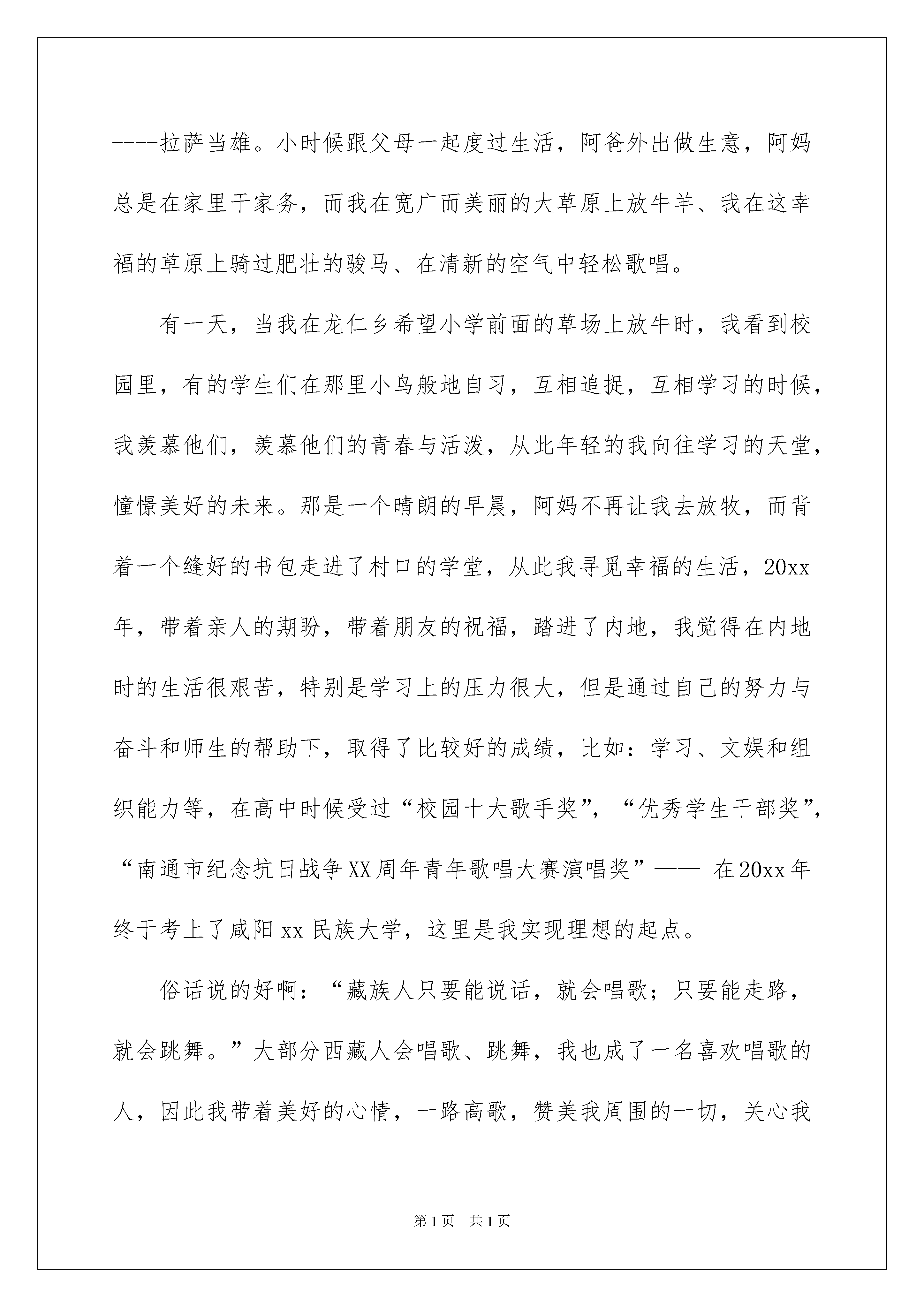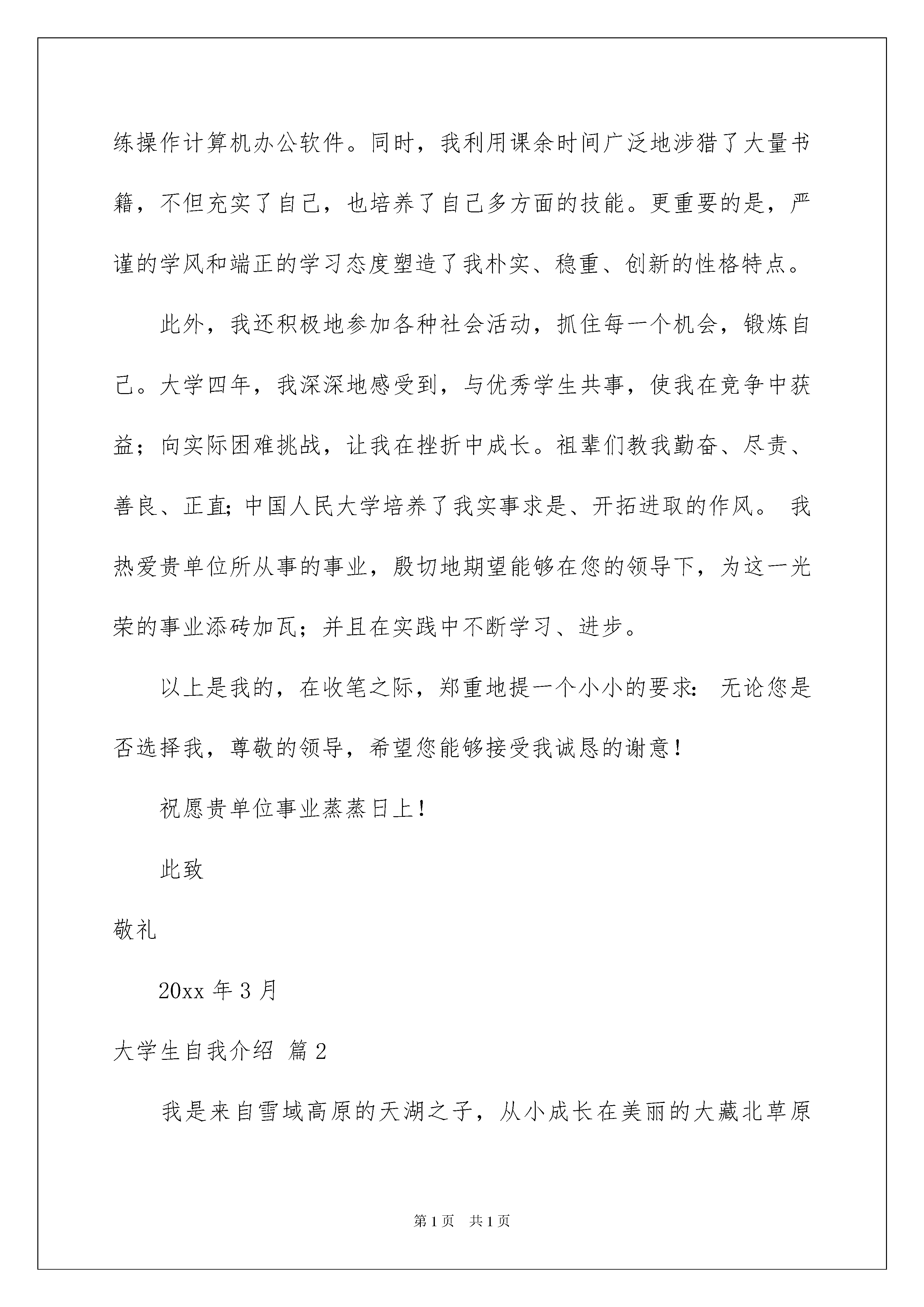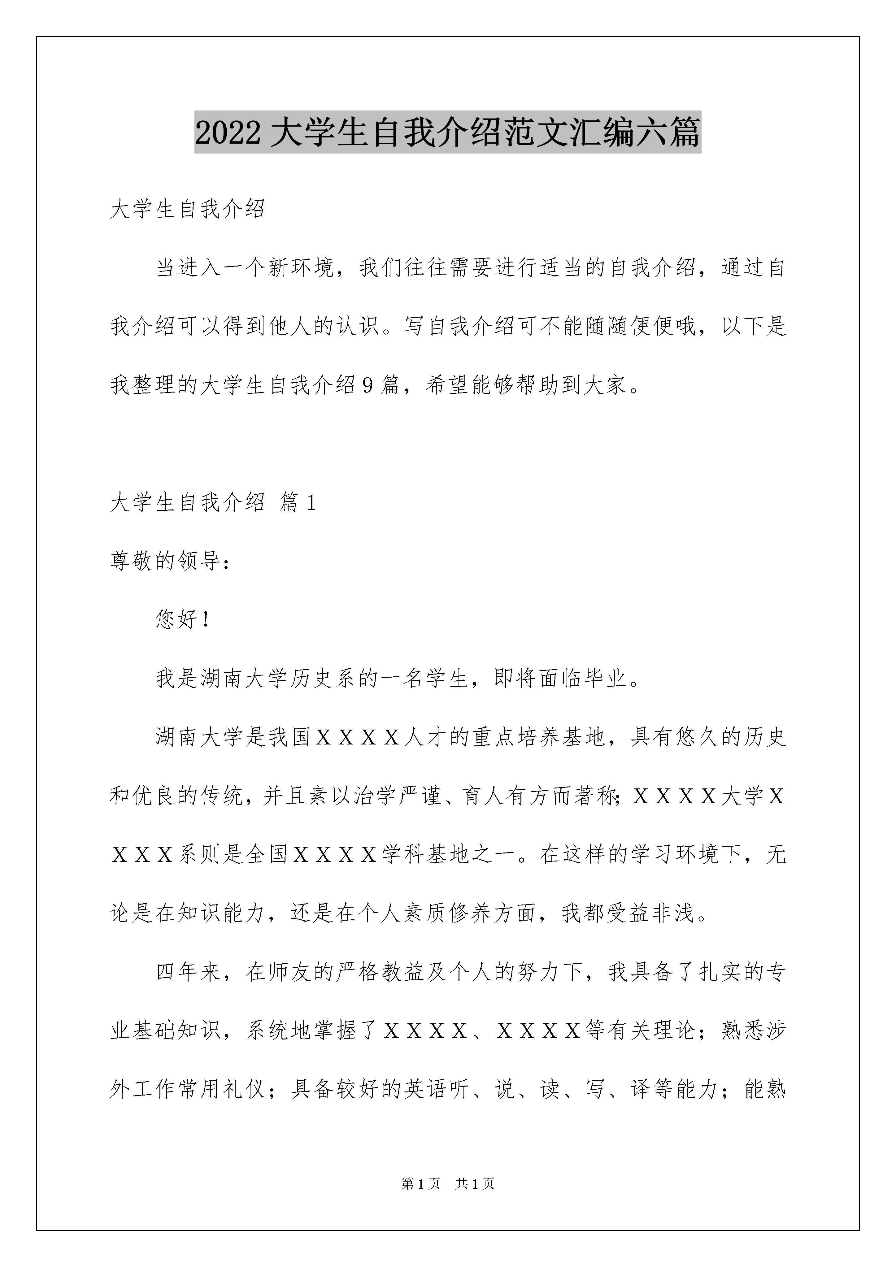 2022大学生自我介绍范文汇编六篇大学生自我介绍当进入一个新环境,我们往往需要进行适当的自我介绍,通过自我介绍可以得到他人的认识。写自我介绍可不能随随便便哦,以下是我整理的大学生自我介绍9篇,希望能够帮助到大家。大学生自我介绍篇1尊敬的领导:您好!我是湖南大学历史系的一名学生,即将面临毕业。湖南大学是我国XXXX人才的重点培养基地,具有悠久的历史和优良的传统,并且素以治学严谨、育人有方而著称;XXXX大学XXXX系则是全国XXXX学科基地之一。在这样的学习环境下,无论是在知识能力,还是在个人素质修养方面,我都受益非浅。四年来,在师友的严格教益及个人的努力下,我具备了扎实的专业基础知识,系统地掌握了XXXX、XXXX等有关理论;熟悉涉外工作常用礼仪;具备较好的英语听、说、读、写、译等能力;能熟练操作计算机办公软件。同时,我利用课余时间广泛地涉猎了大量书籍,不但充实了自己,也培养了自己多方面的技能。更重要的是,严谨的学风和端正的学习态度塑造了我朴实、稳重、创新的性格特点。此外,我还积极地参加各种社会活动,抓住每一个机会,锻炼自己。大学四年,我深深地感受到,与优秀学生共事,使我在竞争中获益;向实际困难挑战,让我在挫折中成长。祖辈们教我勤奋、尽责、善良、正直;中国人民大学培养了我实事求是、开拓进取的作风。我热爱贵单位所从事的事业,殷切地期望能够在您的领导下,为这一光荣的事业添砖加瓦;并且在实践中不断学习、进步。以上是我的,在收笔之际,郑重地提一个小小的要求:无论您是否选择我,尊敬的领导,希望您能够接受我诚恳的谢意!祝愿贵单位事业蒸蒸日上!此致敬礼20xx年3月大学生自我介绍篇2我是来自雪域高原的天湖之子,从小成长在美丽的大藏北草原----拉萨当雄。小时候跟父母一起度过生活,阿爸外出做生意,阿妈总是在家里干家务,而我在宽广而美丽的大草原上放牛羊、我在这幸福的草原上骑过肥壮的骏马、在清新的空气中轻松歌唱。有一天,当我在龙仁乡希望小学前面的草场上放牛时,我看到校园里,有的学生们在那里小鸟般地自习,互相追捉,互相学习的时候,我羡慕他们,羡慕他们的青春与活泼,从此年轻的我向往学习的天堂,憧憬美好的未来。那是一个晴朗的早晨,阿妈不再让我去放牧,而背着一个缝好的书包走进了村口的学堂,从此我寻觅幸福的生活,20xx年,带着亲人的期盼,带着朋友的祝福,踏进了内地,我觉得在内地时的生活很艰苦,特别是学习上的压力很大,但是通过自己的努力与奋斗和师生的帮助下,取得了比较好的成绩,比如:学习、文娱和组织能力等,在高中时候受过“校园十大歌手奖”,“优秀学生干部奖”,“南通市纪念抗日战争XX周年青年歌唱大赛演唱奖”——在20xx年终于考上了咸阳xx民族大学,这里是我实现理想的起点。俗话说的好啊:“藏族人只要能说话,就会唱歌;只要能走路,就会跳舞。”大部分西藏人会唱歌、跳舞,我也成了一名喜欢唱歌的人,因此我带着美好的心情,一路高歌,赞美我周围的一切,关心我周围的一切,交往我周围的人。本人非常喜欢交友,希望喜欢我的人能够与我沟通和交友,我一定会衷心地感谢你们。最后祝福世界和平团结!祝福所有的人健康长寿!大学生自我介绍篇3四年的大学生活是我人生的关键点。四年的校园生涯和社会实践生活我不断的挑战自我、充实自己,为实现人生的价值打下坚实的基础。一直都认为人应该是活到老学到老的我对知识、对本专业一丝不苟,因而在成绩上一直都得到肯定,每学年都获得三等奖学金。在不满足于学好理论课的同时也注重于对各种应用软件和硬件的研究。在大学期间,我始终以提高自身的综合素质为目标,以自我的全面发展为努力方向,树立正确的人生观、价值观和世界观。为适应社会发展的需求,我认真学习各种专业知识,发挥自己的特长;挖掘自身的潜力,结合每年的暑期社会实践机会,从而逐步提高了自己的学习能力和分析处理问题的能力以及一定的协调组织和管理能力。思想上,令我最自豪的事情是经过不断的努力学习和提高自己,我顺利的加入了***,并且成为一名光荣的党员。感觉就象在自己的生命上添上了神圣的一笔,转化成为一种无形的力量在鼓励我,在督促我,在时时刻刻的检查我,让我在思想行为方面能够作风优良、待人诚恳,能较好处理人际关际,处事冷静稳健,能合理地统筹安排生活中的事务。为社会为学校为同学为身边的人做事不再是觉得是一种累赘,而是很乐意的去做并且能够得到满足和快乐,不会去想做好自己的事情,别人的事情少管。并且一直在追求人格的升华,注重自己的品行。我崇拜有巨大人格魅力的人,并一直希望自己也能做到。在大学生活中,我坚持着自我反省且努力的完善自己的人格。现在我理解道理,乐于助人不仅能铸造高尚的