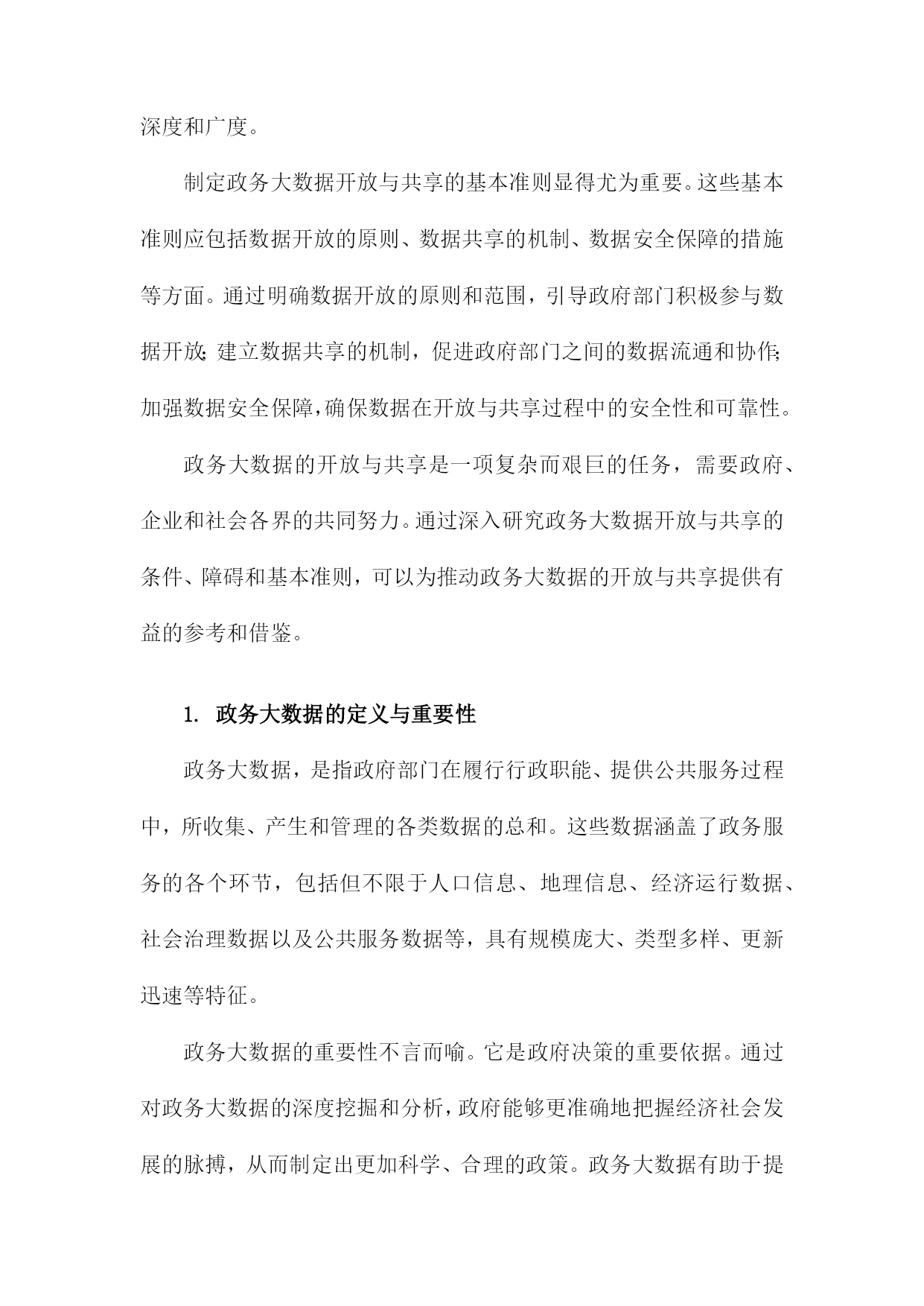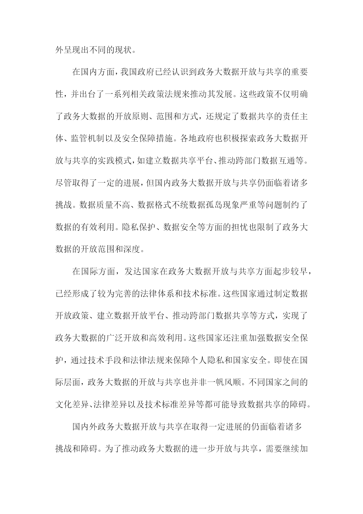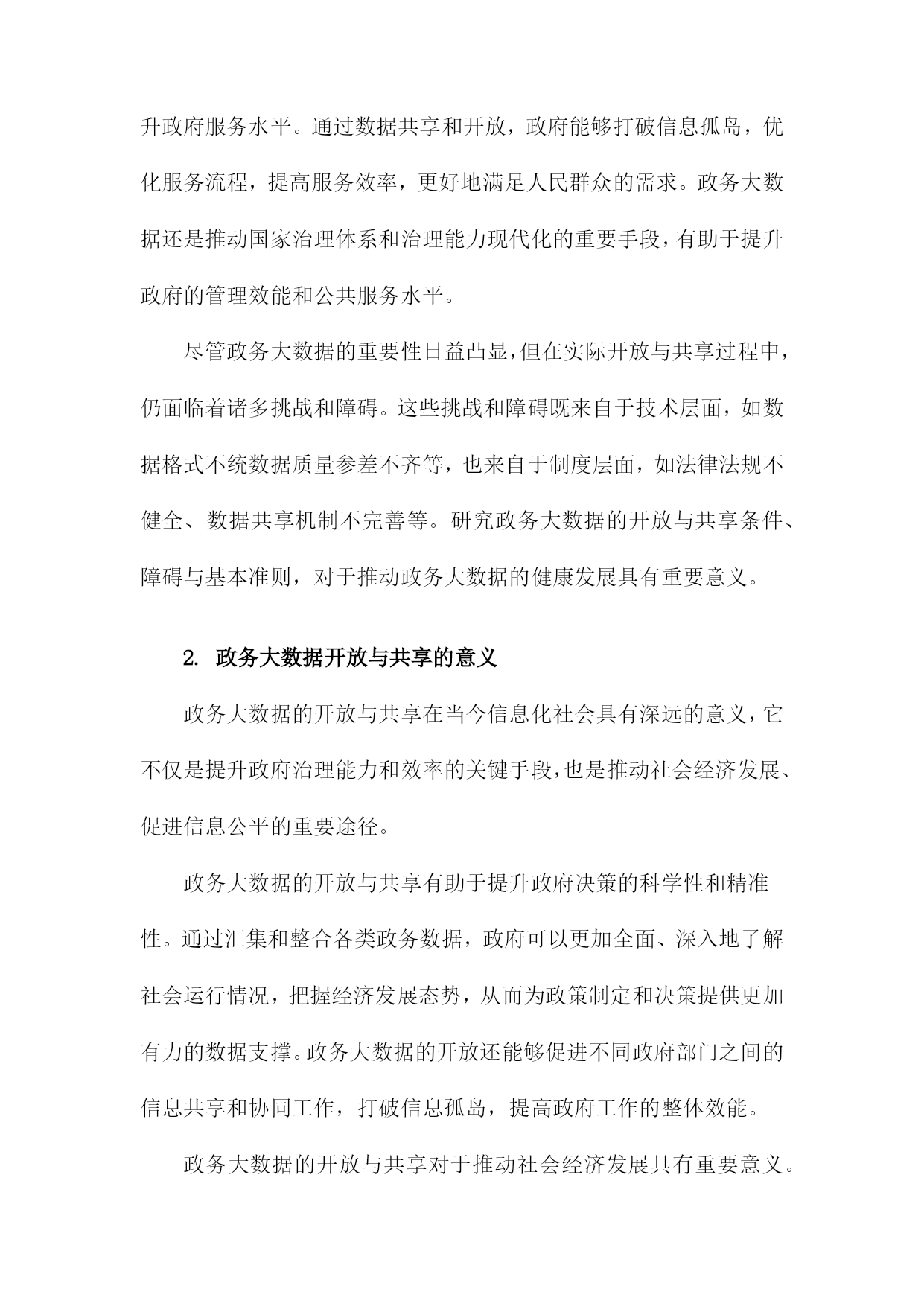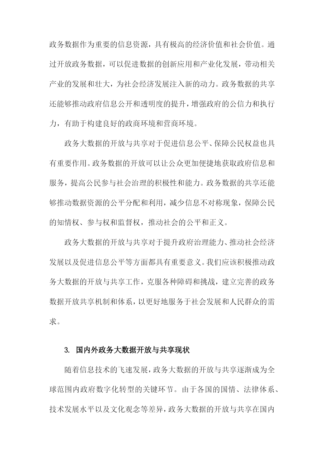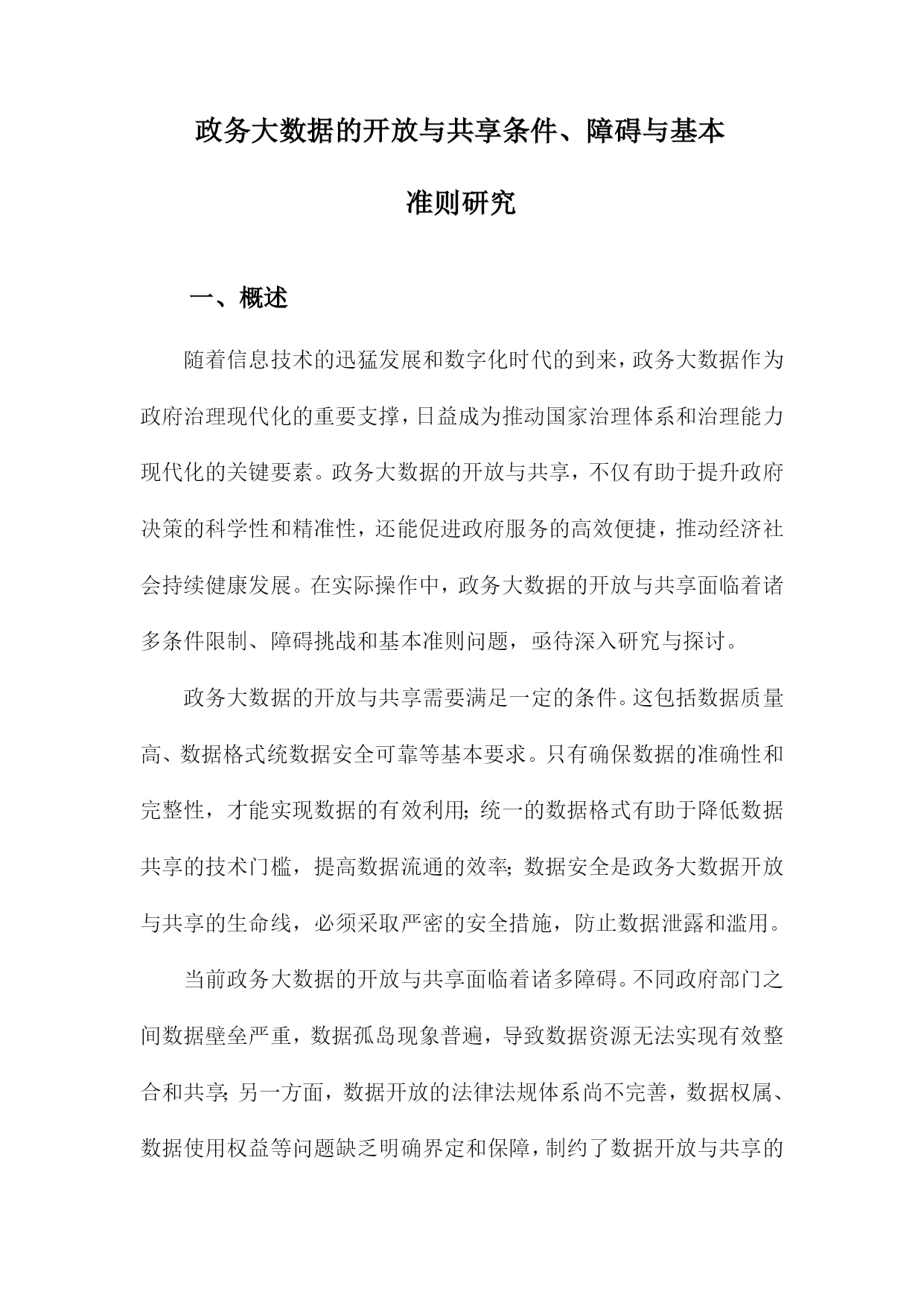 政务大数据的开放与共享条件、障碍与基本准则研究一、概述随着信息技术的迅猛发展和数字化时代的到来,政务大数据作为政府治理现代化的重要支撑,日益成为推动国家治理体系和治理能力现代化的关键要素。政务大数据的开放与共享,不仅有助于提升政府决策的科学性和精准性,还能促进政府服务的高效便捷,推动经济社会持续健康发展。在实际操作中,政务大数据的开放与共享面临着诸多条件限制、障碍挑战和基本准则问题,亟待深入研究与探讨。政务大数据的开放与共享需要满足一定的条件。这包括数据质量高、数据格式统数据安全可靠等基本要求。只有确保数据的准确性和完整性,才能实现数据的有效利用;统一的数据格式有助于降低数据共享的技术门槛,提高数据流通的效率;数据安全是政务大数据开放与共享的生命线,必须采取严密的安全措施,防止数据泄露和滥用。当前政务大数据的开放与共享面临着诸多障碍。不同政府部门之间数据壁垒严重,数据孤岛现象普遍,导致数据资源无法实现有效整合和共享;另一方面,数据开放的法律法规体系尚不完善,数据权属、数据使用权益等问题缺乏明确界定和保障,制约了数据开放与共享的深度和广度。制定政务大数据开放与共享的基本准则显得尤为重要。这些基本准则应包括数据开放的原则、数据共享的机制、数据安全保障的措施等方面。通过明确数据开放的原则和范围,引导政府部门积极参与数据开放;建立数据共享的机制,促进政府部门之间的数据流通和协作;加强数据安全保障,确保数据在开放与共享过程中的安全性和可靠性。政务大数据的开放与共享是一项复杂而艰巨的任务,需要政府、企业和社会各界的共同努力。通过深入研究政务大数据开放与共享的条件、障碍和基本准则,可以为推动政务大数据的开放与共享提供有益的参考和借鉴。1.政务大数据的定义与重要性政务大数据,是指政府部门在履行行政职能、提供公共服务过程中,所收集、产生和管理的各类数据的总和。这些数据涵盖了政务服务的各个环节,包括但不限于人口信息、地理信息、经济运行数据、社会治理数据以及公共服务数据等,具有规模庞大、类型多样、更新迅速等特征。政务大数据的重要性不言而喻。它是政府决策的重要依据。通过对政务大数据的深度挖掘和分析,政府能够更准确地把握经济社会发展的脉搏,从而制定出更加科学、合理的政策。政务大数据有助于提升政府服务水平。通过数据共享和开放,政府能够打破信息孤岛,优化服务流程,提高服务效率,更好地满足人民群众的需求。政务大数据还是推动国家治理体系和治理能力现代化的重要手段,有助于提升政府的管理效能和公共服务水平。尽管政务大数据的重要性日益凸显,但在实际开放与共享过程中,仍面临着诸多挑战和障碍。这些挑战和障碍既来自于技术层面,如数据格式不统数据质量参差不齐等,也来自于制度层面,如法律法规不健全、数据共享机制不完善等。研究政务大数据的开放与共享条件、障碍与基本准则,对于推动政务大数据的健康发展具有重要意义。2.政务大数据开放与共享的意义政务大数据的开放与共享在当今信息化社会具有深远的意义,它不仅是提升政府治理能力和效率的关键手段,也是推动社会经济发展、促进信息公平的重要途径。政务大数据的开放与共享有助于提升政府决策的科学性和精准性。通过汇集和整合各类政务数据,政府可以更加全面、深入地了解社会运行情况,把握经济发展态势,从而为政策制定和决策提供更加有力的数据支撑。政务大数据的开放还能够促进不同政府部门之间的信息共享和协同工作,打破信息孤岛,提高政府工作的整体效能。政务大数据的开放与共享对于推动社会经济发展具有重要意义。政务数据作为重要的信息资源,具有极高的经济价值和社会价值。通过开放政务数据,可以促进数据的创新应用和产业化发展,带动相关产业的发展和壮大,为社会经济发展注入新的动力。政务数据的共享还能够推动政府信息公开和透明度的提升,增强政府的公信力和执行力,有助于构建良好的政商环境和营商环境。政务大数据的开放与共享对于促进信息公平、保障公民权益也具有重要作用。政务数据的开放可以让公众更加便捷地获取政府信息和服务,提高公民参与社会治理的积极性和能力。政务数据的共享还能够推动数据资源的公平分配和利用,减少信息不对称现象,保障公民的知情权、参与权和监督权,推动社会的公平和正义。政务大数据的开放与共享对于提升政府治理能力、推动社会经济发展以及促进信息公平等方面都具有重要意义。我们应该积极推动政务大数据的开放与共享工作,克服各种障碍和挑战,建立完善的政务数据开放共享机制和体系,以更好地服务于社会发展和人民群众的需求。3.国内外政务大数据开放与共享现状随着信息技术的飞速发展,政务大数据的开放与共享逐渐成为全球范围内政府数字化转型的关键环节。由于各国的国情、法律体系、技术发展水平以及文化观念等差异,政务大数据的开放与共享在国内外呈现出不同的现状。在国内方面,我国政府已经认识到政务大数据开放