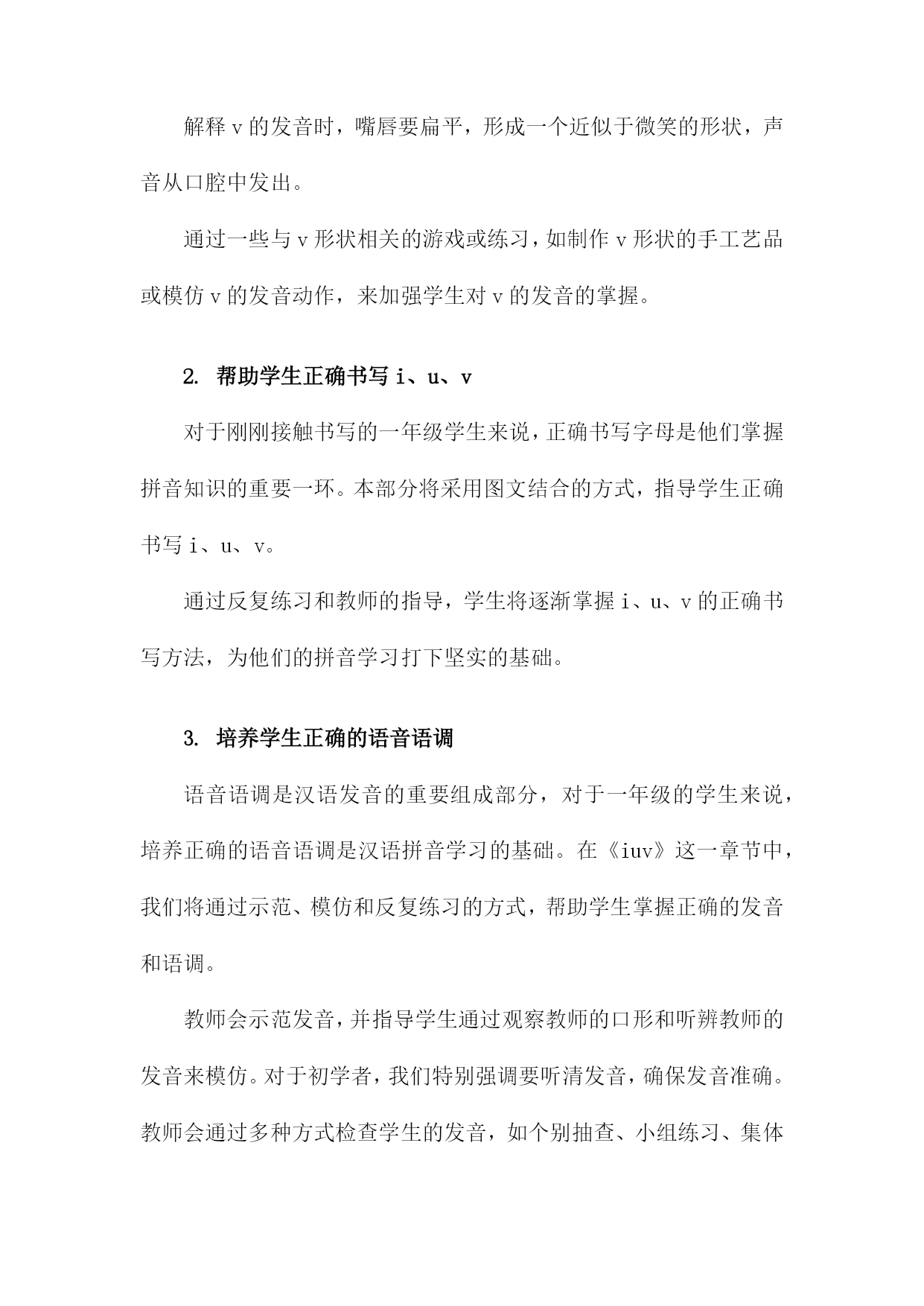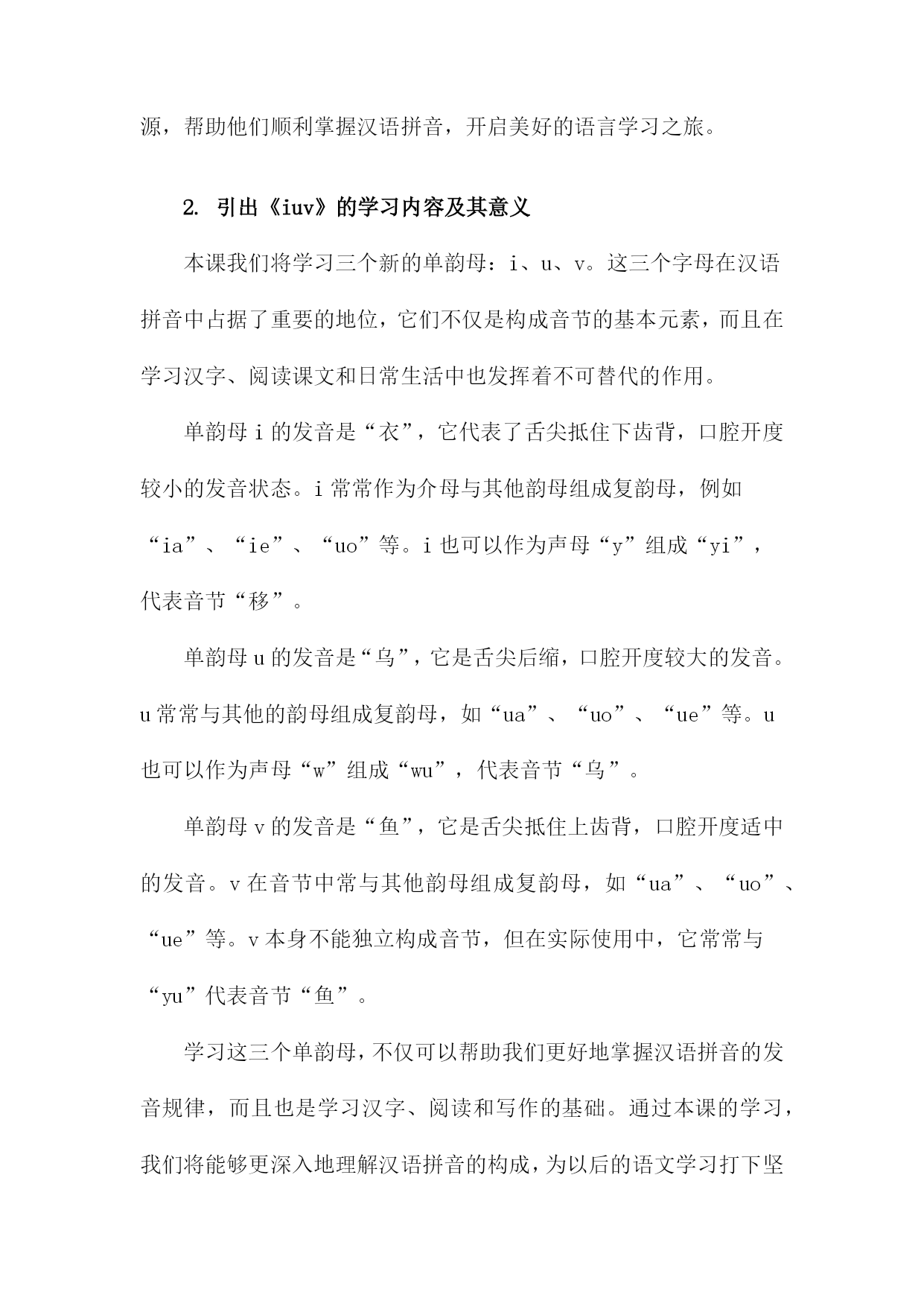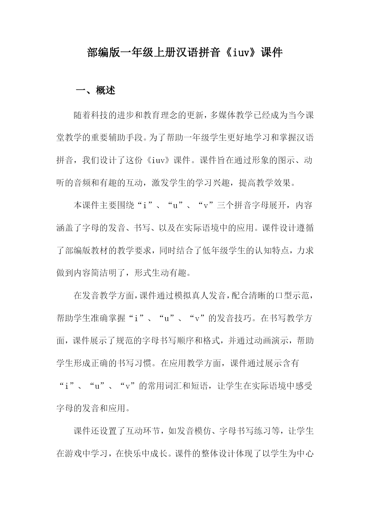部编版一年级上册汉语拼音《iuv》课件一、概述随着科技的进步和教育理念的更新,多媒体教学已经成为当今课堂教学的重要辅助手段。为了帮助一年级学生更好地学习和掌握汉语拼音,我们设计了这份《iuv》课件。课件旨在通过形象的图示、动听的音频和有趣的互动,激发学生的学习兴趣,提高教学效果。本课件主要围绕“i”、“u”、“v”三个拼音字母展开,内容涵盖了字母的发音、书写、以及在实际语境中的应用。课件设计遵循了部编版教材的教学要求,同时结合了低年级学生的认知特点,力求做到内容简洁明了,形式生动有趣。在发音教学方面,课件通过模拟真人发音,配合清晰的口型示范,帮助学生准确掌握“i”、“u”、“v”的发音技巧。在书写教学方面,课件展示了规范的字母书写顺序和格式,并通过动画演示,帮助学生形成正确的书写习惯。在应用教学方面,课件通过展示含有“i”、“u”、“v”的常用词汇和短语,让学生在实际语境中感受字母的发音和应用。课件还设置了互动环节,如发音模仿、字母书写练习等,让学生在游戏中学习,在快乐中成长。课件的整体设计体现了以学生为中心的教学理念,力求让学生在轻松愉快的氛围中,自然而然地掌握汉语拼音知识。1.介绍《部编版一年级上册汉语拼音》教材的重要性《部编版一年级上册汉语拼音》作为孩子们接触的第一本正式的汉语教材,具有非常重要的地位。这一阶段的教材不仅仅是知识的载体,更是孩子们探索、学习和掌握汉语拼音,为后续的语文学习打下坚实基础的关键。汉语拼音作为汉字的音标,对于汉字的发音和记忆具有不可替代的作用。学好汉语拼音,能够帮助孩子们更好地掌握汉字的读音,提升阅读能力和口语表达能力。对于一年级的学生来说,学习汉语拼音不仅是学习汉字的前提,更是培养语言感知能力、提高语言素养的重要途径。《部编版一年级上册汉语拼音》教材还注重培养孩子们的学习兴趣和自主学习能力。通过丰富多样的教学内容和形式,激发孩子们的学习热情,让他们在轻松愉快的氛围中掌握汉语拼音,为未来的语文学习奠定坚实的基础。《部编版一年级上册汉语拼音》教材的重要性不言而喻。它是孩子们学习汉语的起点,也是他们未来语言发展的基石。作为教师和家长,我们应该高度重视这一阶段的教学,为孩子们提供优质的教育资源,帮助他们顺利掌握汉语拼音,开启美好的语言学习之旅。2.引出《iuv》的学习内容及其意义本课我们将学习三个新的单韵母:i、u、v。这三个字母在汉语拼音中占据了重要的地位,它们不仅是构成音节的基本元素,而且在学习汉字、阅读课文和日常生活中也发挥着不可替代的作用。单韵母i的发音是“衣”,它代表了舌尖抵住下齿背,口腔开度较小的发音状态。i常常作为介母与其他韵母组成复韵母,例如“ia”、“ie”、“uo”等。i也可以作为声母“y”组成“yi”,代表音节“移”。单韵母u的发音是“乌”,它是舌尖后缩,口腔开度较大的发音。u常常与其他的韵母组成复韵母,如“ua”、“uo”、“ue”等。u也可以作为声母“w”组成“wu”,代表音节“乌”。单韵母v的发音是“鱼”,它是舌尖抵住上齿背,口腔开度适中的发音。v在音节中常与其他韵母组成复韵母,如“ua”、“uo”、“ue”等。v本身不能独立构成音节,但在实际使用中,它常常与“yu”代表音节“鱼”。学习这三个单韵母,不仅可以帮助我们更好地掌握汉语拼音的发音规律,而且也是学习汉字、阅读和写作的基础。通过本课的学习,我们将能够更深入地理解汉语拼音的构成,为以后的语文学习打下坚实的基础。二、教学目标知识与技能:学生能够准确发出声母“i、u、v”并能准确拼写;了解这三个声母在汉语拼音中的基础地位和作用。过程与方法:通过观察、模仿、对比等方式,让学生在游戏中学会正确的发音,培养学生的观察、比较、记忆等能力。情感态度与价值观:培养学生对汉语拼音的兴趣,引导学生主动探究,培养他们的探究精神和创新意识。文化意识:介绍汉语拼音的起源和发展,让学生了解汉语拼音在汉语学习中的重要性,同时培养学生对祖国语言文字的热爱。本节课的目标是让学生掌握声母“i、u、v”能够正确书写,并能在实际生活中运用。通过本课的学习,让学生初步了解汉语拼音的构成,为今后的汉语学习打下坚实的基础。1.使学生掌握声母i、u、v的发音通过一些练习和互动,如口腔体操或模仿发音的游戏,加强学生对i的发音的掌握。通过一些有趣的练习,如吹泡泡或模仿动物叫声,来帮助学生更好地掌握u的发音。解释v的发音时,嘴唇要扁平,形成一个近似于微笑的形状,声音从口腔中发出。通过一些与v形状相关的游戏或练习,如制作v形状的手工艺品或模仿v的发音动作,来加强学生对v的发音的掌握。2.帮助学生正确书写i、u、v对于刚刚接触书写的一年级学生来说,正确书写字母是他们掌握拼音知识的重要一环。本部分将采用图文结合的方式,指导学生正确书写i、u、v。通过反复练习和教师的指导,学生将