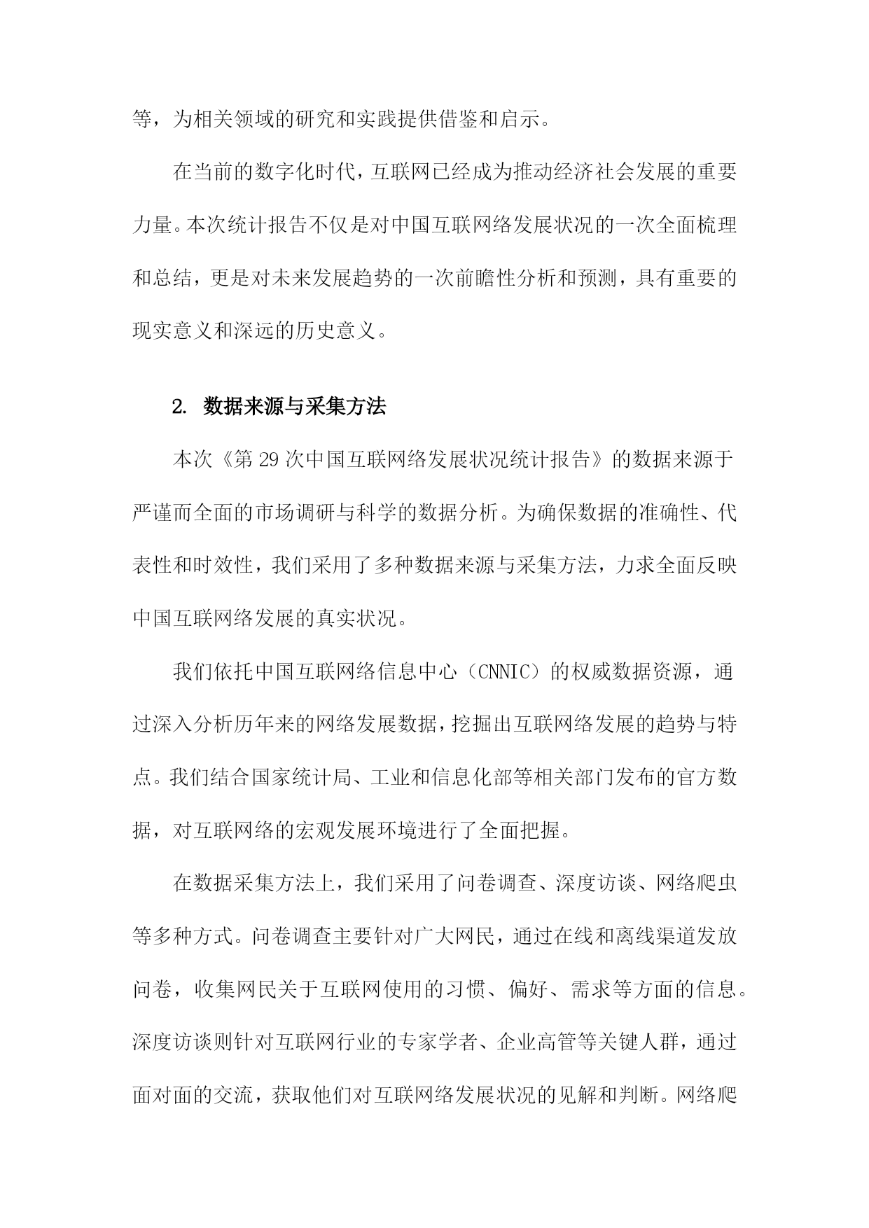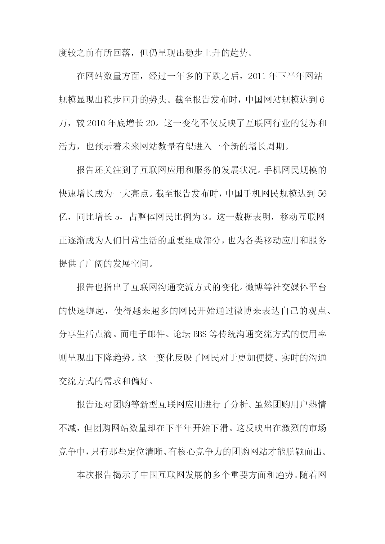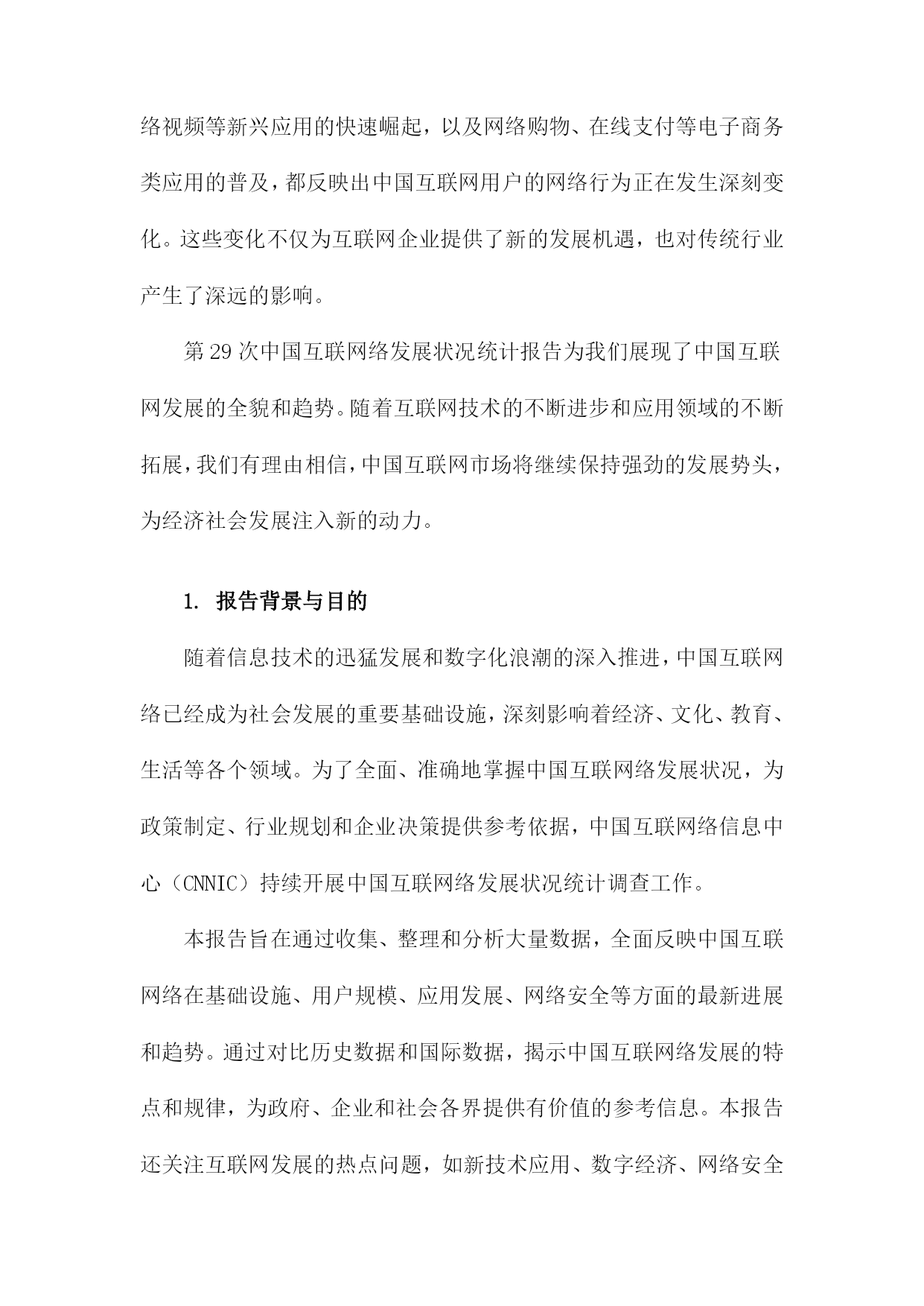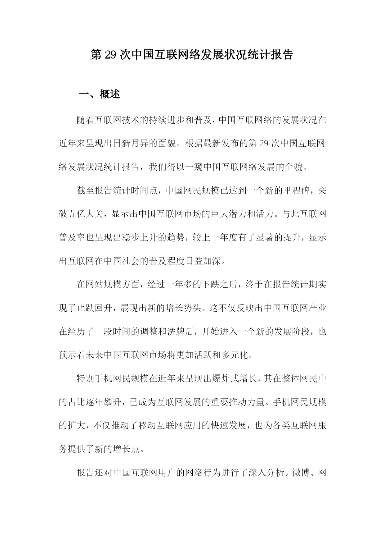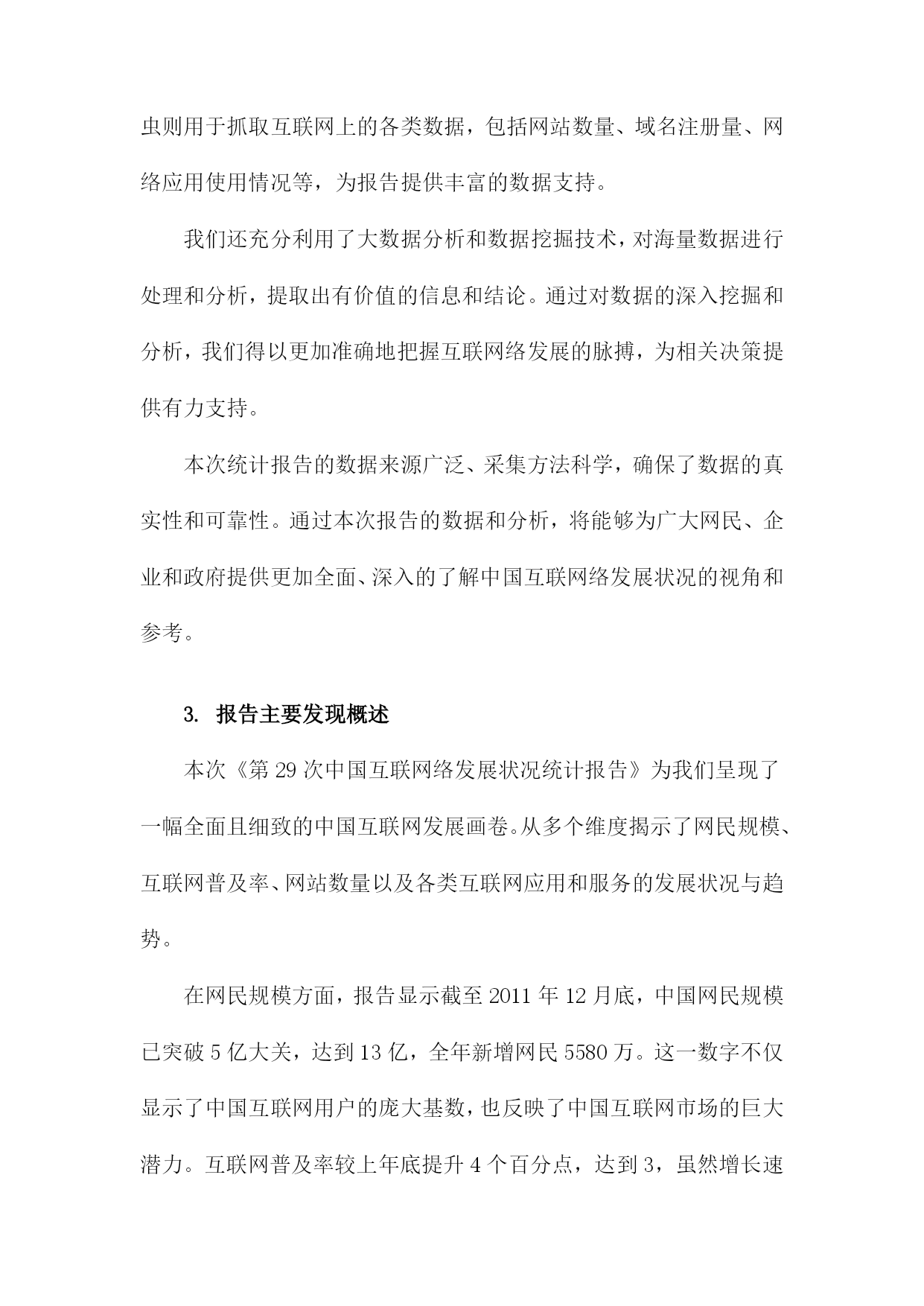 第29次中国互联网络发展状况统计报告一、概述随着互联网技术的持续进步和普及,中国互联网络的发展状况在近年来呈现出日新月异的面貌。根据最新发布的第29次中国互联网络发展状况统计报告,我们得以一窥中国互联网络发展的全貌。截至报告统计时间点,中国网民规模已达到一个新的里程碑,突破五亿大关,显示出中国互联网市场的巨大潜力和活力。与此互联网普及率也呈现出稳步上升的趋势,较上一年度有了显著的提升,显示出互联网在中国社会的普及程度日益加深。在网站规模方面,经过一年多的下跌之后,终于在报告统计期实现了止跌回升,展现出新的增长势头。这不仅反映出中国互联网产业在经历了一段时间的调整和洗牌后,开始进入一个新的发展阶段,也预示着未来中国互联网市场将更加活跃和多元化。特别手机网民规模在近年来呈现出爆炸式增长,其在整体网民中的占比逐年攀升,已成为互联网发展的重要推动力量。手机网民规模的扩大,不仅推动了移动互联网应用的快速发展,也为各类互联网服务提供了新的增长点。报告还对中国互联网用户的网络行为进行了深入分析。微博、网络视频等新兴应用的快速崛起,以及网络购物、在线支付等电子商务类应用的普及,都反映出中国互联网用户的网络行为正在发生深刻变化。这些变化不仅为互联网企业提供了新的发展机遇,也对传统行业产生了深远的影响。第29次中国互联网络发展状况统计报告为我们展现了中国互联网发展的全貌和趋势。随着互联网技术的不断进步和应用领域的不断拓展,我们有理由相信,中国互联网市场将继续保持强劲的发展势头,为经济社会发展注入新的动力。1.报告背景与目的随着信息技术的迅猛发展和数字化浪潮的深入推进,中国互联网络已经成为社会发展的重要基础设施,深刻影响着经济、文化、教育、生活等各个领域。为了全面、准确地掌握中国互联网络发展状况,为政策制定、行业规划和企业决策提供参考依据,中国互联网络信息中心(CNNIC)持续开展中国互联网络发展状况统计调查工作。本报告旨在通过收集、整理和分析大量数据,全面反映中国互联网络在基础设施、用户规模、应用发展、网络安全等方面的最新进展和趋势。通过对比历史数据和国际数据,揭示中国互联网络发展的特点和规律,为政府、企业和社会各界提供有价值的参考信息。本报告还关注互联网发展的热点问题,如新技术应用、数字经济、网络安全等,为相关领域的研究和实践提供借鉴和启示。在当前的数字化时代,互联网已经成为推动经济社会发展的重要力量。本次统计报告不仅是对中国互联网络发展状况的一次全面梳理和总结,更是对未来发展趋势的一次前瞻性分析和预测,具有重要的现实意义和深远的历史意义。2.数据来源与采集方法本次《第29次中国互联网络发展状况统计报告》的数据来源于严谨而全面的市场调研与科学的数据分析。为确保数据的准确性、代表性和时效性,我们采用了多种数据来源与采集方法,力求全面反映中国互联网络发展的真实状况。我们依托中国互联网络信息中心(CNNIC)的权威数据资源,通过深入分析历年来的网络发展数据,挖掘出互联网络发展的趋势与特点。我们结合国家统计局、工业和信息化部等相关部门发布的官方数据,对互联网络的宏观发展环境进行了全面把握。在数据采集方法上,我们采用了问卷调查、深度访谈、网络爬虫等多种方式。问卷调查主要针对广大网民,通过在线和离线渠道发放问卷,收集网民关于互联网使用的习惯、偏好、需求等方面的信息。深度访谈则针对互联网行业的专家学者、企业高管等关键人群,通过面对面的交流,获取他们对互联网络发展状况的见解和判断。网络爬虫则用于抓取互联网上的各类数据,包括网站数量、域名注册量、网络应用使用情况等,为报告提供丰富的数据支持。我们还充分利用了大数据分析和数据挖掘技术,对海量数据进行处理和分析,提取出有价值的信息和结论。通过对数据的深入挖掘和分析,我们得以更加准确地把握互联网络发展的脉搏,为相关决策提供有力支持。本次统计报告的数据来源广泛、采集方法科学,确保了数据的真实性和可靠性。通过本次报告的数据和分析,将能够为广大网民、企业和政府提供更加全面、深入的了解中国互联网络发展状况的视角和参考。3.报告主要发现概述本次《第29次中国互联网络发展状况统计报告》为我们呈现了一幅全面且细致的中国互联网发展画卷。从多个维度揭示了网民规模、互联网普及率、网站数量以及各类互联网应用和服务的发展状况与趋势。在网民规模方面,报告显示截至2011年12月底,中国网民规模已突破5亿大关,达到13亿,全年新增网民5580万。这一数字不仅显示了中国互联网用户的庞大基数,也反映了中国互联网市场的巨大潜力。互联网普及率较上年底提升4个百分点,达到3,虽然增长速度较之前有所回落,但仍呈现出稳步上升的趋势。在网站数量方面,经过一年多的下跌之后,2011年下半年网站规模显现出稳步回升的势头。截至报告发布时,中国网站规模达到6万,较201