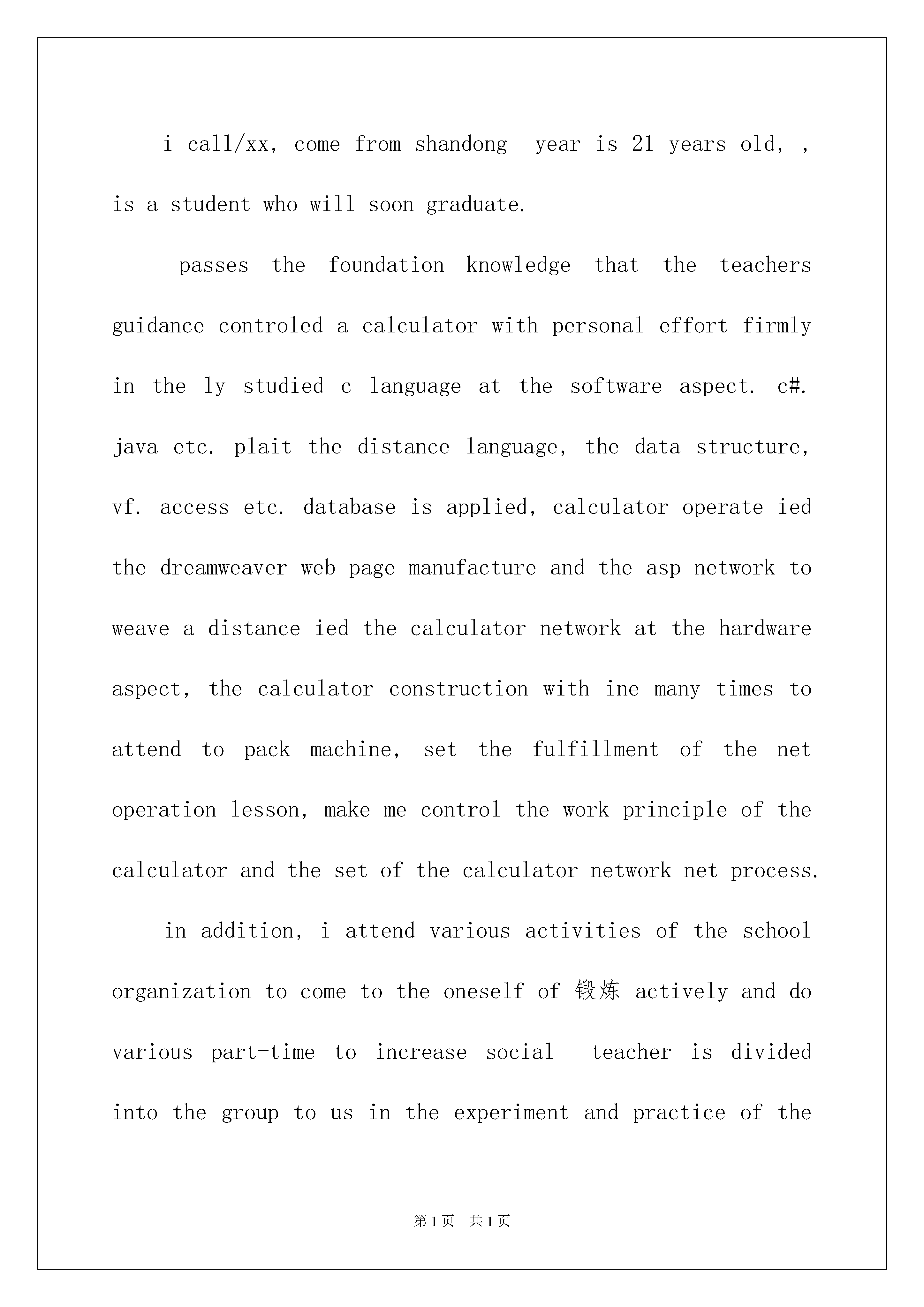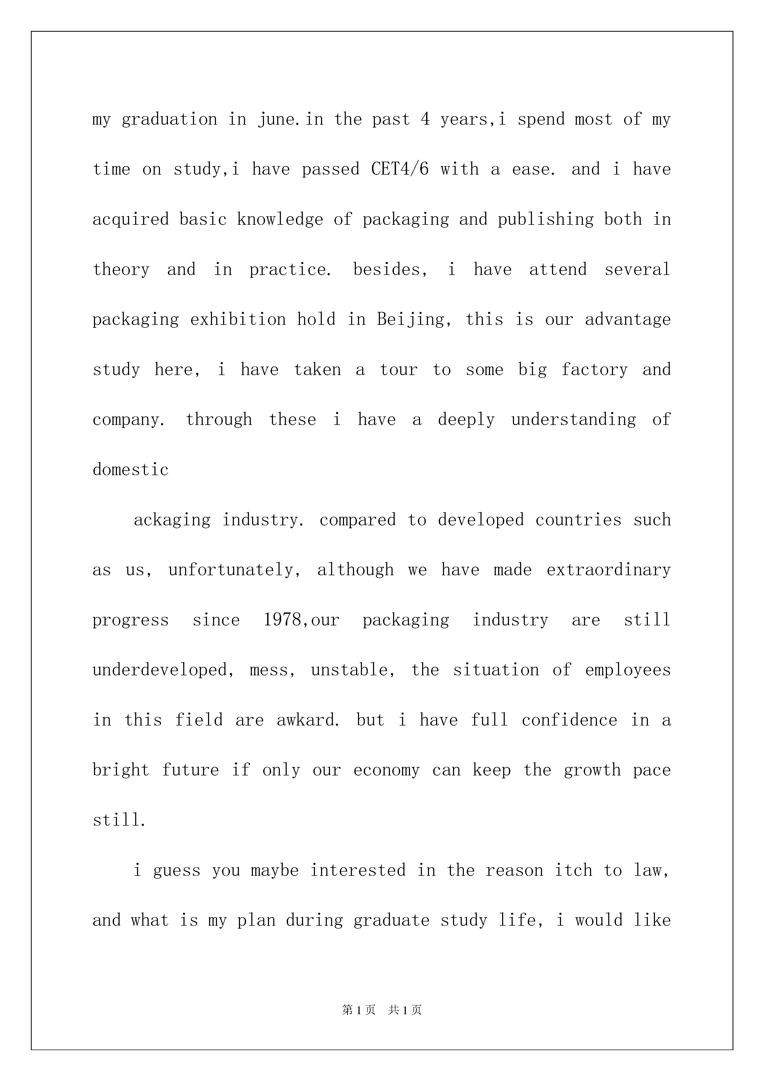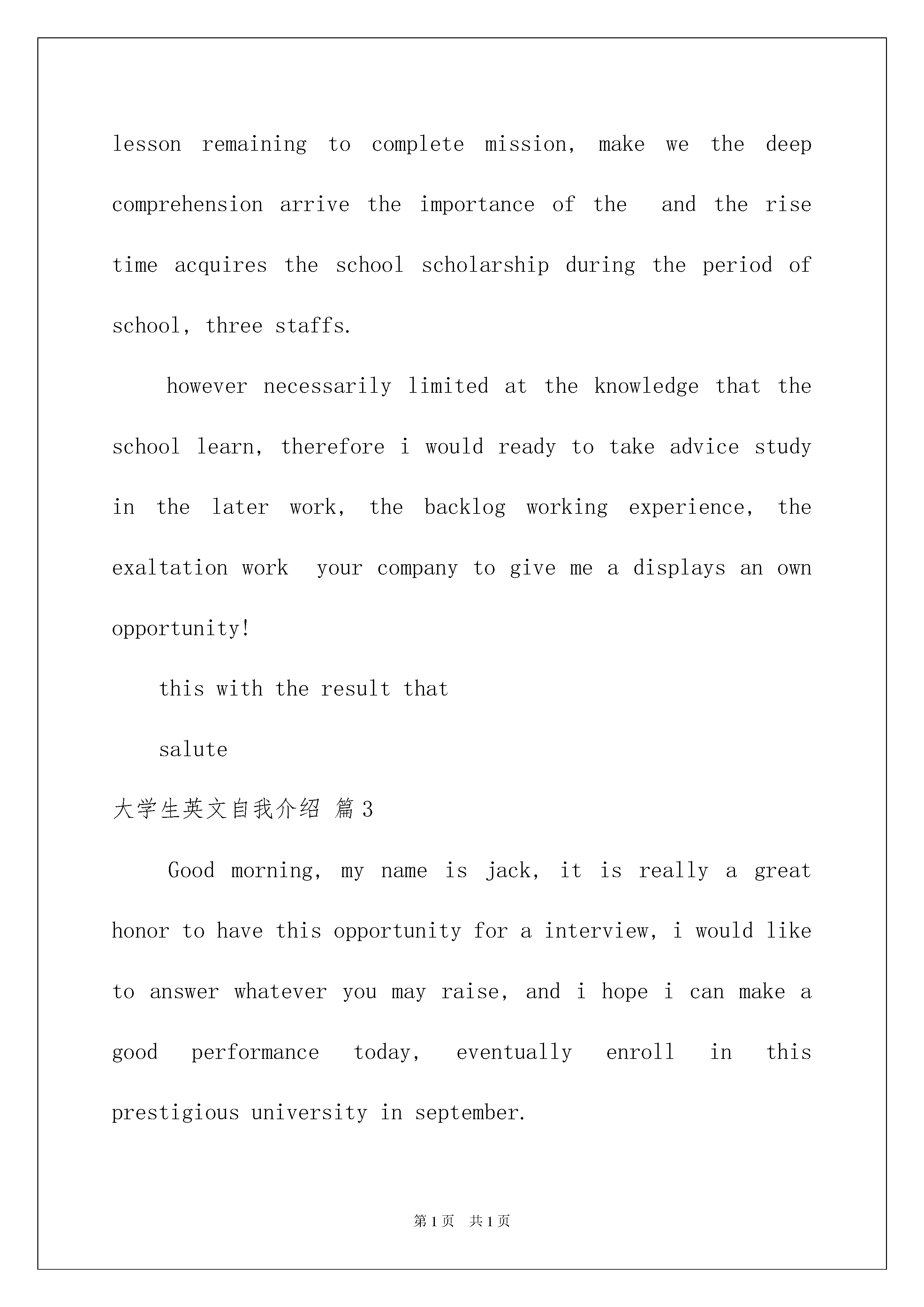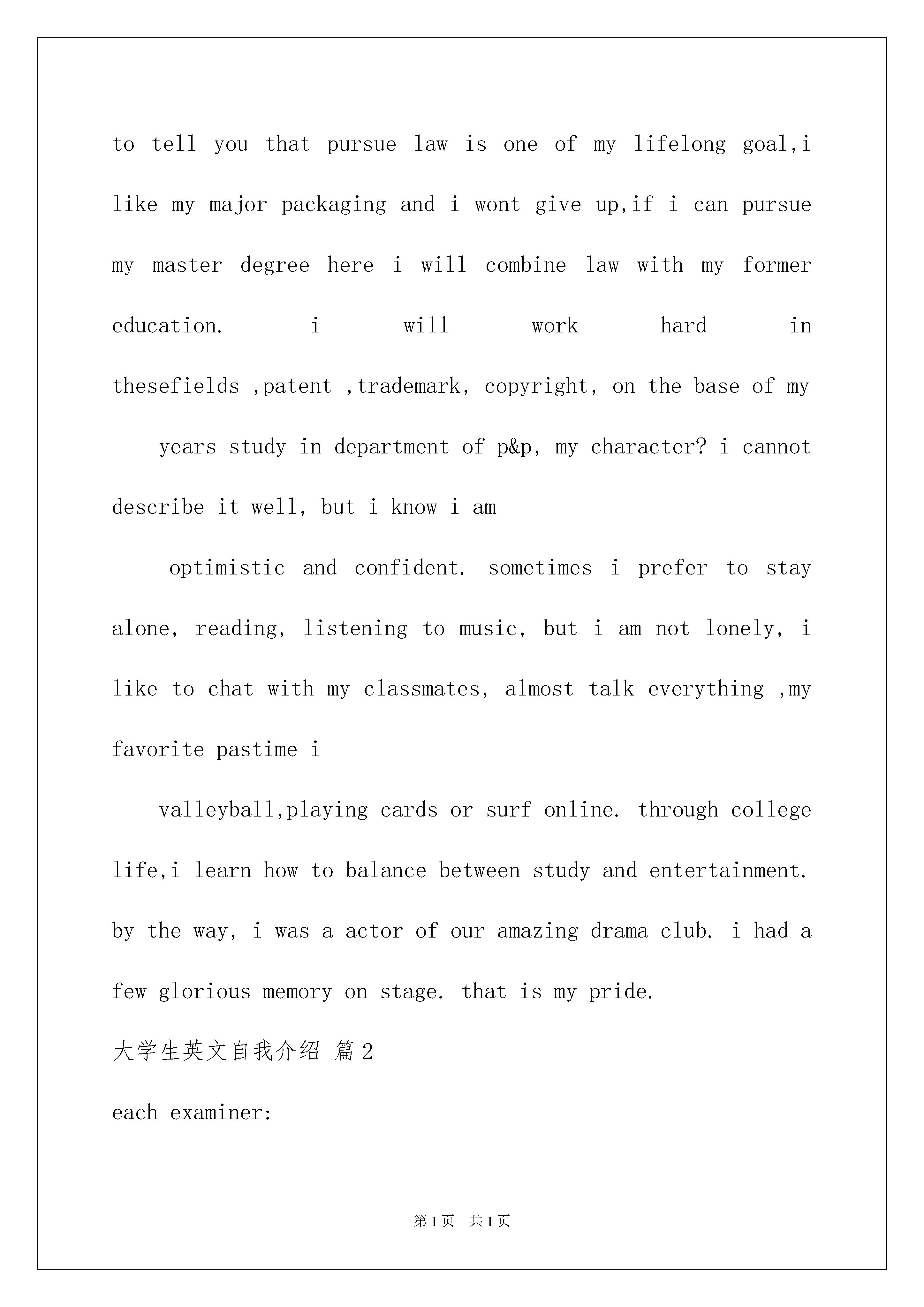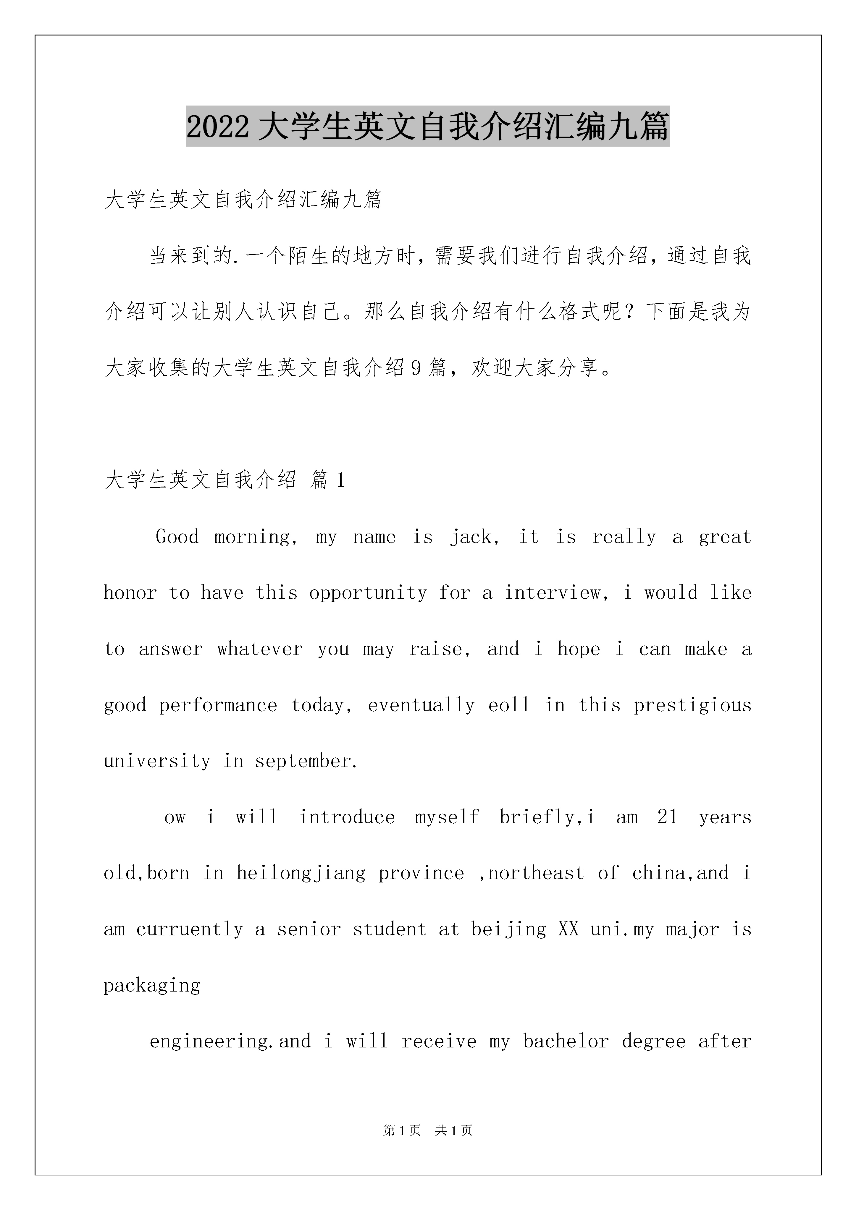 2022大学生英文自我介绍汇编九篇大学生英文自我介绍汇编九篇当来到的.一个陌生的地方时,需要我们进行自我介绍,通过自我介绍可以让别人认识自己。那么自我介绍有什么格式呢?下面是我为大家收集的大学生英文自我介绍9篇,欢迎大家分享。大学生英文自我介绍篇1Goodmorning,mynameisjack,itisreallyagreathonortohavethisopportunityforainterview,iwouldliketoanswerwhateveryoumayraise,andihopeicanmakeagoodperformancetoday,eventuallyeollinthisprestigiousuniversityinseptember.owiwillintroducemyselfbriefly,iam21yearsold,borninheilongjiangprovince,northeastofchina,andiamcurruentlyaseniorstudentatbeijingXXuni.mymajorispackagingengineering.andiwillreceivemybachelordegreeaftermygraduationinjune.inthepast4years,ispendmostofmytimeonstudy,ihavepassedCET4/6withaease.andihaveacquiredbasicknowledgeofpackagingandpublishingbothintheoryandinpractice.besides,ihaveattendseveralpackagingexhibitionholdinBeijing,thisisouradvantagestudyhere,ihavetakenatourtosomebigfactoryandcompany.throughtheseihaveadeeplyunderstandingofdomesticackagingindustry.comparedtodevelopedcountriessuchasus,unfortunately,althoughwehavemadeextraordinaryprogresssince1978,ourpackagingindustryarestillunderdeveloped,mess,unstable,thesituationofemployeesinthisfieldareawkard.butihavefullconfidenceinabrightfutureifonlyoureconomycankeepthegrowthpacestill.iguessyoumaybeinterestedinthereasonitchtolaw,andwhatismyplanduringgraduatestudylife,iwouldliketotellyouthatpursuelawisoneofmylifelonggoal,ilikemymajorpackagingandiwontgiveup,ificanpursuemymasterdegreehereiwillcombinelawwithmyformereducation.iwillworkhardinthesefields,patent,trademark,copyright,onthebaseofmyyearsstudyindepartmentofp&p,mycharacter?icannotdescribeitwell,butiknowiamoptimisticandconfident.sometimesiprefertostayalone,reading,listeningtomusic,butiamnotlonely,iliketochatwithmyclassmates,almosttalkeverything,myfavoritepastimeivalleyball,playingcardsorsurfonline.throughcollegelife,ilearnhowtobalancebetweenstudyandentertainment.bytheway,iwasaactorofouramazingdramaclub.ihadafewgloriousmemoryonstage.thatismypride.大学生英文自我介绍篇2eachexami