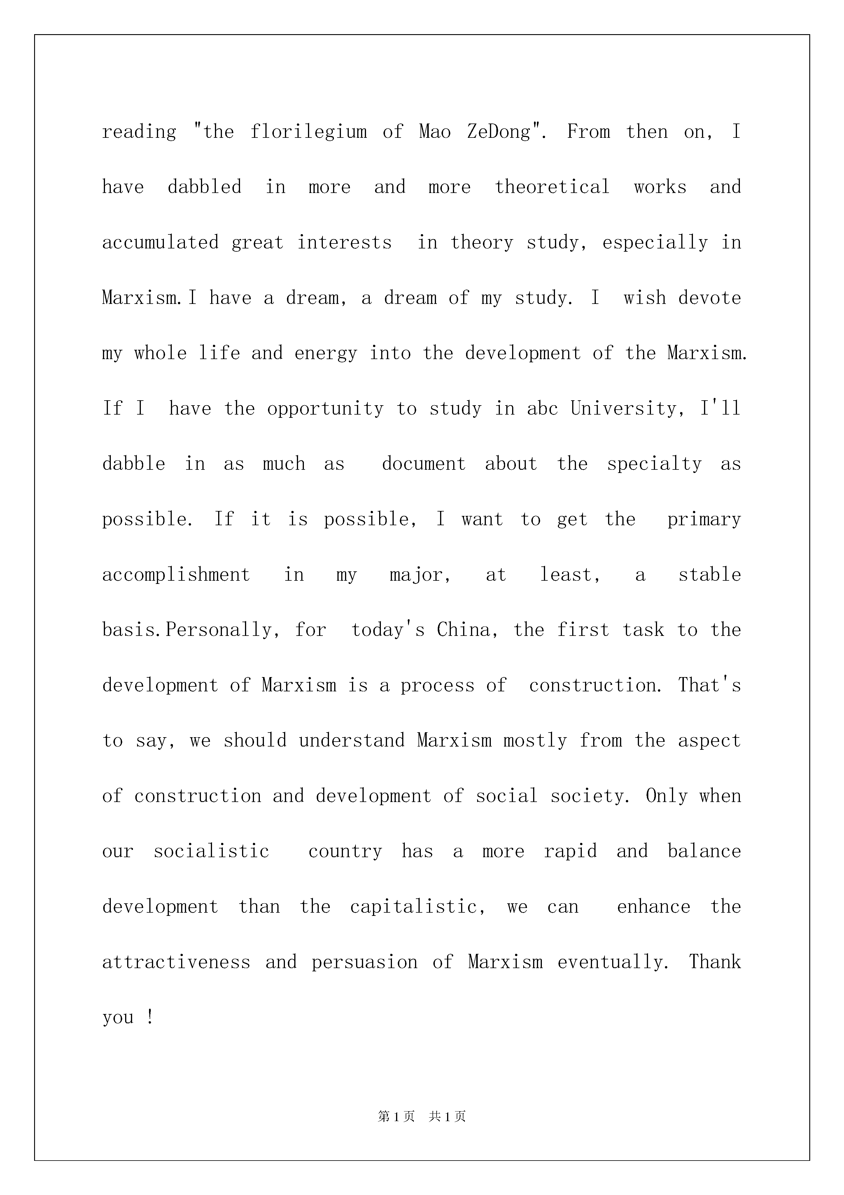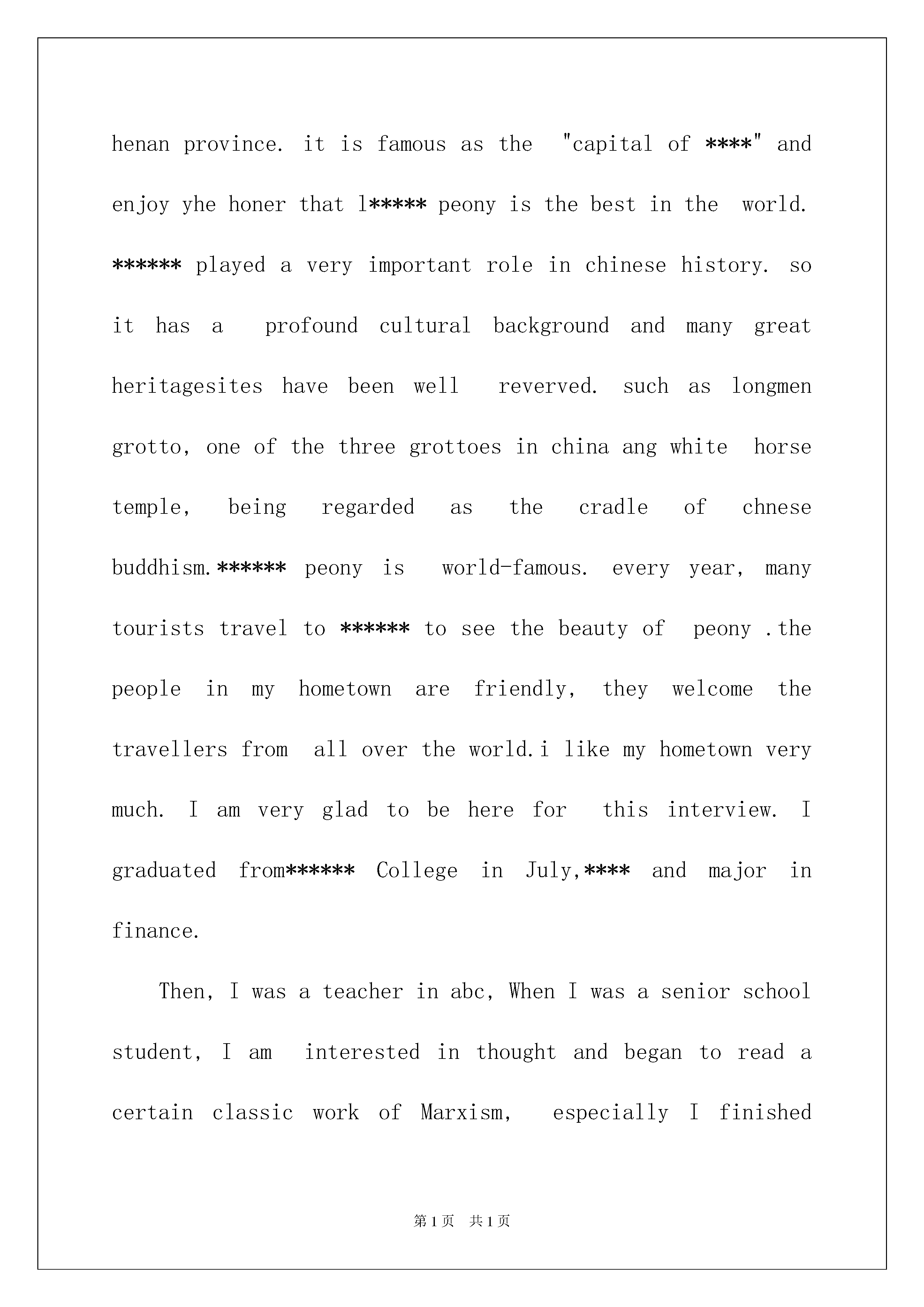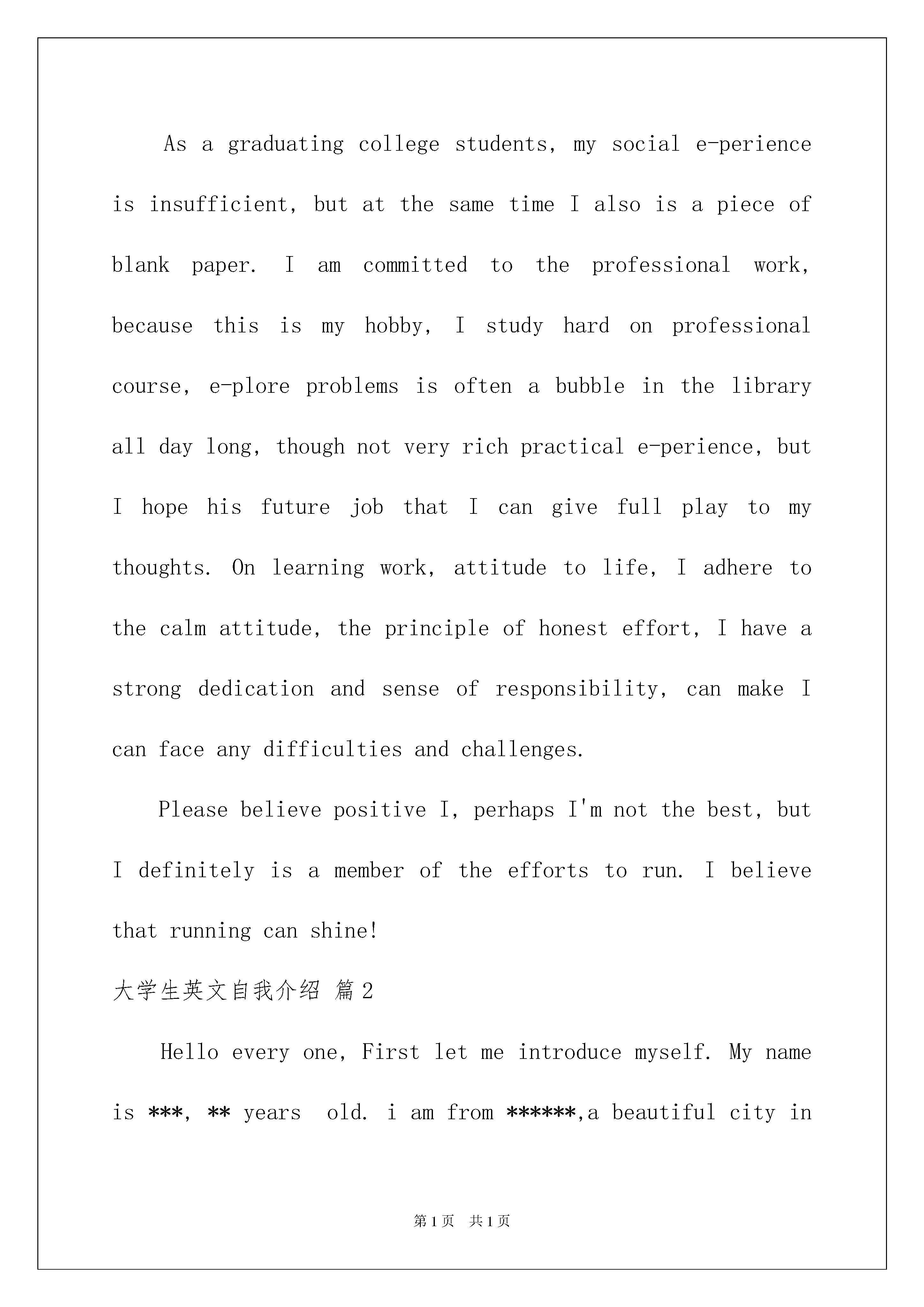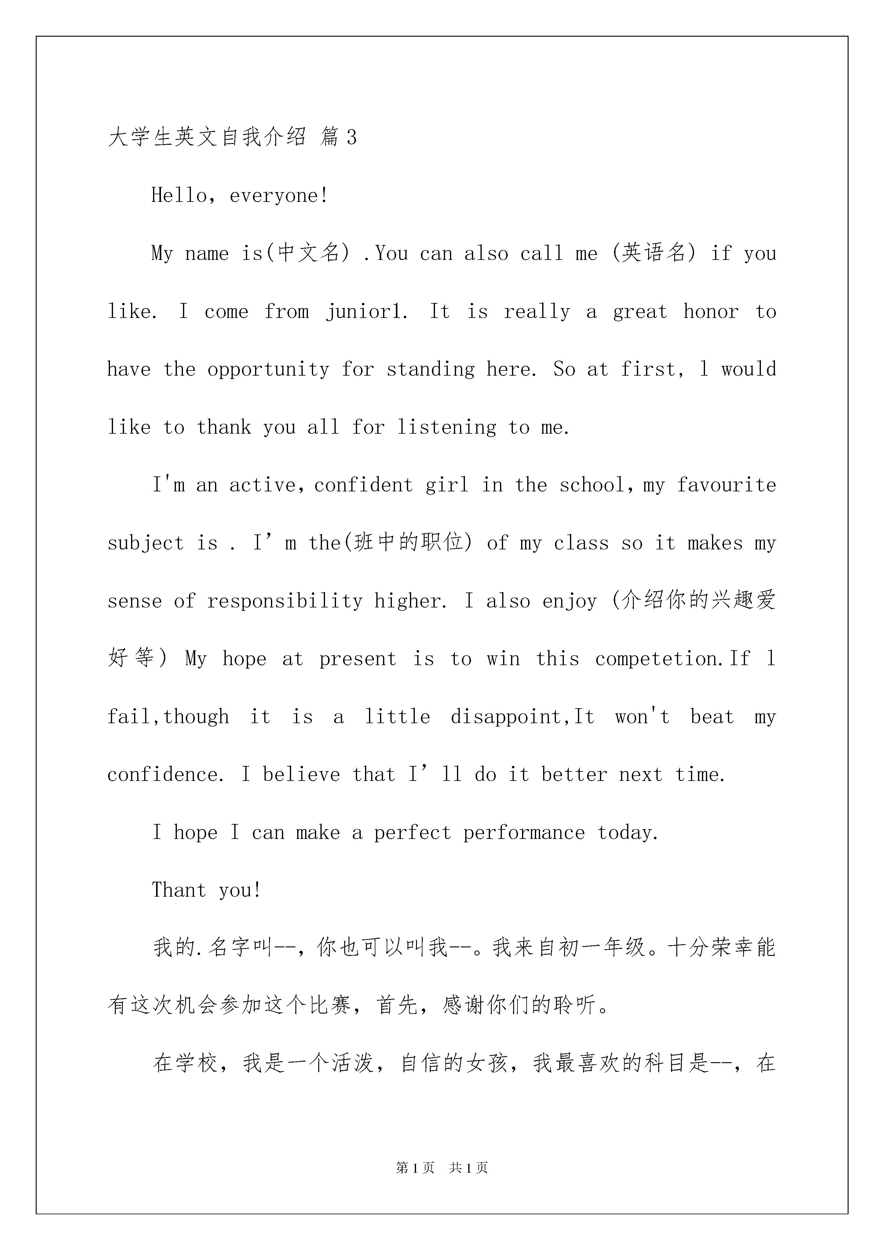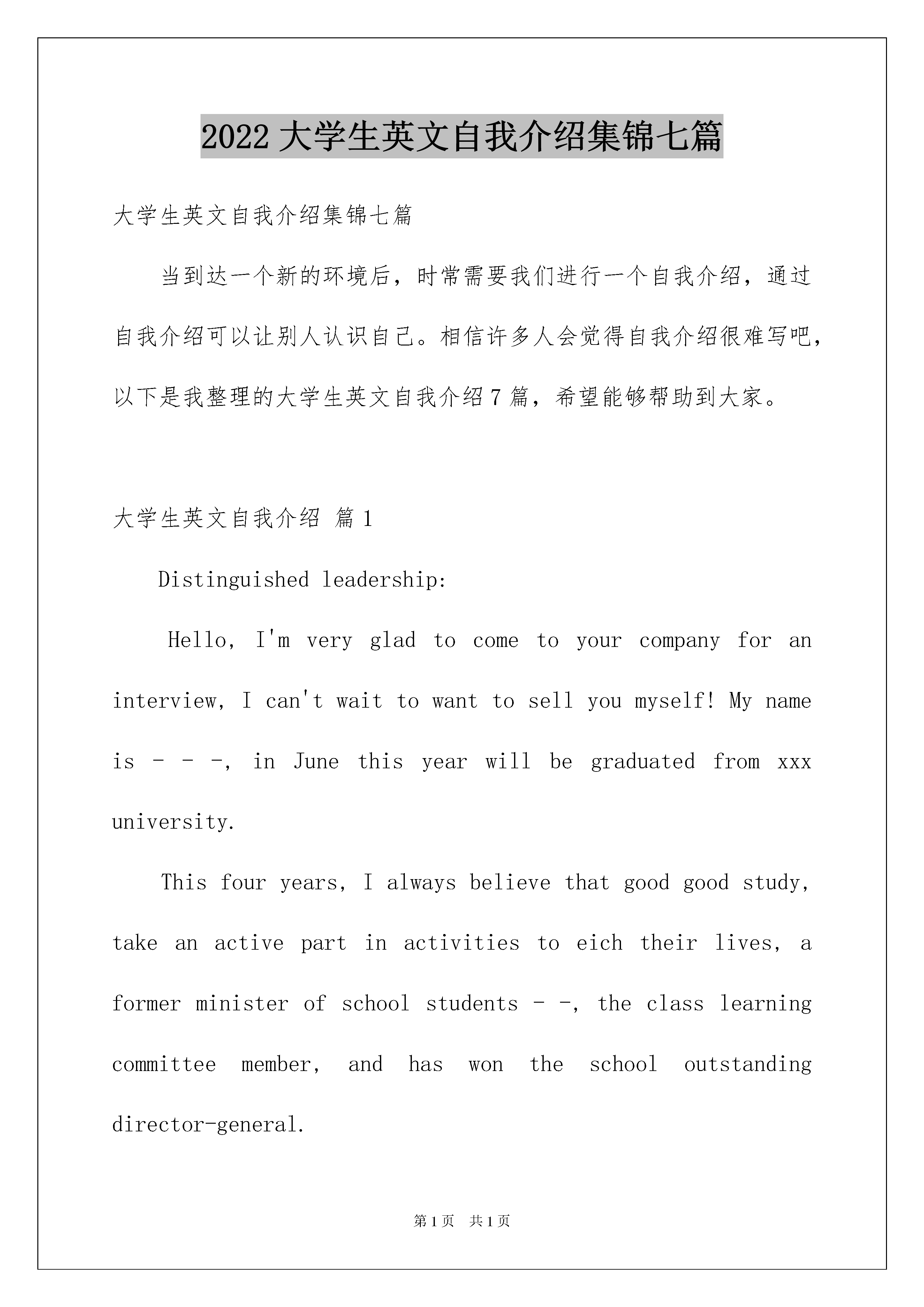 2022大学生英文自我介绍集锦七篇大学生英文自我介绍集锦七篇当到达一个新的环境后,时常需要我们进行一个自我介绍,通过自我介绍可以让别人认识自己。相信许多人会觉得自我介绍很难写吧,以下是我整理的大学生英文自我介绍7篇,希望能够帮助到大家。大学生英文自我介绍篇1Distinguishedleadership:Hello,I'mverygladtocometoyourcompanyforaninterview,Ican'twaittowanttosellyoumyself!Mynameis---,inJunethisyearwillbegraduatedfromxxxuniversity.Thisfouryears,Ialwaysbelievethatgoodgoodstudy,takeanactivepartinactivitiestoeichtheirlives,aformerministerofschoolstudents--,theclasslearningcommitteemember,andhaswontheschooloutstandingdirector-general.Asagraduatingcollegestudents,mysociale-perienceisinsufficient,butatthesametimeIalsoisapieceofblankpaper.Iamcommittedtotheprofessionalwork,becausethisismyhobby,Istudyhardonprofessionalcourse,e-ploreproblemsisoftenabubbleinthelibraryalldaylong,thoughnotveryrichpracticale-perience,butIhopehisfuturejobthatIcangivefullplaytomythoughts.Onlearningwork,attitudetolife,Iadheretothecalmattitude,theprincipleofhonesteffort,Ihaveastrongdedicationandsenseofresponsibility,canmakeIcanfaceanydifficultiesandchallenges.PleasebelievepositiveI,perhapsI'mnotthebest,butIdefinitelyisamemberoftheeffortstorun.Ibelievethatrunningcanshine!大学生英文自我介绍篇2Helloeveryone,Firstletmeintroducemyself.Mynameis***,**yearsold.iamfrom******,abeautifulcityinhenanprovince.itisfamousasthe"capitalof****"andenjoyyhehonerthatl*****peonyisthebestintheworld.******playedaveryimportantroleinchinesehistory.soithasaprofoundculturalbackgroundandmanygreatheritagesiteshavebeenwellreverved.suchaslongmengrotto,oneofthethreegrottoesinchinaangwhitehorsetemple,beingregardedasthecradleofchnesebuddhism.******peonyisworld-famous.everyyear,manytouriststravelto******toseethebeautyofpeony.thepeopleinmyhometownarefriendly,theywelcomethetravellersfromallovertheworld.ilikemyhometownverymuch.Iamverygladtobehereforthisinterview.Igraduatedfrom******CollegeinJuly,****andmajorinfinance.Then,Iwasateacherinabc,WhenIwasaseniorschoolstudent,Iaminterestedinthoughtandbegantoreadacert