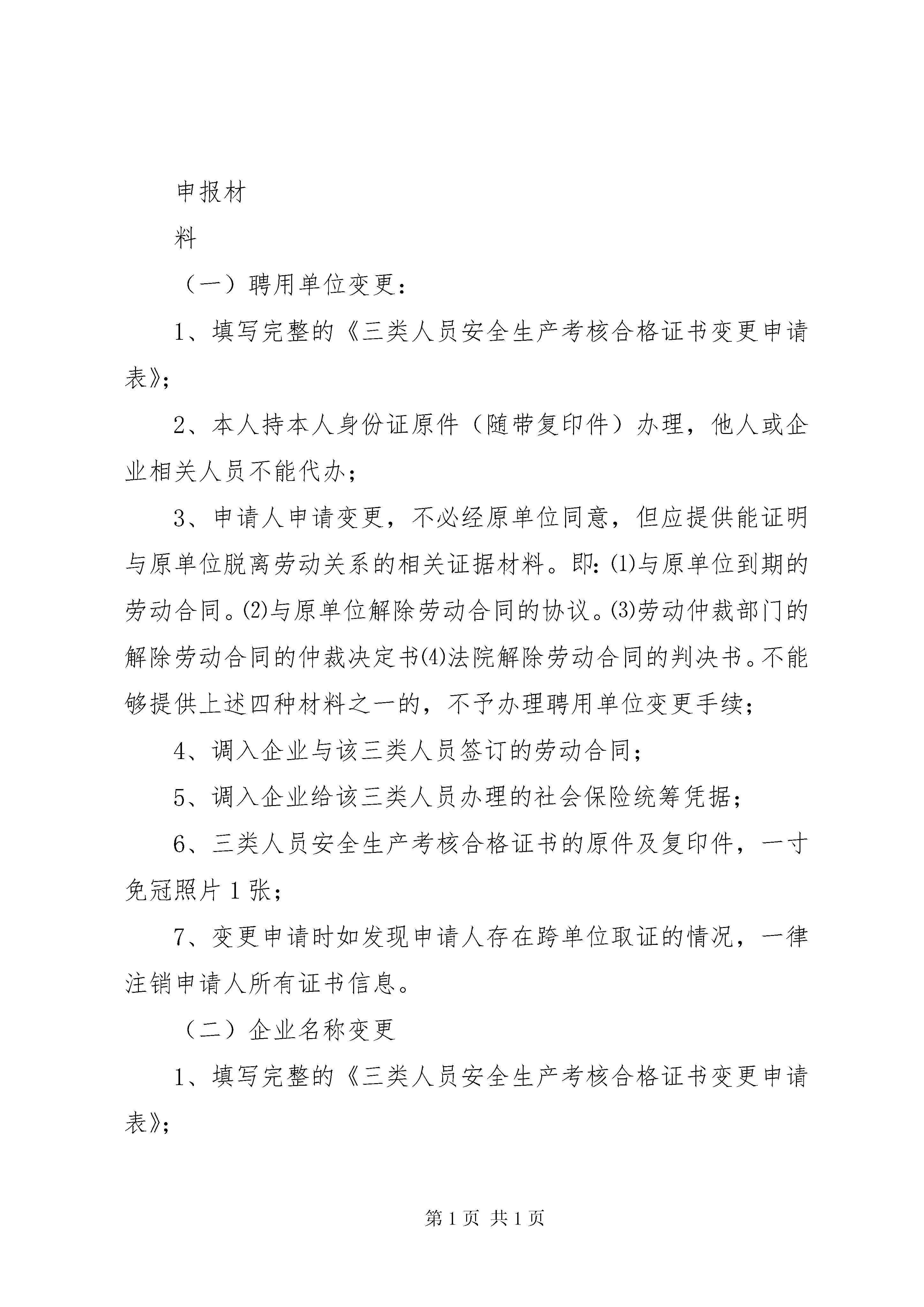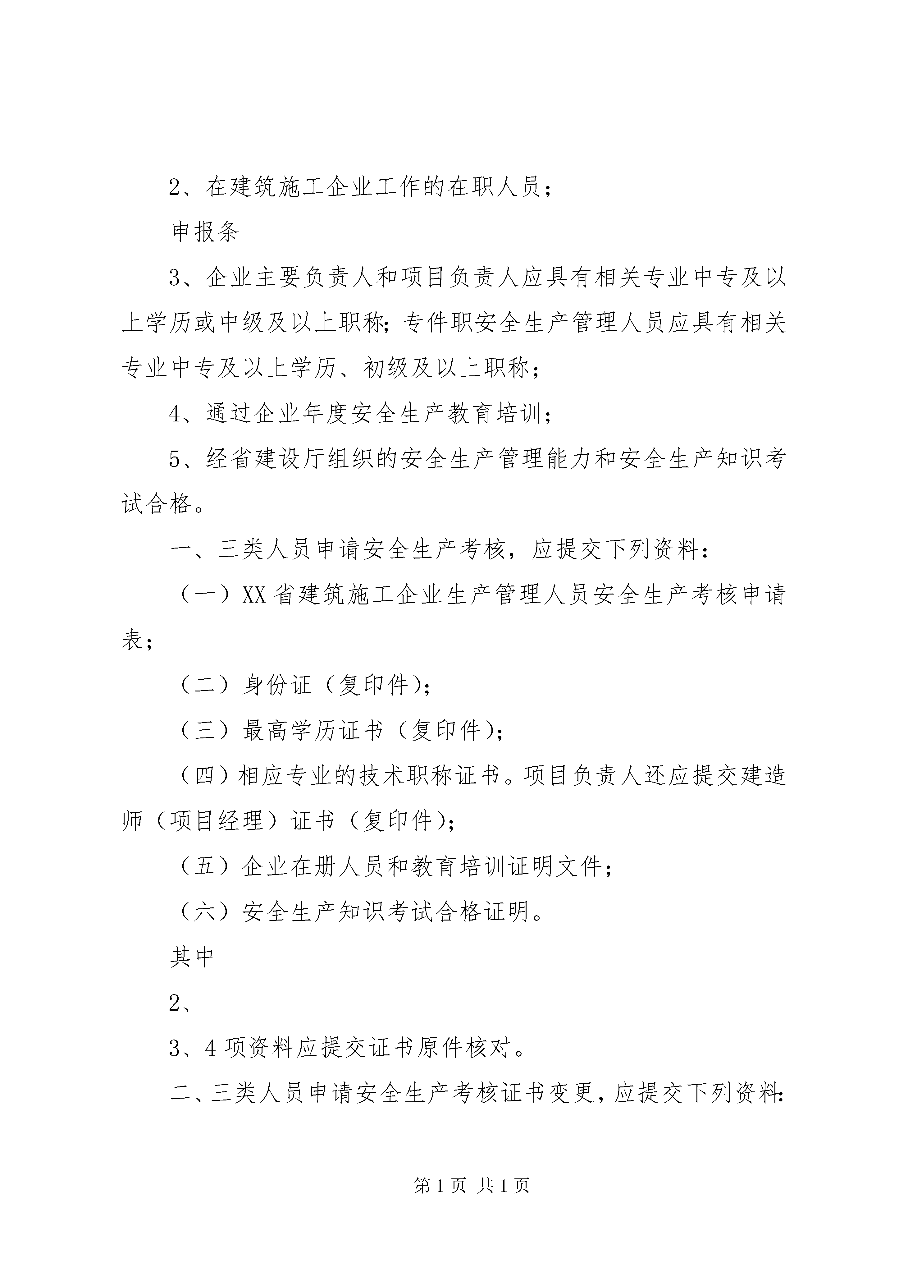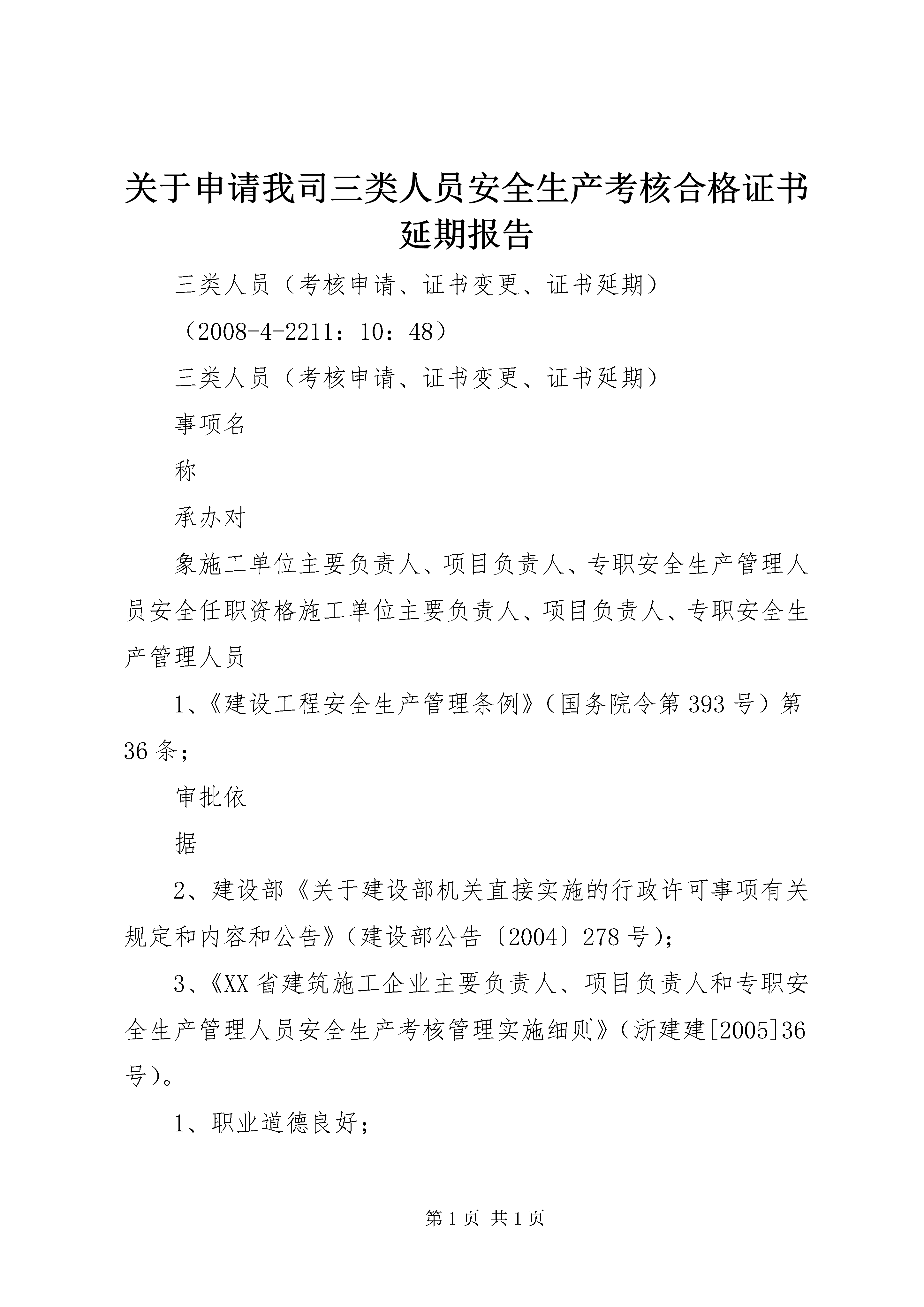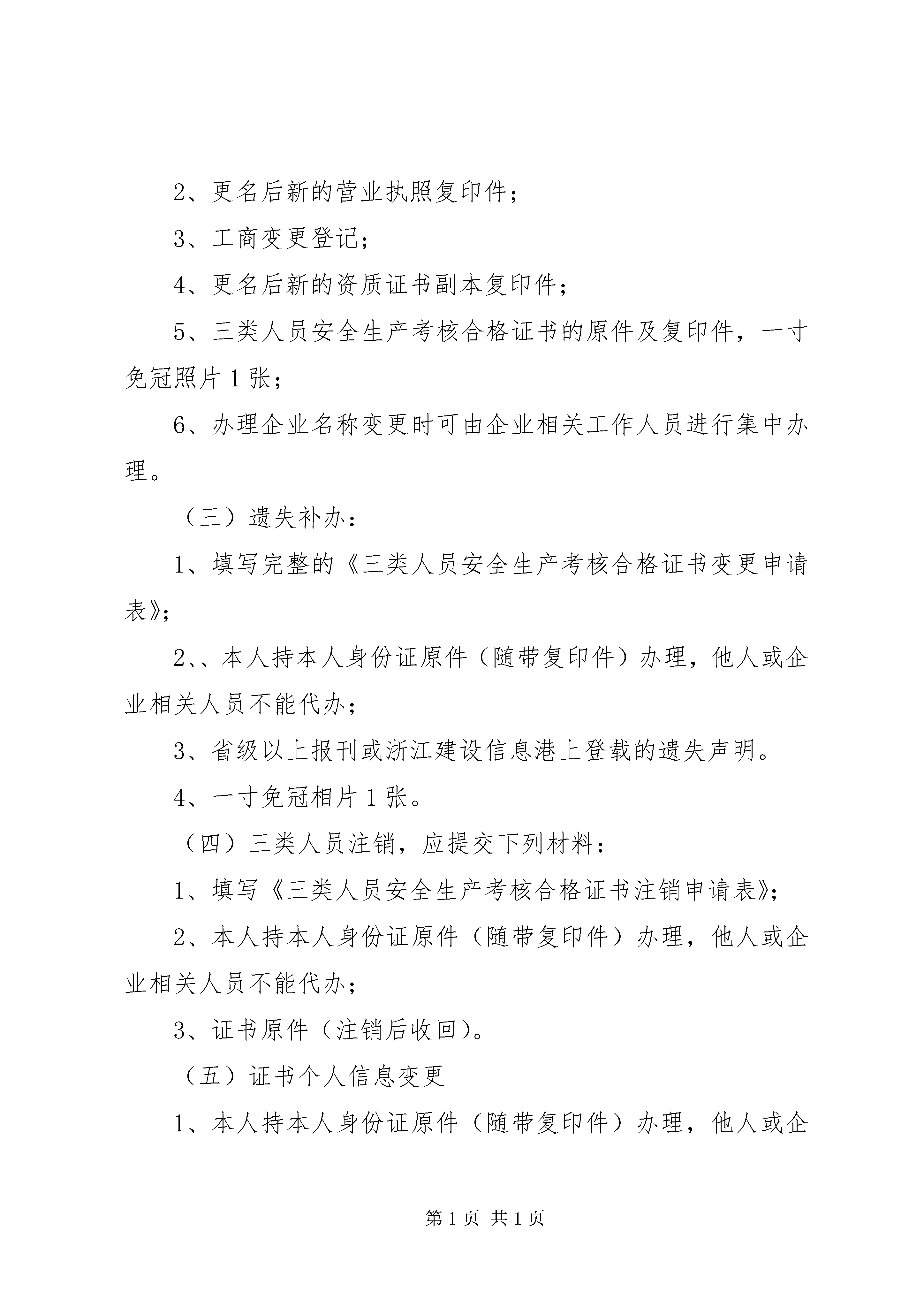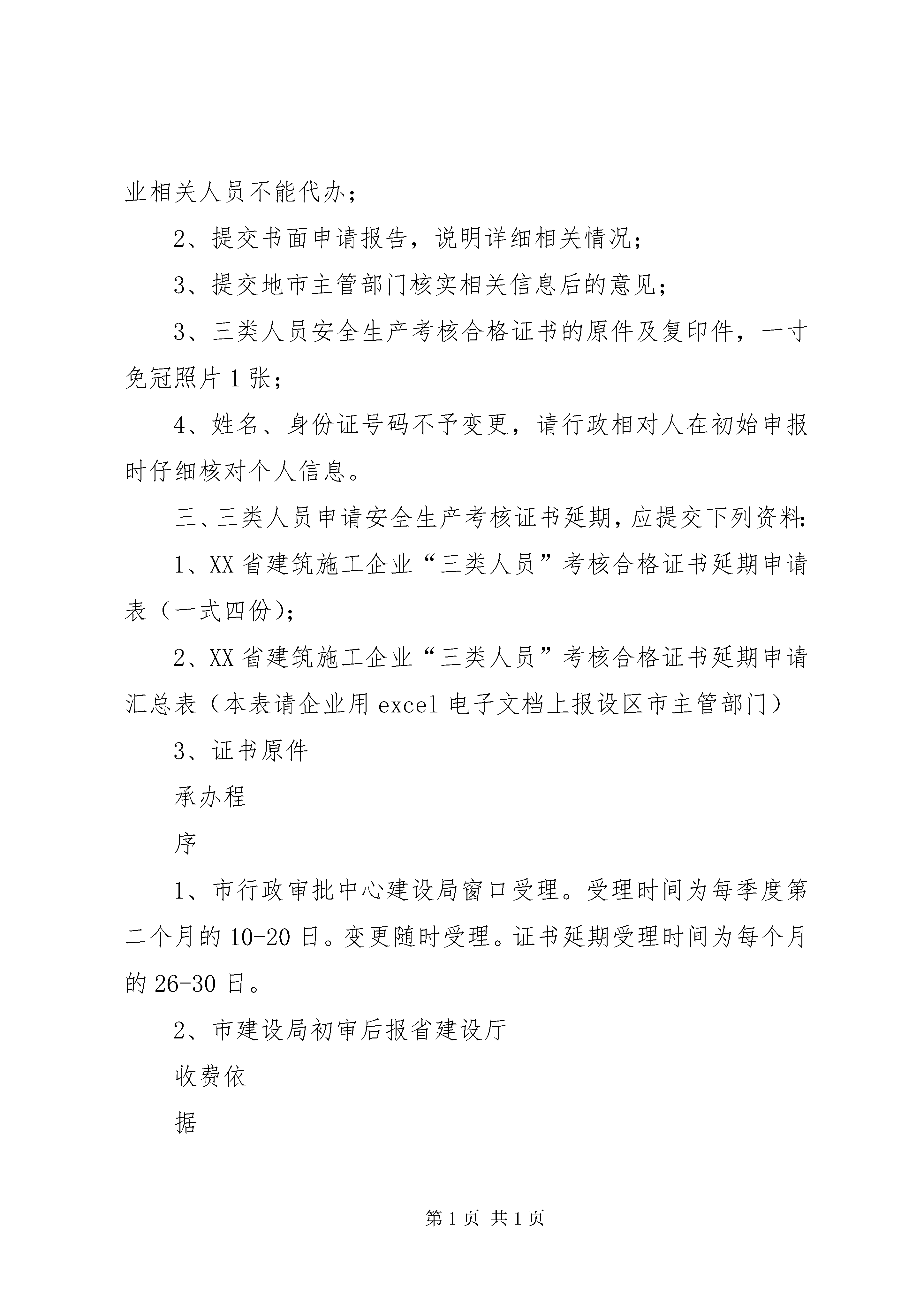 关于申请我司三类人员安全生产考核合格证书延期报告三类人员(考核申请、证书变更、证书延期)(2008-4-2211:10:48)三类人员(考核申请、证书变更、证书延期)事项名称承办对象施工单位主要负责人、项目负责人、专职安全生产管理人员安全任职资格施工单位主要负责人、项目负责人、专职安全生产管理人员1、《建设工程安全生产管理条例》(国务院令第393号)第36条;审批依据2、建设部《关于建设部机关直接实施的行政许可事项有关规定和内容和公告》(建设部公告〔2004〕278号);3、《XX省建筑施工企业主要负责人、项目负责人和专职安全生产管理人员安全生产考核管理实施细则》(浙建建[2005]36号)。1、职业道德良好;2、在建筑施工企业工作的在职人员;申报条3、企业主要负责人和项目负责人应具有相关专业中专及以上学历或中级及以上职称;专件职安全生产管理人员应具有相关专业中专及以上学历、初级及以上职称;4、通过企业年度安全生产教育培训;5、经省建设厅组织的安全生产管理能力和安全生产知识考试合格。一、三类人员申请安全生产考核,应提交下列资料:(一)XX省建筑施工企业生产管理人员安全生产考核申请表;(二)身份证(复印件);(三)最高学历证书(复印件);(四)相应专业的技术职称证书。项目负责人还应提交建造师(项目经理)证书(复印件);(五)企业在册人员和教育培训证明文件;(六)安全生产知识考试合格证明。其中2、3、4项资料应提交证书原件核对。二、三类人员申请安全生产考核证书变更,应提交下列资料:申报材料(一)聘用单位变更:1、填写完整的《三类人员安全生产考核合格证书变更申请表》;2、本人持本人身份证原件(随带复印件)办理,他人或企业相关人员不能代办;3、申请人申请变更,不必经原单位同意,但应提供能证明与原单位脱离劳动关系的相关证据材料。即:⑴与原单位到期的劳动合同。⑵与原单位解除劳动合同的协议。⑶劳动仲裁部门的解除劳动合同的仲裁决定书⑷法院解除劳动合同的判决书。不能够提供上述四种材料之一的,不予办理聘用单位变更手续;4、调入企业与该三类人员签订的劳动合同;5、调入企业给该三类人员办理的社会保险统筹凭据;6、三类人员安全生产考核合格证书的原件及复印件,一寸免冠照片1张;7、变更申请时如发现申请人存在跨单位取证的情况,一律注销申请人所有证书信息。(二)企业名称变更1、填写完整的《三类人员安全生产考核合格证书变更申请表》;2、更名后新的营业执照复印件;3、工商变更登记;4、更名后新的资质证书副本复印件;5、三类人员安全生产考核合格证书的原件及复印件,一寸免冠照片1张;6、办理企业名称变更时可由企业相关工作人员进行集中办理。(三)遗失补办:1、填写完整的《三类人员安全生产考核合格证书变更申请表》;2、、本人持本人身份证原件(随带复印件)办理,他人或企业相关人员不能代办;3、省级以上报刊或浙江建设信息港上登载的遗失声明。4、一寸免冠相片1张。(四)三类人员注销,应提交下列材料:1、填写《三类人员安全生产考核合格证书注销申请表》;2、本人持本人身份证原件(随带复印件)办理,他人或企业相关人员不能代办;3、证书原件(注销后收回)。(五)证书个人信息变更1、本人持本人身份证原件(随带复印件)办理,他人或企业相关人员不能代办;2、提交书面申请报告,说明详细相关情况;3、提交地市主管部门核实相关信息后的意见;3、三类人员安全生产考核合格证书的原件及复印件,一寸免冠照片1张;4、姓名、身份证号码不予变更,请行政相对人在初始申报时仔细核对个人信息。三、三类人员申请安全生产考核证书延期,应提交下列资料:1、XX省建筑施工企业“三类人员”考核合格证书延期申请表(一式四份);2、XX省建筑施工企业“三类人员”考核合格证书延期申请汇总表(本表请企业用excel电子文档上报设区市主管部门)3、证书原件承办程序1、市行政审批中心建设局窗口受理。受理时间为每季度第二个月的10-20日。变更随时受理。证书延期受理时间为每个月的26-30日。2、市建设局初审后报省建设厅收费依据收费标不收费准承办时限10个工作日,变更即办