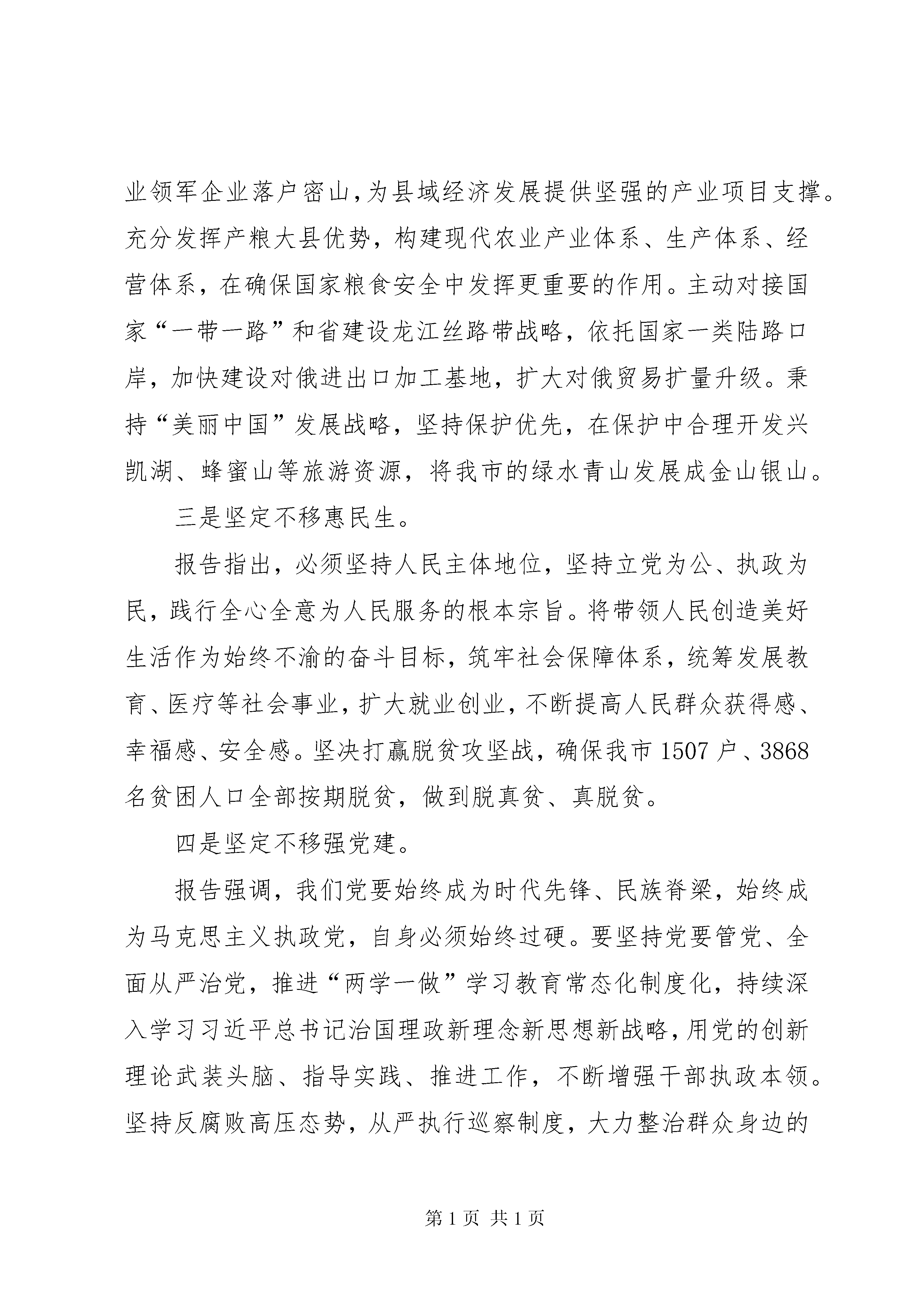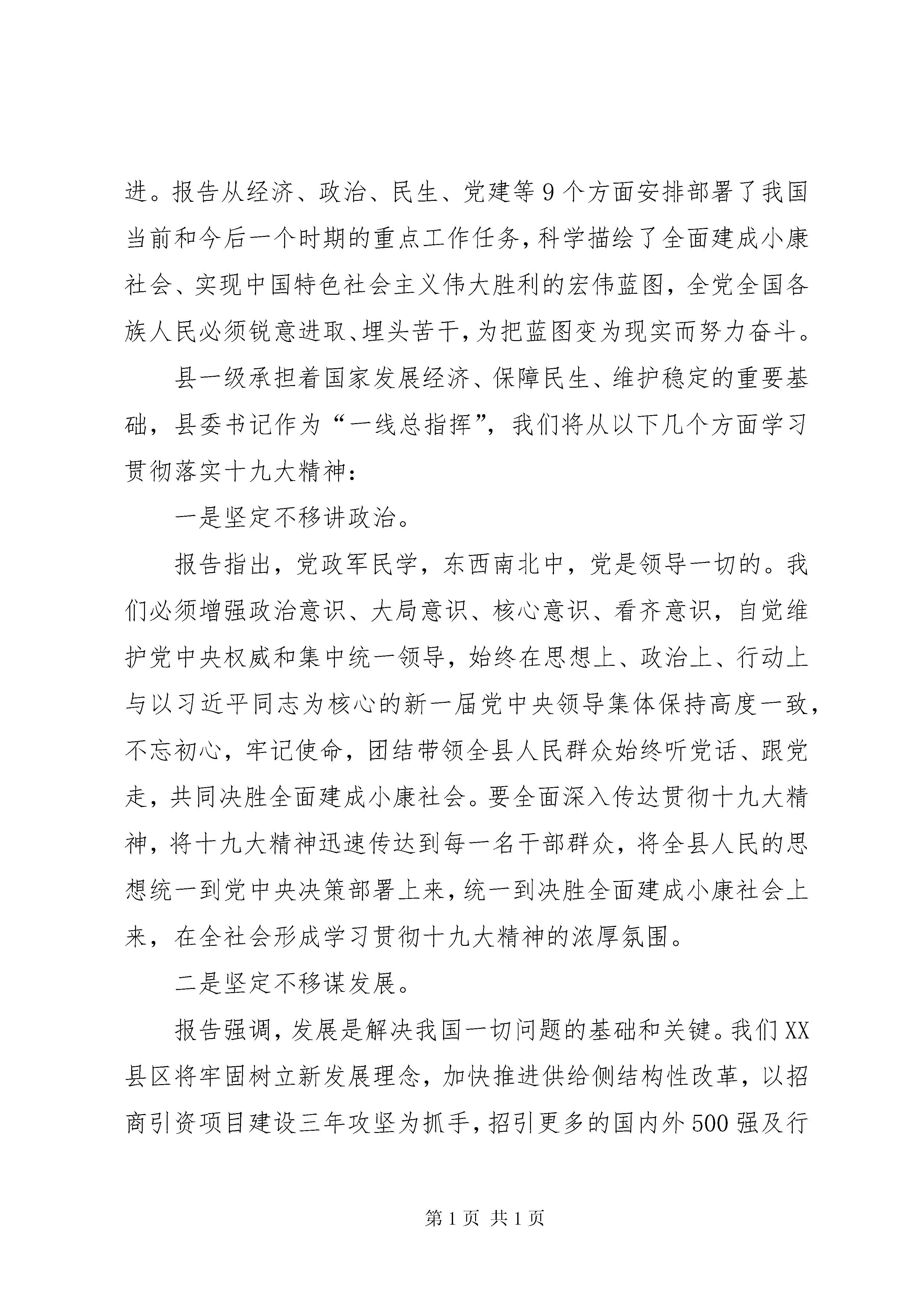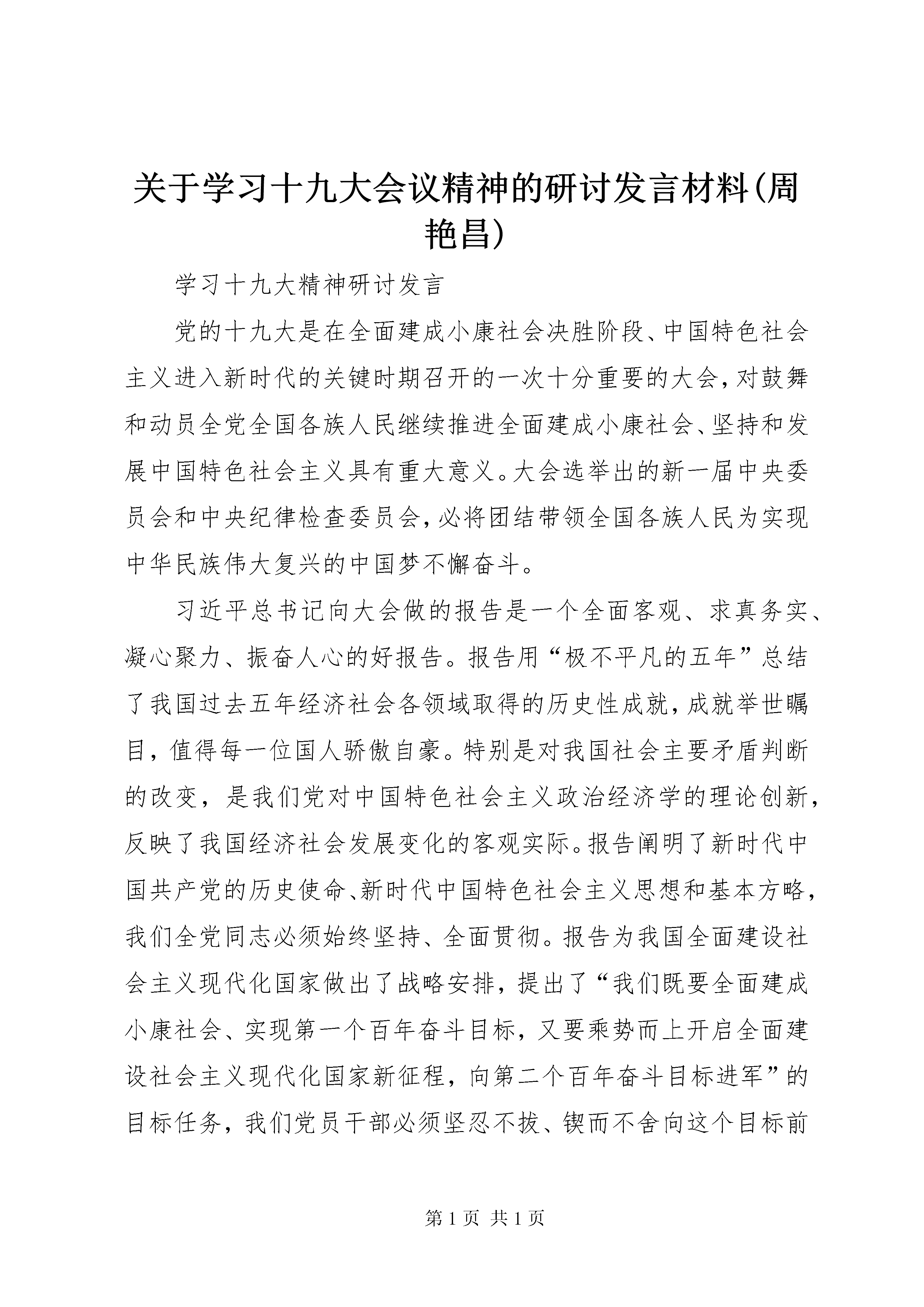 关于学习十九大会议精神的研讨发言材料(周艳昌)学习十九大精神研讨发言党的十九大是在全面建成小康社会决胜阶段、中国特色社会主义进入新时代的关键时期召开的一次十分重要的大会,对鼓舞和动员全党全国各族人民继续推进全面建成小康社会、坚持和发展中国特色社会主义具有重大意义。大会选举出的新一届中央委员会和中央纪律检查委员会,必将团结带领全国各族人民为实现中华民族伟大复兴的中国梦不懈奋斗。习近平总书记向大会做的报告是一个全面客观、求真务实、凝心聚力、振奋人心的好报告。报告用“极不平凡的五年”总结了我国过去五年经济社会各领域取得的历史性成就,成就举世瞩目,值得每一位国人骄傲自豪。特别是对我国社会主要矛盾判断的改变,是我们党对中国特色社会主义政治经济学的理论创新,反映了我国经济社会发展变化的客观实际。报告阐明了新时代中国共产党的历史使命、新时代中国特色社会主义思想和基本方略,我们全党同志必须始终坚持、全面贯彻。报告为我国全面建设社会主义现代化国家做出了战略安排,提出了“我们既要全面建成小康社会、实现第一个百年奋斗目标,又要乘势而上开启全面建设社会主义现代化国家新征程,向第二个百年奋斗目标进军”的目标任务,我们党员干部必须坚忍不拔、锲而不舍向这个目标前进。报告从经济、政治、民生、党建等9个方面安排部署了我国当前和今后一个时期的重点工作任务,科学描绘了全面建成小康社会、实现中国特色社会主义伟大胜利的宏伟蓝图,全党全国各族人民必须锐意进取、埋头苦干,为把蓝图变为现实而努力奋斗。县一级承担着国家发展经济、保障民生、维护稳定的重要基础,县委书记作为“一线总指挥”,我们将从以下几个方面学习贯彻落实十九大精神:一是坚定不移讲政治。报告指出,党政军民学,东西南北中,党是领导一切的。我们必须增强政治意识、大局意识、核心意识、看齐意识,自觉维护党中央权威和集中统一领导,始终在思想上、政治上、行动上与以习近平同志为核心的新一届党中央领导集体保持高度一致,不忘初心,牢记使命,团结带领全县人民群众始终听党话、跟党走,共同决胜全面建成小康社会。要全面深入传达贯彻十九大精神,将十九大精神迅速传达到每一名干部群众,将全县人民的思想统一到党中央决策部署上来,统一到决胜全面建成小康社会上来,在全社会形成学习贯彻十九大精神的浓厚氛围。二是坚定不移谋发展。报告强调,发展是解决我国一切问题的基础和关键。我们XX县区将牢固树立新发展理念,加快推进供给侧结构性改革,以招商引资项目建设三年攻坚为抓手,招引更多的国内外500强及行业领军企业落户密山,为县域经济发展提供坚强的产业项目支撑。充分发挥产粮大县优势,构建现代农业产业体系、生产体系、经营体系,在确保国家粮食安全中发挥更重要的作用。主动对接国家“一带一路”和省建设龙江丝路带战略,依托国家一类陆路口岸,加快建设对俄进出口加工基地,扩大对俄贸易扩量升级。秉持“美丽中国”发展战略,坚持保护优先,在保护中合理开发兴凯湖、蜂蜜山等旅游资源,将我市的绿水青山发展成金山银山。三是坚定不移惠民生。报告指出,必须坚持人民主体地位,坚持立党为公、执政为民,践行全心全意为人民服务的根本宗旨。将带领人民创造美好生活作为始终不渝的奋斗目标,筑牢社会保障体系,统筹发展教育、医疗等社会事业,扩大就业创业,不断提高人民群众获得感、幸福感、安全感。坚决打赢脱贫攻坚战,确保我市1507户、3868名贫困人口全部按期脱贫,做到脱真贫、真脱贫。四是坚定不移强党建。报告强调,我们党要始终成为时代先锋、民族脊梁,始终成为马克思主义执政党,自身必须始终过硬。要坚持党要管党、全面从严治党,推进“两学一做”学习教育常态化制度化,持续深入学习习近平总书记治国理政新理念新思想新战略,用党的创新理论武装头脑、指导实践、推进工作,不断增强干部执政本领。坚持反腐败高压态势,从严执行巡察制度,大力整治群众身边的不正之风和腐败问题,确保干部清正、政府清廉、政治清明。