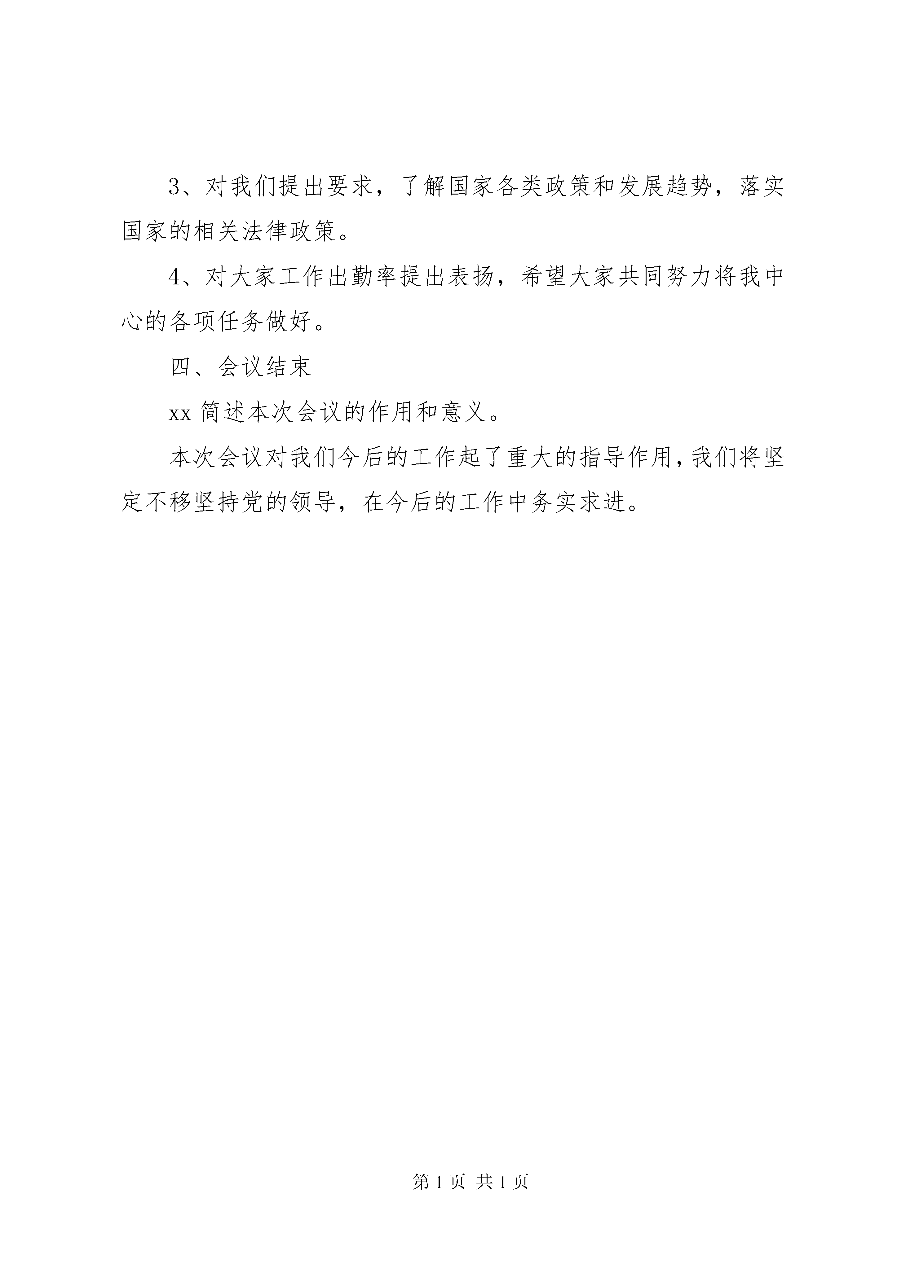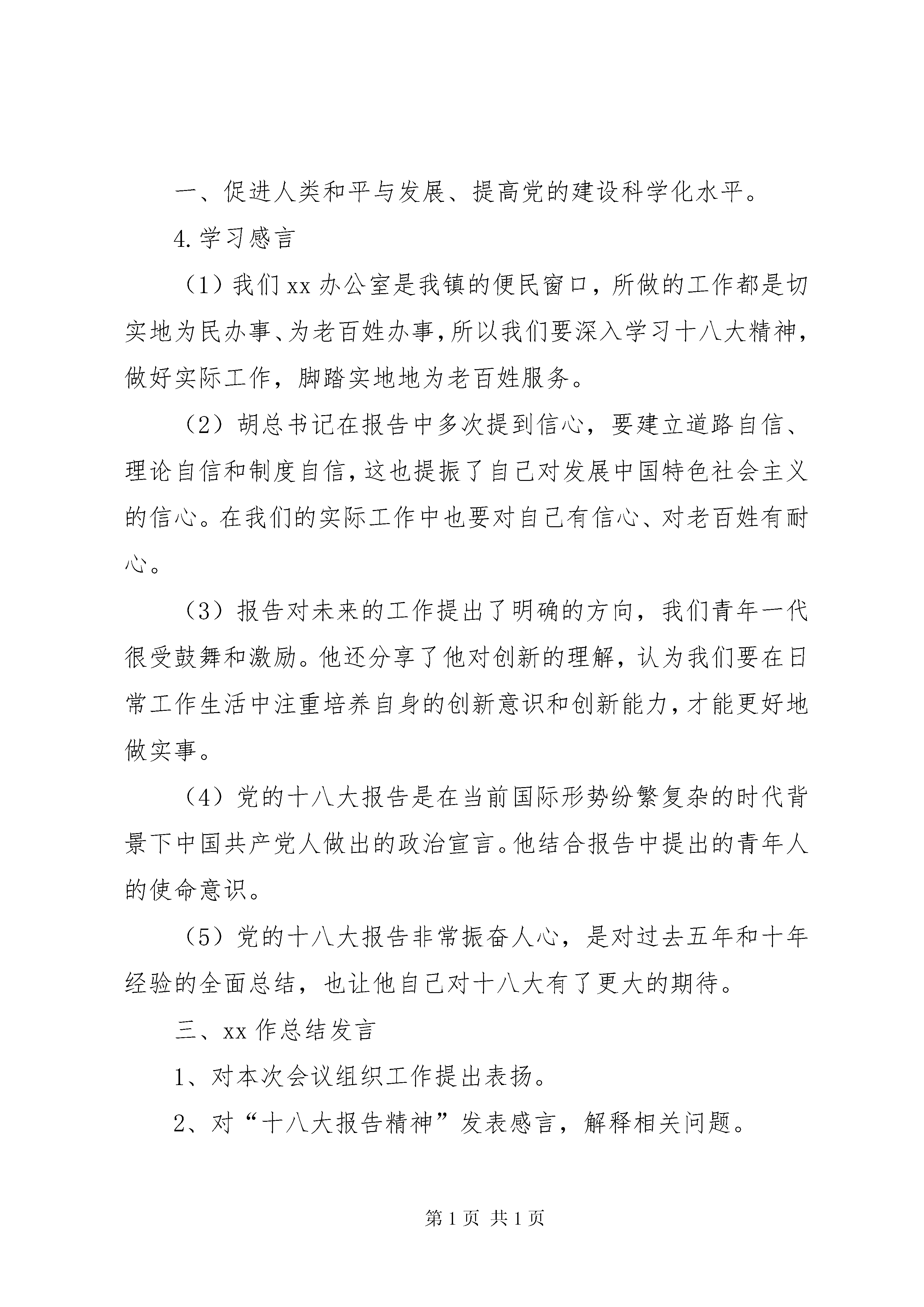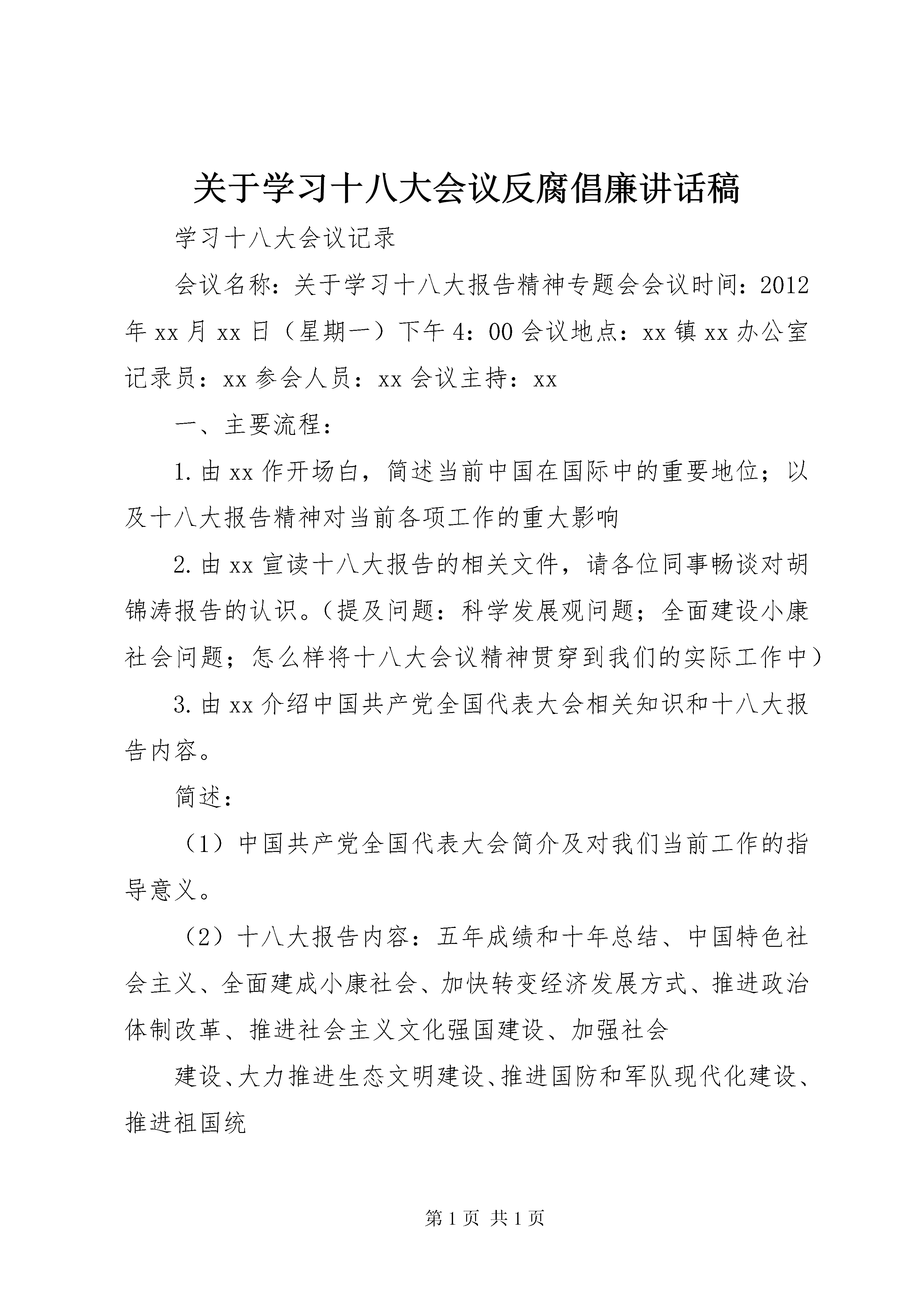 关于学习十八大会议反腐倡廉讲话稿学习十八大会议记录会议名称:关于学习十八大报告精神专题会会议时间:2012年xx月xx日(星期一)下午4:00会议地点:xx镇xx办公室记录员:xx参会人员:xx会议主持:xx一、主要流程:1.由xx作开场白,简述当前中国在国际中的重要地位;以及十八大报告精神对当前各项工作的重大影响2.由xx宣读十八大报告的相关文件,请各位同事畅谈对胡锦涛报告的认识。(提及问题:科学发展观问题;全面建设小康社会问题;怎么样将十八大会议精神贯穿到我们的实际工作中)3.由xx介绍中国共产党全国代表大会相关知识和十八大报告内容。简述:(1)中国共产党全国代表大会简介及对我们当前工作的指导意义。(2)十八大报告内容:五年成绩和十年总结、中国特色社会主义、全面建成小康社会、加快转变经济发展方式、推进政治体制改革、推进社会主义文化强国建设、加强社会建设、大力推进生态文明建设、推进国防和军队现代化建设、推进祖国统一、促进人类和平与发展、提高党的建设科学化水平。4.学习感言(1)我们xx办公室是我镇的便民窗口,所做的工作都是切实地为民办事、为老百姓办事,所以我们要深入学习十八大精神,做好实际工作,脚踏实地地为老百姓服务。(2)胡总书记在报告中多次提到信心,要建立道路自信、理论自信和制度自信,这也提振了自己对发展中国特色社会主义的信心。在我们的实际工作中也要对自己有信心、对老百姓有耐心。(3)报告对未来的工作提出了明确的方向,我们青年一代很受鼓舞和激励。他还分享了他对创新的理解,认为我们要在日常工作生活中注重培养自身的创新意识和创新能力,才能更好地做实事。(4)党的十八大报告是在当前国际形势纷繁复杂的时代背景下中国共产党人做出的政治宣言。他结合报告中提出的青年人的使命意识。(5)党的十八大报告非常振奋人心,是对过去五年和十年经验的全面总结,也让他自己对十八大有了更大的期待。三、xx作总结发言1、对本次会议组织工作提出表扬。2、对“十八大报告精神”发表感言,解释相关问题。3、对我们提出要求,了解国家各类政策和发展趋势,落实国家的相关法律政策。4、对大家工作出勤率提出表扬,希望大家共同努力将我中心的各项任务做好。四、会议结束xx简述本次会议的作用和意义。本次会议对我们今后的工作起了重大的指导作用,我们将坚定不移坚持党的领导,在今后的工作中务实求进。