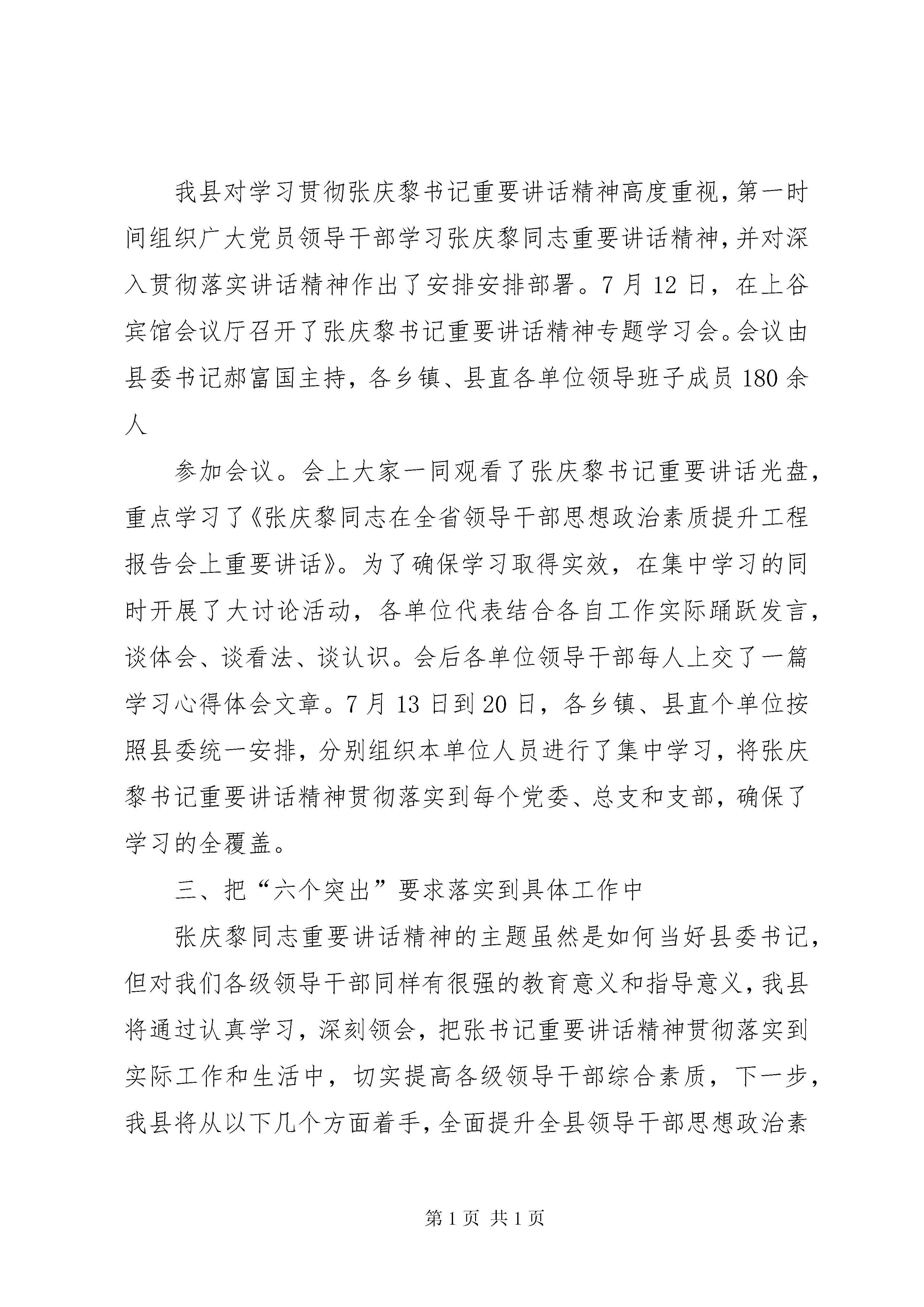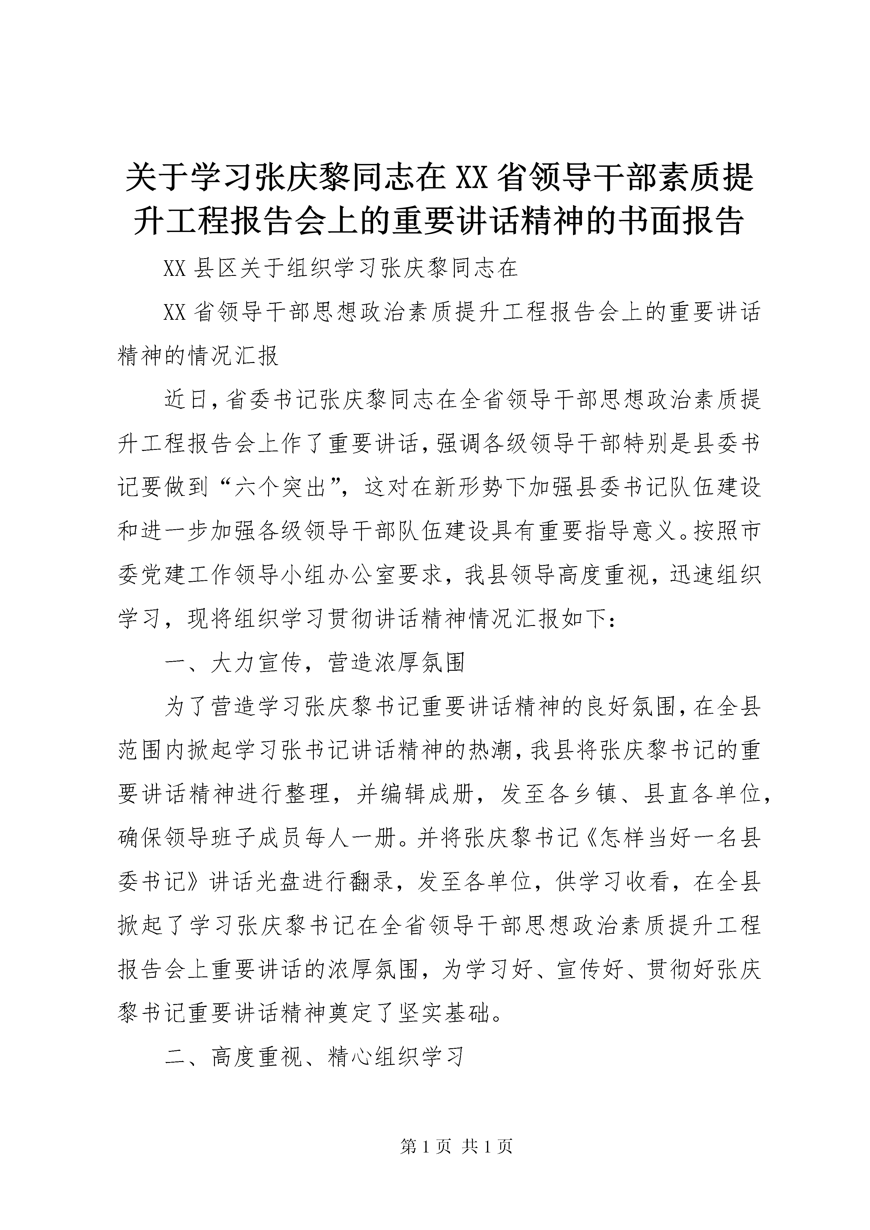 关于学习张庆黎同志在XX省领导干部素质提升工程报告会上的重要讲话精神的书面报告XX县区关于组织学习张庆黎同志在XX省领导干部思想政治素质提升工程报告会上的重要讲话精神的情况汇报近日,省委书记张庆黎同志在全省领导干部思想政治素质提升工程报告会上作了重要讲话,强调各级领导干部特别是县委书记要做到“六个突出”,这对在新形势下加强县委书记队伍建设和进一步加强各级领导干部队伍建设具有重要指导意义。按照市委党建工作领导小组办公室要求,我县领导高度重视,迅速组织学习,现将组织学习贯彻讲话精神情况汇报如下:一、大力宣传,营造浓厚氛围为了营造学习张庆黎书记重要讲话精神的良好氛围,在全县范围内掀起学习张书记讲话精神的热潮,我县将张庆黎书记的重要讲话精神进行整理,并编辑成册,发至各乡镇、县直各单位,确保领导班子成员每人一册。并将张庆黎书记《怎样当好一名县委书记》讲话光盘进行翻录,发至各单位,供学习收看,在全县掀起了学习张庆黎书记在全省领导干部思想政治素质提升工程报告会上重要讲话的浓厚氛围,为学习好、宣传好、贯彻好张庆黎书记重要讲话精神奠定了坚实基础。二、高度重视、精心组织学习我县对学习贯彻张庆黎书记重要讲话精神高度重视,第一时间组织广大党员领导干部学习张庆黎同志重要讲话精神,并对深入贯彻落实讲话精神作出了安排安排部署。7月12日,在上谷宾馆会议厅召开了张庆黎书记重要讲话精神专题学习会。会议由县委书记郝富国主持,各乡镇、县直各单位领导班子成员180余人参加会议。会上大家一同观看了张庆黎书记重要讲话光盘,重点学习了《张庆黎同志在全省领导干部思想政治素质提升工程报告会上重要讲话》。为了确保学习取得实效,在集中学习的同时开展了大讨论活动,各单位代表结合各自工作实际踊跃发言,谈体会、谈看法、谈认识。会后各单位领导干部每人上交了一篇学习心得体会文章。7月13日到20日,各乡镇、县直个单位按照县委统一安排,分别组织本单位人员进行了集中学习,将张庆黎书记重要讲话精神贯彻落实到每个党委、总支和支部,确保了学习的全覆盖。三、把“六个突出”要求落实到具体工作中张庆黎同志重要讲话精神的主题虽然是如何当好县委书记,但对我们各级领导干部同样有很强的教育意义和指导意义,我县将通过认真学习,深刻领会,把张书记重要讲话精神贯彻落实到实际工作和生活中,切实提高各级领导干部综合素质,下一步,我县将从以下几个方面着手,全面提升全县领导干部思想政治素质。一是建立工作责任制。各级党组织把领导班子思想政治建设列入重要议事日程,纳入领导班子建设中长期规划,作为党建工作的重要内容抓紧抓好。要实行领导班子思想政治建设责任制,党委“一把手”要认真履行好作为领导班子思想政治建设的第一责任人的责任,切实抓好班子,带好队伍。分管领导要履行好直接责任人的责任,一级抓一级,层层抓落实。班子其他成员要各负其责,抓好分管部门领导班子的思想政治建设,确保领导班子思想政治建设的各项要求落到实处。二是形成工作合力。组织部门要强化职能,发挥好牵头抓总作用,承担起宏观指导、组织协调、督促检查的责任,把思想政治建设纳入对领导干部的日常管理之中。纪检部门要抓好党风党纪教育,抓好领导干部廉洁自律各项规定和党风廉政建设责任制的督促、检查和落实,及时查处各种违纪行为。宣传部门要抓好理论学习和教育等方面的计划、安排以及先进典型的宣传。各有关部门要按照分工各负其责,各司其职,齐抓共管,密切配合,形成抓思想政治建设的强大合力。要建立联席会议制度,定期分析领导班子思想政治建设状况,针对存在的突出问题,研究提出解决问题、推动工作的办法。三是抓好督导落实。县委每半年对各级领导班子思想作风状况进行一次综合分析和督促检查,年底进行全面总结评价,作为考核领导班子和领导干部的一项重要内容。各级党组织每年底要向上级党委报告思想政治素质提升工程进展情况。各级领导班子和领导干部要积极探索新形势下加强领导干部思想政治建设的有效途径,对自身思想政治建设情况进行定期自查,注意把握规律、总结经验,在建立健全加强领导干部思想政治建设的长效机制上下功夫,努力把我县领导干部思想政治素质提高到一个新水平。
