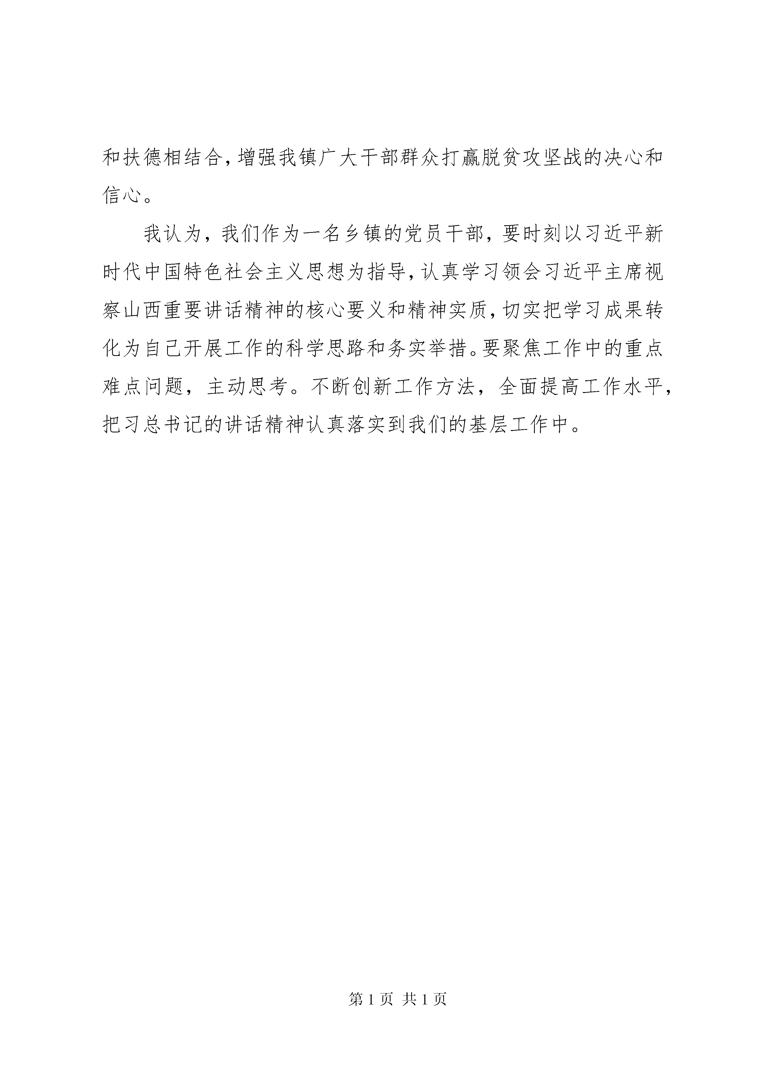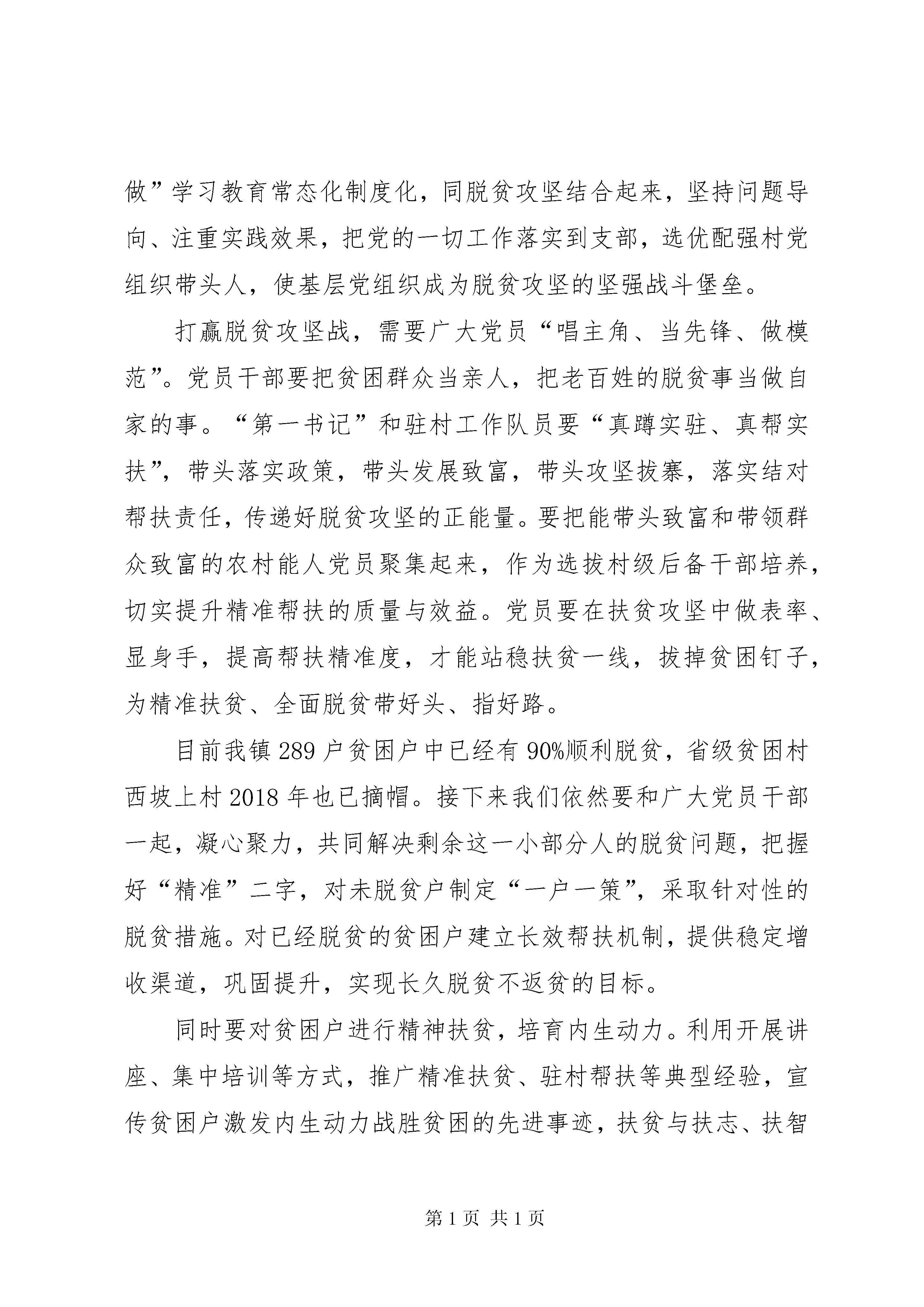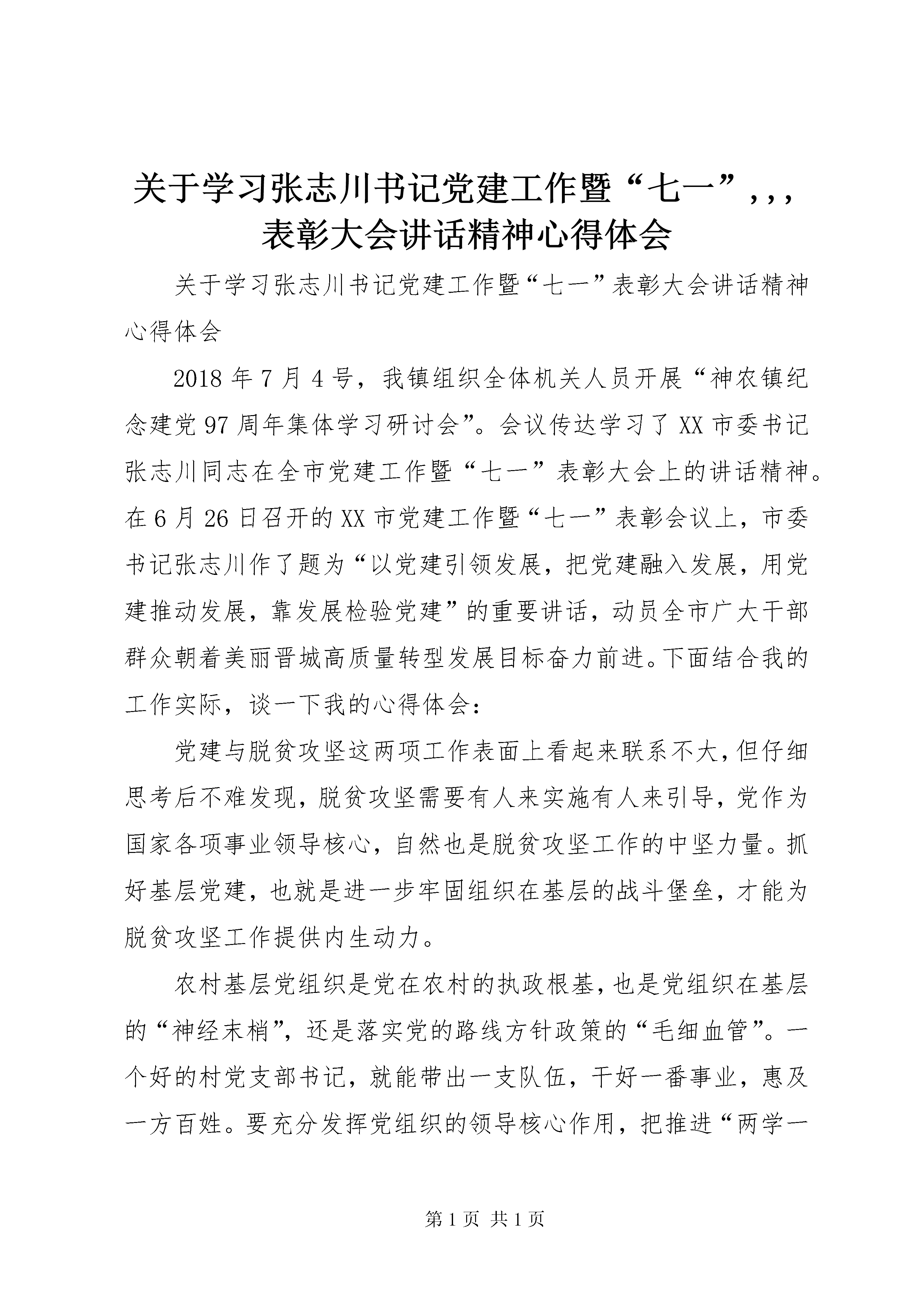 关于学习张志川书记党建工作暨“七一”,,,表彰大会讲话精神心得体会关于学习张志川书记党建工作暨“七一”表彰大会讲话精神心得体会2018年7月4号,我镇组织全体机关人员开展“神农镇纪念建党97周年集体学习研讨会”。会议传达学习了XX市委书记张志川同志在全市党建工作暨“七一”表彰大会上的讲话精神。在6月26日召开的XX市党建工作暨“七一”表彰会议上,市委书记张志川作了题为“以党建引领发展,把党建融入发展,用党建推动发展,靠发展检验党建”的重要讲话,动员全市广大干部群众朝着美丽晋城高质量转型发展目标奋力前进。下面结合我的工作实际,谈一下我的心得体会:党建与脱贫攻坚这两项工作表面上看起来联系不大,但仔细思考后不难发现,脱贫攻坚需要有人来实施有人来引导,党作为国家各项事业领导核心,自然也是脱贫攻坚工作的中坚力量。抓好基层党建,也就是进一步牢固组织在基层的战斗堡垒,才能为脱贫攻坚工作提供内生动力。农村基层党组织是党在农村的执政根基,也是党组织在基层的“神经末梢”,还是落实党的路线方针政策的“毛细血管”。一个好的村党支部书记,就能带出一支队伍,干好一番事业,惠及一方百姓。要充分发挥党组织的领导核心作用,把推进“两学一做”学习教育常态化制度化,同脱贫攻坚结合起来,坚持问题导向、注重实践效果,把党的一切工作落实到支部,选优配强村党组织带头人,使基层党组织成为脱贫攻坚的坚强战斗堡垒。打赢脱贫攻坚战,需要广大党员“唱主角、当先锋、做模范”。党员干部要把贫困群众当亲人,把老百姓的脱贫事当做自家的事。“第一书记”和驻村工作队员要“真蹲实驻、真帮实扶”,带头落实政策,带头发展致富,带头攻坚拔寨,落实结对帮扶责任,传递好脱贫攻坚的正能量。要把能带头致富和带领群众致富的农村能人党员聚集起来,作为选拔村级后备干部培养,切实提升精准帮扶的质量与效益。党员要在扶贫攻坚中做表率、显身手,提高帮扶精准度,才能站稳扶贫一线,拔掉贫困钉子,为精准扶贫、全面脱贫带好头、指好路。目前我镇289户贫困户中已经有90%顺利脱贫,省级贫困村西坡上村2018年也已摘帽。接下来我们依然要和广大党员干部一起,凝心聚力,共同解决剩余这一小部分人的脱贫问题,把握好“精准”二字,对未脱贫户制定“一户一策”,采取针对性的脱贫措施。对已经脱贫的贫困户建立长效帮扶机制,提供稳定增收渠道,巩固提升,实现长久脱贫不返贫的目标。同时要对贫困户进行精神扶贫,培育内生动力。利用开展讲座、集中培训等方式,推广精准扶贫、驻村帮扶等典型经验,宣传贫困户激发内生动力战胜贫困的先进事迹,扶贫与扶志、扶智和扶德相结合,增强我镇广大干部群众打赢脱贫攻坚战的决心和信心。我认为,我们作为一名乡镇的党员干部,要时刻以习近平新时代中国特色社会主义思想为指导,认真学习领会习近平主席视察山西重要讲话精神的核心要义和精神实质,切实把学习成果转化为自己开展工作的科学思路和务实举措。要聚焦工作中的重点难点问题,主动思考。不断创新工作方法,全面提高工作水平,把习总书记的讲话精神认真落实到我们的基层工作中。