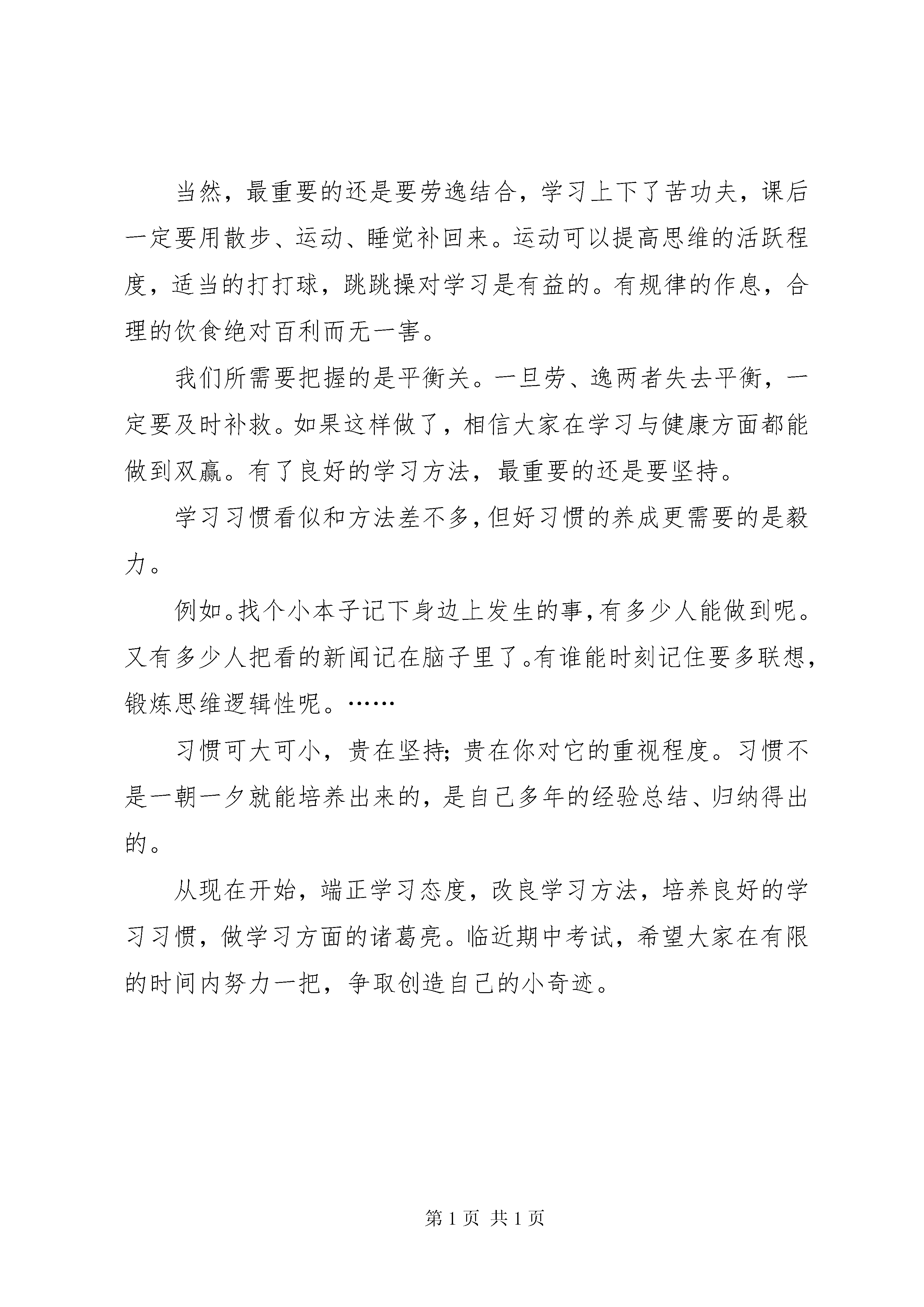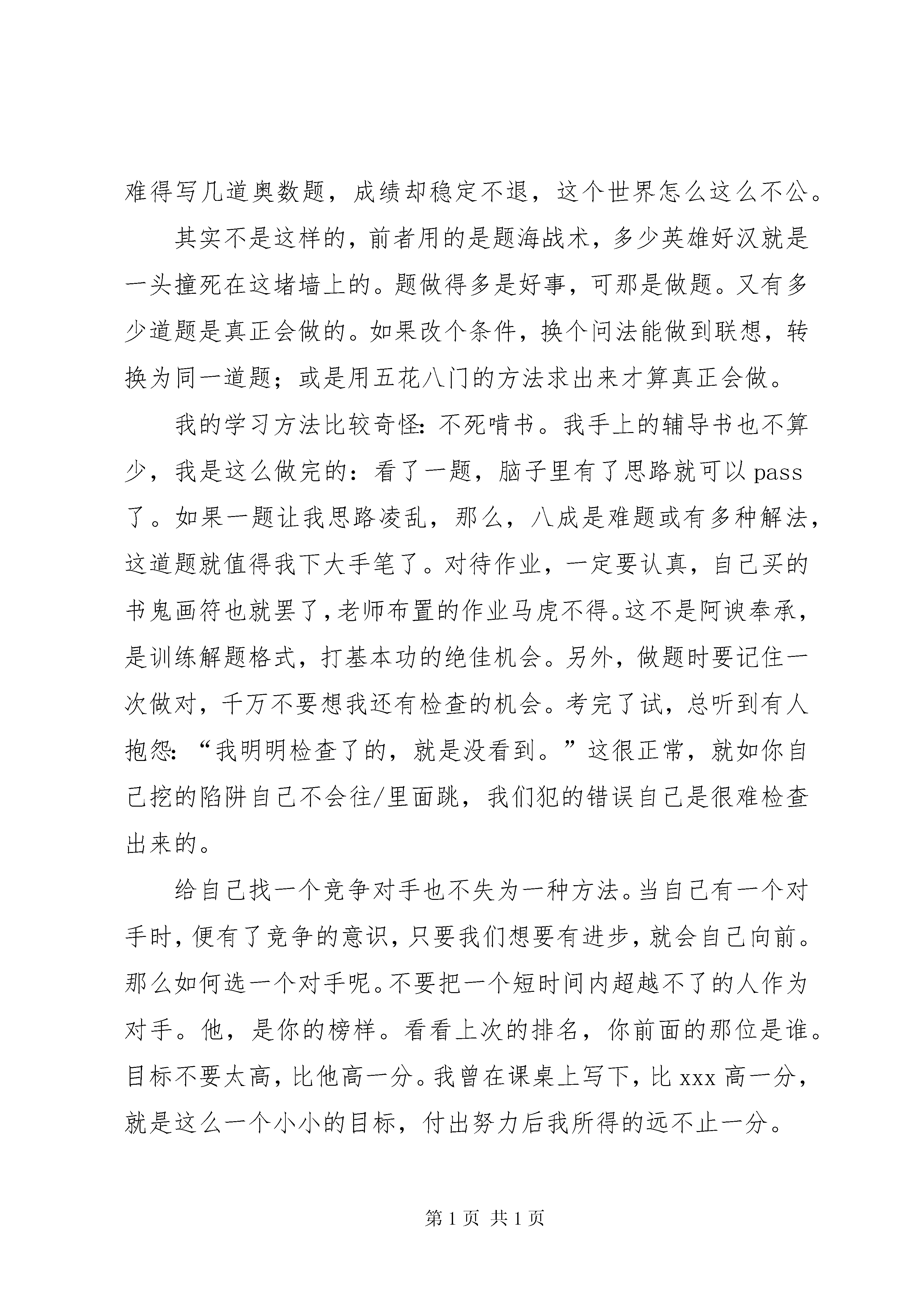 关于学习态度演讲稿演讲稿也叫演讲词,它是在较为隆重的仪式上和某些公众场合发表的讲话文稿。演讲稿是进行演讲的依据,是对演讲内容和形式的规范和提示,它体现着演讲的目的和手段。演讲稿是人们在工作和社会生活中经常使用的一种文体。下面是,请参考。1学习态度演讲稿各位家长。你们好,今天我演讲的题目是《态度决定一切》。中学时代是人生的春天,是青少年长身体、长知识、形成人生观的一个十分重要的阶段。但在此学习阶段,却有一部分学生对学习感觉到很吃力。因此,明确为什么学习,怎样学习,是每一个中学生必须认识和学会的问题。知识的学习,单靠认真听讲、死记硬背是不行的。相传有一个人巧遇一位仙翁,仙翁点石成金送给他,但他不要金子,而要仙翁点石成金的指头。这个人为什么要指头呢。因为他懂得,不管送自己多少金子,金子总是有限的,但如果有了点石成金的指头,那就可以随心所欲了。古人说:“受之以鱼,只供一饭之需,教人已渔,则终身受用无穷”,也就是这个道理。学习方法是学习时采用的手段、方式和途径。学法是在学习过程中产生和运用的。掌握良好的方法是很重要的事,但又不是一件容易的事情,这需要付出艰苦的努力,需要持之以恒的精神。只有每天坚持不懈,日久天长,学习才可能成为自觉的行为,从而掌握学习的主动权。所以,学习方法,并没有什么捷径,它只是踏踏实实、刻苦学习的程序以及在这个学习过程中的各项具体措施。“凡事预则立,不预则废。”智力相同的两个学生有无学习计划,直接影响到学习效果。科学的利用时间,在有限的时间内有计划的学习,这是科学学习方法的一条重要原则。态度决定一切。只有热爱学习,树立正确的学习态度,一步一个脚印,你才会有收获。我的演讲完毕,谢谢大家。2学习态度的演讲稿为什么一上学父母就说。“要用心学习,好好学呢。”这指的就是学习态度。态度决定一切,只有端正了学习态度,我们才有资格学习。如果态度端正,就有毅力克制自己的玩心,有催促自己前进的动力。所以我们不妨来一次面壁思过,反思一下自己有无懈怠之时,投机取巧、偷工减料之处。及时矫正自己的学习态度是认真学习、用心学习的必要保证。端正态度之后,我们所要找的就是方法。一样的付出,却得到不同的成绩是什么原因呢。有的人学习刻苦,不容置疑,成天写写写,做做做,默默默。在一旁看着都觉得累,有的人上课听听,下课翻翻,写写作业,难得写几道奥数题,成绩却稳定不退,这个世界怎么这么不公。其实不是这样的,前者用的是题海战术,多少英雄好汉就是一头撞死在这堵墙上的。题做得多是好事,可那是做题。又有多少道题是真正会做的。如果改个条件,换个问法能做到联想,转换为同一道题;或是用五花八门的方法求出来才算真正会做。我的学习方法比较奇怪:不死啃书。我手上的辅导书也不算少,我是这么做完的:看了一题,脑子里有了思路就可以pass了。如果一题让我思路凌乱,那么,八成是难题或有多种解法,这道题就值得我下大手笔了。对待作业,一定要认真,自己买的书鬼画符也就罢了,老师布置的作业马虎不得。这不是阿谀奉承,是训练解题格式,打基本功的绝佳机会。另外,做题时要记住一次做对,千万不要想我还有检查的机会。考完了试,总听到有人抱怨:“我明明检查了的,就是没看到。”这很正常,就如你自己挖的陷阱自己不会往/里面跳,我们犯的错误自己是很难检查出来的。给自己找一个竞争对手也不失为一种方法。当自己有一个对手时,便有了竞争的意识,只要我们想要有进步,就会自己向前。那么如何选一个对手呢。不要把一个短时间内超越不了的人作为对手。他,是你的榜样。看看上次的排名,你前面的那位是谁。目标不要太高,比他高一分。我曾在课桌上写下,比xxx高一分,就是这么一个小小的目标,付出努力后我所得的远不止一分。当然,最重要的还是要劳逸结合,学习上下了苦功夫,课后一定要用散步、运动、睡觉补回来。运动可以提高思维的活跃程度,适当的打打球,跳跳操对学习是有益的。有规律的作息,合理的饮食绝对百利而无一害。我们所需要把握的是平衡关。一旦劳、逸两者失去平衡,一定要及时补救。如果这样做了,相信大家在学习与健康方面都能做到双赢。有了良好的学习方法,最重要的还是要坚持。学习习惯看似和方法差不多,但好习惯的养成更需要的是毅力。例如。找个小本子记下身边上发生的事,有多少人能做到呢。又有多少人把看的新闻记在脑子里了。有谁能时刻记住要多联想,锻炼思维逻辑性呢。……习惯可大可小,贵在坚持;贵在你对它的重视程度。习惯不是一朝一夕就能培养出来的,是自己多年的经验总结、归纳得出的。从现在开始,端正学习态度,改良学习方法,培养良好的学习习惯,做学习方面的诸葛亮。临近期中考试,希望大家在有限的时间内努力一把,争取创造自己的小奇迹。