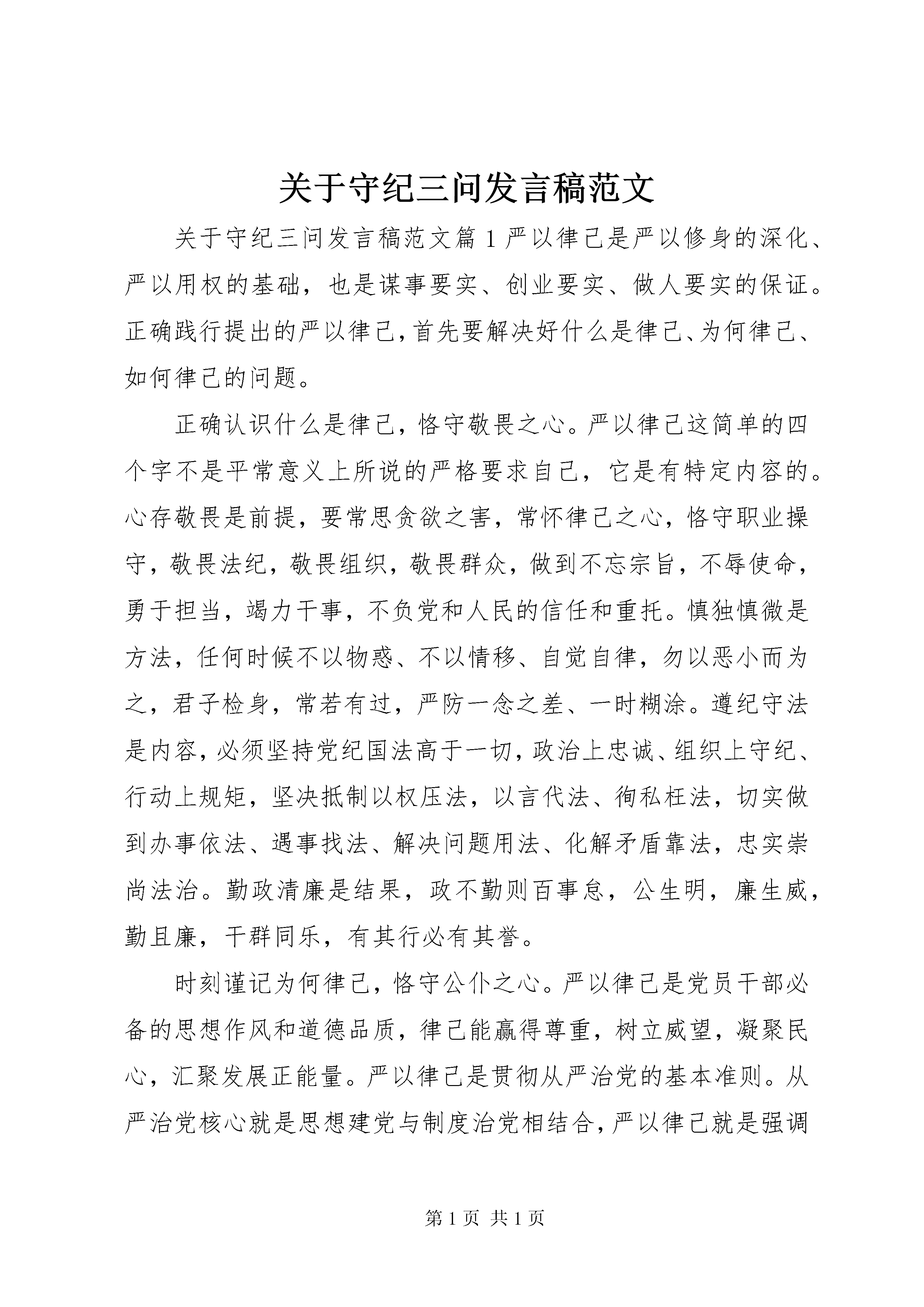 关于守纪三问发言稿范文关于守纪三问发言稿范文篇1严以律己是严以修身的深化、严以用权的基础,也是谋事要实、创业要实、做人要实的保证。正确践行提出的严以律己,首先要解决好什么是律己、为何律己、如何律己的问题。正确认识什么是律己,恪守敬畏之心。严以律己这简单的四个字不是平常意义上所说的严格要求自己,它是有特定内容的。心存敬畏是前提,要常思贪欲之害,常怀律己之心,恪守职业操守,敬畏法纪,敬畏组织,敬畏群众,做到不忘宗旨,不辱使命,勇于担当,竭力干事,不负党和人民的信任和重托。慎独慎微是方法,任何时候不以物惑、不以情移、自觉自律,勿以恶小而为之,君子检身,常若有过,严防一念之差、一时糊涂。遵纪守法是内容,必须坚持党纪国法高于一切,政治上忠诚、组织上守纪、行动上规矩,坚决抵制以权压法,以言代法、徇私枉法,切实做到办事依法、遇事找法、解决问题用法、化解矛盾靠法,忠实崇尚法治。勤政清廉是结果,政不勤则百事怠,公生明,廉生威,勤且廉,干群同乐,有其行必有其誉。时刻谨记为何律己,恪守公仆之心。严以律己是党员干部必备的思想作风和道德品质,律己能赢得尊重,树立威望,凝聚民心,汇聚发展正能量。严以律己是贯彻从严治党的基本准则。从严治党核心就是思想建党与制度治党相结合,严以律己就是强调通过严格要求自己,解决内在自觉性的问题,达到高度自觉地执行制度,取得事半功倍的效果。严以律己是落实作风建设的内在要求。党员干部必须慎独慎微、勤于自省,用高标准用严以律己对照自己,提高自律意识,做到崇廉尚实、正人先正己,进而改变在群众心目中的形象,赢得群众的信任。严以律己是领导干部的安身立命之本。全面建成小康社会的过程中存在一系列需要克服的困难,解决这些困难,党员干部必须调动内在的自觉性,让在自己的岗位上严格要求自己,自我锻炼,自我净化,自我提高。准确把握如何律己,恪守为民之心。落马官员无一不是从律己不严、放松自我要求、放纵个人欲望开始的。党员领导干部必须严以律己,方能做到事前事后都能守住规矩、何时何地都能挡住诱惑,才能坚守道德防线,永葆政治本色。一是政治上守纪律讲规矩,在思想上政治上行动上与以同志为的党中央保持高度一致,坚决杜绝七个有之,做到五个必须、五个决不允许,自觉服从组织的领导,无条件遵守党的纪律,把心思花在干事创业上。二是工作上强化担当意识,把严以律己体现到善谋事、会干事、干成事的职业素养中,对工作不敷衍、对难题不回避、对责任不推卸,做到对事业尽心、对工作尽力、对岗位尽职,争创一流的工作业绩。三是为民服务上,始终牢记自己是人民的公仆,把群众期盼作为第一目标,坚持群众观点,践行群众路线,主动深入基层,多接地气,问政于民、问需于民、问计于民,切实在服务群众实践中取信于民,赢得民心。四是在廉政上强化自律意识,抵制和防止各种不良影响和诱惑,正确对待名节,用好手中权力,理性看待亲情,培养健康的兴趣爱好,自觉远离各种小圈子,树立党员干部的良好形象。关于守纪三问发言稿范文篇2大干一百天、环境大扫除专项整治行动以来,一批干部受到严重警告、警告,记过以及免职、停职检查、通报批评、告诫等不同程度的问责处理,引起了广泛关注,产生了积极影响,被誉为南京史上最严厉的问责。然而,随着问责力度的不断加大,一些疑惑也不断产生,概之有三问,须逐一厘清,统一认识。一问,以前问责都是纪委在抓,现在怎么成了各区的事。这样的疑问是可以理解的。确实,这次实施问责的主体不是纪委,而是各区和相关部门。可以说纪委是有所为,又有所不为。整治活动一开始,市纪委就出台了《关于全市纪检监察机关在大干一百天、环境大扫除行动中加强监督执纪强化纪律保障的意见》,但从内容以及实施的实际情况看,与以往明显不同,这次市纪检监察机关不是直接问责,而是监督问责,是监督、协调、指导各区和相关部门实施问责。如果市纪委要直接启动问责,那一定不是问责街道一级,而是问责各区和部门的市管责任领导。这样纪检监察机关在抓党员干部改进作风、勤政廉政中,既充分发挥了监督作用,突出了主职主业,又不越俎代庖,干了各区和政府部门该干的事。同时,这样也可以使问责更加规范化、程序化、常态化。至于有的说都是纪委让干的,我们也是没办法,理性分析,不难看出里面有点推脱的因素。二问,被问责的怎么那么多,是不是逮着谁问责谁。这次整治行动开展以来,被问责的人数已有104名,可谓面广量大,一般每隔一天就有一个区被问责的问题和人员见诸媒体。但这绝不是问责大比拼、大竞赛。问责的前提是问题存在,如果说被问责的人数多,那是因为存在的问题多。这次百日整治行动,可以说是对存在问题的大起底,本身就是对存在问题的大扫除。正是因为过去一些职能部门,对有些长期存在的问题,视而不见,见而不管,管而不力,造成了问题的扎堆。而在这样大的行动和决心之下,难道对一些就发生在自己眼皮子底