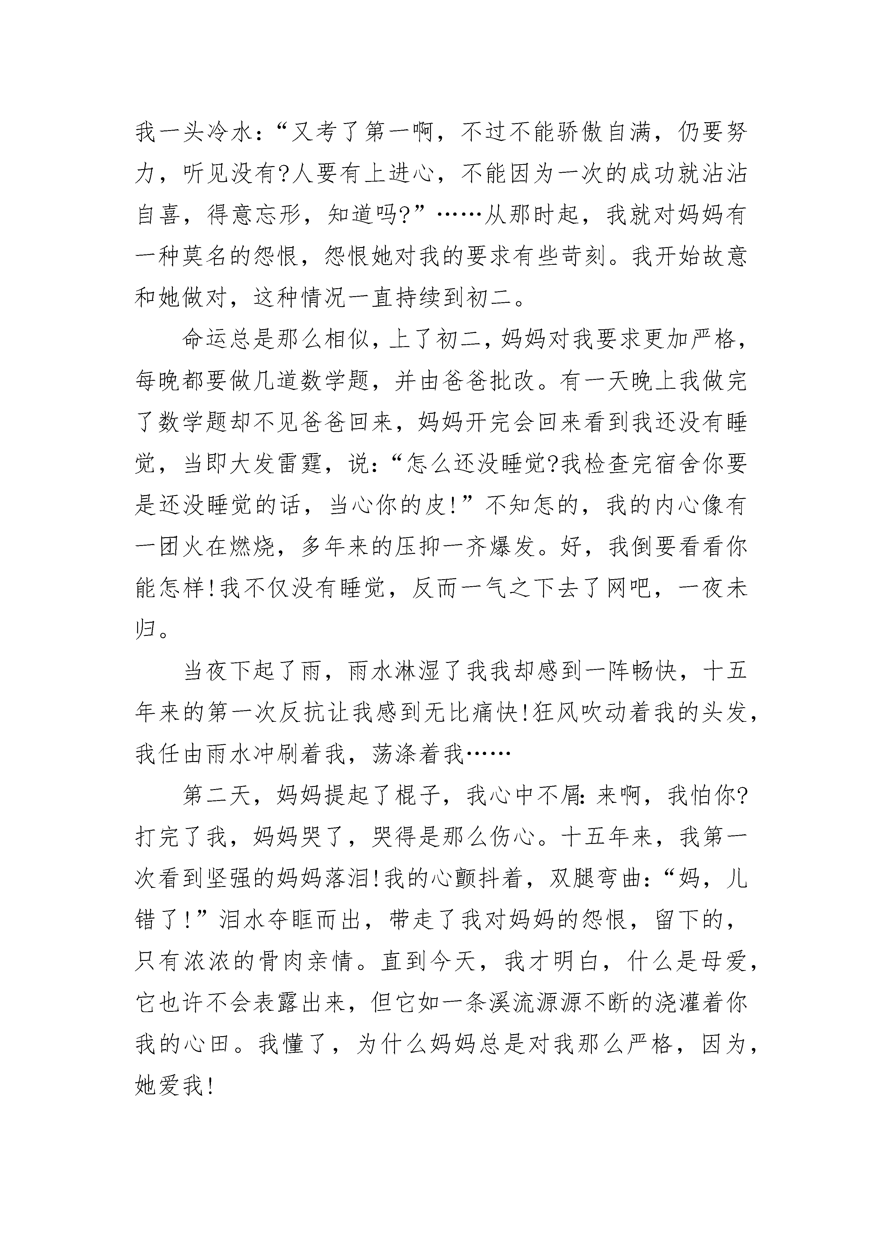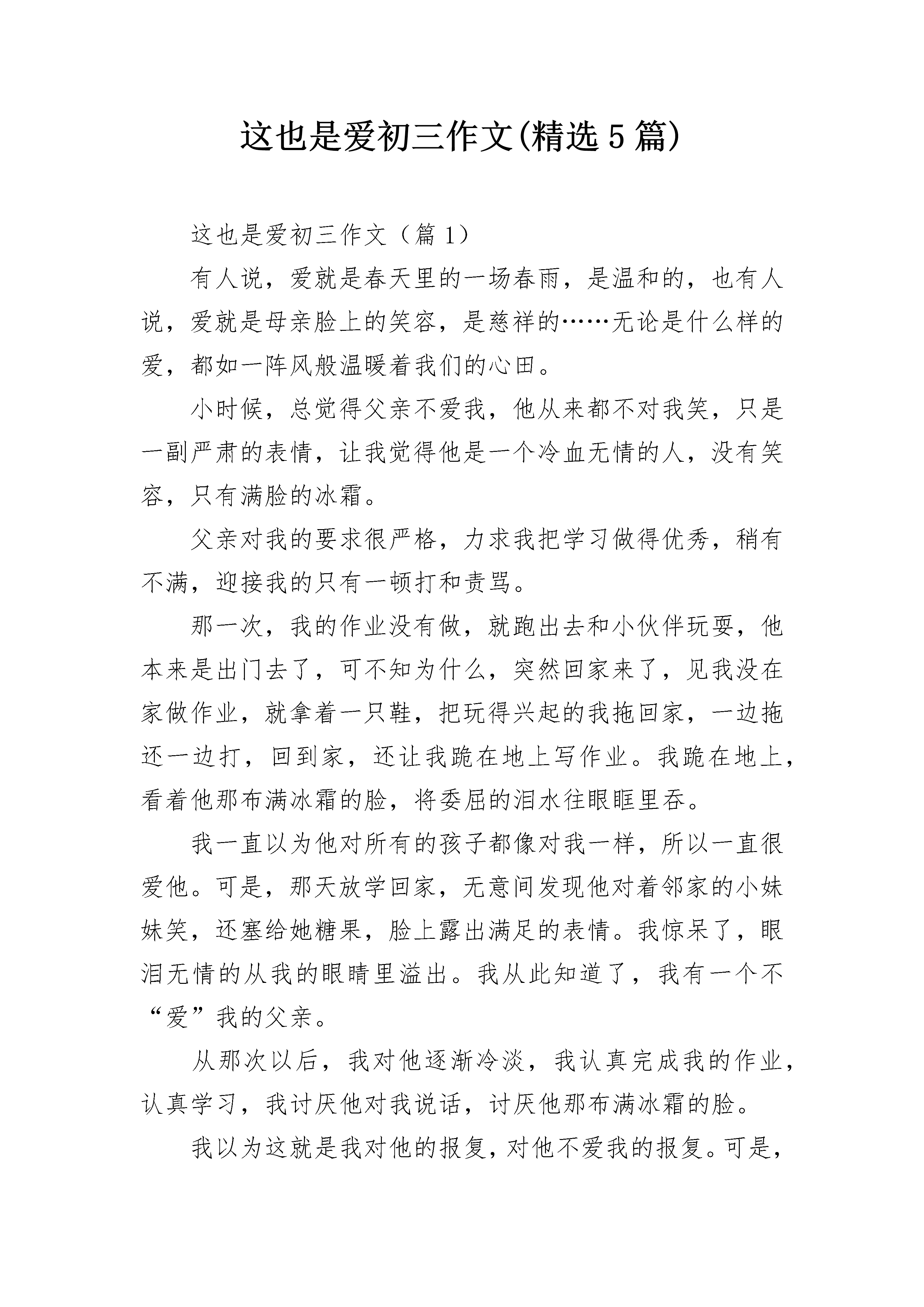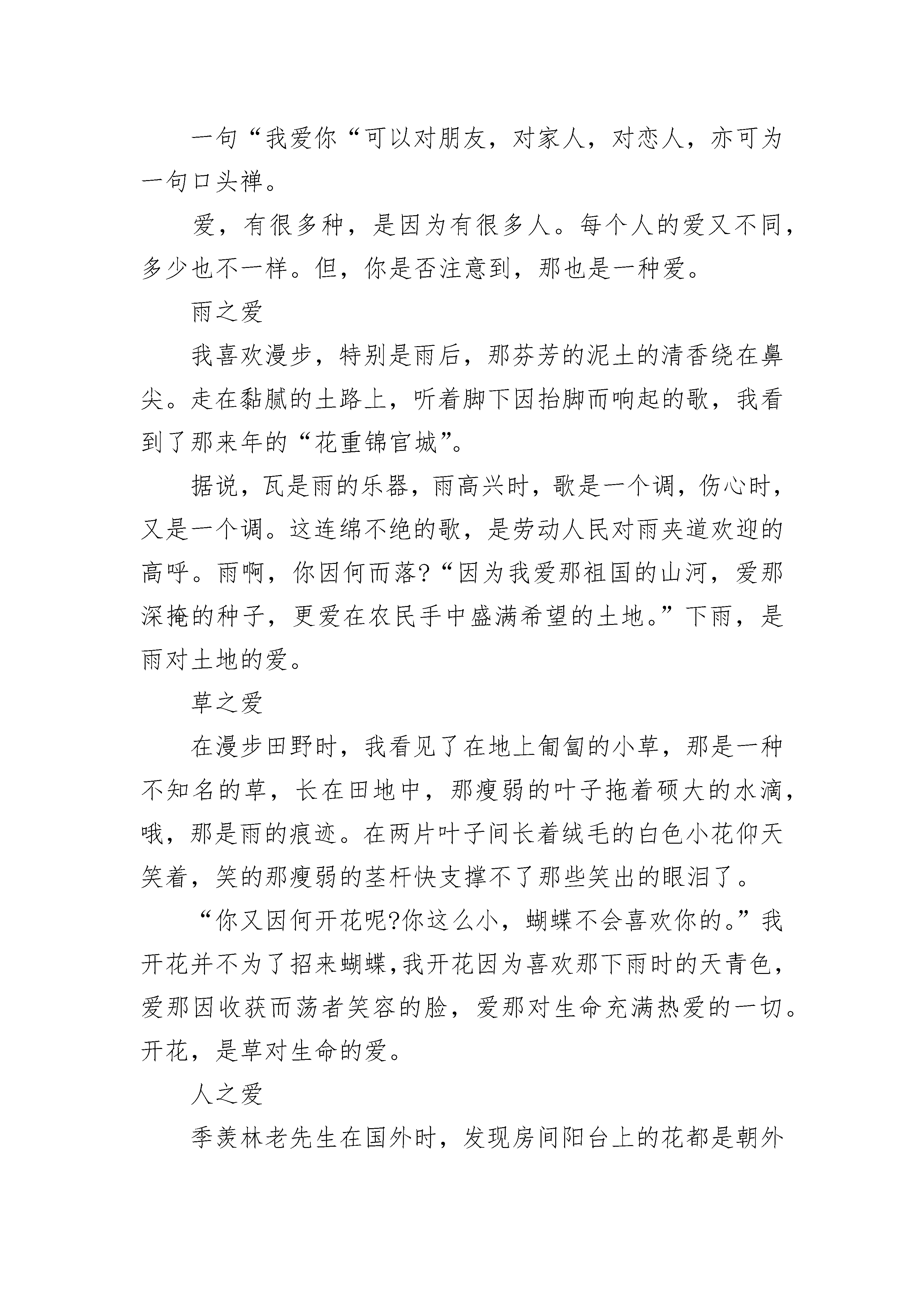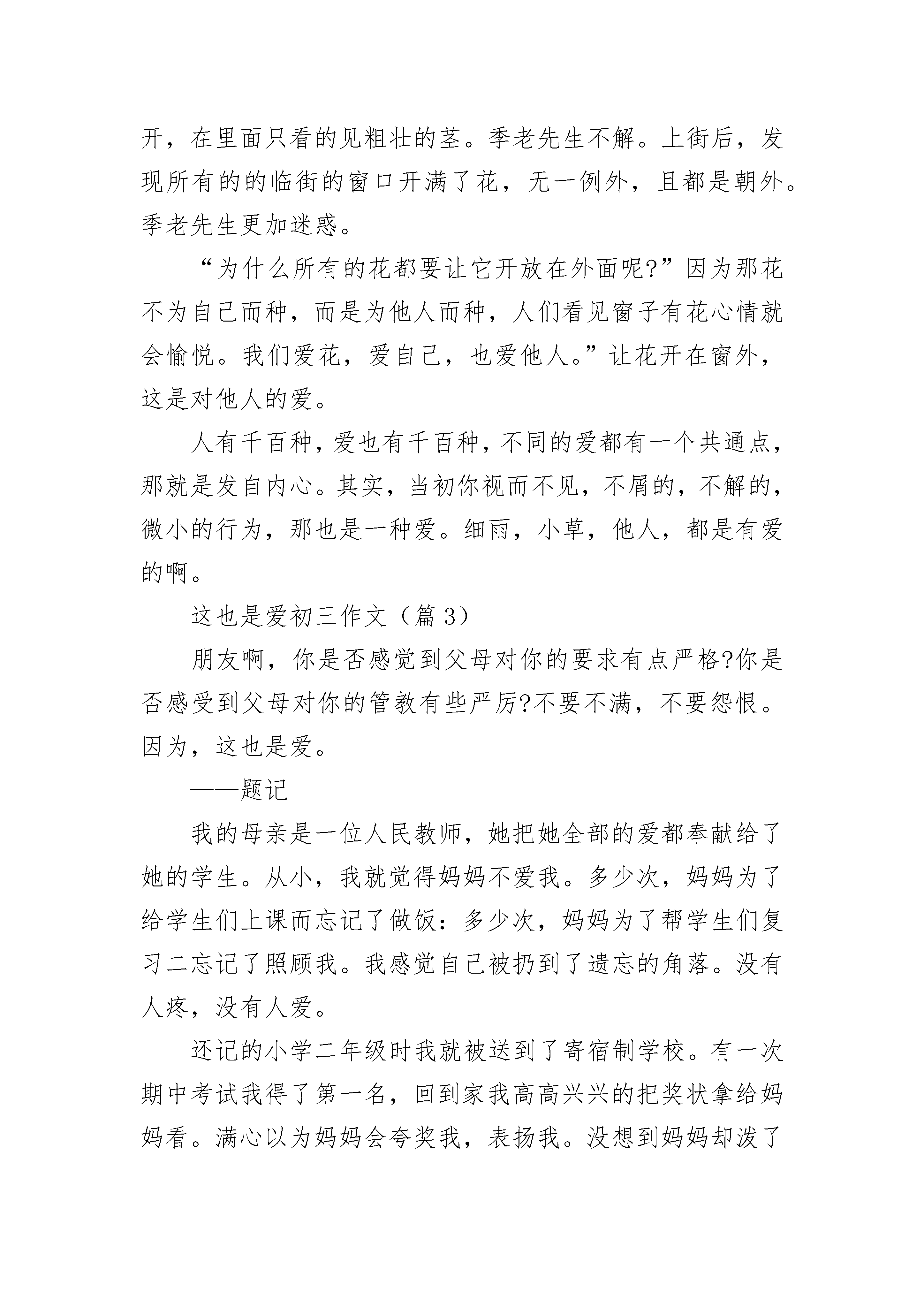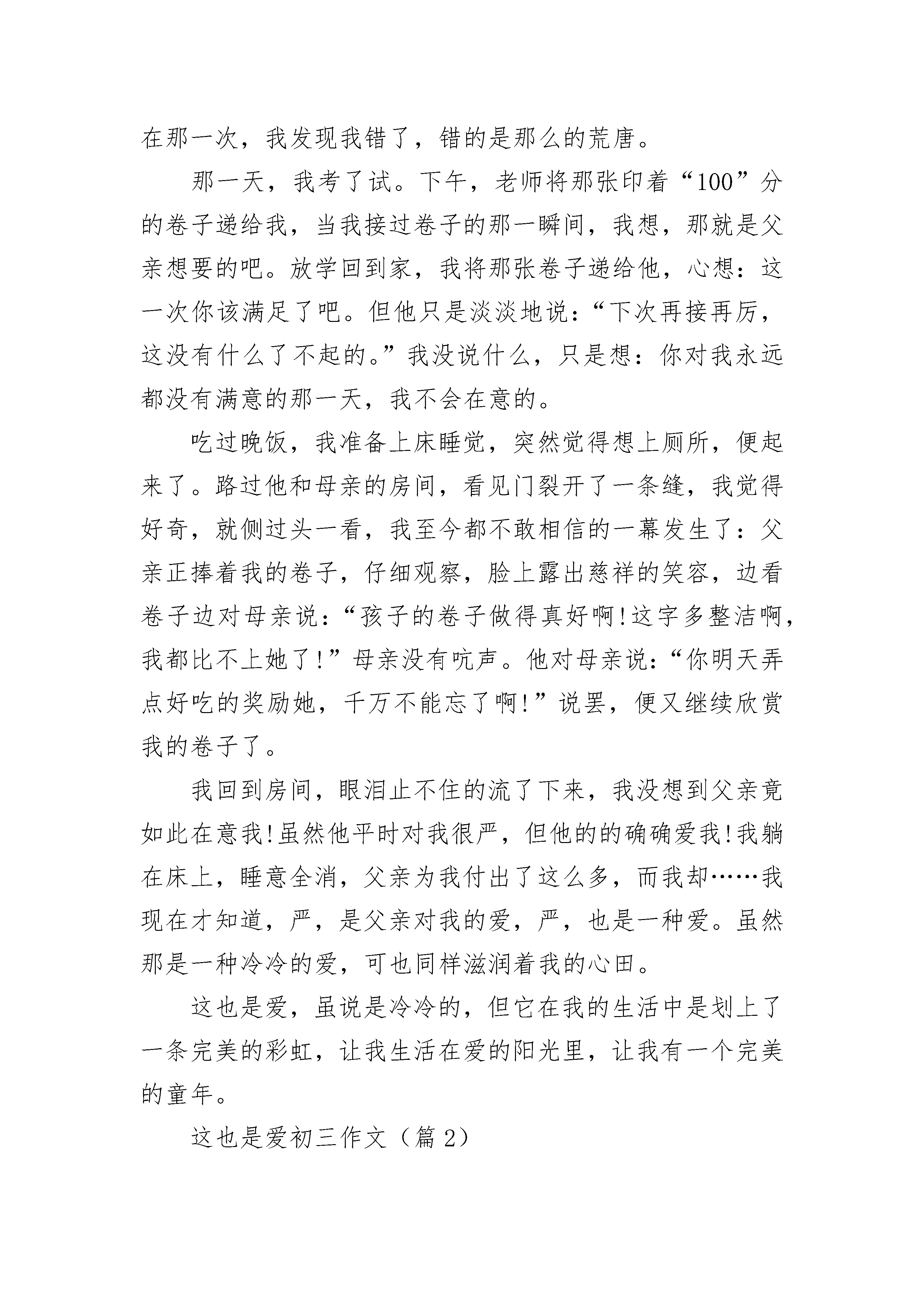 这也是爱初三作文(精选5篇)这也是爱初三作文(篇1)有人说,爱就是春天里的一场春雨,是温和的,也有人说,爱就是母亲脸上的笑容,是慈祥的……无论是什么样的爱,都如一阵风般温暖着我们的心田。小时候,总觉得父亲不爱我,他从来都不对我笑,只是一副严肃的表情,让我觉得他是一个冷血无情的人,没有笑容,只有满脸的冰霜。父亲对我的要求很严格,力求我把学习做得优秀,稍有不满,迎接我的只有一顿打和责骂。那一次,我的作业没有做,就跑出去和小伙伴玩耍,他本来是出门去了,可不知为什么,突然回家来了,见我没在家做作业,就拿着一只鞋,把玩得兴起的我拖回家,一边拖还一边打,回到家,还让我跪在地上写作业。我跪在地上,看着他那布满冰霜的脸,将委屈的泪水往眼眶里吞。我一直以为他对所有的孩子都像对我一样,所以一直很爱他。可是,那天放学回家,无意间发现他对着邻家的小妹妹笑,还塞给她糖果,脸上露出满足的表情。我惊呆了,眼泪无情的从我的眼睛里溢出。我从此知道了,我有一个不“爱”我的父亲。从那次以后,我对他逐渐冷淡,我认真完成我的作业,认真学习,我讨厌他对我说话,讨厌他那布满冰霜的脸。我以为这就是我对他的报复,对他不爱我的报复。可是,在那一次,我发现我错了,错的是那么的荒唐。那一天,我考了试。下午,老师将那张印着“100”分的卷子递给我,当我接过卷子的那一瞬间,我想,那就是父亲想要的吧。放学回到家,我将那张卷子递给他,心想:这一次你该满足了吧。但他只是淡淡地说:“下次再接再厉,这没有什么了不起的。”我没说什么,只是想:你对我永远都没有满意的那一天,我不会在意的。吃过晚饭,我准备上床睡觉,突然觉得想上厕所,便起来了。路过他和母亲的房间,看见门裂开了一条缝,我觉得好奇,就侧过头一看,我至今都不敢相信的一幕发生了:父亲正捧着我的卷子,仔细观察,脸上露出慈祥的笑容,边看卷子边对母亲说:“孩子的卷子做得真好啊!这字多整洁啊,我都比不上她了!”母亲没有吭声。他对母亲说:“你明天弄点好吃的奖励她,千万不能忘了啊!”说罢,便又继续欣赏我的卷子了。我回到房间,眼泪止不住的流了下来,我没想到父亲竟如此在意我!虽然他平时对我很严,但他的的确确爱我!我躺在床上,睡意全消,父亲为我付出了这么多,而我却……我现在才知道,严,是父亲对我的爱,严,也是一种爱。虽然那是一种冷冷的爱,可也同样滋润着我的心田。这也是爱,虽说是冷冷的,但它在我的生活中是划上了一条完美的彩虹,让我生活在爱的阳光里,让我有一个完美的童年。这也是爱初三作文(篇2)一句“我爱你“可以对朋友,对家人,对恋人,亦可为一句口头禅。爱,有很多种,是因为有很多人。每个人的爱又不同,多少也不一样。但,你是否注意到,那也是一种爱。雨之爱我喜欢漫步,特别是雨后,那芬芳的泥土的清香绕在鼻尖。走在黏腻的土路上,听着脚下因抬脚而响起的歌,我看到了那来年的“花重锦官城”。据说,瓦是雨的乐器,雨高兴时,歌是一个调,伤心时,又是一个调。这连绵不绝的歌,是劳动人民对雨夹道欢迎的高呼。雨啊,你因何而落?“因为我爱那祖国的山河,爱那深掩的种子,更爱在农民手中盛满希望的土地。”下雨,是雨对土地的爱。草之爱在漫步田野时,我看见了在地上匍匐的小草,那是一种不知名的草,长在田地中,那瘦弱的叶子拖着硕大的水滴,哦,那是雨的痕迹。在两片叶子间长着绒毛的白色小花仰天笑着,笑的那瘦弱的茎杆快支撑不了那些笑出的眼泪了。“你又因何开花呢?你这么小,蝴蝶不会喜欢你的。”我开花并不为了招来蝴蝶,我开花因为喜欢那下雨时的天青色,爱那因收获而荡者笑容的脸,爱那对生命充满热爱的一切。开花,是草对生命的爱。人之爱季羡林老先生在国外时,发现房间阳台上的花都是朝外开,在里面只看的见粗壮的茎。季老先生不解。上街后,发现所有的的临街的窗口开满了花,无一例外,且都是朝外。季老先生更加迷惑。“为什么所有的花都要让它开放在外面呢?”因为那花不为自己而种,而是为他人而种,人们看见窗子有花心情就会愉悦。我们爱花,爱自己,也爱他人。”让花开在窗外,这是对他人的爱。人有千百种,爱也有千百种,不同的爱都有一个共通点,那就是发自内心。其实,当初你视而不见,不屑的,不解的,微小的行为,那也是一种爱。细雨,小草,他人,都是有爱的啊。这也是爱初三作文(篇3)朋友啊,你是否感觉到父母对你的要求有点严格?你是否感受到父母对你的管教有些严厉?不要不满,不要怨恨。因为,这也是爱。——题记我的母亲是一位人民教师,她把她全部的爱都奉献给了她的学生。从小,我就觉得妈妈不爱我。多少次,妈妈为了给学生们上课而忘记了做饭:多少次,妈妈为了帮学生们复习二忘记了照顾我。我感觉自己被扔到了遗忘的角落。没有人疼,没有人爱。还记的小学二年级时我就被送到了寄宿制学校。有一次期中考试我得了第一名,回到家我高高兴兴的把奖状拿给妈妈看。满心以为妈妈会夸奖我,表扬我。