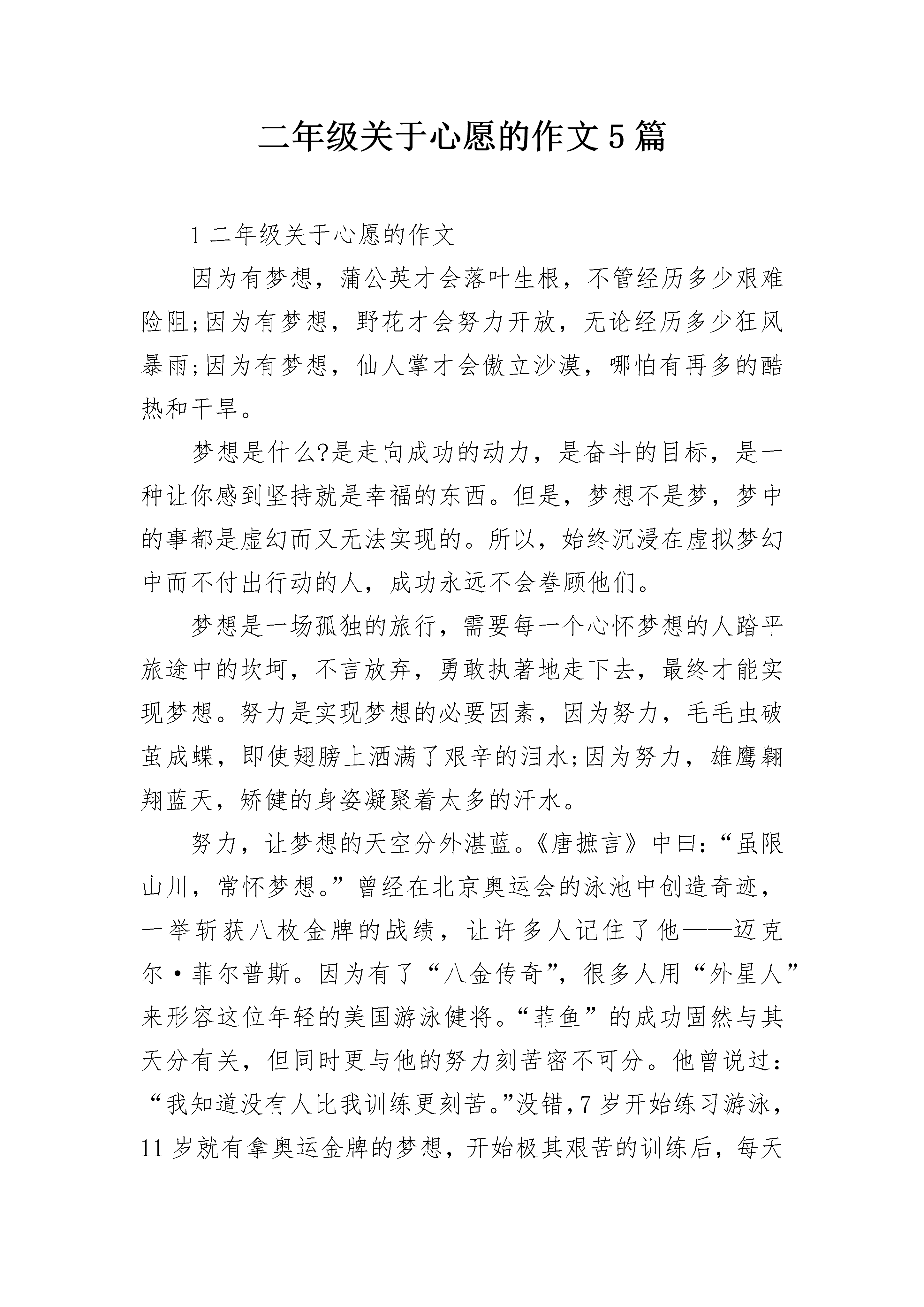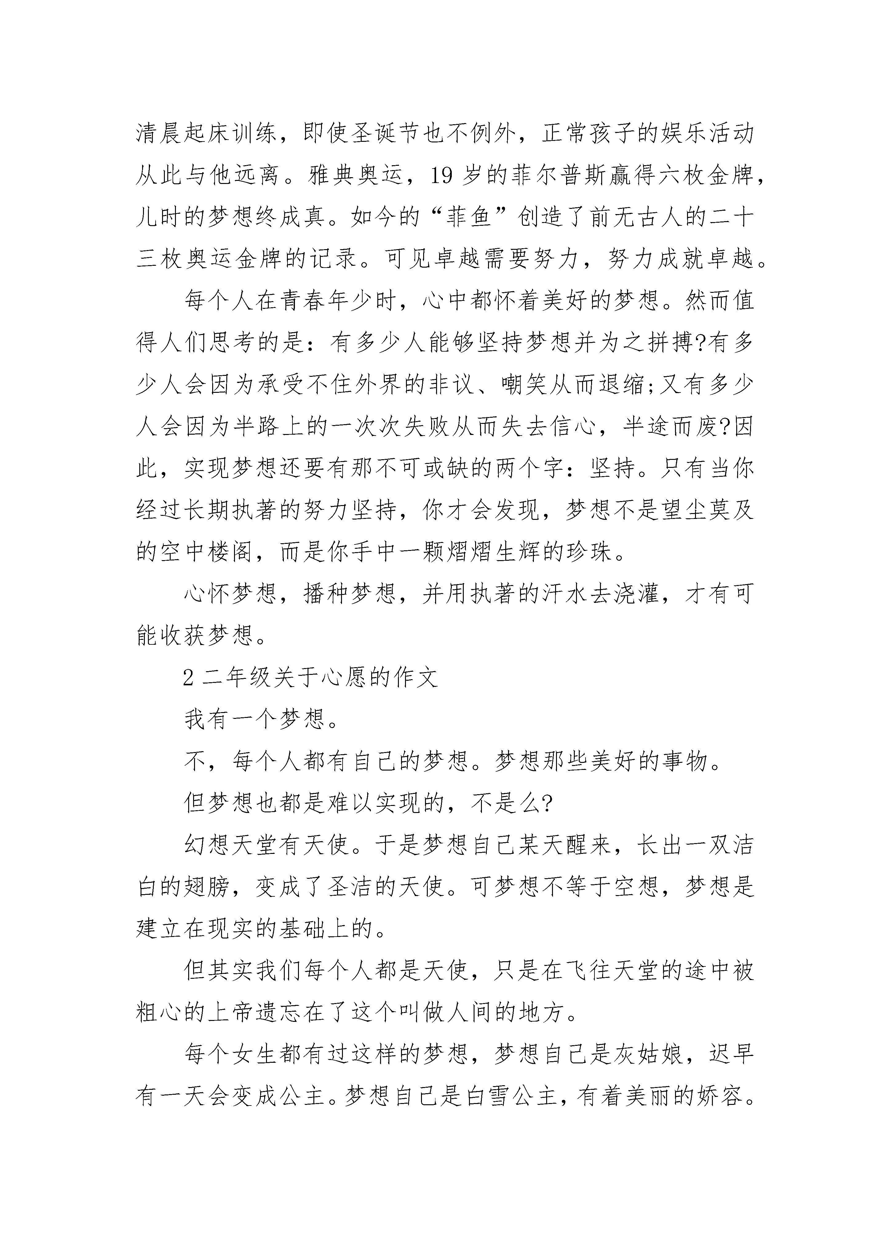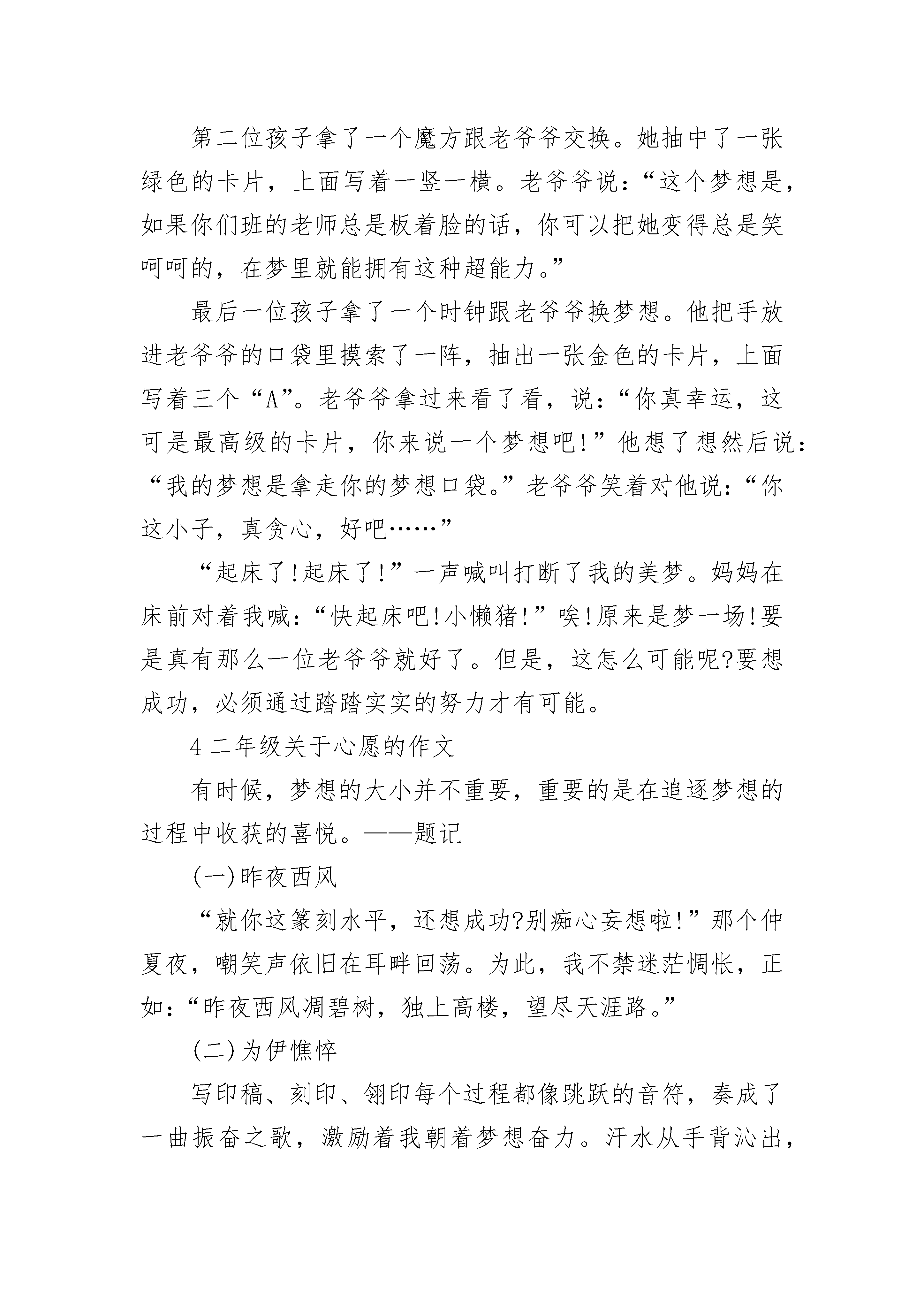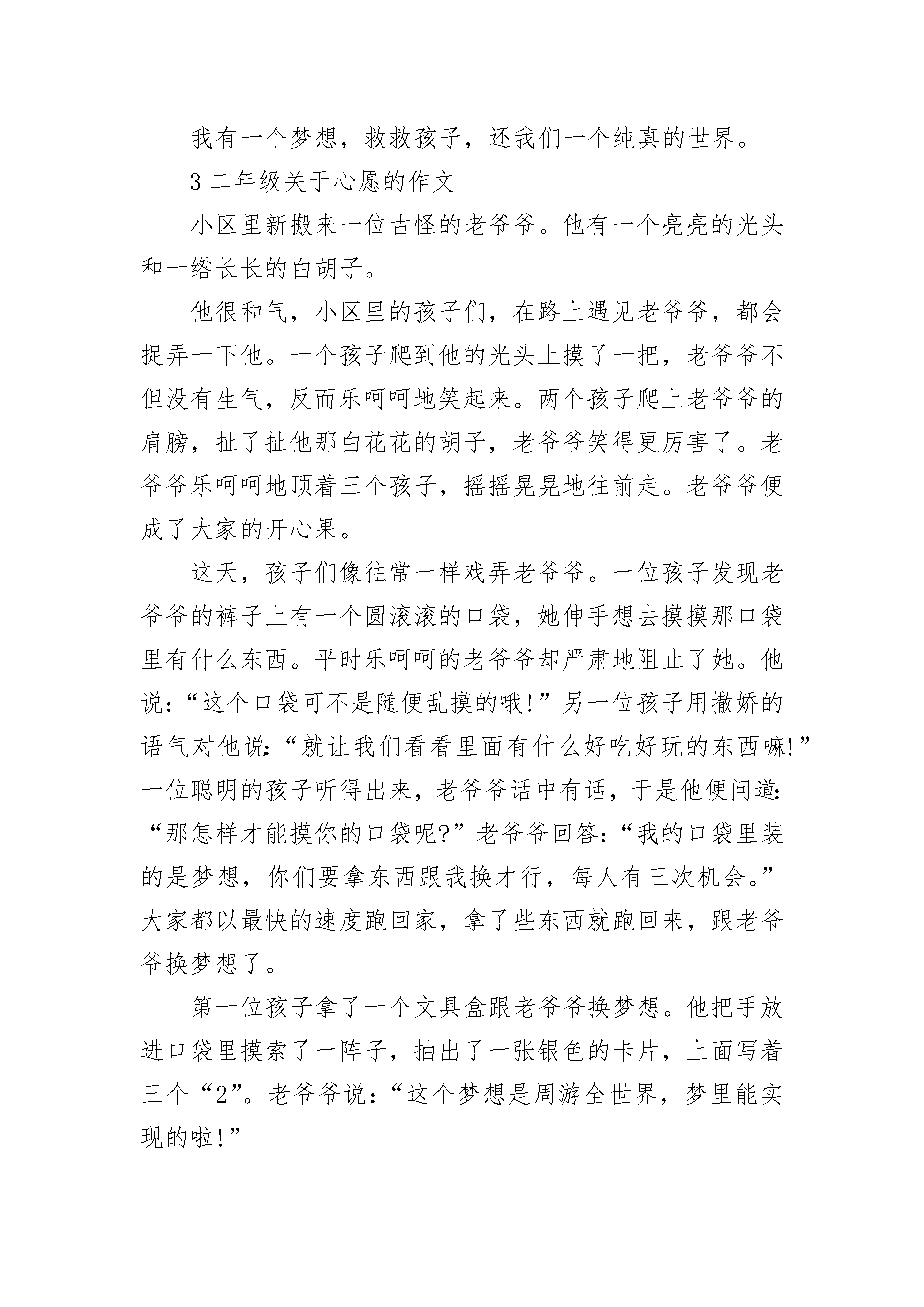 二年级关于心愿的作文5篇1二年级关于心愿的作文因为有梦想,蒲公英才会落叶生根,不管经历多少艰难险阻;因为有梦想,野花才会努力开放,无论经历多少狂风暴雨;因为有梦想,仙人掌才会傲立沙漠,哪怕有再多的酷热和干旱。梦想是什么?是走向成功的动力,是奋斗的目标,是一种让你感到坚持就是幸福的东西。但是,梦想不是梦,梦中的事都是虚幻而又无法实现的。所以,始终沉浸在虚拟梦幻中而不付出行动的人,成功永远不会眷顾他们。梦想是一场孤独的旅行,需要每一个心怀梦想的人踏平旅途中的坎坷,不言放弃,勇敢执著地走下去,最终才能实现梦想。努力是实现梦想的必要因素,因为努力,毛毛虫破茧成蝶,即使翅膀上洒满了艰辛的泪水;因为努力,雄鹰翱翔蓝天,矫健的身姿凝聚着太多的汗水。努力,让梦想的天空分外湛蓝。《唐摭言》中曰:“虽限山川,常怀梦想。”曾经在北京奥运会的泳池中创造奇迹,一举斩获八枚金牌的战绩,让许多人记住了他——迈克尔·菲尔普斯。因为有了“八金传奇”,很多人用“外星人”来形容这位年轻的美国游泳健将。“菲鱼”的成功固然与其天分有关,但同时更与他的努力刻苦密不可分。他曾说过:“我知道没有人比我训练更刻苦。”没错,7岁开始练习游泳,11岁就有拿奥运金牌的梦想,开始极其艰苦的训练后,每天清晨起床训练,即使圣诞节也不例外,正常孩子的娱乐活动从此与他远离。雅典奥运,19岁的菲尔普斯赢得六枚金牌,儿时的梦想终成真。如今的“菲鱼”创造了前无古人的二十三枚奥运金牌的记录。可见卓越需要努力,努力成就卓越。每个人在青春年少时,心中都怀着美好的梦想。然而值得人们思考的是:有多少人能够坚持梦想并为之拼搏?有多少人会因为承受不住外界的非议、嘲笑从而退缩;又有多少人会因为半路上的一次次失败从而失去信心,半途而废?因此,实现梦想还要有那不可或缺的两个字:坚持。只有当你经过长期执著的努力坚持,你才会发现,梦想不是望尘莫及的空中楼阁,而是你手中一颗熠熠生辉的珍珠。心怀梦想,播种梦想,并用执著的汗水去浇灌,才有可能收获梦想。2二年级关于心愿的作文我有一个梦想。不,每个人都有自己的梦想。梦想那些美好的事物。但梦想也都是难以实现的,不是么?幻想天堂有天使。于是梦想自己某天醒来,长出一双洁白的翅膀,变成了圣洁的天使。可梦想不等于空想,梦想是建立在现实的基础上的。但其实我们每个人都是天使,只是在飞往天堂的途中被粗心的上帝遗忘在了这个叫做人间的地方。每个女生都有过这样的梦想,梦想自己是灰姑娘,迟早有一天会变成公主。梦想自己是白雪公主,有着美丽的娇容。梦想自己是海的女儿,为爱牺牲,无怨无悔。但,梦想并不等于空想。梦想,是建立在现实的基础上的。总是记得小时候整天满脑子的奇怪的想法,长大后却消失的无影无踪。唯一能让我们记起小时候的只能是在梦中吧。梦醒后,又要面对无聊复杂的世俗,面对否定我们的现实。徘徊在尘世中,看虚伪的人们戴着虚假的面具处理事情,就连刚涉世的小孩子也都被世俗污染,变得成熟,老练。所有脱离现实的梦想都被否定,没有了幻想,也不敢幻想,孩童们的想像力在被一点点扼杀,一切都被安排,一切,都只能遵循着古人遗留下的来思考,来运行。怀念过去的我们,一起骑单车回家,也慢慢骑过了我们的童年,幼年时代的美好却再也体会不到。每天重复着同样的动作,却仍有着不一样的乐趣。因为那时的我们,敢于幻想,我们会自己编织着自己的童年。突然发现现在一代不如一代,某天走在路上听到几个很小的孩子都在骂人,感慨当年的我们多么纯真,虽然当时科技并不发达,但却保留下孩子原有的童真与稚气。纵然现在科技高速发展,以前的那些乐趣却已消失不见,社会在变,我们也被影响,但影响最深的还是那群孩子。当世界逐渐改变的时候,我们也会潜移默化。真的希望能还给孩子们当孩子时应有的快乐,而不是那些本不属于他们的东西。当世界重新变得美好时,我希望能重新听到孩子们的笑声,能在他们身上看到我们当时的影子。我有一个梦想,救救孩子,还我们一个纯真的世界。3二年级关于心愿的作文小区里新搬来一位古怪的老爷爷。他有一个亮亮的光头和一绺长长的白胡子。他很和气,小区里的孩子们,在路上遇见老爷爷,都会捉弄一下他。一个孩子爬到他的光头上摸了一把,老爷爷不但没有生气,反而乐呵呵地笑起来。两个孩子爬上老爷爷的肩膀,扯了扯他那白花花的胡子,老爷爷笑得更厉害了。老爷爷乐呵呵地顶着三个孩子,摇摇晃晃地往前走。老爷爷便成了大家的开心果。这天,孩子们像往常一样戏弄老爷爷。一位孩子发现老爷爷的裤子上有一个圆滚滚的口袋,她伸手想去摸摸那口袋里有什么东西。平时乐呵呵的老爷爷却严肃地阻止了她。他说:“这个口袋可不是随便乱摸的哦!”另一位孩子用撒娇的语气对他说:“就让我们看看里面有什么好吃好玩的东西嘛!”一位聪明的孩子听得出来,老爷爷话中有话,于是他便问道:“那怎样才能摸你的口袋呢?”老爷爷回答:“我的口袋里装的