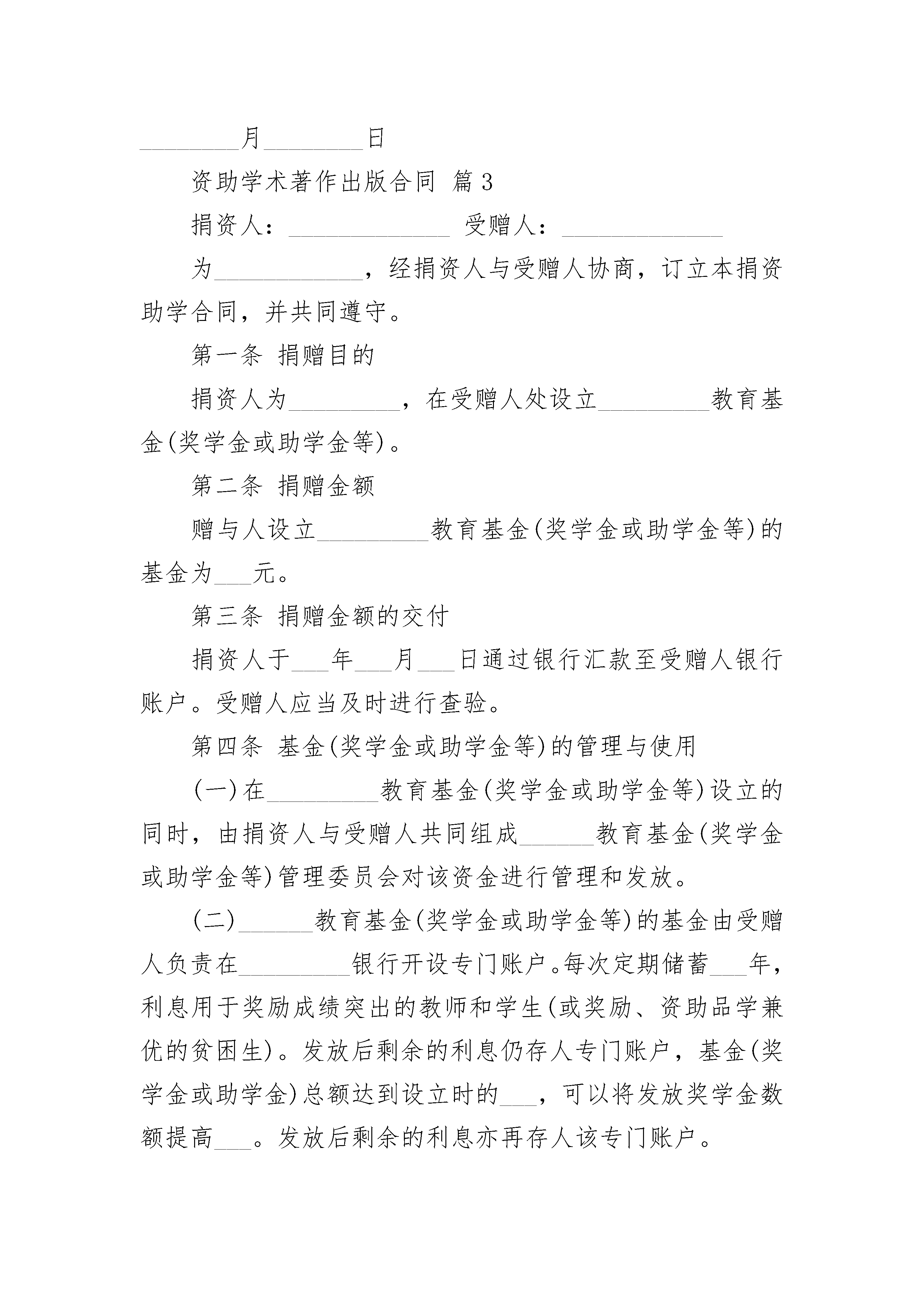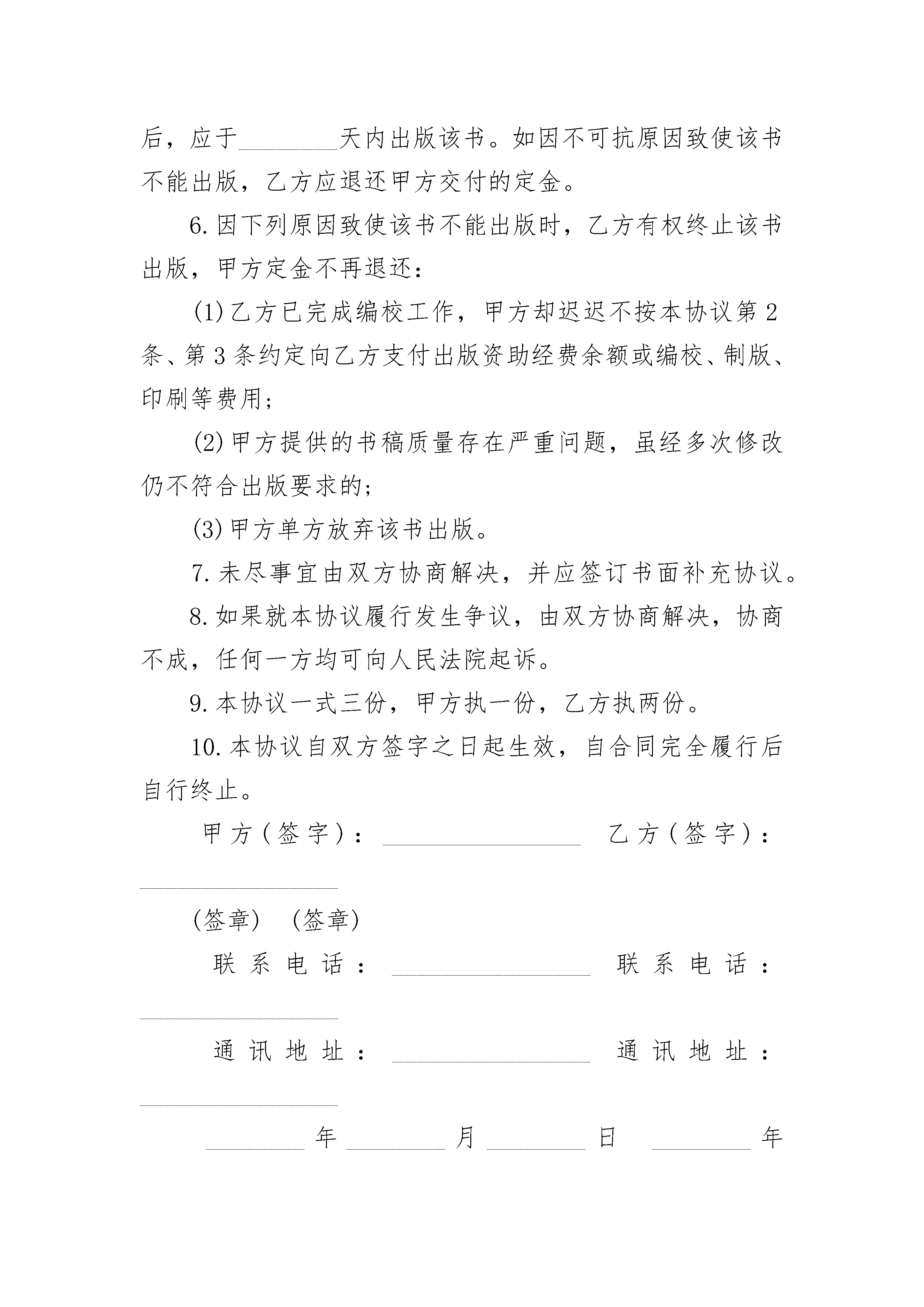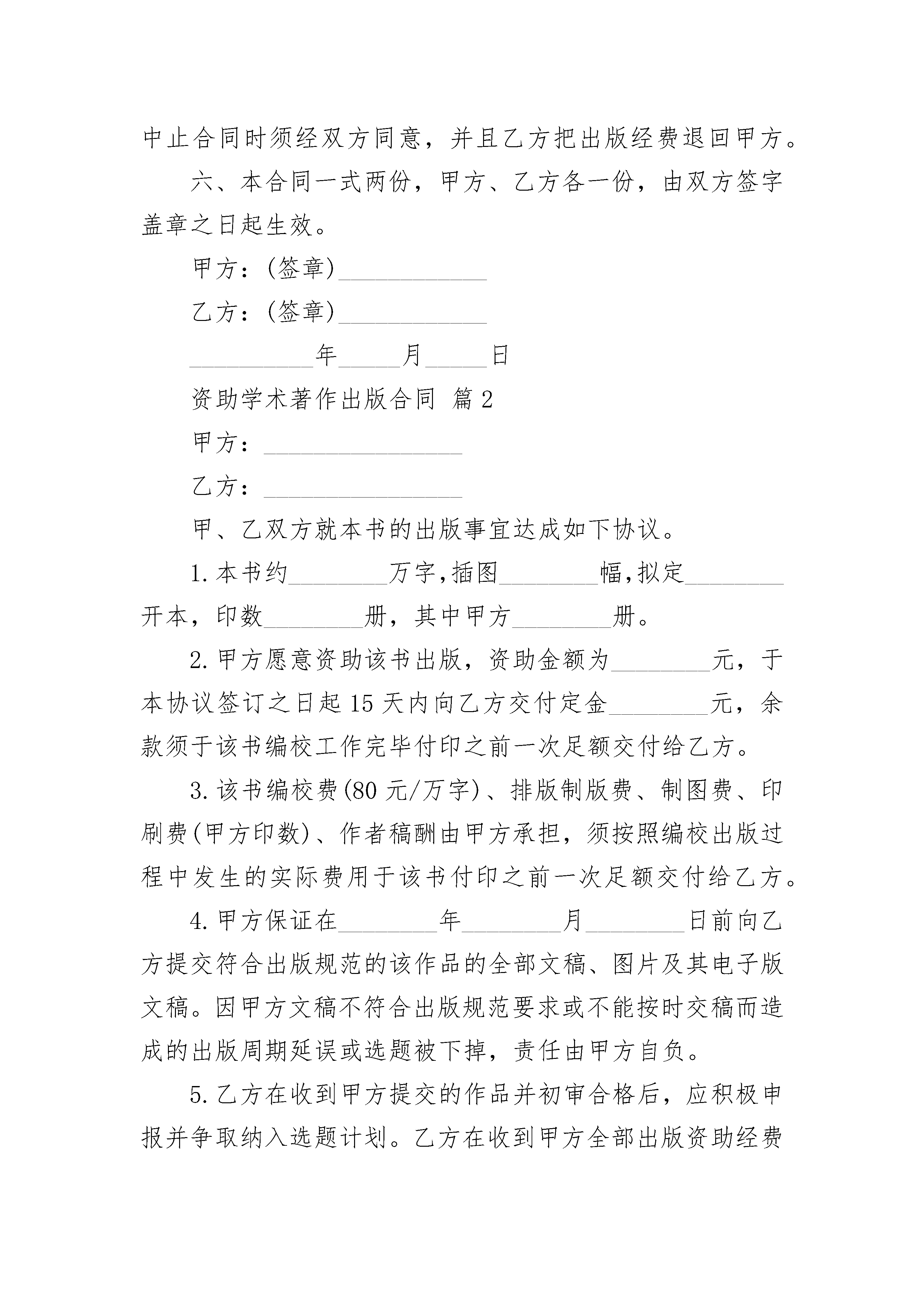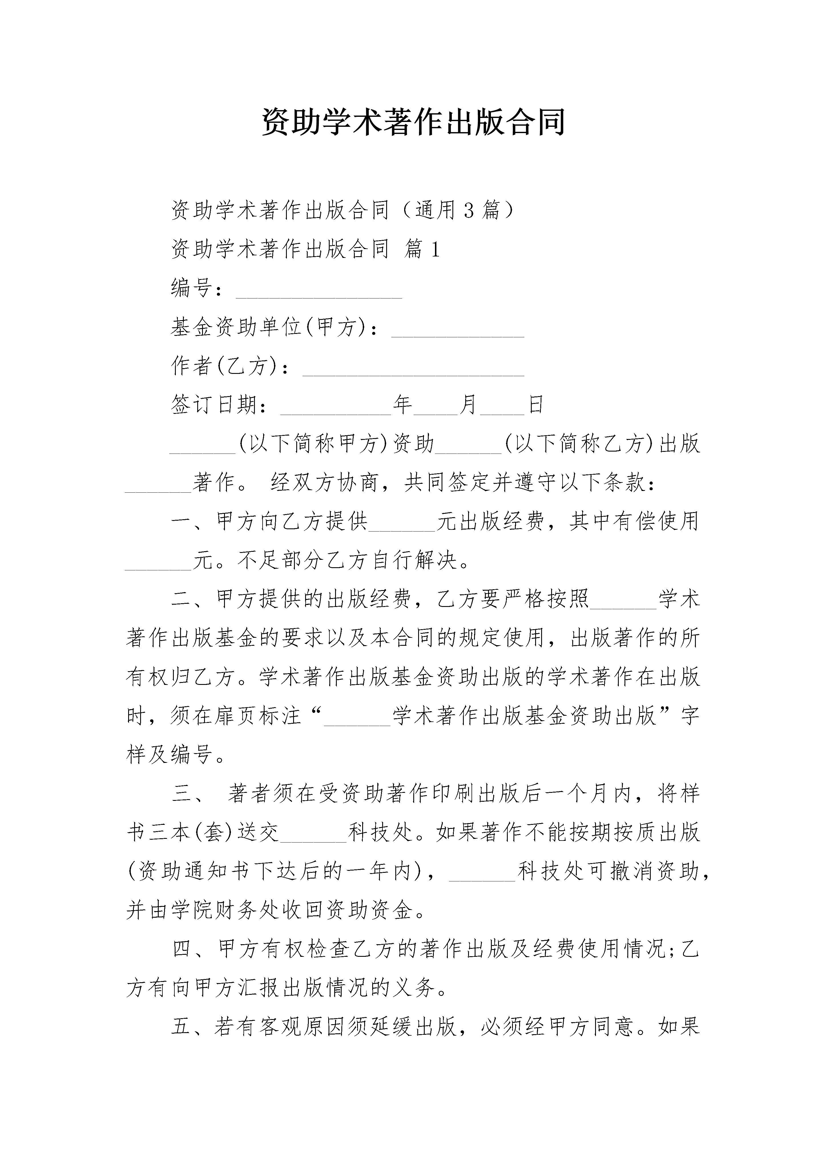 资助学术著作出版合同资助学术著作出版合同(通用3篇)资助学术著作出版合同篇1编号:_______________基金资助单位(甲方):____________作者(乙方):____________________签订日期:__________年____月____日______(以下简称甲方)资助______(以下简称乙方)出版______著作。经双方协商,共同签定并遵守以下条款:一、甲方向乙方提供______元出版经费,其中有偿使用______元。不足部分乙方自行解决。二、甲方提供的出版经费,乙方要严格按照______学术著作出版基金的要求以及本合同的规定使用,出版著作的所有权归乙方。学术著作出版基金资助出版的学术著作在出版时,须在扉页标注“______学术著作出版基金资助出版”字样及编号。三、著者须在受资助著作印刷出版后一个月内,将样书三本(套)送交______科技处。如果著作不能按期按质出版(资助通知书下达后的一年内),______科技处可撤消资助,并由学院财务处收回资助资金。四、甲方有权检查乙方的著作出版及经费使用情况;乙方有向甲方汇报出版情况的义务。五、若有客观原因须延缓出版,必须经甲方同意。如果中止合同时须经双方同意,并且乙方把出版经费退回甲方。六、本合同一式两份,甲方、乙方各一份,由双方签字盖章之日起生效。甲方:(签章)____________乙方:(签章)______________________年_____月_____日资助学术著作出版合同篇2甲方:________________乙方:________________甲、乙双方就本书的出版事宜达成如下协议。1.本书约________万字,插图________幅,拟定________开本,印数________册,其中甲方________册。2.甲方愿意资助该书出版,资助金额为________元,于本协议签订之日起15天内向乙方交付定金________元,余款须于该书编校工作完毕付印之前一次足额交付给乙方。3.该书编校费(80元/万字)、排版制版费、制图费、印刷费(甲方印数)、作者稿酬由甲方承担,须按照编校出版过程中发生的实际费用于该书付印之前一次足额交付给乙方。4.甲方保证在________年________月________日前向乙方提交符合出版规范的该作品的全部文稿、图片及其电子版文稿。因甲方文稿不符合出版规范要求或不能按时交稿而造成的出版周期延误或选题被下掉,责任由甲方自负。5.乙方在收到甲方提交的作品并初审合格后,应积极申报并争取纳入选题计划。乙方在收到甲方全部出版资助经费后,应于________天内出版该书。如因不可抗原因致使该书不能出版,乙方应退还甲方交付的定金。6.因下列原因致使该书不能出版时,乙方有权终止该书出版,甲方定金不再退还:(1)乙方已完成编校工作,甲方却迟迟不按本协议第2条、第3条约定向乙方支付出版资助经费余额或编校、制版、印刷等费用;(2)甲方提供的书稿质量存在严重问题,虽经多次修改仍不符合出版要求的;(3)甲方单方放弃该书出版。7.未尽事宜由双方协商解决,并应签订书面补充协议。8.如果就本协议履行发生争议,由双方协商解决,协商不成,任何一方均可向人民法院起诉。9.本协议一式三份,甲方执一份,乙方执两份。10.本协议自双方签字之日起生效,自合同完全履行后自行终止。甲方(签字):________________乙方(签字):________________(签章)(签章)联系电话:________________联系电话:________________通讯地址:________________通讯地址:________________________年________月________日________年________月________日资助学术著作出版合同篇3捐资人:_____________受赠人:_____________为____________,经捐资人与受赠人协商,订立本捐资助学合同,并共同遵守。第一条捐赠目的捐资人为_________,在受赠人处设立_________教育基金(奖学金或助学金等)。第二条捐赠金额赠与人设立_________教育基金(奖学金或助学金等)的基金为___元。第三条捐赠金额的交付捐资人于___年___月___日通过银行汇款至受赠人银行账户。受赠人应当及时进行查验。第四条基金(奖学金或助学金等)的管理与使用(一)在_________教育基金(奖学金或助学金等)设立的同时,由捐资人与受赠人共同组成______教育基金(奖学金或助学金等)管理委员会对该资金进行管理和发放。(二)______教育基金(奖学金或助学金等)的基金由受赠人负责在_________银行开设专门账户。每次定期储蓄_