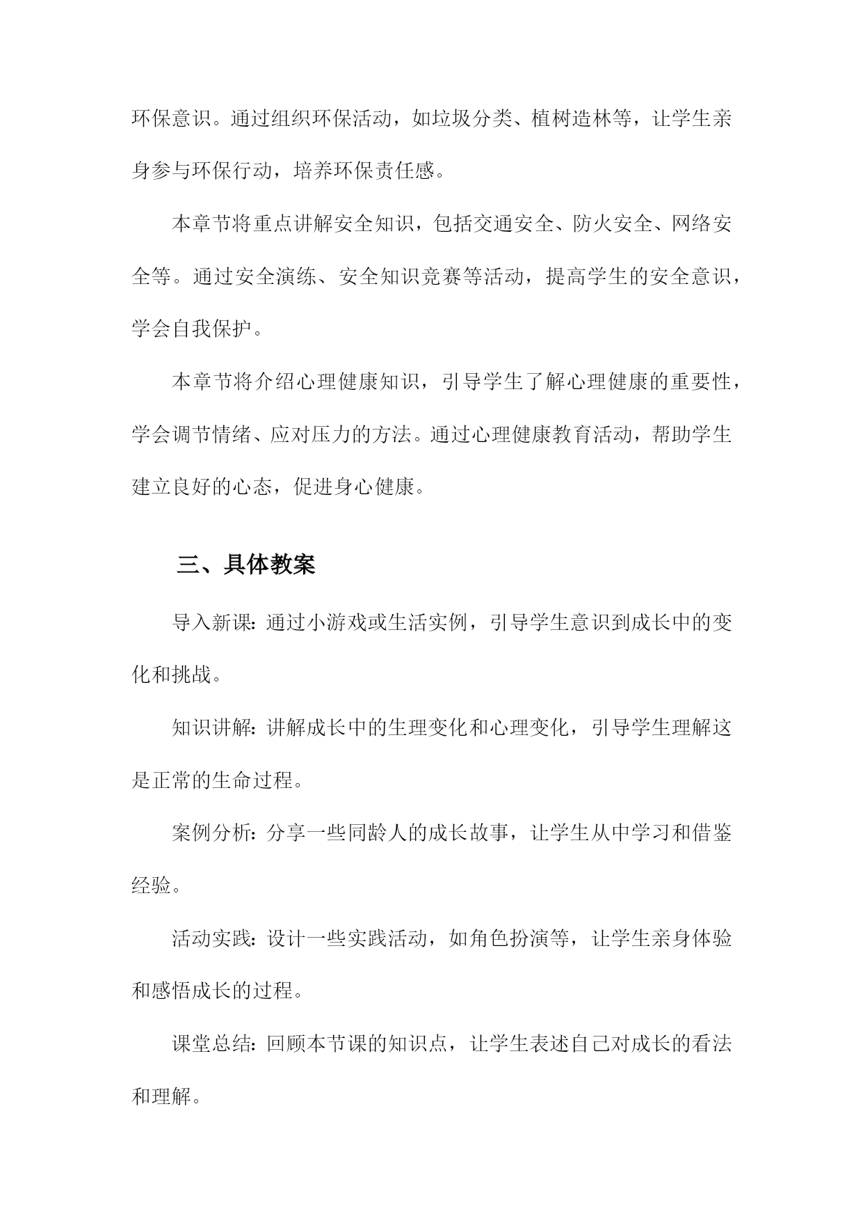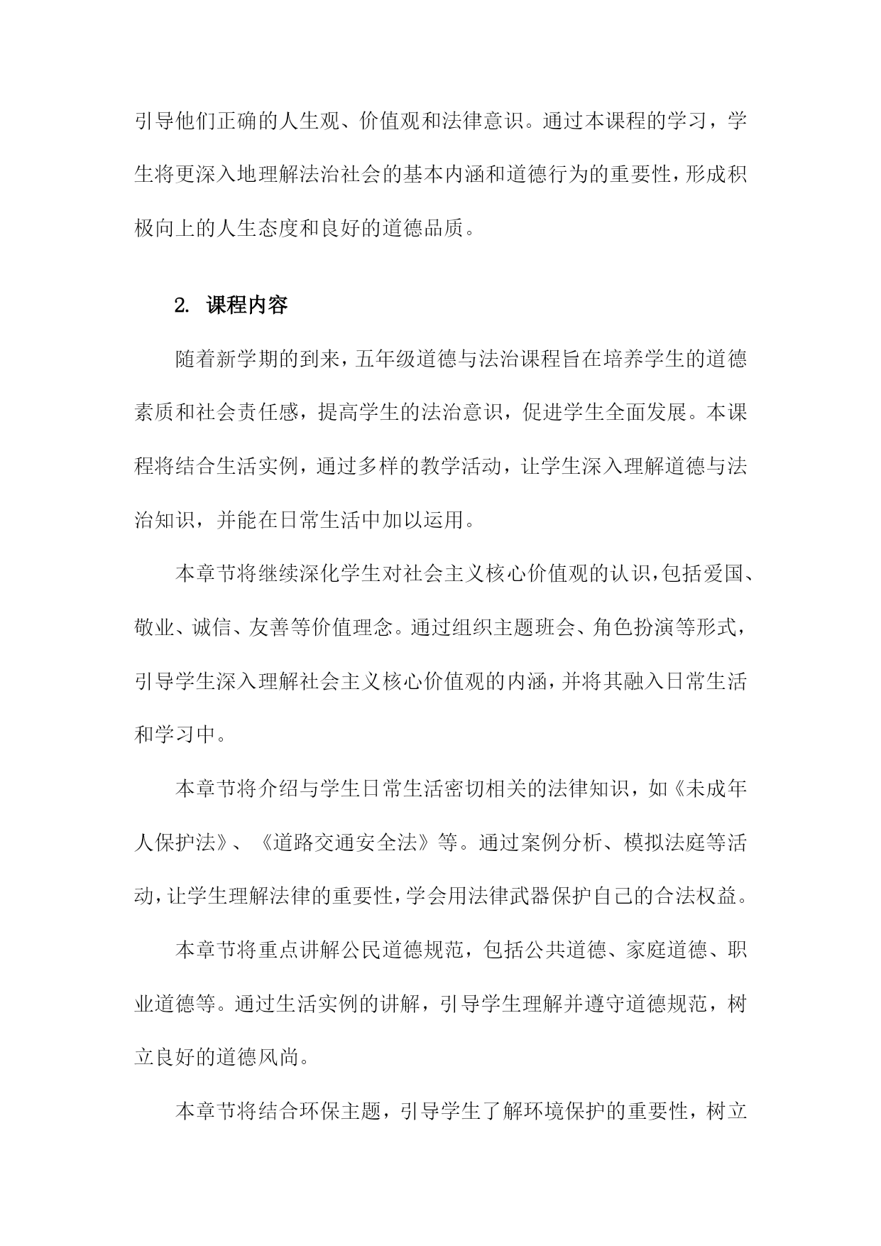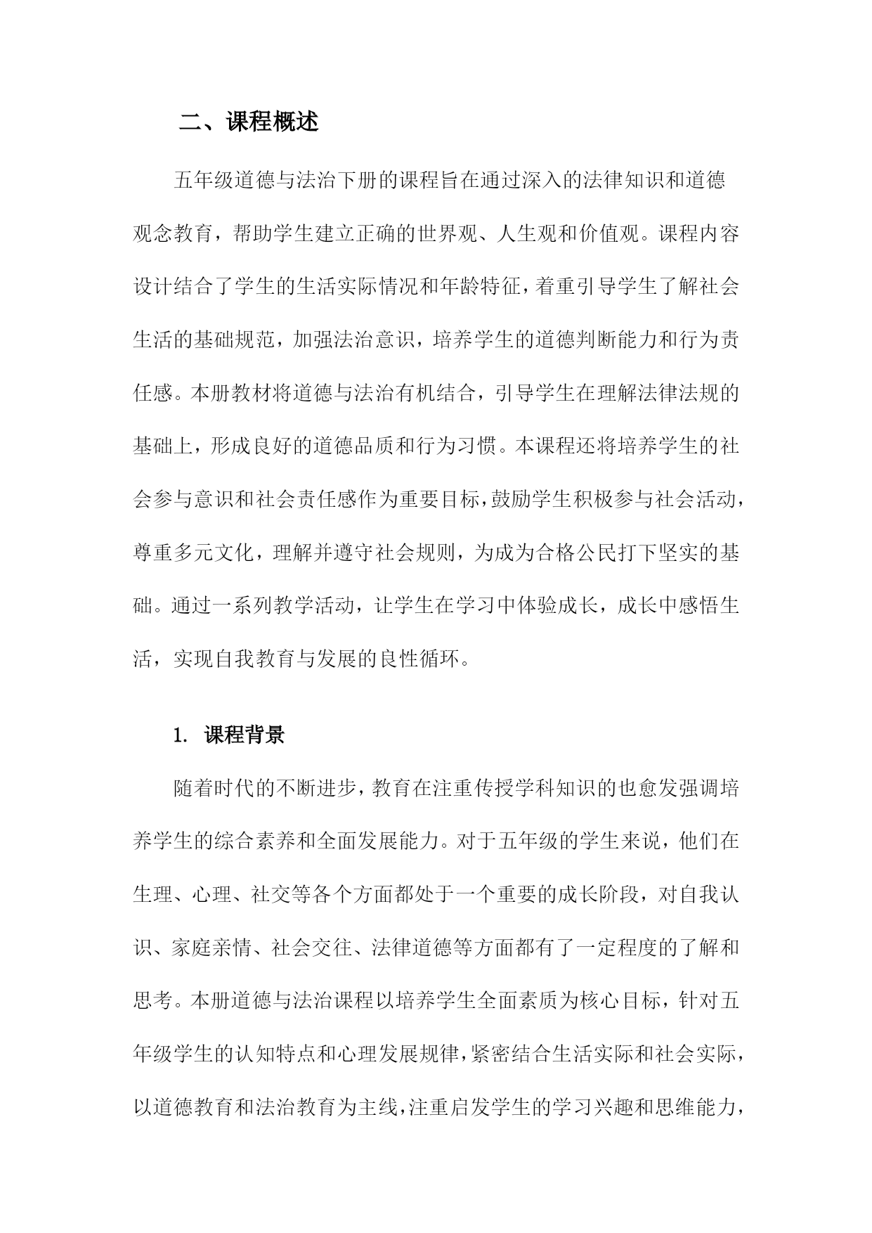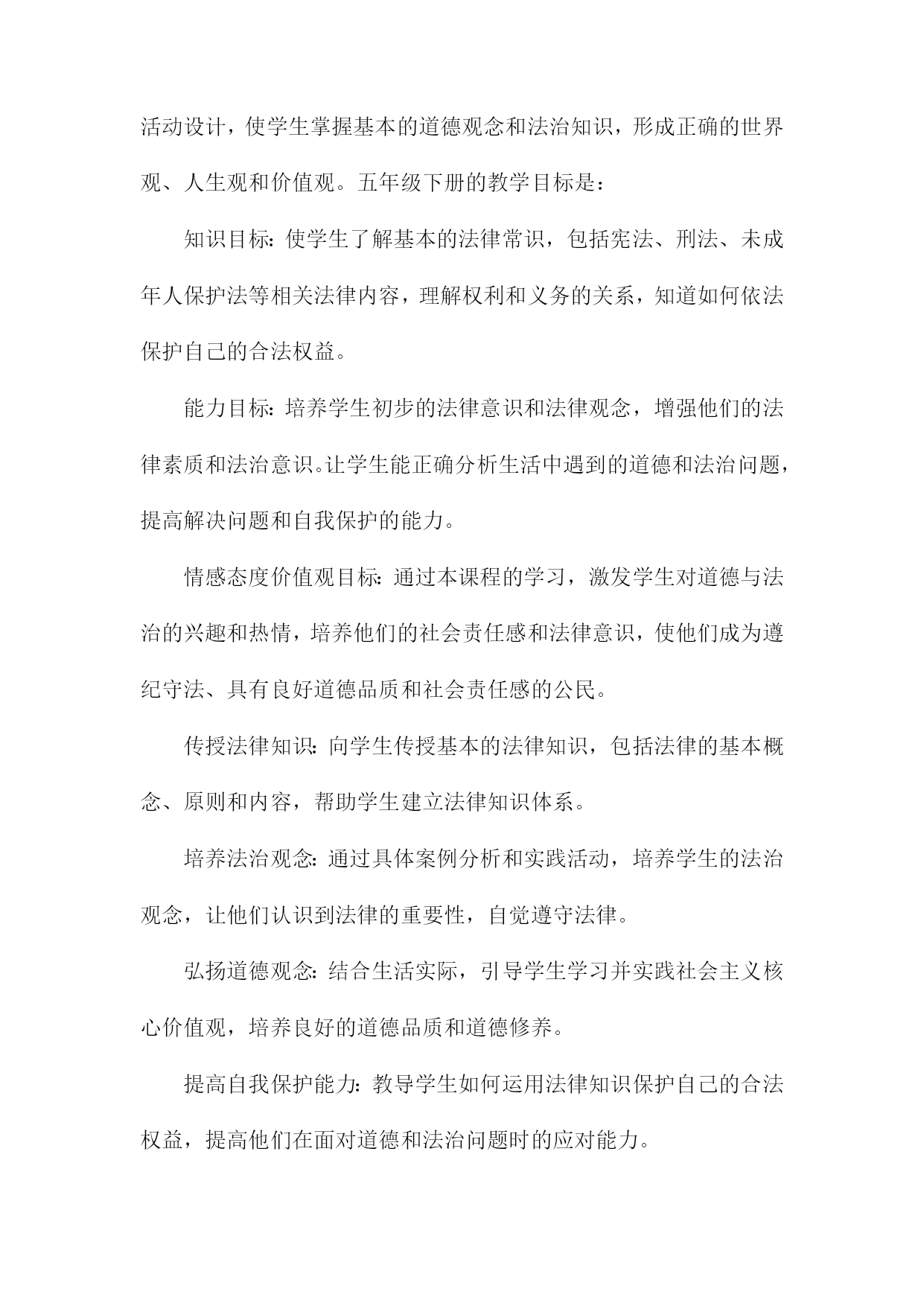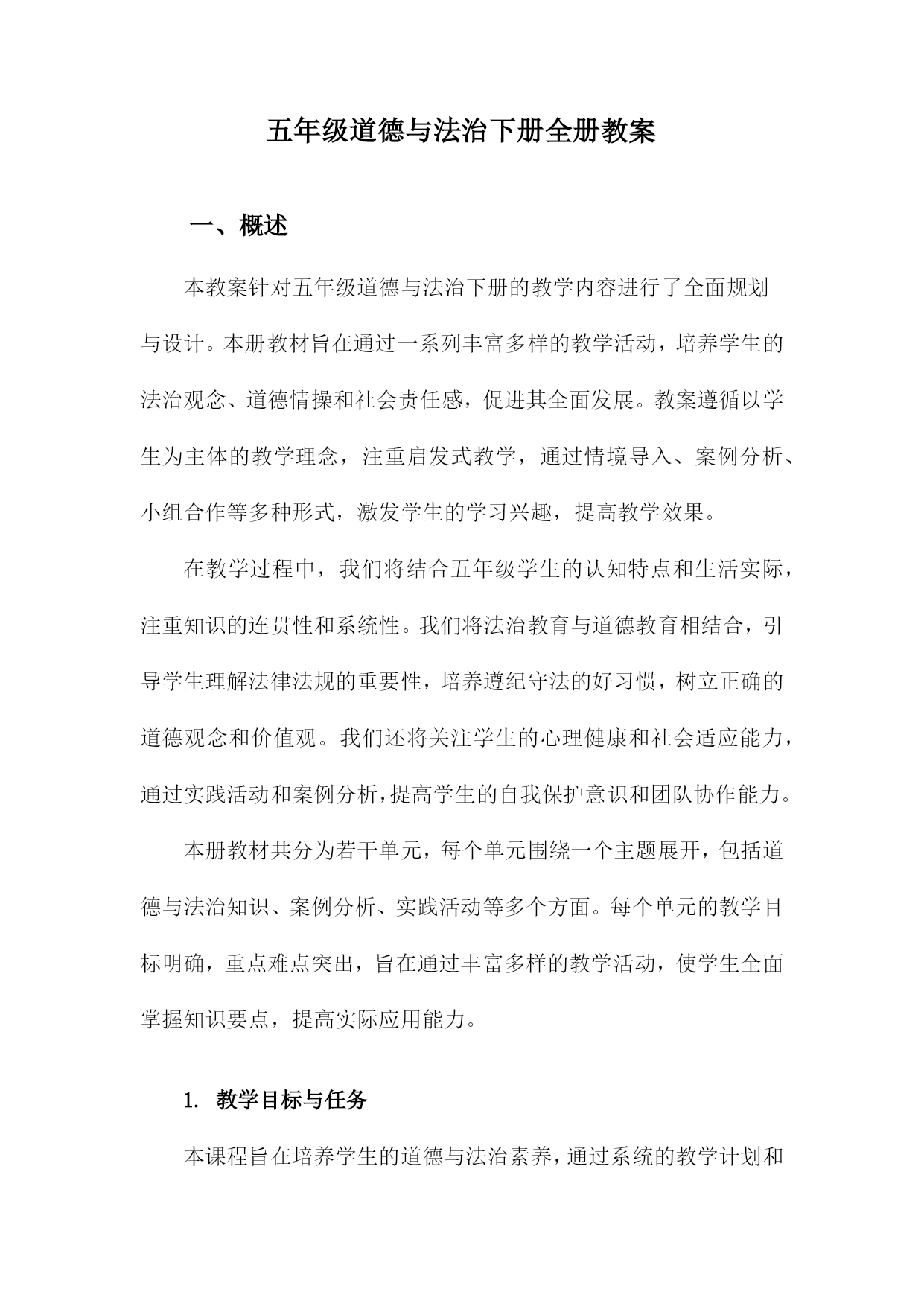 五年级道德与法治下册全册教案一、概述本教案针对五年级道德与法治下册的教学内容进行了全面规划与设计。本册教材旨在通过一系列丰富多样的教学活动,培养学生的法治观念、道德情操和社会责任感,促进其全面发展。教案遵循以学生为主体的教学理念,注重启发式教学,通过情境导入、案例分析、小组合作等多种形式,激发学生的学习兴趣,提高教学效果。在教学过程中,我们将结合五年级学生的认知特点和生活实际,注重知识的连贯性和系统性。我们将法治教育与道德教育相结合,引导学生理解法律法规的重要性,培养遵纪守法的好习惯,树立正确的道德观念和价值观。我们还将关注学生的心理健康和社会适应能力,通过实践活动和案例分析,提高学生的自我保护意识和团队协作能力。本册教材共分为若干单元,每个单元围绕一个主题展开,包括道德与法治知识、案例分析、实践活动等多个方面。每个单元的教学目标明确,重点难点突出,旨在通过丰富多样的教学活动,使学生全面掌握知识要点,提高实际应用能力。1.教学目标与任务本课程旨在培养学生的道德与法治素养,通过系统的教学计划和活动设计,使学生掌握基本的道德观念和法治知识,形成正确的世界观、人生观和价值观。五年级下册的教学目标是:知识目标:使学生了解基本的法律常识,包括宪法、刑法、未成年人保护法等相关法律内容,理解权利和义务的关系,知道如何依法保护自己的合法权益。能力目标:培养学生初步的法律意识和法律观念,增强他们的法律素质和法治意识。让学生能正确分析生活中遇到的道德和法治问题,提高解决问题和自我保护的能力。情感态度价值观目标:通过本课程的学习,激发学生对道德与法治的兴趣和热情,培养他们的社会责任感和法律意识,使他们成为遵纪守法、具有良好道德品质和社会责任感的公民。传授法律知识:向学生传授基本的法律知识,包括法律的基本概念、原则和内容,帮助学生建立法律知识体系。培养法治观念:通过具体案例分析和实践活动,培养学生的法治观念,让他们认识到法律的重要性,自觉遵守法律。弘扬道德观念:结合生活实际,引导学生学习并实践社会主义核心价值观,培养良好的道德品质和道德修养。提高自我保护能力:教导学生如何运用法律知识保护自己的合法权益,提高他们在面对道德和法治问题时的应对能力。二、课程概述五年级道德与法治下册的课程旨在通过深入的法律知识和道德观念教育,帮助学生建立正确的世界观、人生观和价值观。课程内容设计结合了学生的生活实际情况和年龄特征,着重引导学生了解社会生活的基础规范,加强法治意识,培养学生的道德判断能力和行为责任感。本册教材将道德与法治有机结合,引导学生在理解法律法规的基础上,形成良好的道德品质和行为习惯。本课程还将培养学生的社会参与意识和社会责任感作为重要目标,鼓励学生积极参与社会活动,尊重多元文化,理解并遵守社会规则,为成为合格公民打下坚实的基础。通过一系列教学活动,让学生在学习中体验成长,成长中感悟生活,实现自我教育与发展的良性循环。1.课程背景随着时代的不断进步,教育在注重传授学科知识的也愈发强调培养学生的综合素养和全面发展能力。对于五年级的学生来说,他们在生理、心理、社交等各个方面都处于一个重要的成长阶段,对自我认识、家庭亲情、社会交往、法律道德等方面都有了一定程度的了解和思考。本册道德与法治课程以培养学生全面素质为核心目标,针对五年级学生的认知特点和心理发展规律,紧密结合生活实际和社会实际,以道德教育和法治教育为主线,注重启发学生的学习兴趣和思维能力,引导他们正确的人生观、价值观和法律意识。通过本课程的学习,学生将更深入地理解法治社会的基本内涵和道德行为的重要性,形成积极向上的人生态度和良好的道德品质。2.课程内容随着新学期的到来,五年级道德与法治课程旨在培养学生的道德素质和社会责任感,提高学生的法治意识,促进学生全面发展。本课程将结合生活实例,通过多样的教学活动,让学生深入理解道德与法治知识,并能在日常生活中加以运用。本章节将继续深化学生对社会主义核心价值观的认识,包括爱国、敬业、诚信、友善等价值理念。通过组织主题班会、角色扮演等形式,引导学生深入理解社会主义核心价值观的内涵,并将其融入日常生活和学习中。本章节将介绍与学生日常生活密切相关的法律知识,如《未成年人保护法》、《道路交通安全法》等。通过案例分析、模拟法庭等活动,让学生理解法律的重要性,学会用法律武器保护自己的合法权益。本章节将重点讲解公民道德规范,包括公共道德、家庭道德、职业道德等。通过生活实例的讲解,引导学生理解并遵守道德规范,树立良好的道德风尚。本章节将结合环保主题,引导学生了解环境保护的重要性,树立环保意识。通过组织环保活动,如垃圾分类、植树造林等,让学生亲身参与环保行动,培养环保责任感。本章节将重点讲解安全知识,包括交通安全、防火安全、网络安全等。通过安全演练、安全知识竞赛等活动,提高学生的安