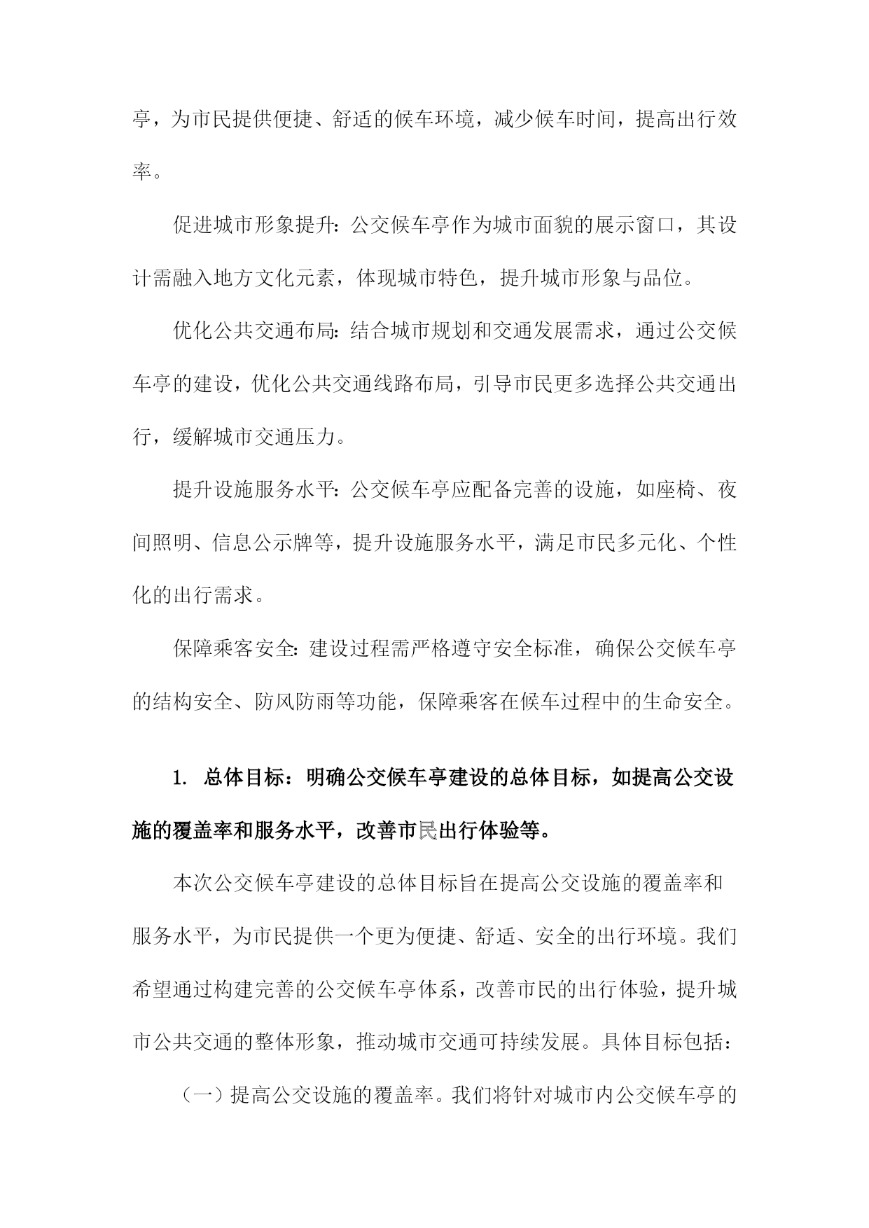 公交候车亭建设方案一、概述随着城市化进程的加速,公共交通在城市建设与发展中扮演着至关重要的角色。作为公共交通的重要组成部分,公交候车亭不仅为人们提供了方便的候车环境,更是城市形象与文明程度的体现。本公交候车亭建设方案旨在提升公交服务质量,优化市民出行体验,同时展现城市的现代化风貌。本方案充分考虑了城市发展的长远规划,结合现有公共交通网络布局,注重人性化设计与可持续性建设。公交候车亭的选址将遵循便捷性、安全性与合理性的原则,确保站点覆盖广泛,方便市民出行。在建设过程中,我们将注重环保材料的选择与节能技术的应用,以实现公交候车亭的可持续发展。本方案还将注重公交候车亭的功能性与美观性相结合。通过精心设计,使公交候车亭不仅具备遮阳、避雨、信息展示等基本功能,还能融入城市文化元素,成为城市的一道亮丽风景线。通过本方案的实施,我们期望为市民提供一个舒适、便捷、美观的公交候车环境,助力城市公共交通事业的发展。1.背景介绍:介绍当前城市公交候车亭的现状及其在城市公共交通中的重要性。随着城市化进程的加速和公共交通事业的发展,城市公交候车亭作为城市交通基础设施的重要组成部分,逐渐受到了广泛关注。城市公交候车亭的状况呈现出参差不齐的现象。在许多城市中,公交候车亭已经成为城市形象的一部分,体现了城市文明的进步;也有一些地方的公交候车亭存在设施陈旧、功能不全、设计不合理等问题。在此背景下,针对公交候车亭的建设与改造显得尤为重要。公交候车亭在城市公共交通中扮演着举足轻重的角色。它不仅为市民提供了便利的候车环境,提升了公共交通的吸引力,更在一定程度上保障了乘客的安全和舒适。合理的公交候车亭布局和优质的建设质量能够有效提高公交系统的运营效率和服务水平,进而促进城市交通的可持续发展。针对当前城市公交候车亭的现状,制定一份科学、合理、实用的公交候车亭建设方案至关重要。该方案旨在提升公交候车亭的服务水平,满足市民的出行需求,为城市的公共交通事业贡献力量。2.建设的必要性和意义:阐述公交候车亭建设的必要性,包括提高城市形象、方便市民出行、提升公交服务质量等方面。公交候车亭作为城市交通基础设施的重要组成部分,其建设有着极大的必要性。公交候车亭的建设对于提升城市形象至关重要。一个城市的精神面貌和文明程度,可以从其公共交通设施中窥见一斑。美观、实用、具有地方特色的公交候车亭,不仅能给来访的游客留下良好的印象,还能展示城市的文化魅力,进一步提升城市的整体形象。公交候车亭的建设极大方便了市民的出行。随着城市化进程的加快,公共交通在市民出行中的地位日益重要。公交候车亭作为公共交通的配套设施,其建设能够保障市民在候车过程中的舒适性和便利性,尤其是在雨雪天气或炎热的夏季,设计合理的公交候车亭能够有效解决市民候车时的不适。清晰的站点标识和指引系统也有助于初次到访者快速找到目的地,减少出行困扰。公交候车亭的建设也是提升公交服务质量的关键环节。公交作为城市的主要公共交通工具之一,其服务质量的提升直接关系到市民的日常生活质量。通过建设设计精良、功能齐全的公交候车亭,可以有效提高公交服务的整体形象和服务水平,增强市民对公交服务的满意度和信任度。完善的公交候车亭设施也有助于吸引更多的市民选择公共交通出行,进一步缓解城市交通压力。公交候车亭的建设对于提高城市形象、方便市民出行以及提升公交服务质量等方面都有着重要的意义。二、建设目标提升市民出行便利性:通过建设布局合理、功能完善的公交候车亭,为市民提供便捷、舒适的候车环境,减少候车时间,提高出行效率。促进城市形象提升:公交候车亭作为城市面貌的展示窗口,其设计需融入地方文化元素,体现城市特色,提升城市形象与品位。优化公共交通布局:结合城市规划和交通发展需求,通过公交候车亭的建设,优化公共交通线路布局,引导市民更多选择公共交通出行,缓解城市交通压力。提升设施服务水平:公交候车亭应配备完善的设施,如座椅、夜间照明、信息公示牌等,提升设施服务水平,满足市民多元化、个性化的出行需求。保障乘客安全:建设过程需严格遵守安全标准,确保公交候车亭的结构安全、防风防雨等功能,保障乘客在候车过程中的生命安全。1.总体目标:明确公交候车亭建设的总体目标,如提高公交设施的覆盖率和服务水平,改善市民出行体验等。本次公交候车亭建设的总体目标旨在提高公交设施的覆盖率和服务水平,为市民提供一个更为便捷、舒适、安全的出行环境。我们希望通过构建完善的公交候车亭体系,改善市民的出行体验,提升城市公共交通的整体形象,推动城市交通可持续发展。具体目标包括:(一)提高公交设施的覆盖率。我们将针对城市内公交候车亭的现状进行全面调研,确保新建候车亭能够覆盖主要道路和人口密集区域,确保广大市民在任何地方都能享受到便利的公交服务。也考虑到便民性要求,注重周边环境和交通流量因素,以实现最大限度的服务普及