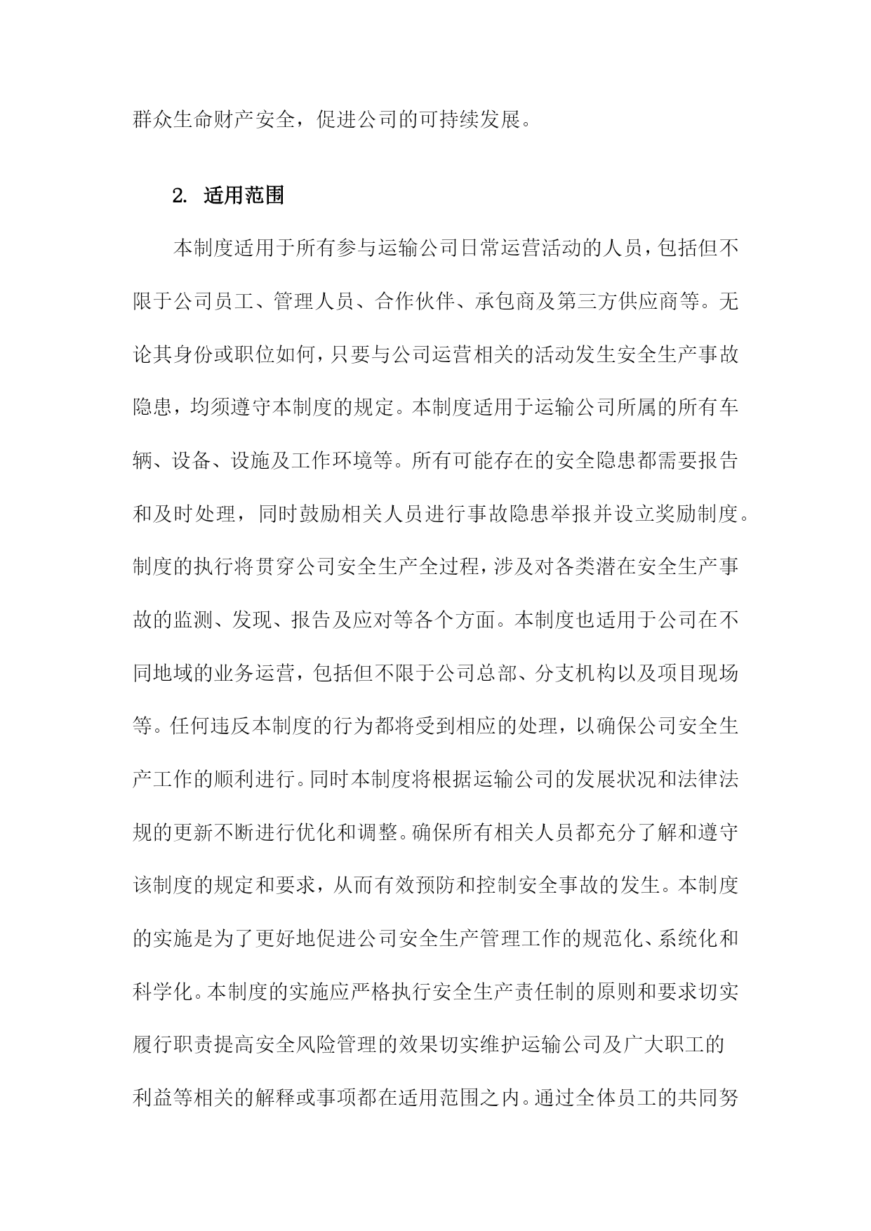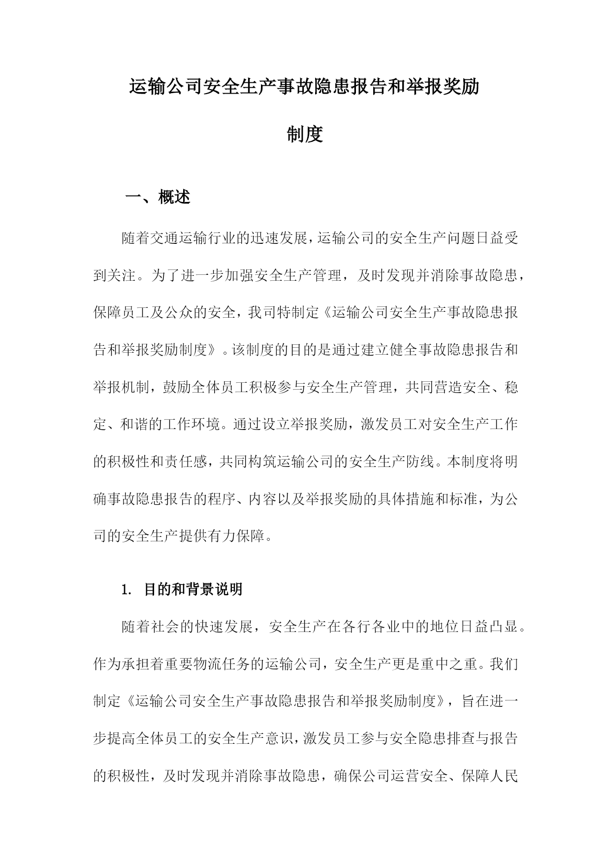 运输公司安全生产事故隐患报告和举报奖励制度一、概述随着交通运输行业的迅速发展,运输公司的安全生产问题日益受到关注。为了进一步加强安全生产管理,及时发现并消除事故隐患,保障员工及公众的安全,我司特制定《运输公司安全生产事故隐患报告和举报奖励制度》。该制度的目的是通过建立健全事故隐患报告和举报机制,鼓励全体员工积极参与安全生产管理,共同营造安全、稳定、和谐的工作环境。通过设立举报奖励,激发员工对安全生产工作的积极性和责任感,共同构筑运输公司的安全生产防线。本制度将明确事故隐患报告的程序、内容以及举报奖励的具体措施和标准,为公司的安全生产提供有力保障。1.目的和背景说明随着社会的快速发展,安全生产在各行各业中的地位日益凸显。作为承担着重要物流任务的运输公司,安全生产更是重中之重。我们制定《运输公司安全生产事故隐患报告和举报奖励制度》,旨在进一步提高全体员工的安全生产意识,激发员工参与安全隐患排查与报告的积极性,及时发现并消除事故隐患,确保公司运营安全、保障人民群众生命财产安全,促进公司的可持续发展。2.适用范围本制度适用于所有参与运输公司日常运营活动的人员,包括但不限于公司员工、管理人员、合作伙伴、承包商及第三方供应商等。无论其身份或职位如何,只要与公司运营相关的活动发生安全生产事故隐患,均须遵守本制度的规定。本制度适用于运输公司所属的所有车辆、设备、设施及工作环境等。所有可能存在的安全隐患都需要报告和及时处理,同时鼓励相关人员进行事故隐患举报并设立奖励制度。制度的执行将贯穿公司安全生产全过程,涉及对各类潜在安全生产事故的监测、发现、报告及应对等各个方面。本制度也适用于公司在不同地域的业务运营,包括但不限于公司总部、分支机构以及项目现场等。任何违反本制度的行为都将受到相应的处理,以确保公司安全生产工作的顺利进行。同时本制度将根据运输公司的发展状况和法律法规的更新不断进行优化和调整。确保所有相关人员都充分了解和遵守该制度的规定和要求,从而有效预防和控制安全事故的发生。本制度的实施是为了更好地促进公司安全生产管理工作的规范化、系统化和科学化。本制度的实施应严格执行安全生产责任制的原则和要求切实履行职责提高安全风险管理的效果切实维护运输公司及广大职工的利益等相关的解释或事项都在适用范围之内。通过全体员工的共同努力共同营造安全、和谐的工作环境保障运输公司的持续稳定发展。二、制度基础原则安全优先原则:我们始终将安全生产作为公司的首要任务,任何工作和活动都必须服从于安全生产的需要。全员参与原则:安全生产事故隐患的排查、报告和举报工作,需要全体员工的积极参与。我们鼓励每一位员工积极发现并报告安全隐患,共同构建安全的工作环境。举报奖励原则:为了激发员工积极参与安全生产事故隐患的举报工作,我们设立举报奖励机制。对提供有价值的安全隐患线索,经核实后给予相应的奖励。保密和隐私保护原则:对于举报人的个人信息,我们将严格保密。我们将确保举报人的合法权益不受侵害,为其提供一个安全、公正的举报环境。责任明确原则:在安全生产事故隐患的排查、报告和整改过程中,各级人员应明确其职责和任务。对于发现的隐患,应立即报告并积极配合整改,确保安全生产。公开透明原则:本制度的执行过程将保持公开透明。对于安全隐患的排查结果、整改情况、奖励情况等,都将进行公示,接受全体员工的监督。本制度的基础原则体现了公司对安全生产的重视,对员工的关爱,以及对社会责任的担当。我们将严格遵守这些原则,确保公司的安全生产工作得到有效开展。1.坚持安全第一、预防为主的方针在我们的运输公司,安全生产始终是最为重要的核心内容。为了有效预防和减少安全事故的发生,我们必须始终坚守“安全第预防为主”的基本原则。这不仅仅是我们对安全生产的承诺,更是我们对员工生命安全和企业持续发展的责任与担当。在构建安全生产管理体系的过程中,我们将安全预防放在首位,通过建立全面的安全生产责任制,实施严格的安全管理制度和操作规程,提高全体员工的法制意识和安全操作技能。通过不断的宣传教育,增强全员安全意识,让员工明确安全生产的重要性以及违反安全生产规定的严重后果。在此基础上,加强对事故隐患的排查治理力度,及时发现并消除事故隐患,确保运输生产的安全稳定运行。我们制定了本安全生产事故隐患报告和举报奖励制度,旨在通过集体的力量,共同筑牢安全生产的防线。通过这一制度,我们鼓励全体员工积极参与安全生产管理,共同构建全员参与、人人有责的安全生产格局。通过这样的方式,我们努力构建一个良好的安全生产环境,为公司的健康持续发展打下坚实的基础。我们将坚持这一方针不动摇,不断优化和完善我们的安全管理体系,确保公司的长期稳定发展。2.强调全员参与,构建安全生产环境在运输公司的安全生产事故隐患报告和举报奖励制度中,强调全员参与是至关重要的。每一个员工都是公司安全
