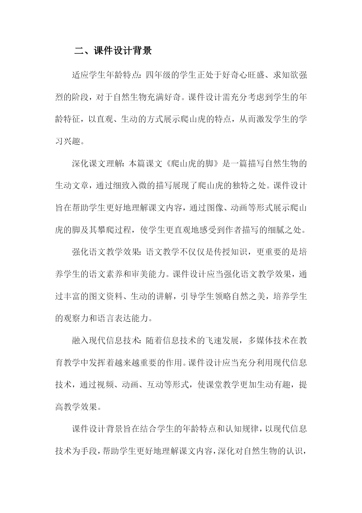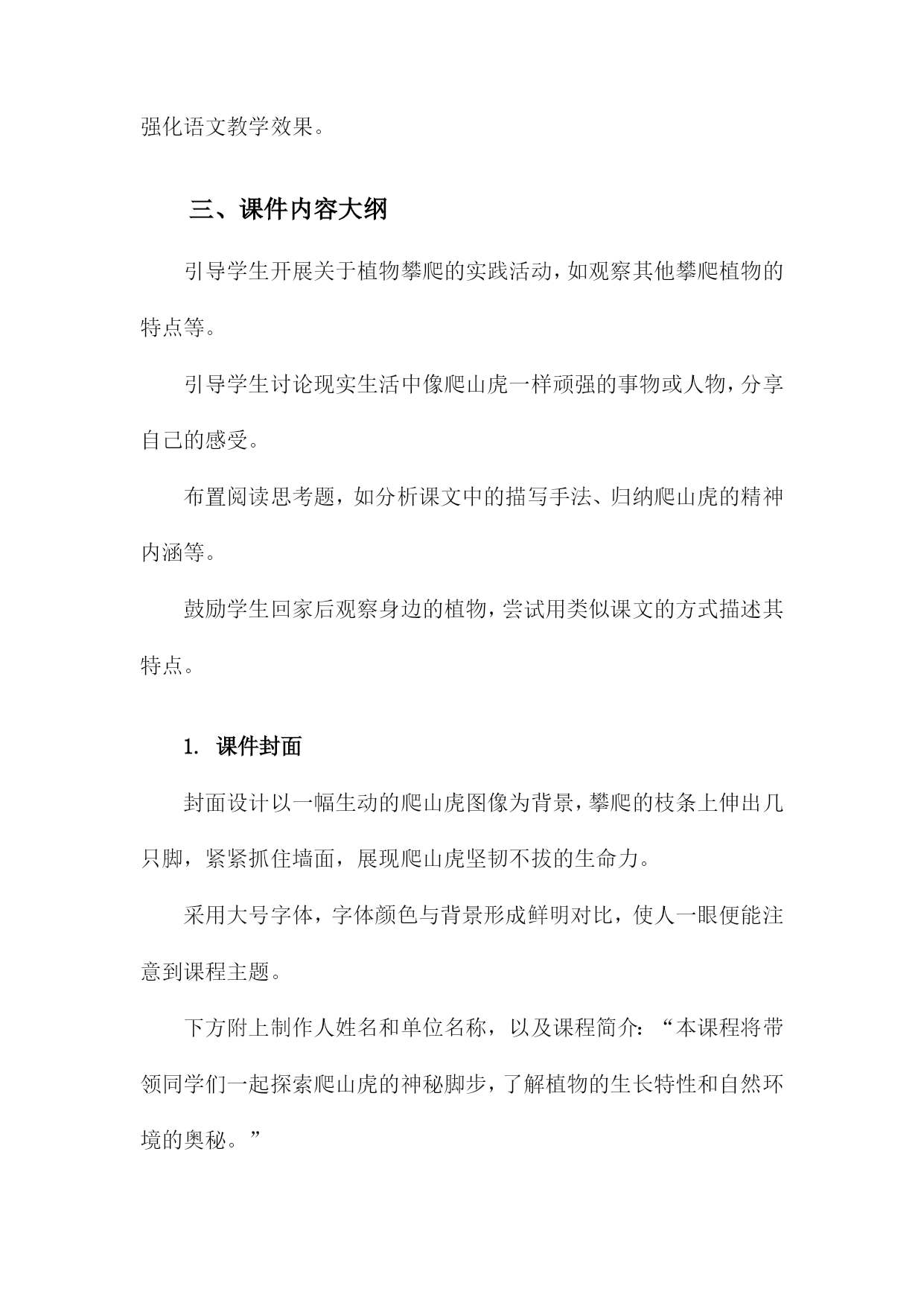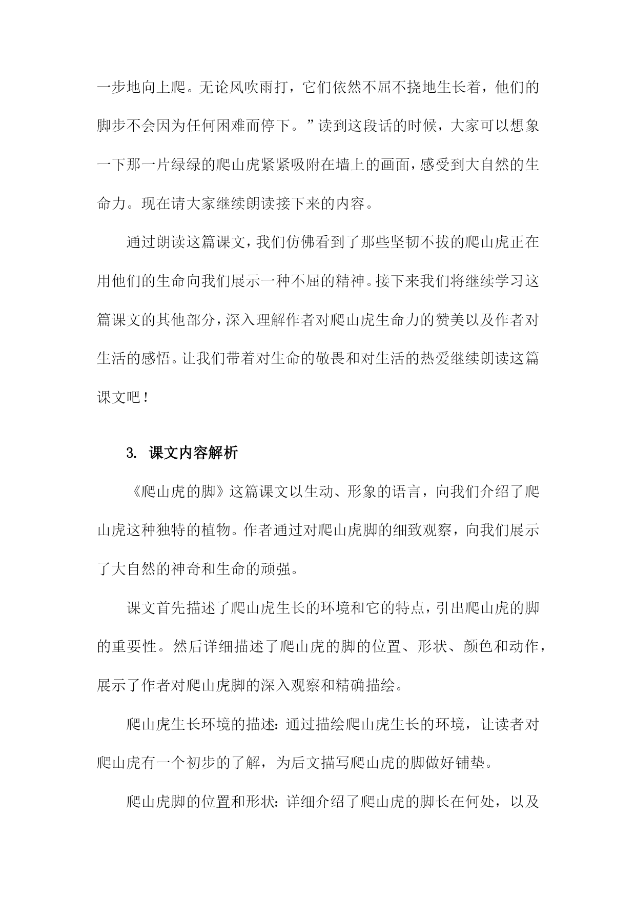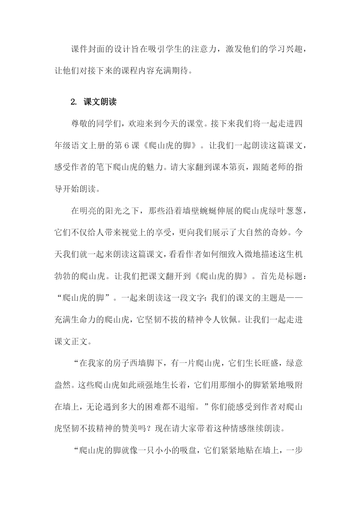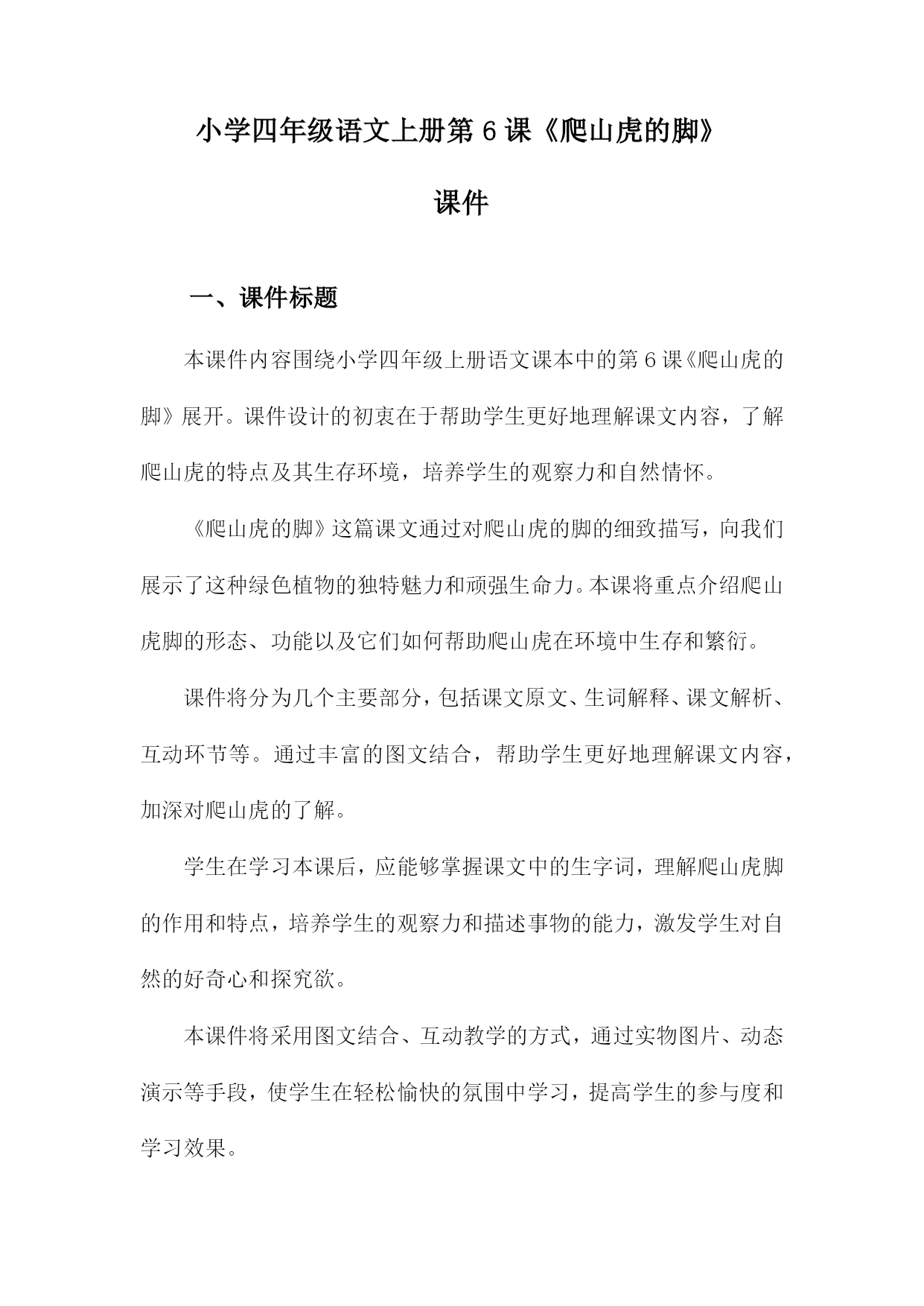 小学四年级语文上册第6课《爬山虎的脚》课件一、课件标题本课件内容围绕小学四年级上册语文课本中的第6课《爬山虎的脚》展开。课件设计的初衷在于帮助学生更好地理解课文内容,了解爬山虎的特点及其生存环境,培养学生的观察力和自然情怀。《爬山虎的脚》这篇课文通过对爬山虎的脚的细致描写,向我们展示了这种绿色植物的独特魅力和顽强生命力。本课将重点介绍爬山虎脚的形态、功能以及它们如何帮助爬山虎在环境中生存和繁衍。课件将分为几个主要部分,包括课文原文、生词解释、课文解析、互动环节等。通过丰富的图文结合,帮助学生更好地理解课文内容,加深对爬山虎的了解。学生在学习本课后,应能够掌握课文中的生字词,理解爬山虎脚的作用和特点,培养学生的观察力和描述事物的能力,激发学生对自然的好奇心和探究欲。本课件将采用图文结合、互动教学的方式,通过实物图片、动态演示等手段,使学生在轻松愉快的氛围中学习,提高学生的参与度和学习效果。二、课件设计背景适应学生年龄特点:四年级的学生正处于好奇心旺盛、求知欲强烈的阶段,对于自然生物充满好奇。课件设计需充分考虑到学生的年龄特征,以直观、生动的方式展示爬山虎的特点,从而激发学生的学习兴趣。深化课文理解:本篇课文《爬山虎的脚》是一篇描写自然生物的生动文章,通过细致入微的描写展现了爬山虎的独特之处。课件设计旨在帮助学生更好地理解课文内容,通过图像、动画等形式展示爬山虎的脚及其攀爬过程,使学生更直观地感受到作者描写的细腻之处。强化语文教学效果:语文教学不仅仅是传授知识,更重要的是培养学生的语文素养和审美能力。课件设计应当强化语文教学效果,通过丰富的图文资料、生动的讲解,引导学生领略自然之美,培养学生的观察力和语言表达能力。融入现代信息技术:随着信息技术的飞速发展,多媒体技术在教育教学中发挥着越来越重要的作用。课件设计应当充分利用现代信息技术,通过视频、动画、互动等形式,使课堂教学更加生动有趣,提高教学效果。课件设计背景旨在结合学生的年龄特点和认知规律,以现代信息技术为手段,帮助学生更好地理解课文内容,深化对自然生物的认识,强化语文教学效果。三、课件内容大纲引导学生开展关于植物攀爬的实践活动,如观察其他攀爬植物的特点等。引导学生讨论现实生活中像爬山虎一样顽强的事物或人物,分享自己的感受。布置阅读思考题,如分析课文中的描写手法、归纳爬山虎的精神内涵等。鼓励学生回家后观察身边的植物,尝试用类似课文的方式描述其特点。1.课件封面封面设计以一幅生动的爬山虎图像为背景,攀爬的枝条上伸出几只脚,紧紧抓住墙面,展现爬山虎坚韧不拔的生命力。采用大号字体,字体颜色与背景形成鲜明对比,使人一眼便能注意到课程主题。下方附上制作人姓名和单位名称,以及课程简介:“本课程将带领同学们一起探索爬山虎的神秘脚步,了解植物的生长特性和自然环境的奥秘。”课件封面的设计旨在吸引学生的注意力,激发他们的学习兴趣,让他们对接下来的课程内容充满期待。2.课文朗读尊敬的同学们,欢迎来到今天的课堂。接下来我们将一起走进四年级语文上册的第6课《爬山虎的脚》。让我们一起朗读这篇课文,感受作者的笔下爬山虎的魅力。请大家翻到课本第页,跟随老师的指导开始朗读。在明亮的阳光之下,那些沿着墙壁蜿蜒伸展的爬山虎绿叶葱葱,它们不仅给人带来视觉上的享受,更向我们展示了大自然的奇妙。今天我们就一起来朗读这篇课文,看看作者如何细致入微地描述这生机勃勃的爬山虎。让我们把课文翻开到《爬山虎的脚》。首先是标题:“爬山虎的脚”。一起来朗读这一段文字:我们的课文的主题是——充满生命力的爬山虎,它坚韧不拔的精神令人钦佩。让我们一起走进课文正文。“在我家的房子西墙脚下,有一片爬山虎,它们生长旺盛,绿意盎然。这些爬山虎如此顽强地生长着,它们用那细小的脚紧紧地吸附在墙上,无论遇到多大的困难都不退缩。”你们能感受到作者对爬山虎坚韧不拔精神的赞美吗?现在请大家带着这种情感继续朗读。“爬山虎的脚就像一只小小的吸盘,它们紧紧地贴在墙上,一步一步地向上爬。无论风吹雨打,它们依然不屈不挠地生长着,他们的脚步不会因为任何困难而停下。”读到这段话的时候,大家可以想象一下那一片绿绿的爬山虎紧紧吸附在墙上的画面,感受到大自然的生命力。现在请大家继续朗读接下来的内容。通过朗读这篇课文,我们仿佛看到了那些坚韧不拔的爬山虎正在用他们的生命向我们展示一种不屈的精神。接下来我们将继续学习这篇课文的其他部分,深入理解作者对爬山虎生命力的赞美以及作者对生活的感悟。让我们带着对生命的敬畏和对生活的热爱继续朗读这篇课文吧!3.课文内容解析《爬山虎的脚》这篇课文以生动、形象的语言,向我们介绍了爬山虎这种独特的植物。作者通过对爬山虎脚的细致观察,向我们展示了大自然的神奇和生命的顽强。课文首先描述了爬山虎生长的环境和它的特点,引出爬山虎的脚的重要性。然后详细描述了爬山虎的