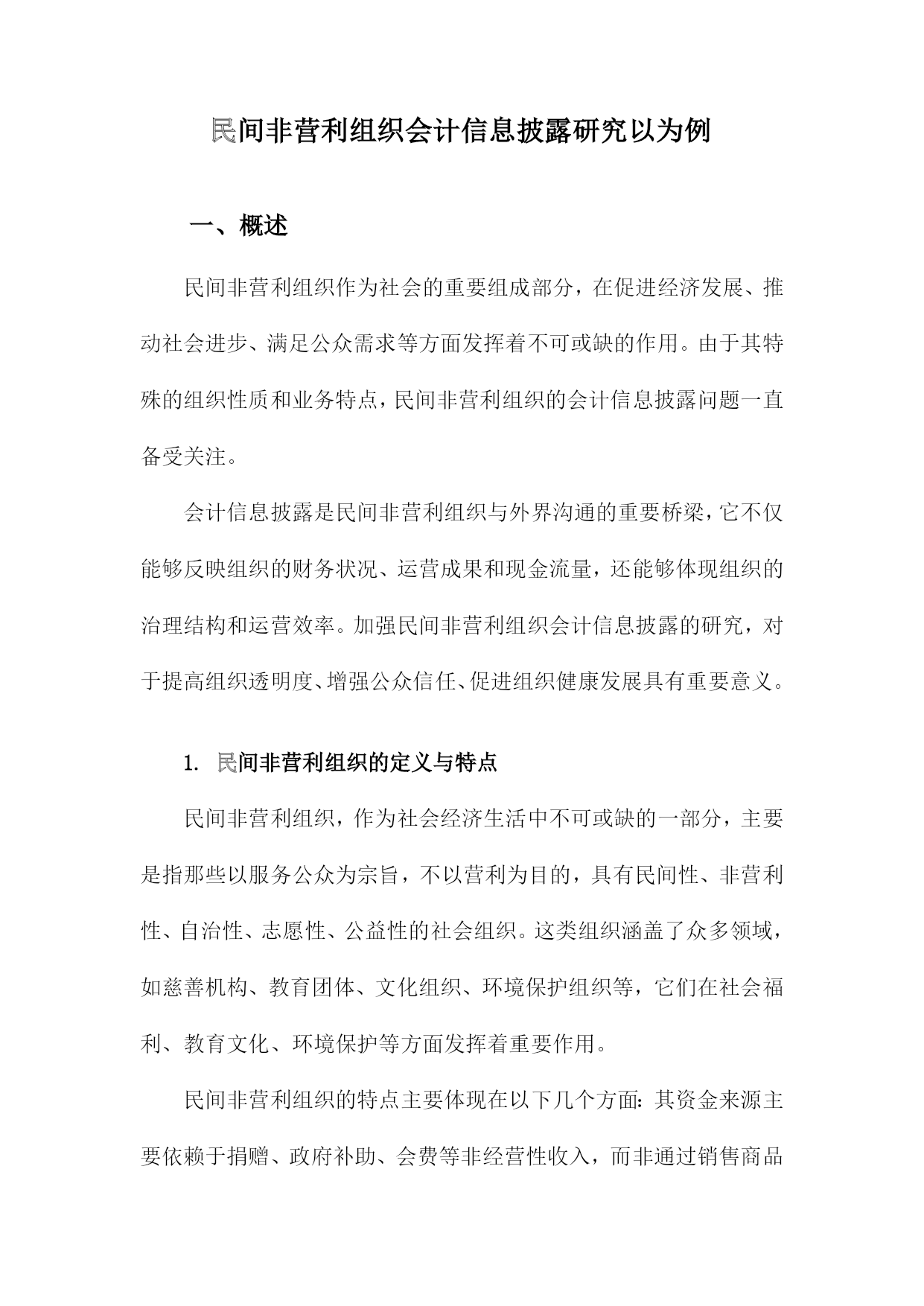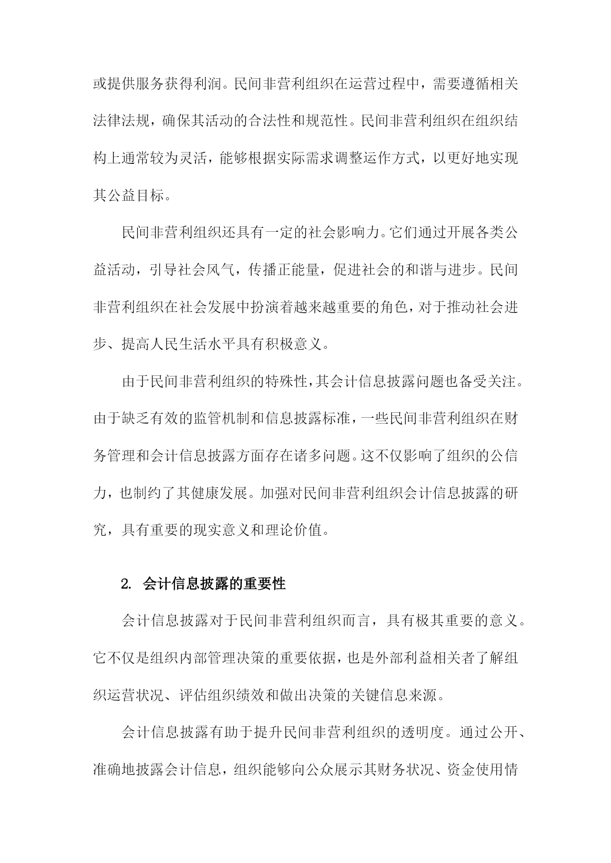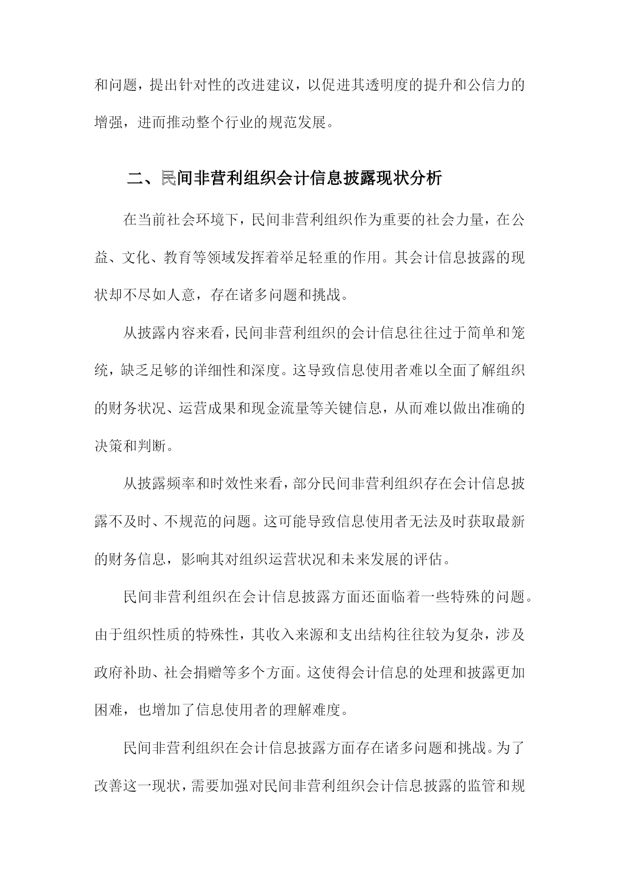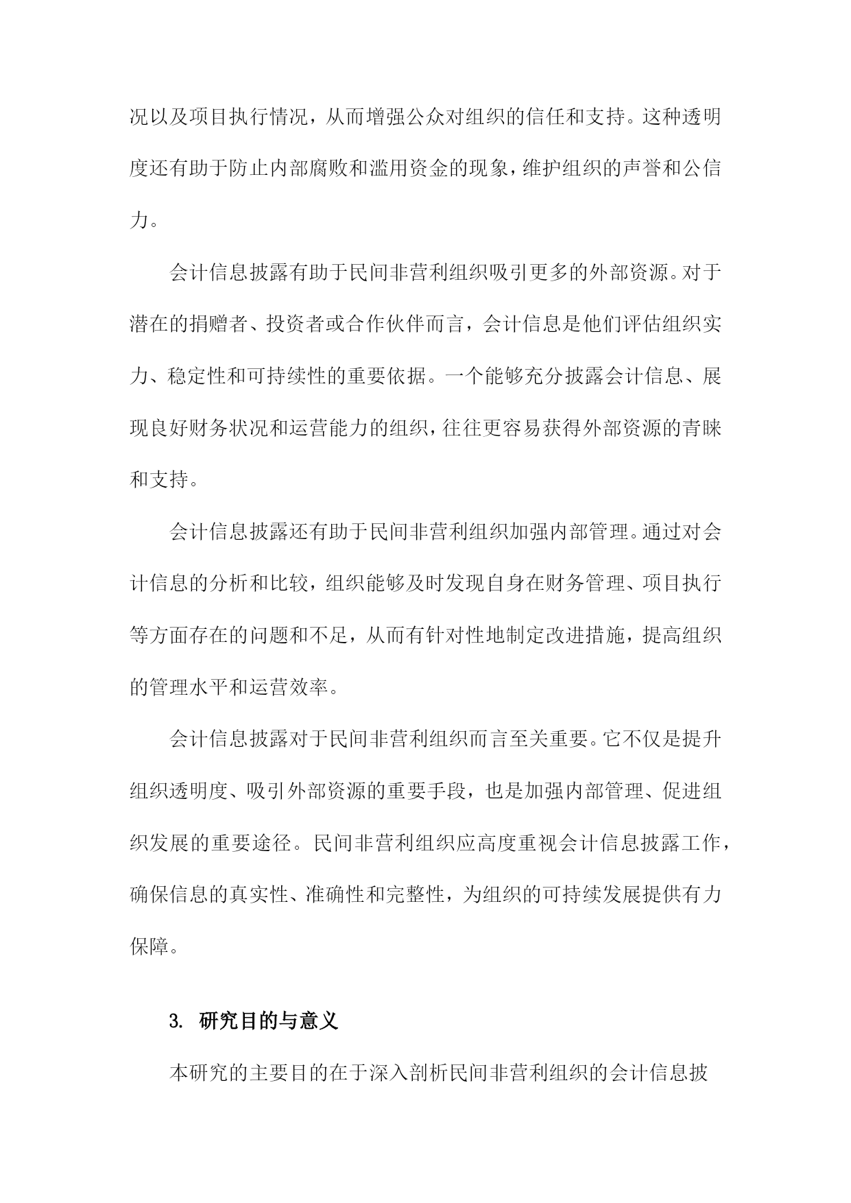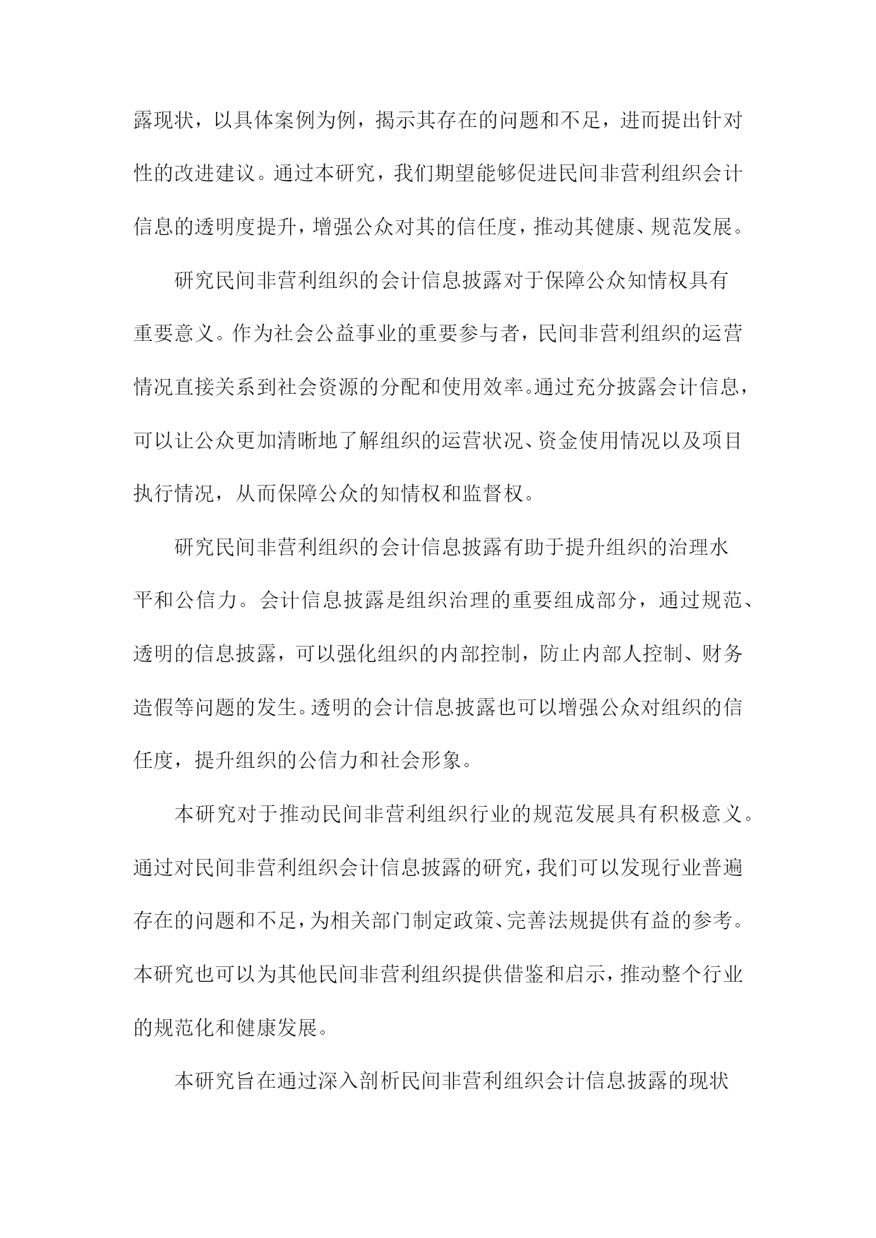 民间非营利组织会计信息披露研究以为例一、概述民间非营利组织作为社会的重要组成部分,在促进经济发展、推动社会进步、满足公众需求等方面发挥着不可或缺的作用。由于其特殊的组织性质和业务特点,民间非营利组织的会计信息披露问题一直备受关注。会计信息披露是民间非营利组织与外界沟通的重要桥梁,它不仅能够反映组织的财务状况、运营成果和现金流量,还能够体现组织的治理结构和运营效率。加强民间非营利组织会计信息披露的研究,对于提高组织透明度、增强公众信任、促进组织健康发展具有重要意义。1.民间非营利组织的定义与特点民间非营利组织,作为社会经济生活中不可或缺的一部分,主要是指那些以服务公众为宗旨,不以营利为目的,具有民间性、非营利性、自治性、志愿性、公益性的社会组织。这类组织涵盖了众多领域,如慈善机构、教育团体、文化组织、环境保护组织等,它们在社会福利、教育文化、环境保护等方面发挥着重要作用。民间非营利组织的特点主要体现在以下几个方面:其资金来源主要依赖于捐赠、政府补助、会费等非经营性收入,而非通过销售商品或提供服务获得利润。民间非营利组织在运营过程中,需要遵循相关法律法规,确保其活动的合法性和规范性。民间非营利组织在组织结构上通常较为灵活,能够根据实际需求调整运作方式,以更好地实现其公益目标。民间非营利组织还具有一定的社会影响力。它们通过开展各类公益活动,引导社会风气,传播正能量,促进社会的和谐与进步。民间非营利组织在社会发展中扮演着越来越重要的角色,对于推动社会进步、提高人民生活水平具有积极意义。由于民间非营利组织的特殊性,其会计信息披露问题也备受关注。由于缺乏有效的监管机制和信息披露标准,一些民间非营利组织在财务管理和会计信息披露方面存在诸多问题。这不仅影响了组织的公信力,也制约了其健康发展。加强对民间非营利组织会计信息披露的研究,具有重要的现实意义和理论价值。2.会计信息披露的重要性会计信息披露对于民间非营利组织而言,具有极其重要的意义。它不仅是组织内部管理决策的重要依据,也是外部利益相关者了解组织运营状况、评估组织绩效和做出决策的关键信息来源。会计信息披露有助于提升民间非营利组织的透明度。通过公开、准确地披露会计信息,组织能够向公众展示其财务状况、资金使用情况以及项目执行情况,从而增强公众对组织的信任和支持。这种透明度还有助于防止内部腐败和滥用资金的现象,维护组织的声誉和公信力。会计信息披露有助于民间非营利组织吸引更多的外部资源。对于潜在的捐赠者、投资者或合作伙伴而言,会计信息是他们评估组织实力、稳定性和可持续性的重要依据。一个能够充分披露会计信息、展现良好财务状况和运营能力的组织,往往更容易获得外部资源的青睐和支持。会计信息披露还有助于民间非营利组织加强内部管理。通过对会计信息的分析和比较,组织能够及时发现自身在财务管理、项目执行等方面存在的问题和不足,从而有针对性地制定改进措施,提高组织的管理水平和运营效率。会计信息披露对于民间非营利组织而言至关重要。它不仅是提升组织透明度、吸引外部资源的重要手段,也是加强内部管理、促进组织发展的重要途径。民间非营利组织应高度重视会计信息披露工作,确保信息的真实性、准确性和完整性,为组织的可持续发展提供有力保障。3.研究目的与意义本研究的主要目的在于深入剖析民间非营利组织的会计信息披露现状,以具体案例为例,揭示其存在的问题和不足,进而提出针对性的改进建议。通过本研究,我们期望能够促进民间非营利组织会计信息的透明度提升,增强公众对其的信任度,推动其健康、规范发展。研究民间非营利组织的会计信息披露对于保障公众知情权具有重要意义。作为社会公益事业的重要参与者,民间非营利组织的运营情况直接关系到社会资源的分配和使用效率。通过充分披露会计信息,可以让公众更加清晰地了解组织的运营状况、资金使用情况以及项目执行情况,从而保障公众的知情权和监督权。研究民间非营利组织的会计信息披露有助于提升组织的治理水平和公信力。会计信息披露是组织治理的重要组成部分,通过规范、透明的信息披露,可以强化组织的内部控制,防止内部人控制、财务造假等问题的发生。透明的会计信息披露也可以增强公众对组织的信任度,提升组织的公信力和社会形象。本研究对于推动民间非营利组织行业的规范发展具有积极意义。通过对民间非营利组织会计信息披露的研究,我们可以发现行业普遍存在的问题和不足,为相关部门制定政策、完善法规提供有益的参考。本研究也可以为其他民间非营利组织提供借鉴和启示,推动整个行业的规范化和健康发展。本研究旨在通过深入剖析民间非营利组织会计信息披露的现状和问题,提出针对性的改进建议,以促进其透明度的提升和公信力的增强,进而推动整个行业的规范发展。二、民间非营利组织会计信息披露现状分析在当前社会环境下,民间非营利组织作为重要的社会力量,在公益、文化、教育等领
