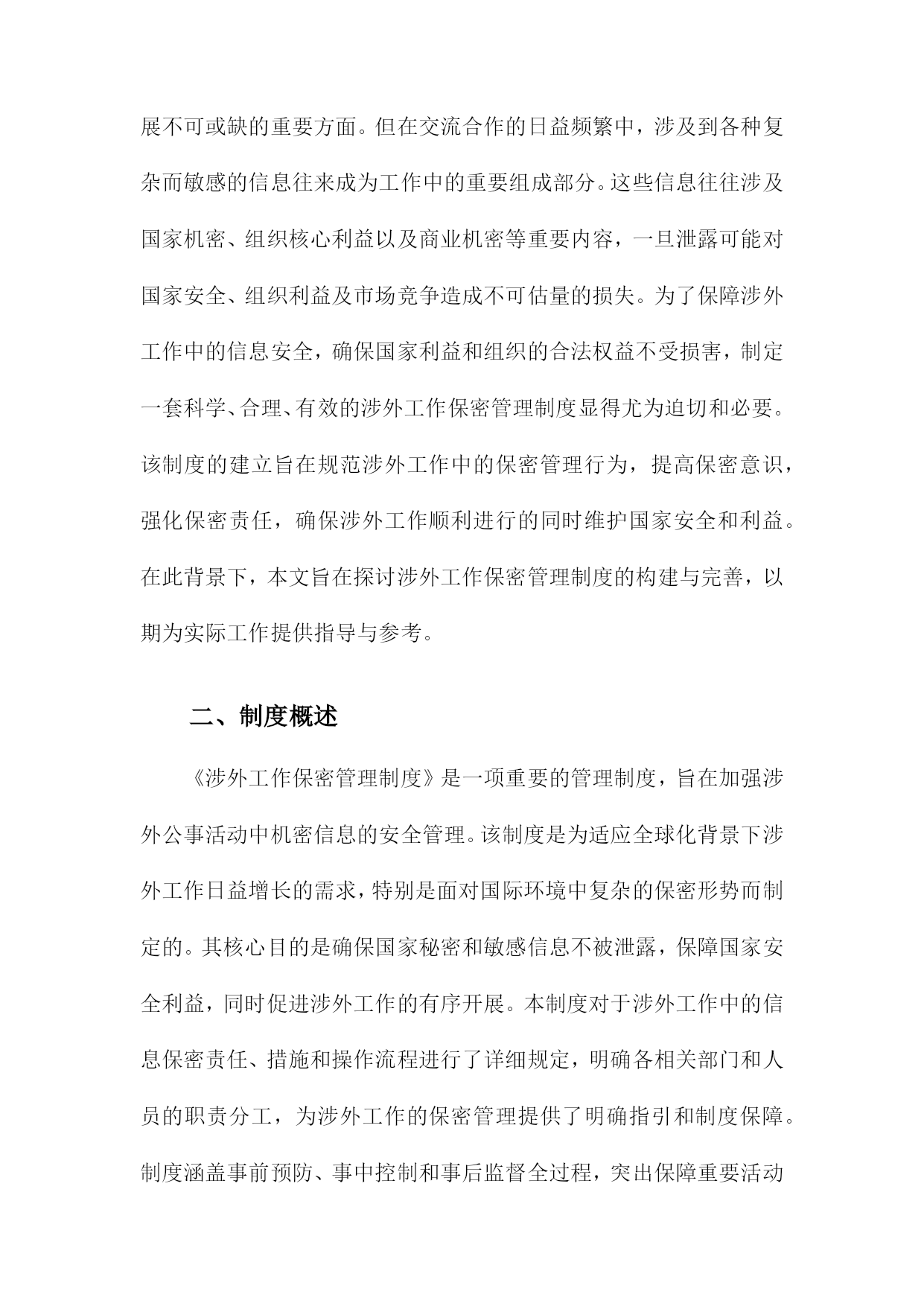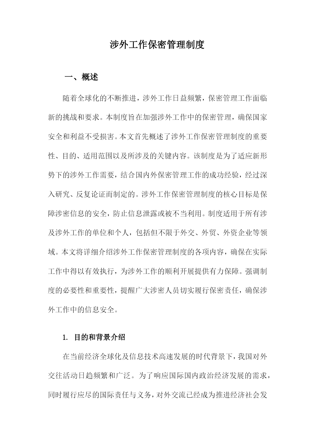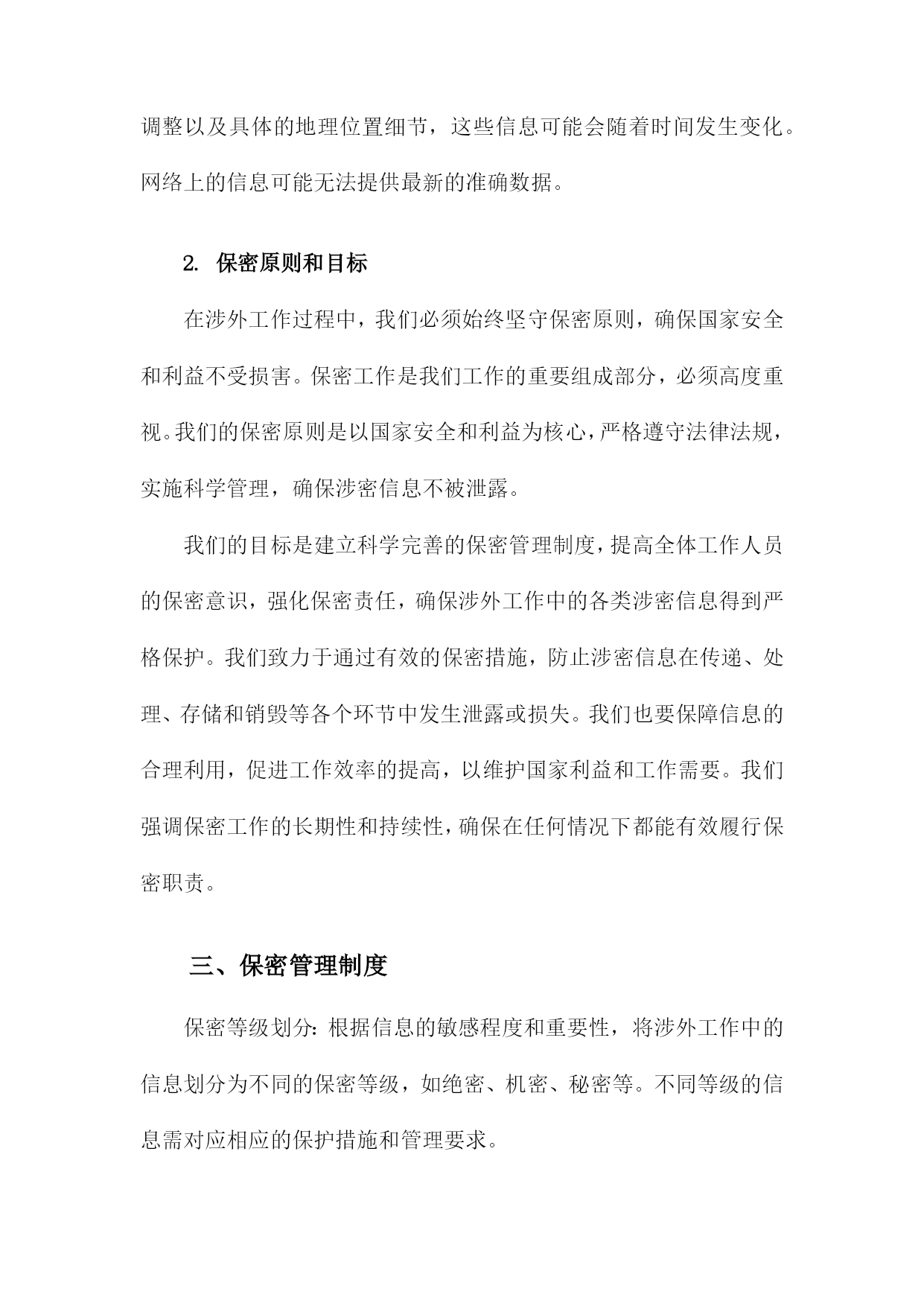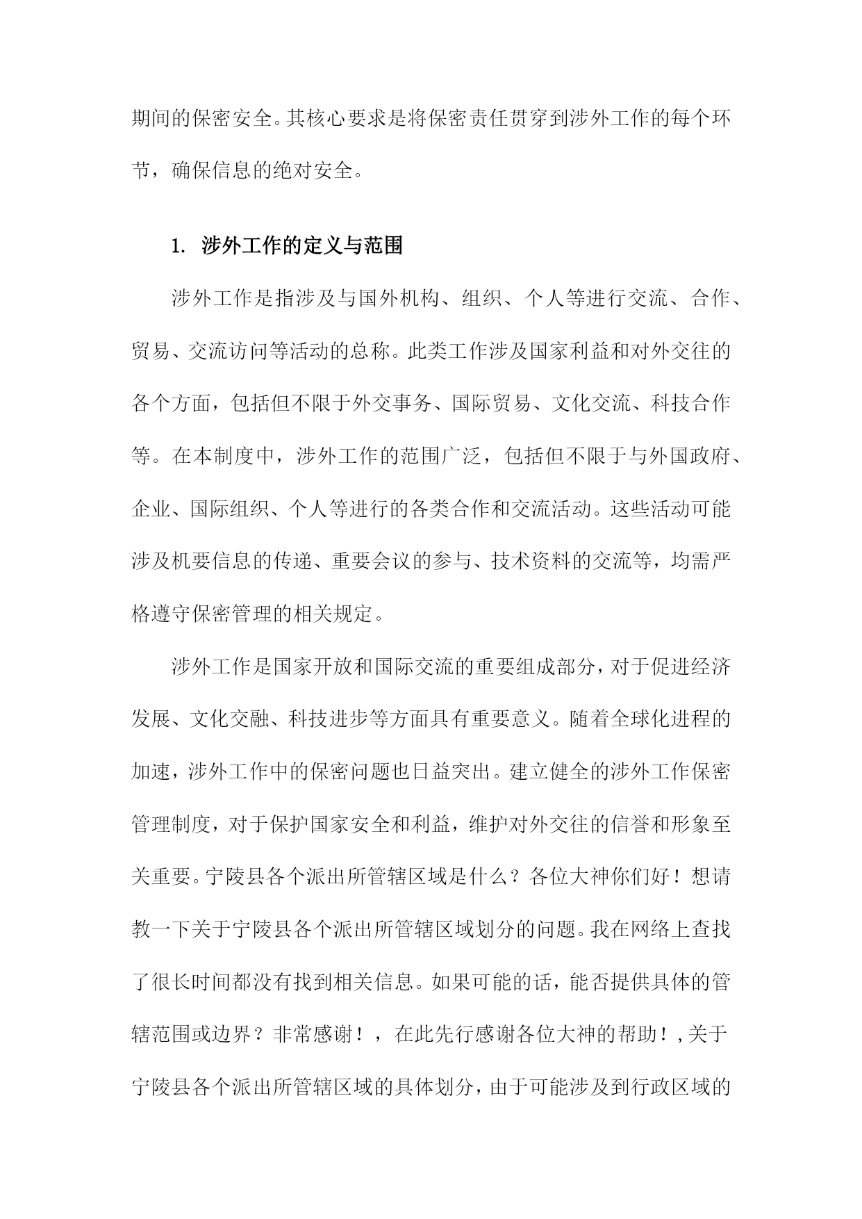 涉外工作保密管理制度一、概述随着全球化的不断推进,涉外工作日益频繁,保密管理工作面临新的挑战和要求。本制度旨在加强涉外工作中的保密管理,确保国家安全和利益不受损害。本文首先概述了涉外工作保密管理制度的重要性、目的、适用范围以及所涉及的关键内容。该制度是为了适应新形势下的涉外工作需要,结合国内外保密管理工作的成功经验,经过深入研究、反复论证而制定的。涉外工作保密管理制度的核心目标是保障涉密信息的安全,防止信息泄露或被不当利用。制度适用于所有涉及涉外工作的单位和个人,包括但不限于外交、外贸、外资企业等领域。本文将详细介绍涉外工作保密管理制度的各项内容,确保在实际工作中得以有效执行,为涉外工作的顺利开展提供有力保障。强调制度的必要性和重要性,提醒广大涉密人员切实履行保密责任,确保涉外工作中的信息安全。1.目的和背景介绍在当前经济全球化及信息技术高速发展的时代背景下,我国对外交往活动日趋频繁和广泛。为了响应国际国内政治经济发展的需求,同时履行应尽的国际责任与义务,对外交流已经成为推进经济社会发展不可或缺的重要方面。但在交流合作的日益频繁中,涉及到各种复杂而敏感的信息往来成为工作中的重要组成部分。这些信息往往涉及国家机密、组织核心利益以及商业机密等重要内容,一旦泄露可能对国家安全、组织利益及市场竞争造成不可估量的损失。为了保障涉外工作中的信息安全,确保国家利益和组织的合法权益不受损害,制定一套科学、合理、有效的涉外工作保密管理制度显得尤为迫切和必要。该制度的建立旨在规范涉外工作中的保密管理行为,提高保密意识,强化保密责任,确保涉外工作顺利进行的同时维护国家安全和利益。在此背景下,本文旨在探讨涉外工作保密管理制度的构建与完善,以期为实际工作提供指导与参考。二、制度概述《涉外工作保密管理制度》是一项重要的管理制度,旨在加强涉外公事活动中机密信息的安全管理。该制度是为适应全球化背景下涉外工作日益增长的需求,特别是面对国际环境中复杂的保密形势而制定的。其核心目的是确保国家秘密和敏感信息不被泄露,保障国家安全利益,同时促进涉外工作的有序开展。本制度对于涉外工作中的信息保密责任、措施和操作流程进行了详细规定,明确各相关部门和人员的职责分工,为涉外工作的保密管理提供了明确指引和制度保障。制度涵盖事前预防、事中控制和事后监督全过程,突出保障重要活动期间的保密安全。其核心要求是将保密责任贯穿到涉外工作的每个环节,确保信息的绝对安全。1.涉外工作的定义与范围涉外工作是指涉及与国外机构、组织、个人等进行交流、合作、贸易、交流访问等活动的总称。此类工作涉及国家利益和对外交往的各个方面,包括但不限于外交事务、国际贸易、文化交流、科技合作等。在本制度中,涉外工作的范围广泛,包括但不限于与外国政府、企业、国际组织、个人等进行的各类合作和交流活动。这些活动可能涉及机要信息的传递、重要会议的参与、技术资料的交流等,均需严格遵守保密管理的相关规定。涉外工作是国家开放和国际交流的重要组成部分,对于促进经济发展、文化交融、科技进步等方面具有重要意义。随着全球化进程的加速,涉外工作中的保密问题也日益突出。建立健全的涉外工作保密管理制度,对于保护国家安全和利益,维护对外交往的信誉和形象至关重要。宁陵县各个派出所管辖区域是什么?各位大神你们好!想请教一下关于宁陵县各个派出所管辖区域划分的问题。我在网络上查找了很长时间都没有找到相关信息。如果可能的话,能否提供具体的管辖范围或边界?非常感谢!,在此先行感谢各位大神的帮助!,关于宁陵县各个派出所管辖区域的具体划分,由于可能涉及到行政区域的调整以及具体的地理位置细节,这些信息可能会随着时间发生变化。网络上的信息可能无法提供最新的准确数据。2.保密原则和目标在涉外工作过程中,我们必须始终坚守保密原则,确保国家安全和利益不受损害。保密工作是我们工作的重要组成部分,必须高度重视。我们的保密原则是以国家安全和利益为核心,严格遵守法律法规,实施科学管理,确保涉密信息不被泄露。我们的目标是建立科学完善的保密管理制度,提高全体工作人员的保密意识,强化保密责任,确保涉外工作中的各类涉密信息得到严格保护。我们致力于通过有效的保密措施,防止涉密信息在传递、处理、存储和销毁等各个环节中发生泄露或损失。我们也要保障信息的合理利用,促进工作效率的提高,以维护国家利益和工作需要。我们强调保密工作的长期性和持续性,确保在任何情况下都能有效履行保密职责。三、保密管理制度保密等级划分:根据信息的敏感程度和重要性,将涉外工作中的信息划分为不同的保密等级,如绝密、机密、秘密等。不同等级的信息需对应相应的保护措施和管理要求。保密责任制度:明确各级人员关于保密工作的职责与权限。高层管理人员需对整体保密工作负责,各部门负责人对本部门保密工作负责,员工则需对其工作范围内的保密信息负责