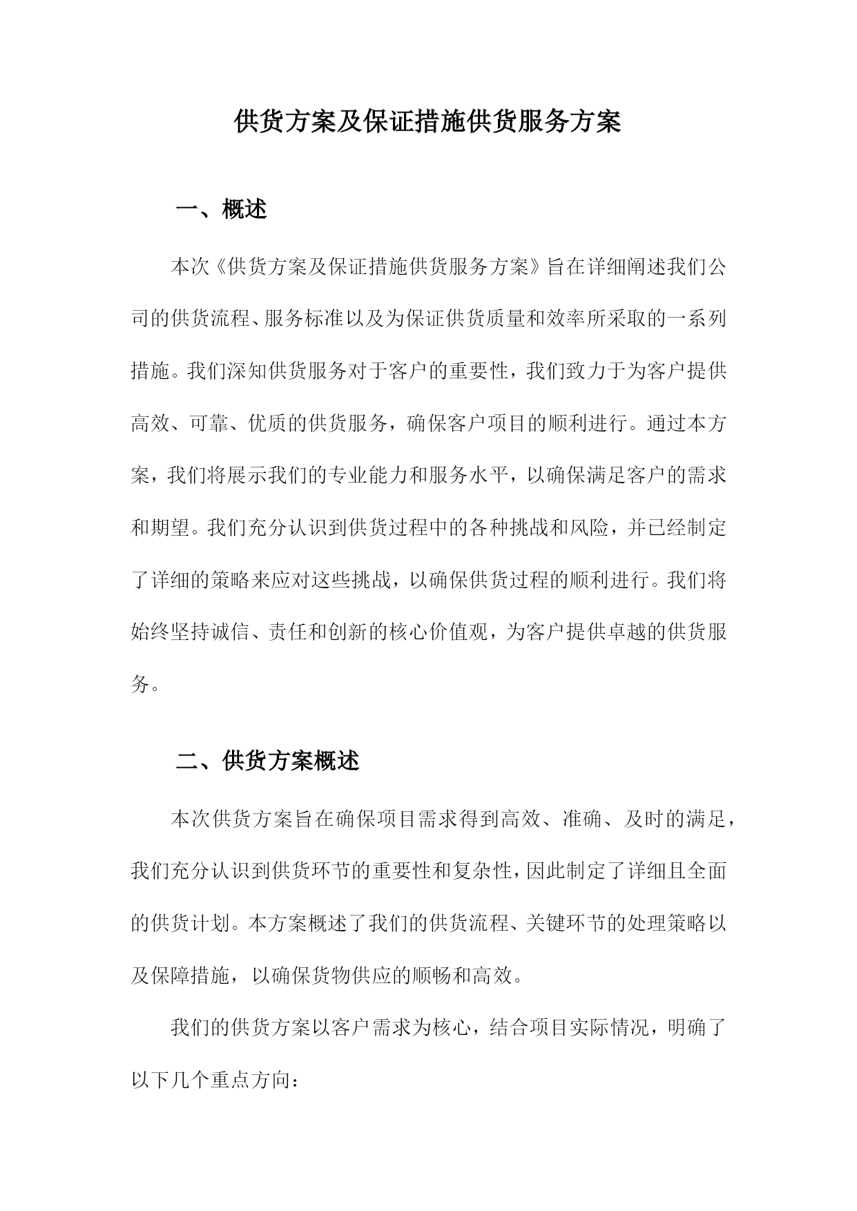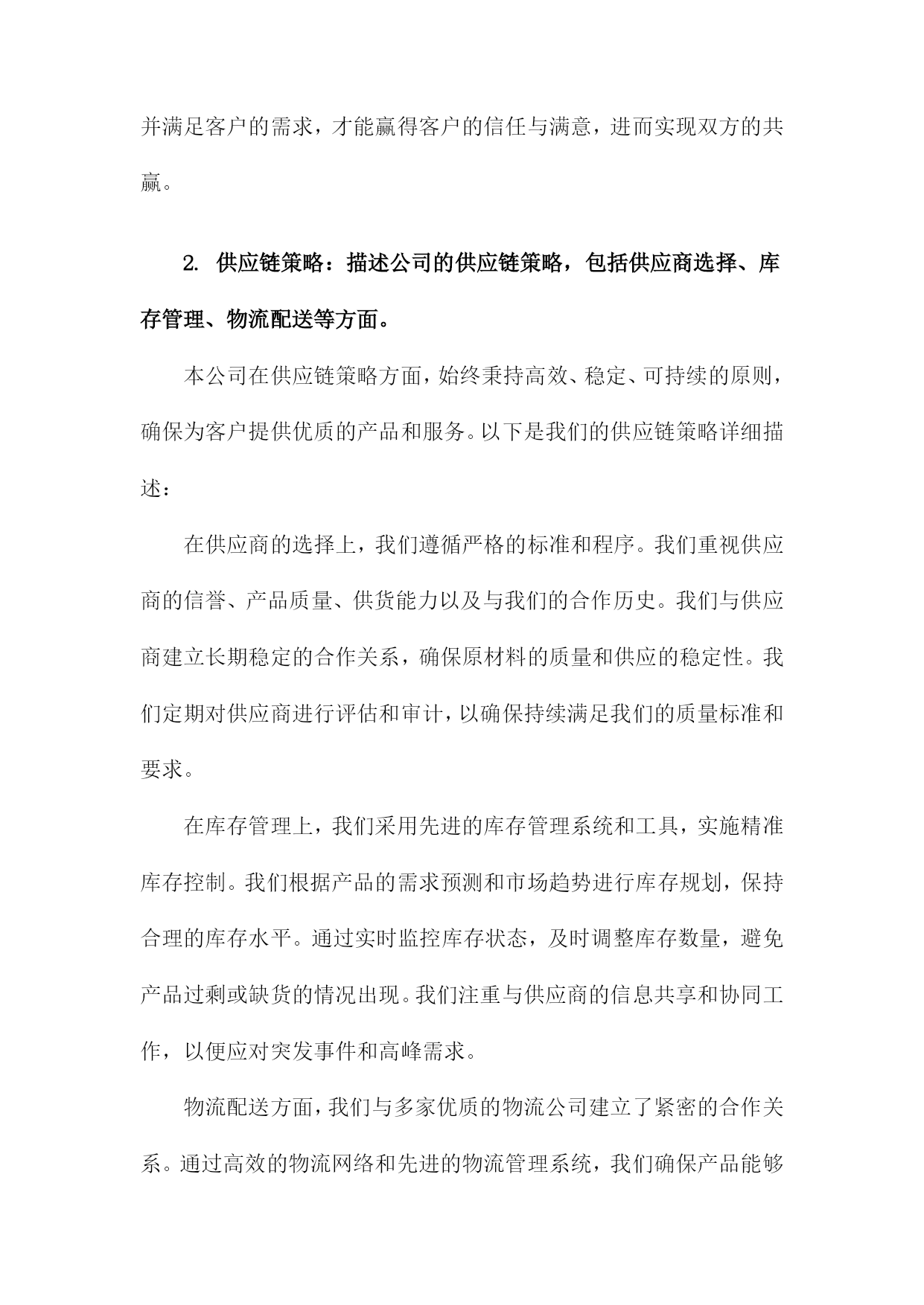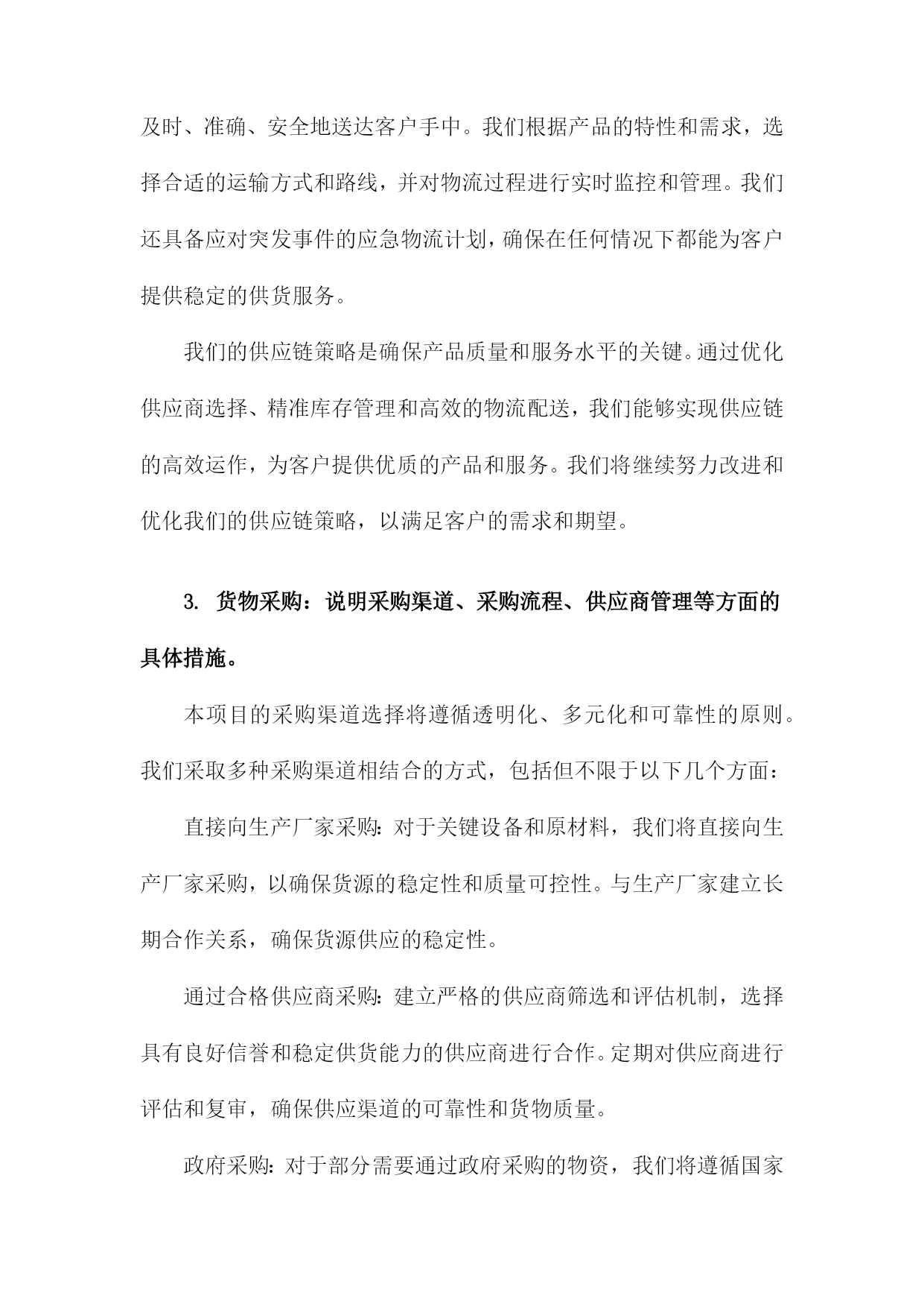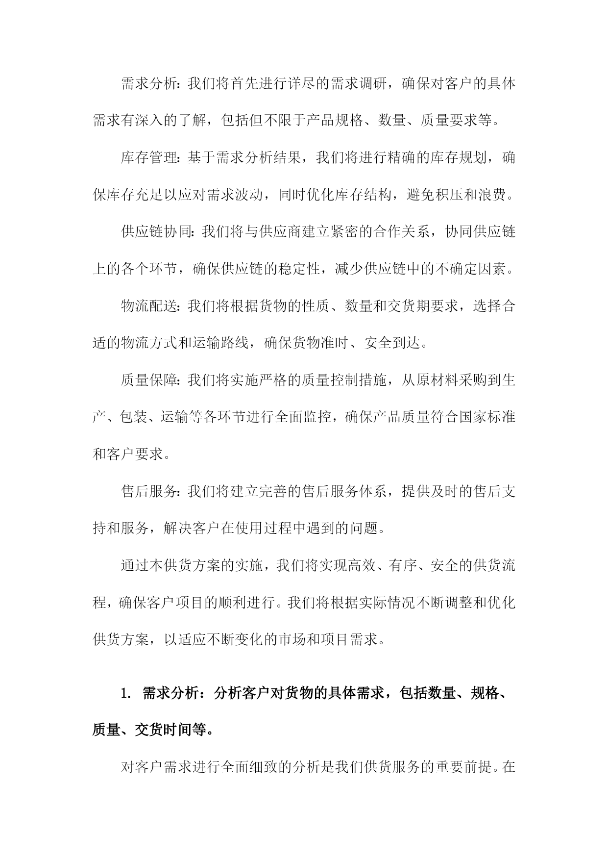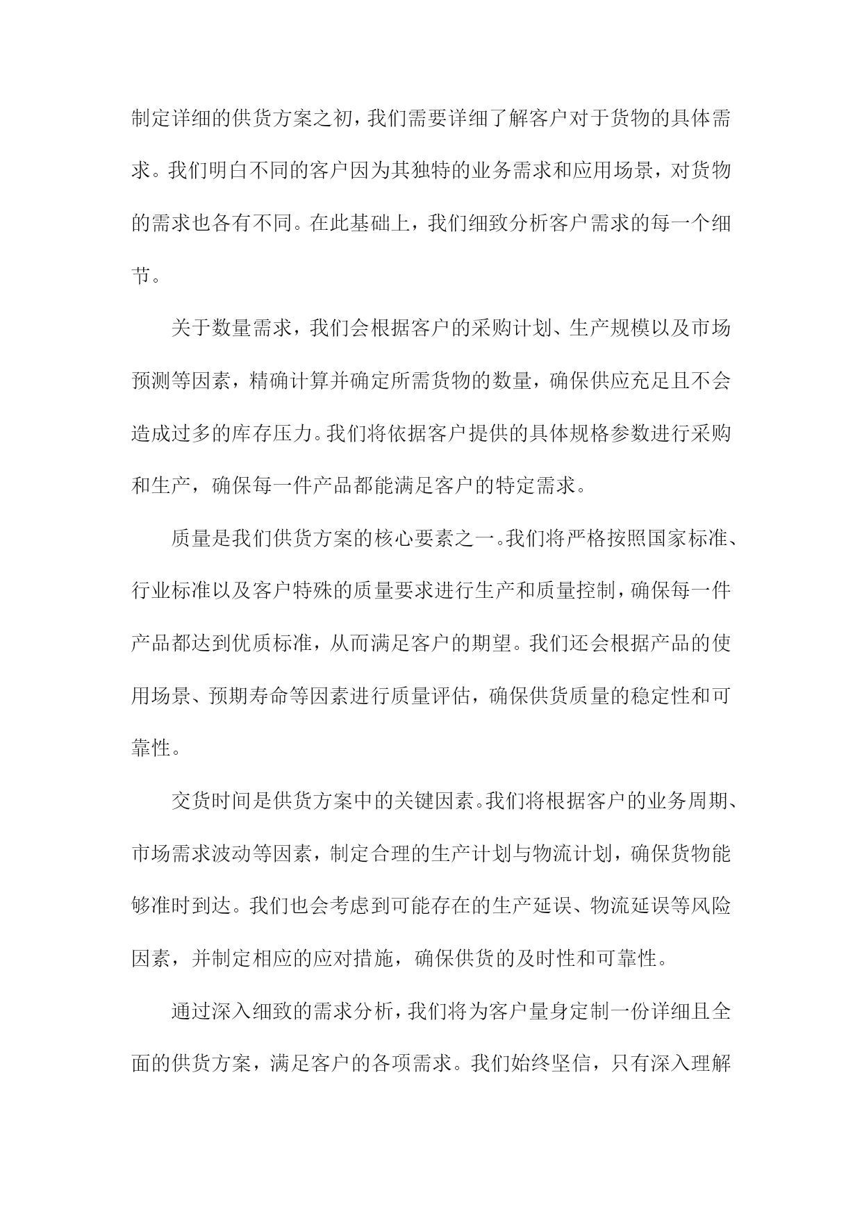 供货方案及保证措施供货服务方案一、概述本次《供货方案及保证措施供货服务方案》旨在详细阐述我们公司的供货流程、服务标准以及为保证供货质量和效率所采取的一系列措施。我们深知供货服务对于客户的重要性,我们致力于为客户提供高效、可靠、优质的供货服务,确保客户项目的顺利进行。通过本方案,我们将展示我们的专业能力和服务水平,以确保满足客户的需求和期望。我们充分认识到供货过程中的各种挑战和风险,并已经制定了详细的策略来应对这些挑战,以确保供货过程的顺利进行。我们将始终坚持诚信、责任和创新的核心价值观,为客户提供卓越的供货服务。二、供货方案概述本次供货方案旨在确保项目需求得到高效、准确、及时的满足,我们充分认识到供货环节的重要性和复杂性,因此制定了详细且全面的供货计划。本方案概述了我们的供货流程、关键环节的处理策略以及保障措施,以确保货物供应的顺畅和高效。我们的供货方案以客户需求为核心,结合项目实际情况,明确了以下几个重点方向:需求分析:我们将首先进行详尽的需求调研,确保对客户的具体需求有深入的了解,包括但不限于产品规格、数量、质量要求等。库存管理:基于需求分析结果,我们将进行精确的库存规划,确保库存充足以应对需求波动,同时优化库存结构,避免积压和浪费。供应链协同:我们将与供应商建立紧密的合作关系,协同供应链上的各个环节,确保供应链的稳定性,减少供应链中的不确定因素。物流配送:我们将根据货物的性质、数量和交货期要求,选择合适的物流方式和运输路线,确保货物准时、安全到达。质量保障:我们将实施严格的质量控制措施,从原材料采购到生产、包装、运输等各环节进行全面监控,确保产品质量符合国家标准和客户要求。售后服务:我们将建立完善的售后服务体系,提供及时的售后支持和服务,解决客户在使用过程中遇到的问题。通过本供货方案的实施,我们将实现高效、有序、安全的供货流程,确保客户项目的顺利进行。我们将根据实际情况不断调整和优化供货方案,以适应不断变化的市场和项目需求。1.需求分析:分析客户对货物的具体需求,包括数量、规格、质量、交货时间等。对客户需求进行全面细致的分析是我们供货服务的重要前提。在制定详细的供货方案之初,我们需要详细了解客户对于货物的具体需求。我们明白不同的客户因为其独特的业务需求和应用场景,对货物的需求也各有不同。在此基础上,我们细致分析客户需求的每一个细节。关于数量需求,我们会根据客户的采购计划、生产规模以及市场预测等因素,精确计算并确定所需货物的数量,确保供应充足且不会造成过多的库存压力。我们将依据客户提供的具体规格参数进行采购和生产,确保每一件产品都能满足客户的特定需求。质量是我们供货方案的核心要素之一。我们将严格按照国家标准、行业标准以及客户特殊的质量要求进行生产和质量控制,确保每一件产品都达到优质标准,从而满足客户的期望。我们还会根据产品的使用场景、预期寿命等因素进行质量评估,确保供货质量的稳定性和可靠性。交货时间是供货方案中的关键因素。我们将根据客户的业务周期、市场需求波动等因素,制定合理的生产计划与物流计划,确保货物能够准时到达。我们也会考虑到可能存在的生产延误、物流延误等风险因素,并制定相应的应对措施,确保供货的及时性和可靠性。通过深入细致的需求分析,我们将为客户量身定制一份详细且全面的供货方案,满足客户的各项需求。我们始终坚信,只有深入理解并满足客户的需求,才能赢得客户的信任与满意,进而实现双方的共赢。2.供应链策略:描述公司的供应链策略,包括供应商选择、库存管理、物流配送等方面。本公司在供应链策略方面,始终秉持高效、稳定、可持续的原则,确保为客户提供优质的产品和服务。以下是我们的供应链策略详细描述:在供应商的选择上,我们遵循严格的标准和程序。我们重视供应商的信誉、产品质量、供货能力以及与我们的合作历史。我们与供应商建立长期稳定的合作关系,确保原材料的质量和供应的稳定性。我们定期对供应商进行评估和审计,以确保持续满足我们的质量标准和要求。在库存管理上,我们采用先进的库存管理系统和工具,实施精准库存控制。我们根据产品的需求预测和市场趋势进行库存规划,保持合理的库存水平。通过实时监控库存状态,及时调整库存数量,避免产品过剩或缺货的情况出现。我们注重与供应商的信息共享和协同工作,以便应对突发事件和高峰需求。物流配送方面,我们与多家优质的物流公司建立了紧密的合作关系。通过高效的物流网络和先进的物流管理系统,我们确保产品能够及时、准确、安全地送达客户手中。我们根据产品的特性和需求,选择合适的运输方式和路线,并对物流过程进行实时监控和管理。我们还具备应对突发事件的应急物流计划,确保在任何情况下都能为客户提供稳定的供货服务。我们的供应链策略是确保产品质量和服务水平的关键。通过优化供应商选择、精准库存管理和高效的物流配送,我们能够实现供应链的高效