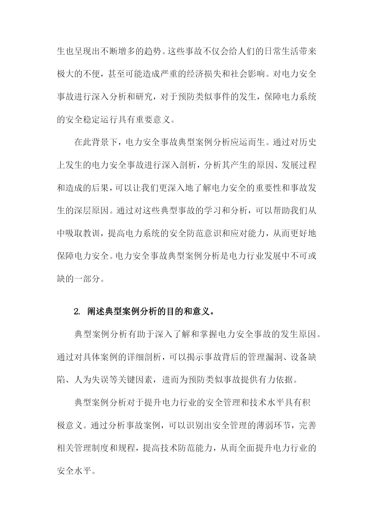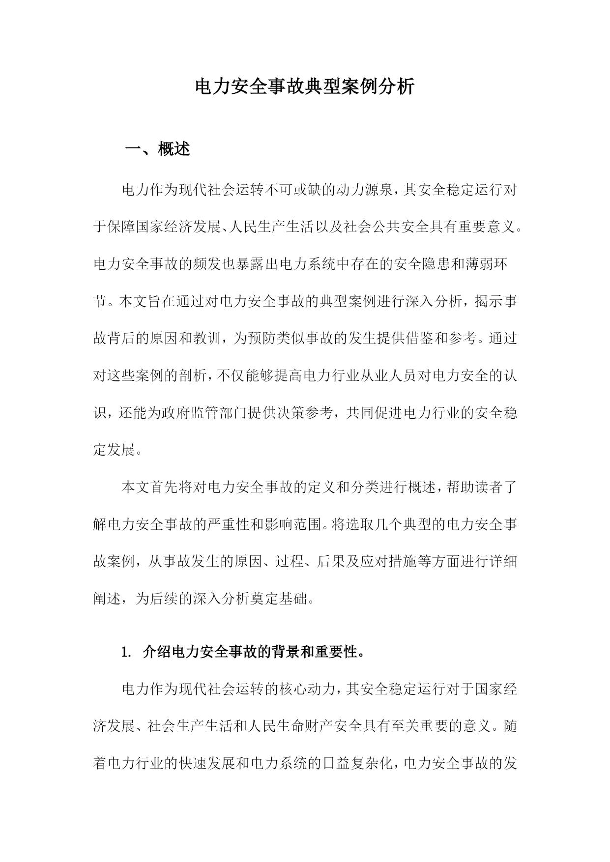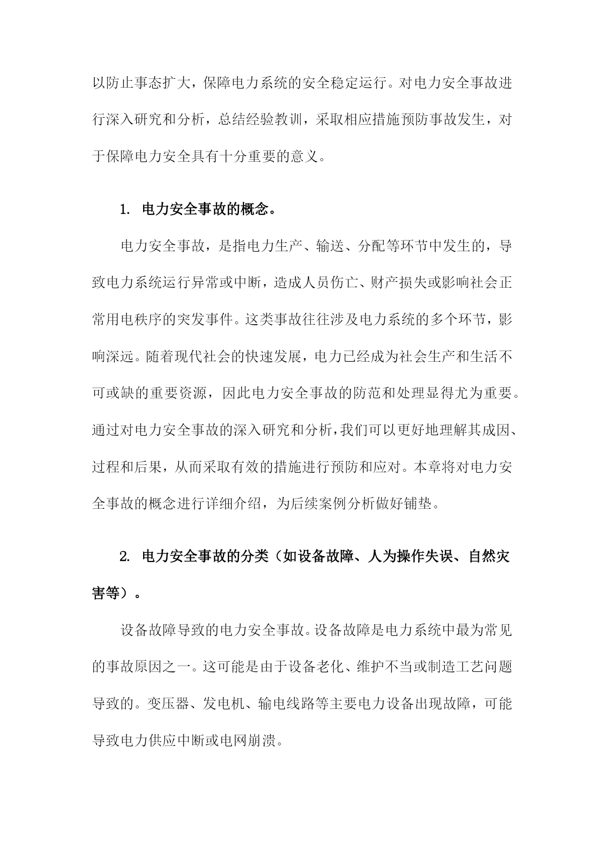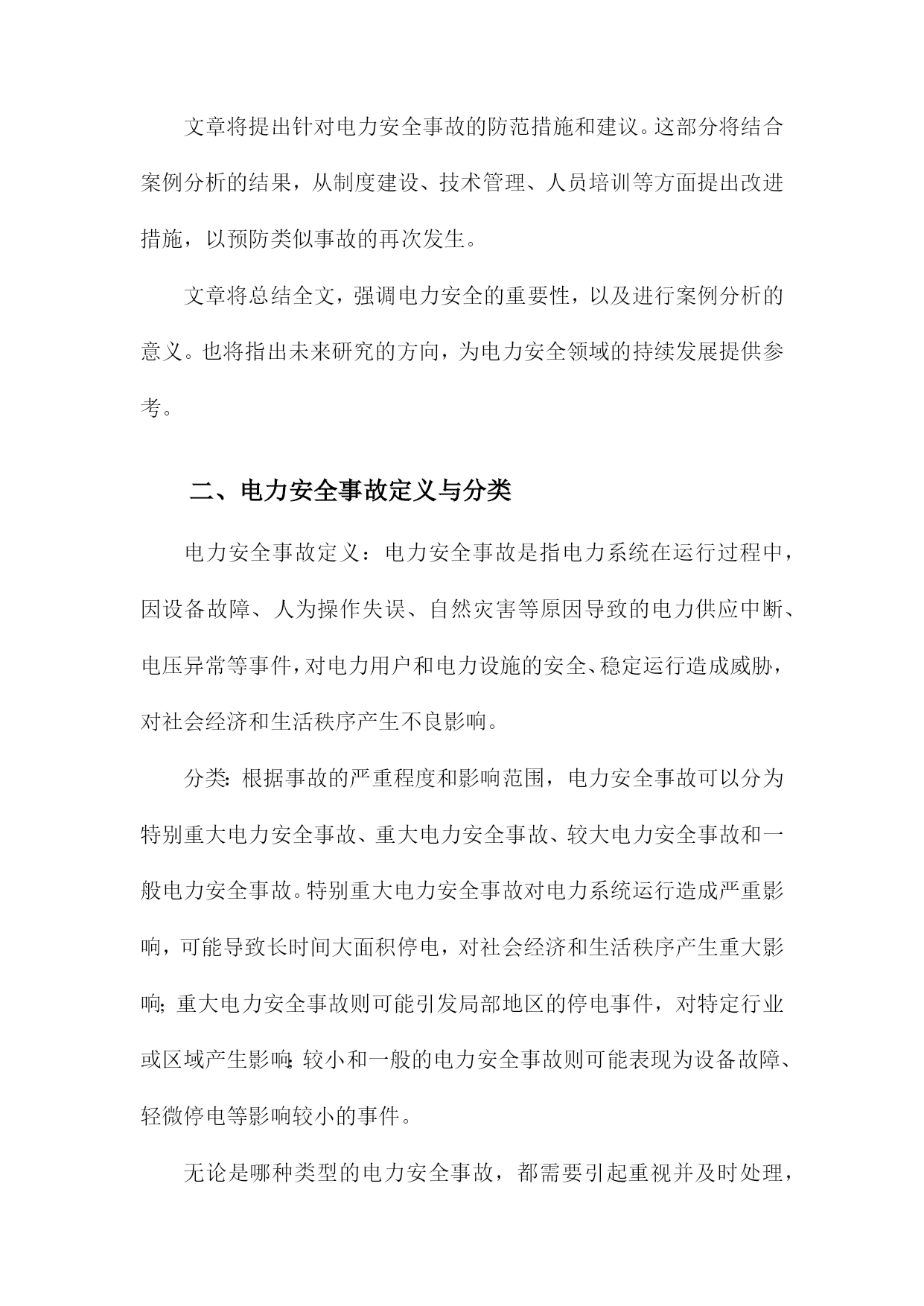 电力安全事故典型案例分析一、概述电力作为现代社会运转不可或缺的动力源泉,其安全稳定运行对于保障国家经济发展、人民生产生活以及社会公共安全具有重要意义。电力安全事故的频发也暴露出电力系统中存在的安全隐患和薄弱环节。本文旨在通过对电力安全事故的典型案例进行深入分析,揭示事故背后的原因和教训,为预防类似事故的发生提供借鉴和参考。通过对这些案例的剖析,不仅能够提高电力行业从业人员对电力安全的认识,还能为政府监管部门提供决策参考,共同促进电力行业的安全稳定发展。本文首先将对电力安全事故的定义和分类进行概述,帮助读者了解电力安全事故的严重性和影响范围。将选取几个典型的电力安全事故案例,从事故发生的原因、过程、后果及应对措施等方面进行详细阐述,为后续的深入分析奠定基础。1.介绍电力安全事故的背景和重要性。电力作为现代社会运转的核心动力,其安全稳定运行对于国家经济发展、社会生产生活和人民生命财产安全具有至关重要的意义。随着电力行业的快速发展和电力系统的日益复杂化,电力安全事故的发生也呈现出不断增多的趋势。这些事故不仅会给人们的日常生活带来极大的不便,甚至可能造成严重的经济损失和社会影响。对电力安全事故进行深入分析和研究,对于预防类似事件的发生,保障电力系统的安全稳定运行具有重要意义。在此背景下,电力安全事故典型案例分析应运而生。通过对历史上发生的电力安全事故进行深入剖析,分析其产生的原因、发展过程和造成的后果,可以让我们更深入地了解电力安全的重要性和事故发生的深层原因。通过对这些典型事故的学习和分析,可以帮助我们从中吸取教训,提高电力系统的安全防范意识和应对能力,从而更好地保障电力安全。电力安全事故典型案例分析是电力行业发展中不可或缺的一部分。2.阐述典型案例分析的目的和意义。典型案例分析有助于深入了解和掌握电力安全事故的发生原因。通过对具体案例的详细剖析,可以揭示事故背后的管理漏洞、设备缺陷、人为失误等关键因素,进而为预防类似事故提供有力依据。典型案例分析对于提升电力行业的安全管理和技术水平具有积极意义。通过分析事故案例,可以识别出安全管理的薄弱环节,完善相关管理制度和规程,提高技术防范能力,从而全面提升电力行业的安全水平。典型案例分析有助于为相关企业和人员提供宝贵经验。通过总结事故教训,可以让企业和人员认识到自身可能存在的风险隐患,学会如何识别、评估和应对风险,提高应对电力安全事故的能力。典型案例分析对于推动电力行业的可持续发展具有重要意义。电力安全是电力行业发展的基础,通过对典型事故案例的分析,可以为行业提供改进方向,促进电力行业的健康、稳定、可持续发展。典型案例分析在电力安全事故研究中具有重要的目的和意义,不仅有助于深入了解事故原因,提升安全管理和技术水平,还能为相关企业和人员提供宝贵经验,推动电力行业的可持续发展。3.简述文章结构和内容安排。文章将概述电力安全事故的严重性及其对社会和经济的影响,以及为何进行典型案例分析的重要性。将进入案例分析的核心部分。文章将介绍几起典型的电力安全事故案例,包括事故的基本情况、发生的原因、造成的后果等。这些案例将涵盖设计、运行、管理等多个方面的失误,以展示电力安全事故的多样性和复杂性。将对这些典型案例进行深入分析。文章将探讨事故发生的深层次原因,包括管理不善、设备老化、人为操作失误等因素。还将分析事故处理过程中的经验和教训,以及事故对电力企业运营和公众生活的影响。文章将提出针对电力安全事故的防范措施和建议。这部分将结合案例分析的结果,从制度建设、技术管理、人员培训等方面提出改进措施,以预防类似事故的再次发生。文章将总结全文,强调电力安全的重要性,以及进行案例分析的意义。也将指出未来研究的方向,为电力安全领域的持续发展提供参考。二、电力安全事故定义与分类电力安全事故定义:电力安全事故是指电力系统在运行过程中,因设备故障、人为操作失误、自然灾害等原因导致的电力供应中断、电压异常等事件,对电力用户和电力设施的安全、稳定运行造成威胁,对社会经济和生活秩序产生不良影响。分类:根据事故的严重程度和影响范围,电力安全事故可以分为特别重大电力安全事故、重大电力安全事故、较大电力安全事故和一般电力安全事故。特别重大电力安全事故对电力系统运行造成严重影响,可能导致长时间大面积停电,对社会经济和生活秩序产生重大影响;重大电力安全事故则可能引发局部地区的停电事件,对特定行业或区域产生影响;较小和一般的电力安全事故则可能表现为设备故障、轻微停电等影响较小的事件。无论是哪种类型的电力安全事故,都需要引起重视并及时处理,以防止事态扩大,保障电力系统的安全稳定运行。对电力安全事故进行深入研究和分析,总结经验教训,采取相应措施预防事故发生,对于保障电力安全具有十分重要的意义。1.电力安全事故的概念。电力安全事故,是指电力生产、输送、