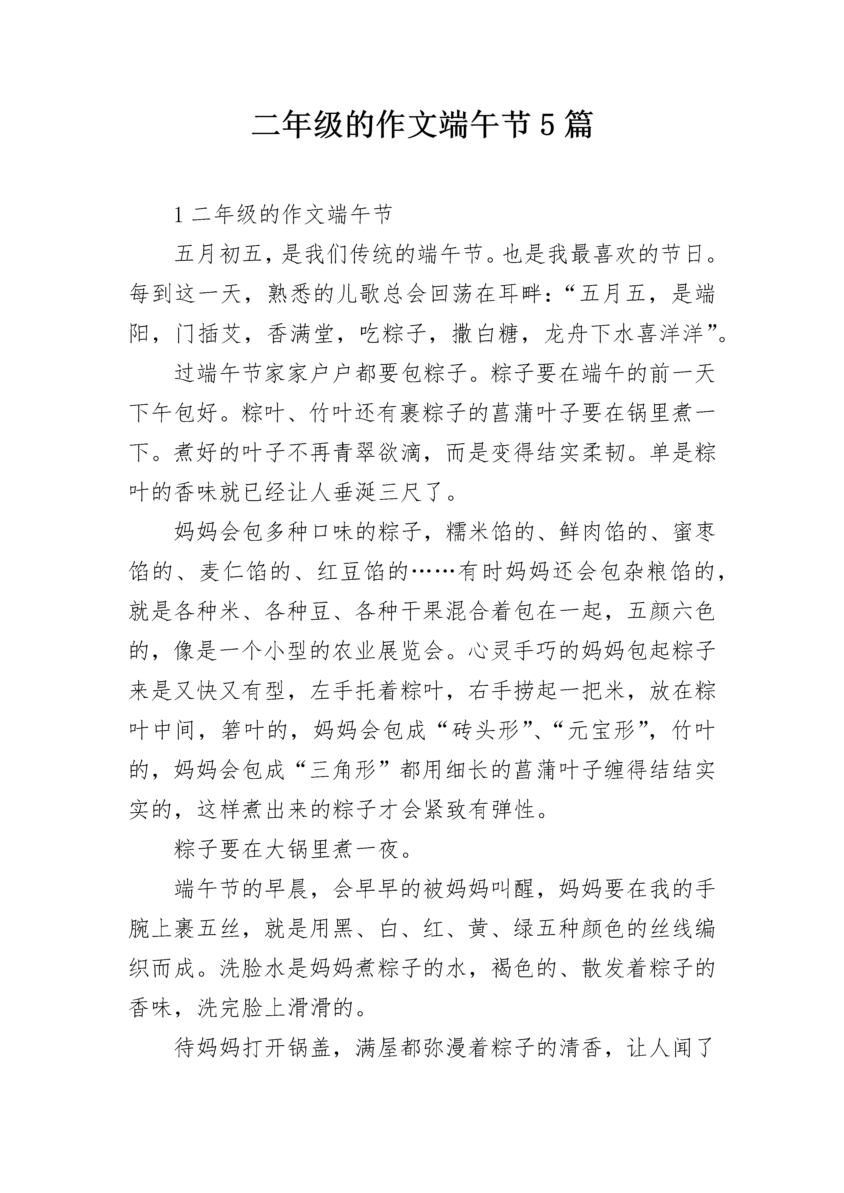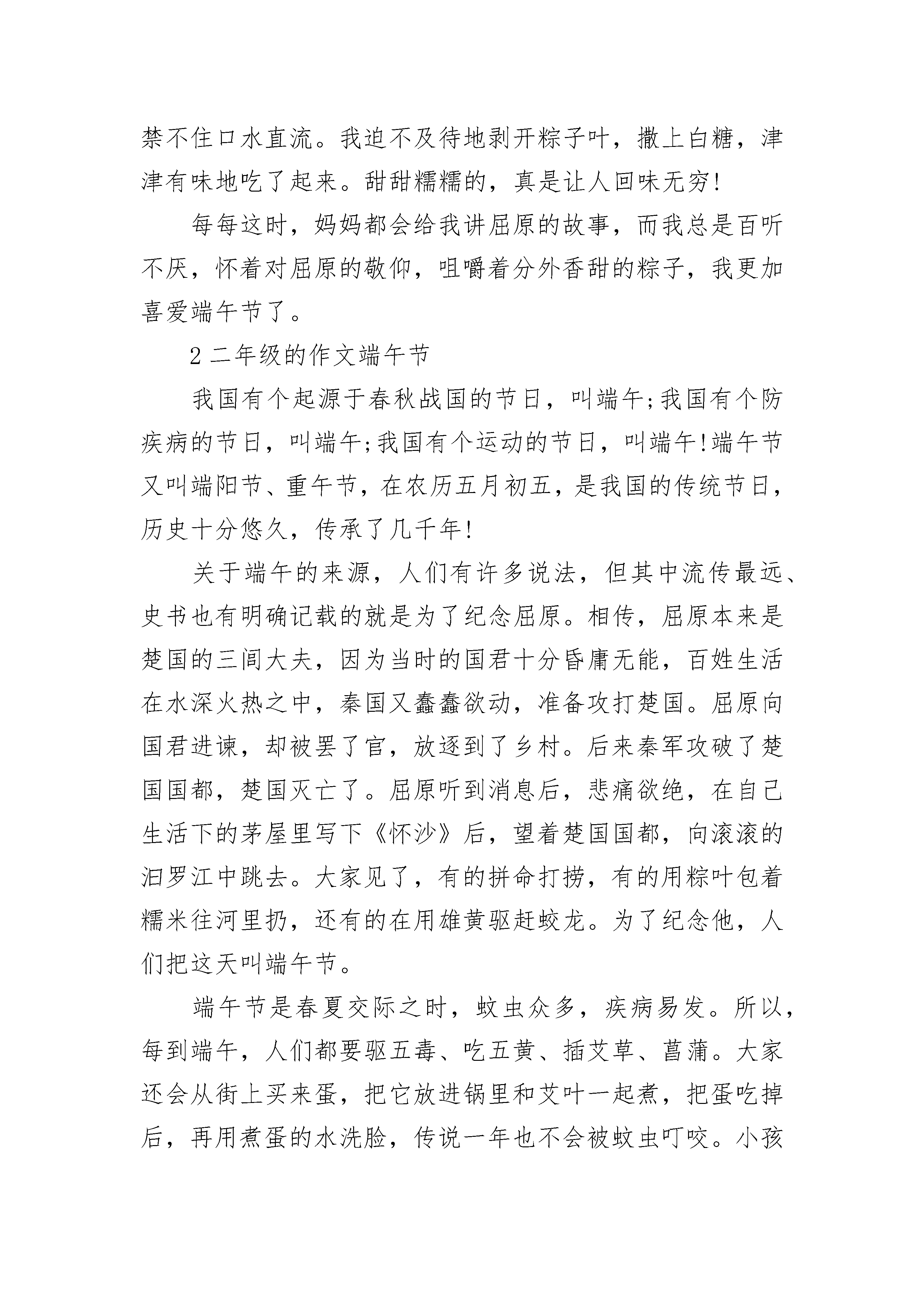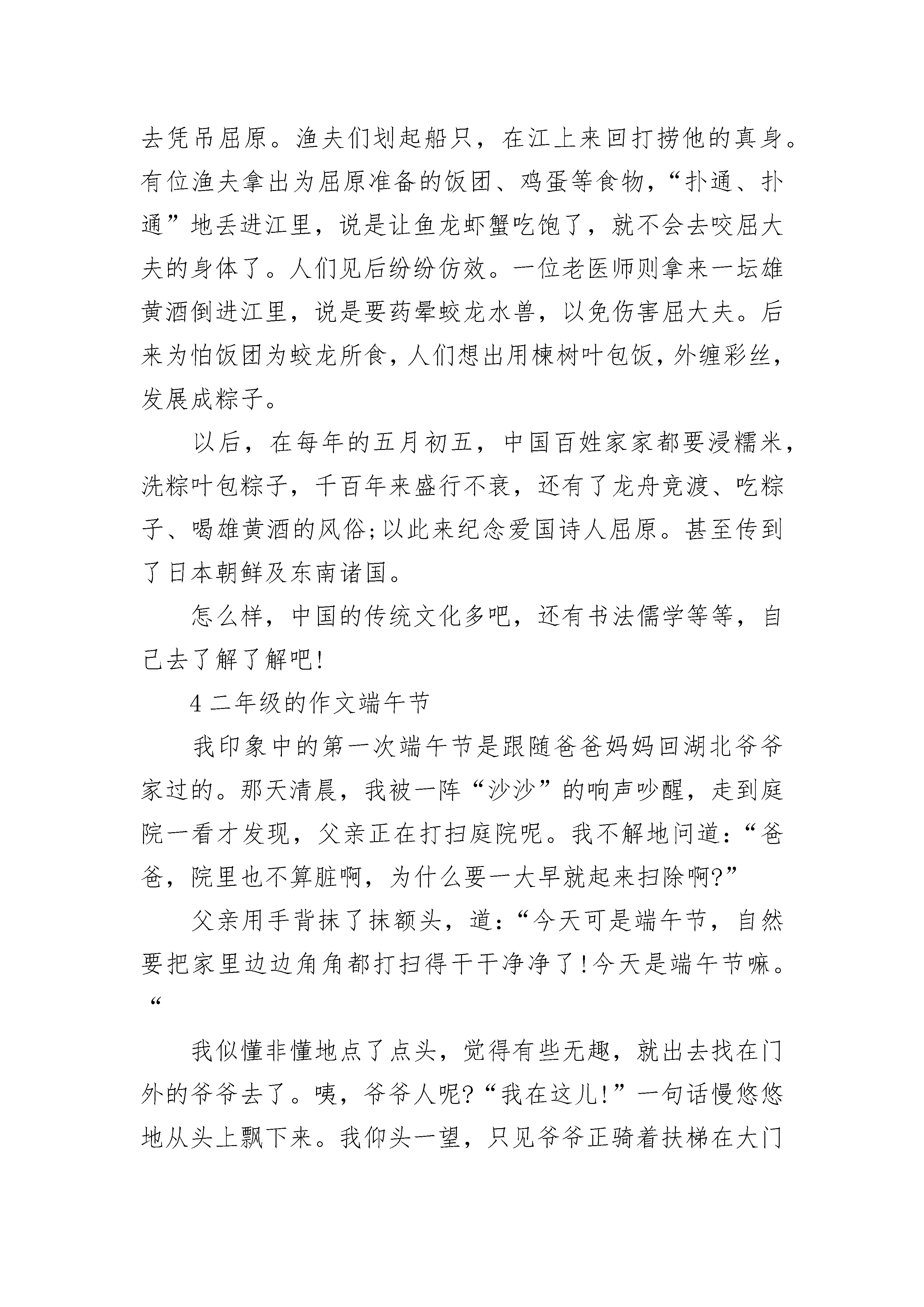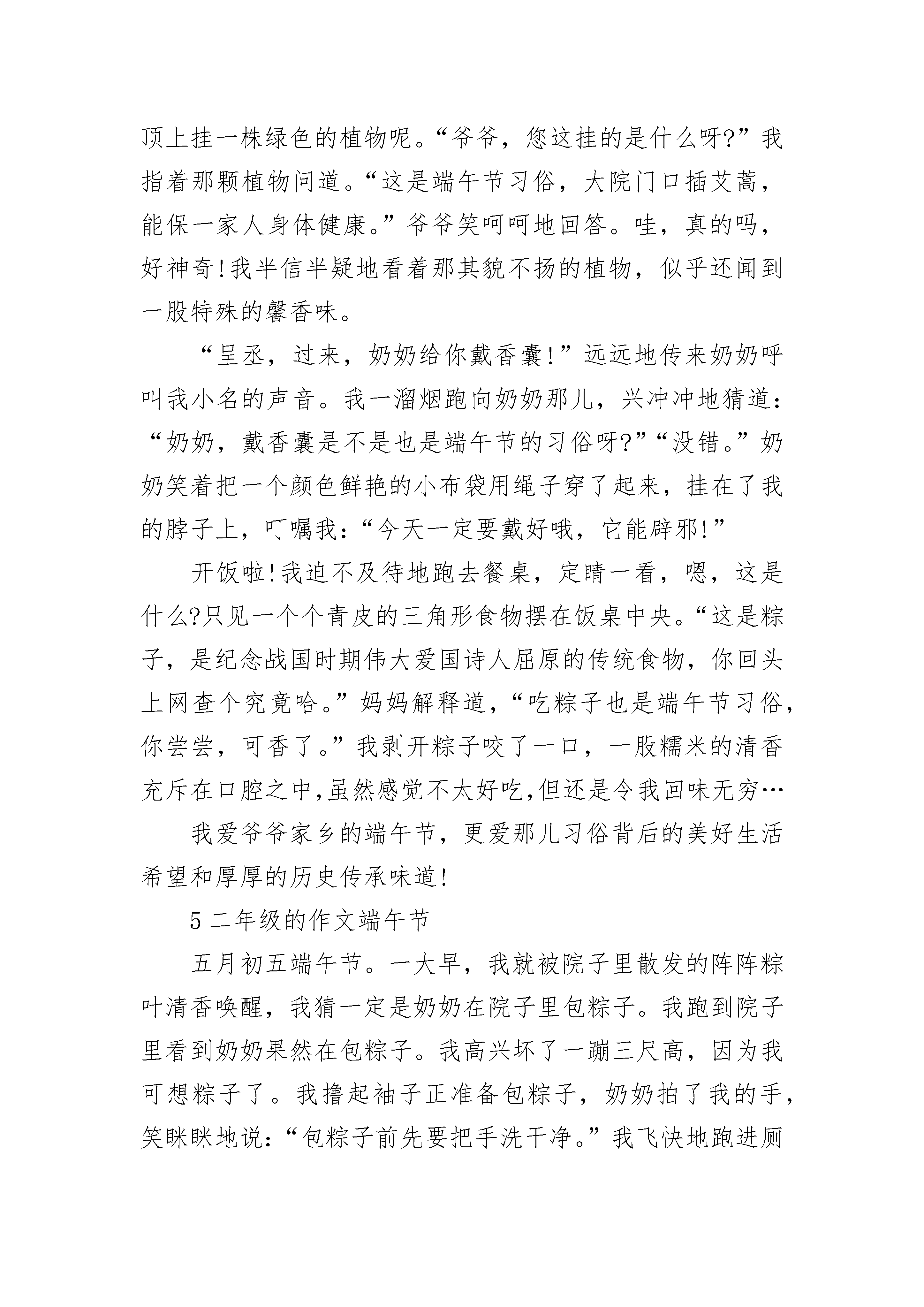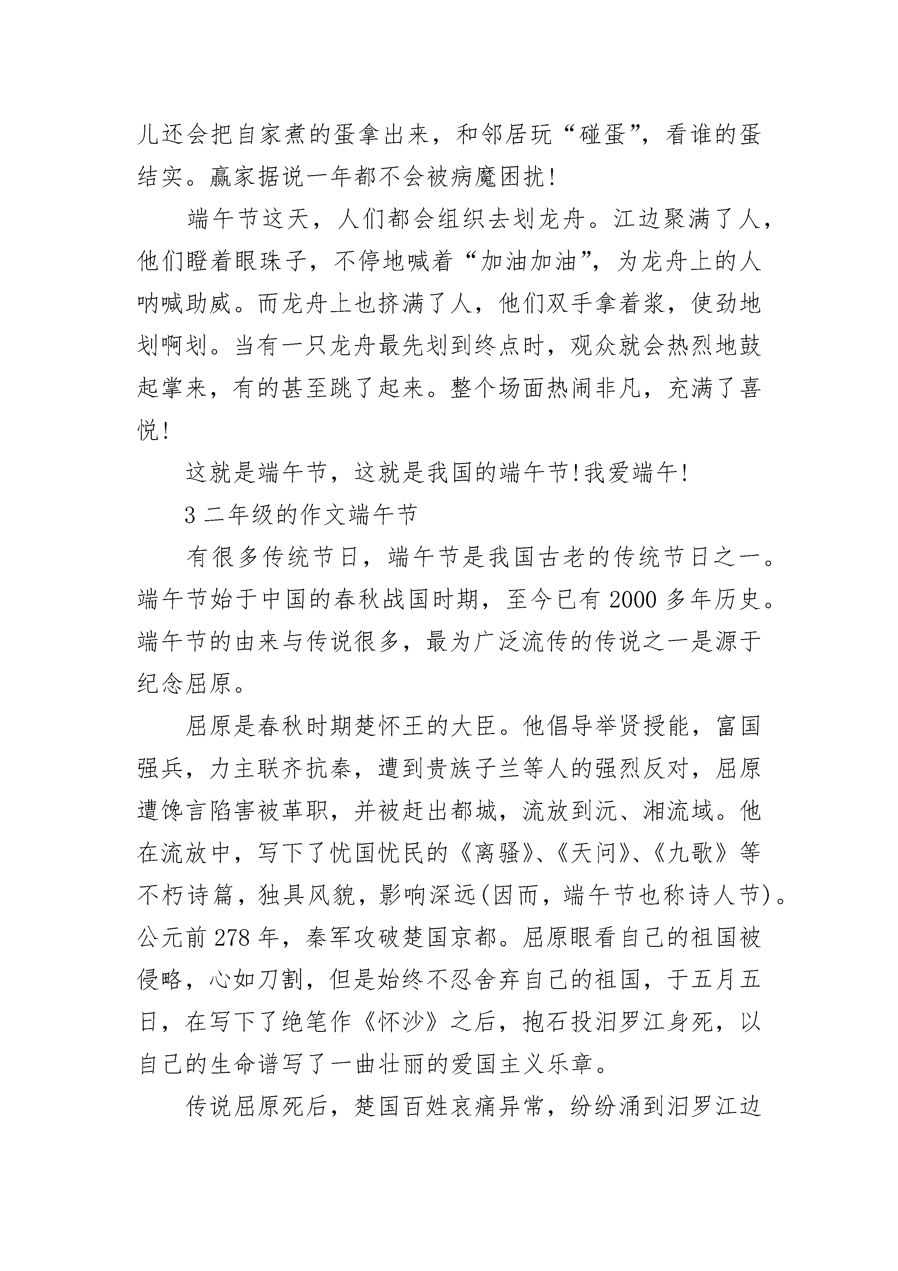 二年级的作文端午节5篇1二年级的作文端午节五月初五,是我们传统的端午节。也是我最喜欢的节日。每到这一天,熟悉的儿歌总会回荡在耳畔:“五月五,是端阳,门插艾,香满堂,吃粽子,撒白糖,龙舟下水喜洋洋”。过端午节家家户户都要包粽子。粽子要在端午的前一天下午包好。粽叶、竹叶还有裹粽子的菖蒲叶子要在锅里煮一下。煮好的叶子不再青翠欲滴,而是变得结实柔韧。单是粽叶的香味就已经让人垂涎三尺了。妈妈会包多种口味的粽子,糯米馅的、鲜肉馅的、蜜枣馅的、麦仁馅的、红豆馅的……有时妈妈还会包杂粮馅的,就是各种米、各种豆、各种干果混合着包在一起,五颜六色的,像是一个小型的农业展览会。心灵手巧的妈妈包起粽子来是又快又有型,左手托着粽叶,右手捞起一把米,放在粽叶中间,箬叶的,妈妈会包成“砖头形”、“元宝形”,竹叶的,妈妈会包成“三角形”都用细长的菖蒲叶子缠得结结实实的,这样煮出来的粽子才会紧致有弹性。粽子要在大锅里煮一夜。端午节的早晨,会早早的被妈妈叫醒,妈妈要在我的手腕上裹五丝,就是用黑、白、红、黄、绿五种颜色的丝线编织而成。洗脸水是妈妈煮粽子的水,褐色的、散发着粽子的香味,洗完脸上滑滑的。待妈妈打开锅盖,满屋都弥漫着粽子的清香,让人闻了禁不住口水直流。我迫不及待地剥开粽子叶,撒上白糖,津津有味地吃了起来。甜甜糯糯的,真是让人回味无穷!每每这时,妈妈都会给我讲屈原的故事,而我总是百听不厌,怀着对屈原的敬仰,咀嚼着分外香甜的粽子,我更加喜爱端午节了。2二年级的作文端午节我国有个起源于春秋战国的节日,叫端午;我国有个防疾病的节日,叫端午;我国有个运动的节日,叫端午!端午节又叫端阳节、重午节,在农历五月初五,是我国的传统节日,历史十分悠久,传承了几千年!关于端午的来源,人们有许多说法,但其中流传最远、史书也有明确记载的就是为了纪念屈原。相传,屈原本来是楚国的三闾大夫,因为当时的国君十分昏庸无能,百姓生活在水深火热之中,秦国又蠢蠢欲动,准备攻打楚国。屈原向国君进谏,却被罢了官,放逐到了乡村。后来秦军攻破了楚国国都,楚国灭亡了。屈原听到消息后,悲痛欲绝,在自己生活下的茅屋里写下《怀沙》后,望着楚国国都,向滚滚的汩罗江中跳去。大家见了,有的拼命打捞,有的用粽叶包着糯米往河里扔,还有的在用雄黄驱赶蛟龙。为了纪念他,人们把这天叫端午节。端午节是春夏交际之时,蚊虫众多,疾病易发。所以,每到端午,人们都要驱五毒、吃五黄、插艾草、菖蒲。大家还会从街上买来蛋,把它放进锅里和艾叶一起煮,把蛋吃掉后,再用煮蛋的水洗脸,传说一年也不会被蚊虫叮咬。小孩儿还会把自家煮的蛋拿出来,和邻居玩“碰蛋”,看谁的蛋结实。赢家据说一年都不会被病魔困扰!端午节这天,人们都会组织去划龙舟。江边聚满了人,他们瞪着眼珠子,不停地喊着“加油加油”,为龙舟上的人呐喊助威。而龙舟上也挤满了人,他们双手拿着浆,使劲地划啊划。当有一只龙舟最先划到终点时,观众就会热烈地鼓起掌来,有的甚至跳了起来。整个场面热闹非凡,充满了喜悦!这就是端午节,这就是我国的端午节!我爱端午!3二年级的作文端午节有很多传统节日,端午节是我国古老的传统节日之一。端午节始于中国的春秋战国时期,至今已有2000多年历史。端午节的由来与传说很多,最为广泛流传的传说之一是源于纪念屈原。屈原是春秋时期楚怀王的大臣。他倡导举贤授能,富国强兵,力主联齐抗秦,遭到贵族子兰等人的强烈反对,屈原遭馋言陷害被革职,并被赶出都城,流放到沅、湘流域。他在流放中,写下了忧国忧民的《离骚》、《天问》、《九歌》等不朽诗篇,独具风貌,影响深远(因而,端午节也称诗人节)。公元前278年,秦军攻破楚国京都。屈原眼看自己的祖国被侵略,心如刀割,但是始终不忍舍弃自己的祖国,于五月五日,在写下了绝笔作《怀沙》之后,抱石投汨罗江身死,以自己的生命谱写了一曲壮丽的爱国主义乐章。传说屈原死后,楚国百姓哀痛异常,纷纷涌到汨罗江边去凭吊屈原。渔夫们划起船只,在江上来回打捞他的真身。有位渔夫拿出为屈原准备的饭团、鸡蛋等食物,“扑通、扑通”地丢进江里,说是让鱼龙虾蟹吃饱了,就不会去咬屈大夫的身体了。人们见后纷纷仿效。一位老医师则拿来一坛雄黄酒倒进江里,说是要药晕蛟龙水兽,以免伤害屈大夫。后来为怕饭团为蛟龙所食,人们想出用楝树叶包饭,外缠彩丝,发展成粽子。以后,在每年的五月初五,中国百姓家家都要浸糯米,洗粽叶包粽子,千百年来盛行不衰,还有了龙舟竞渡、吃粽子、喝雄黄酒的风俗;以此来纪念爱国诗人屈原。甚至传到了日本朝鲜及东南诸国。怎么样,中国的传统文化多吧,还有书法儒学等等,自己去了解了解吧!4二年级的作文端午节我印象中的第一次端午节是跟随爸爸妈妈回湖北爷爷家过的。那天清晨,我被一阵“沙沙”的响声吵醒,走到庭院一看才发现,父亲正在打扫庭院呢。我不解地问道:“爸爸,院里也不算脏啊,为什么要一大早就起来扫除啊