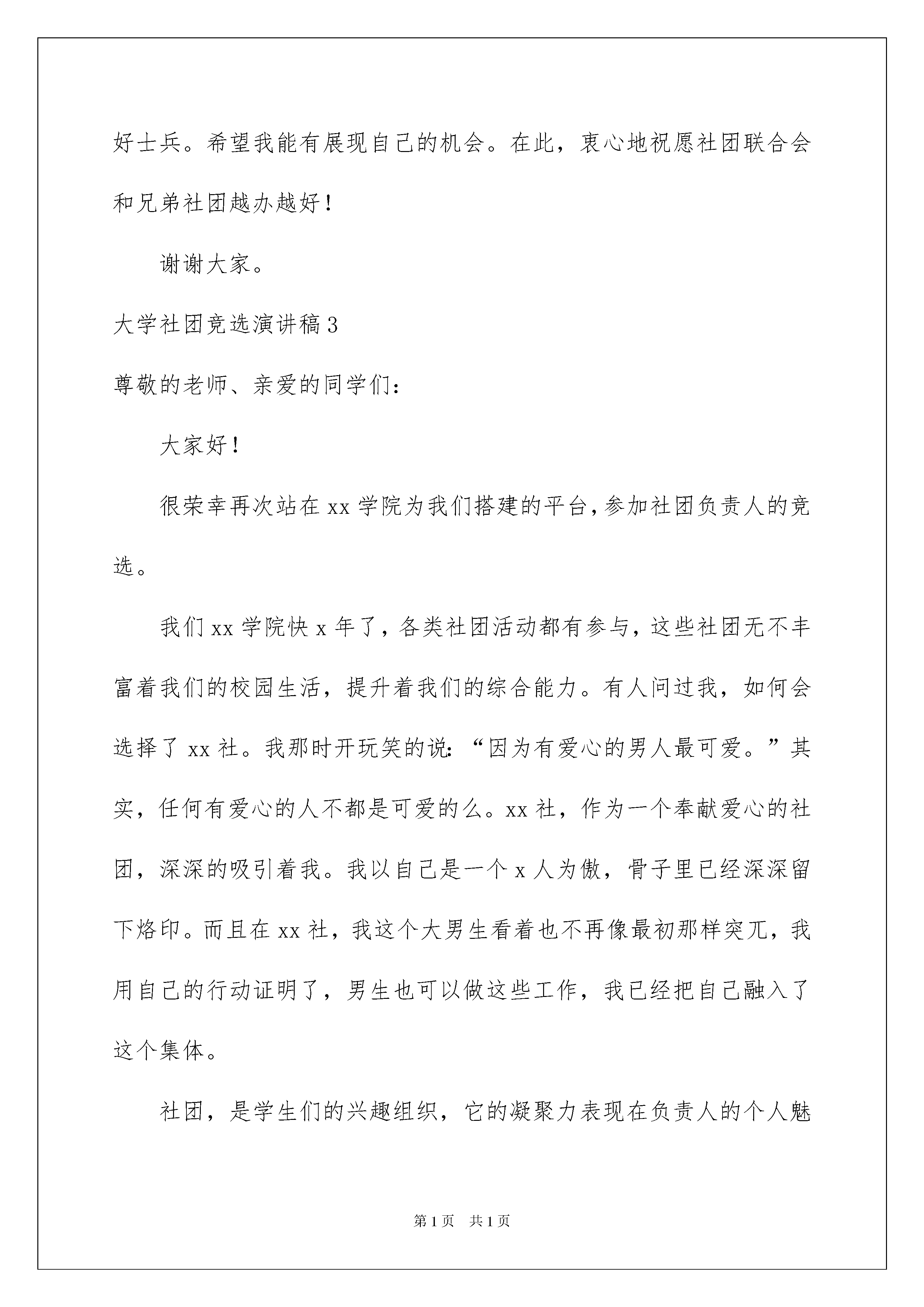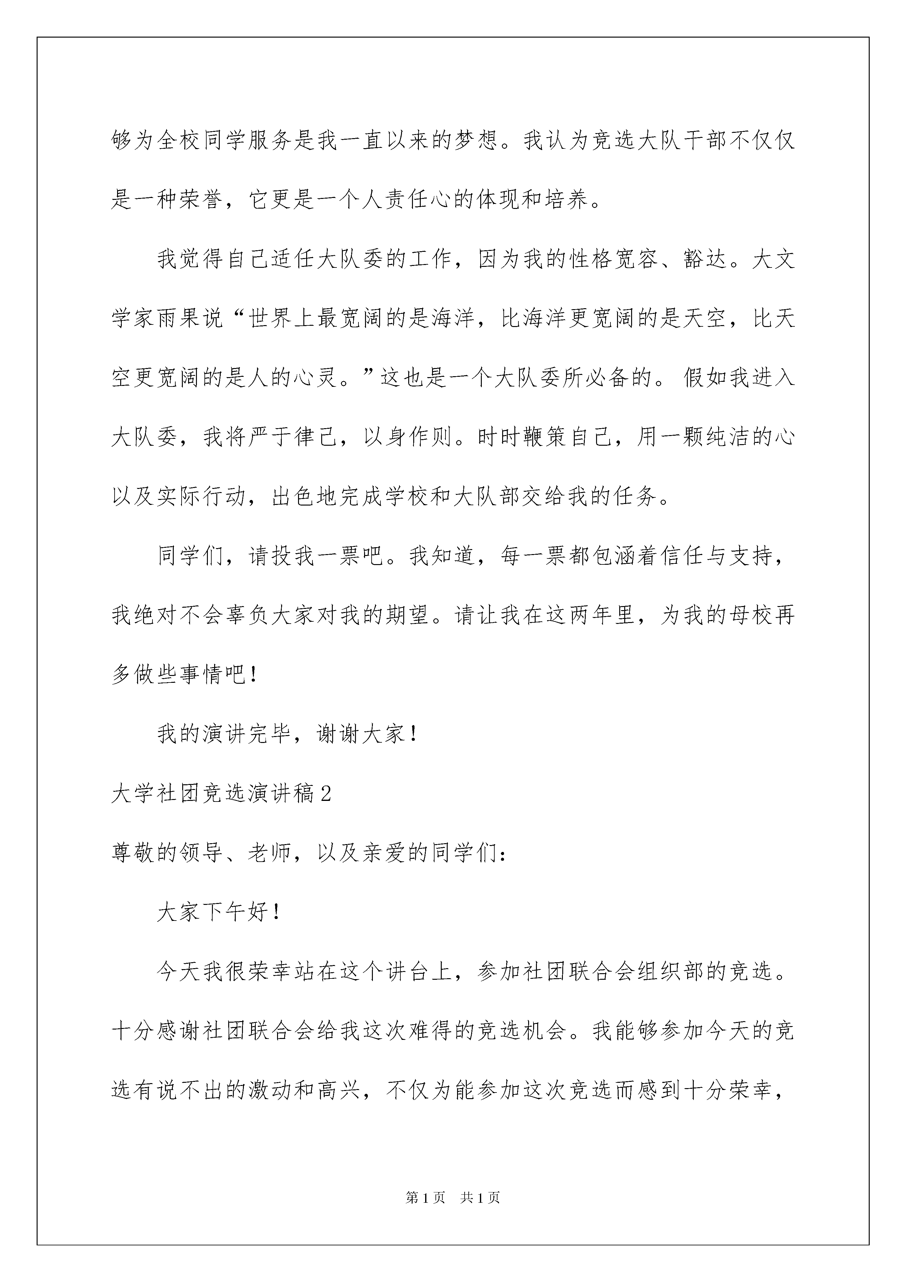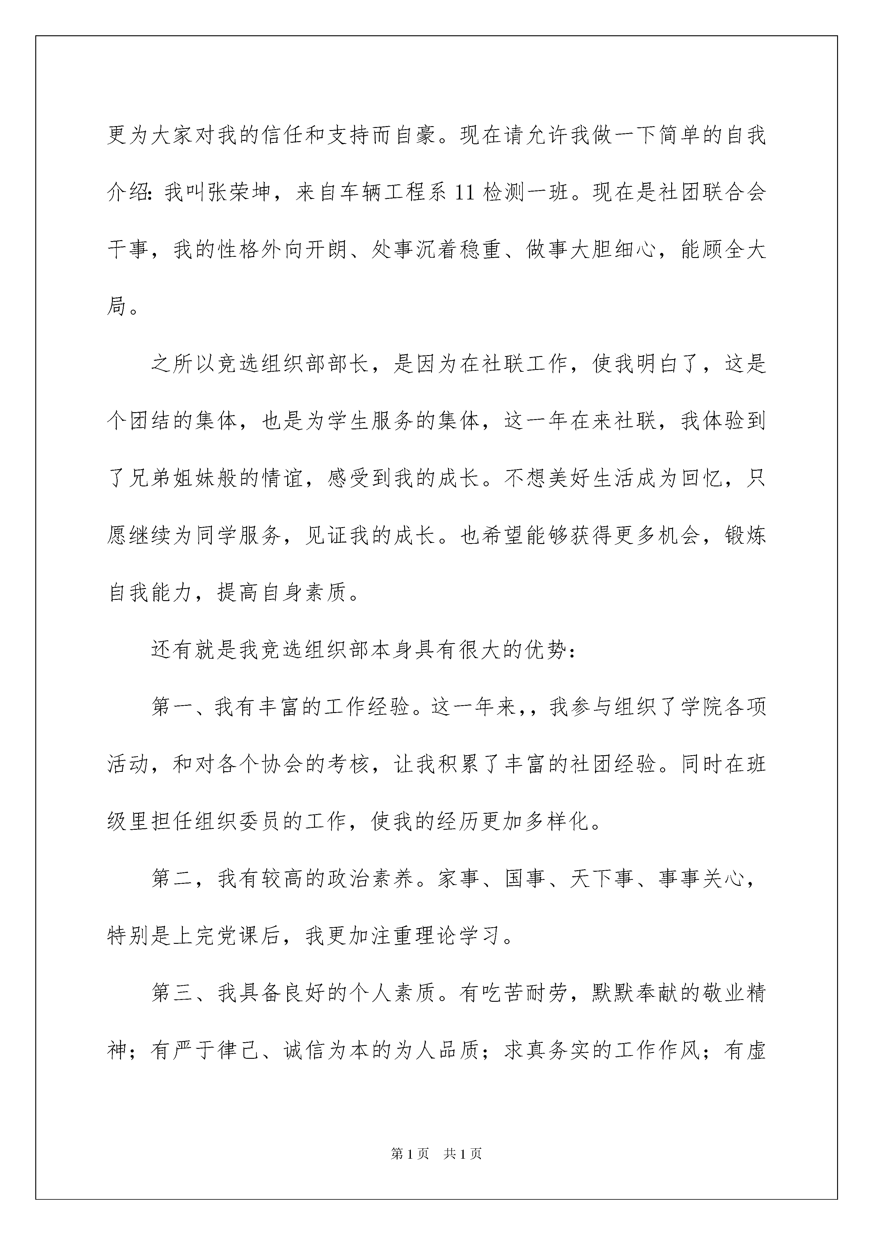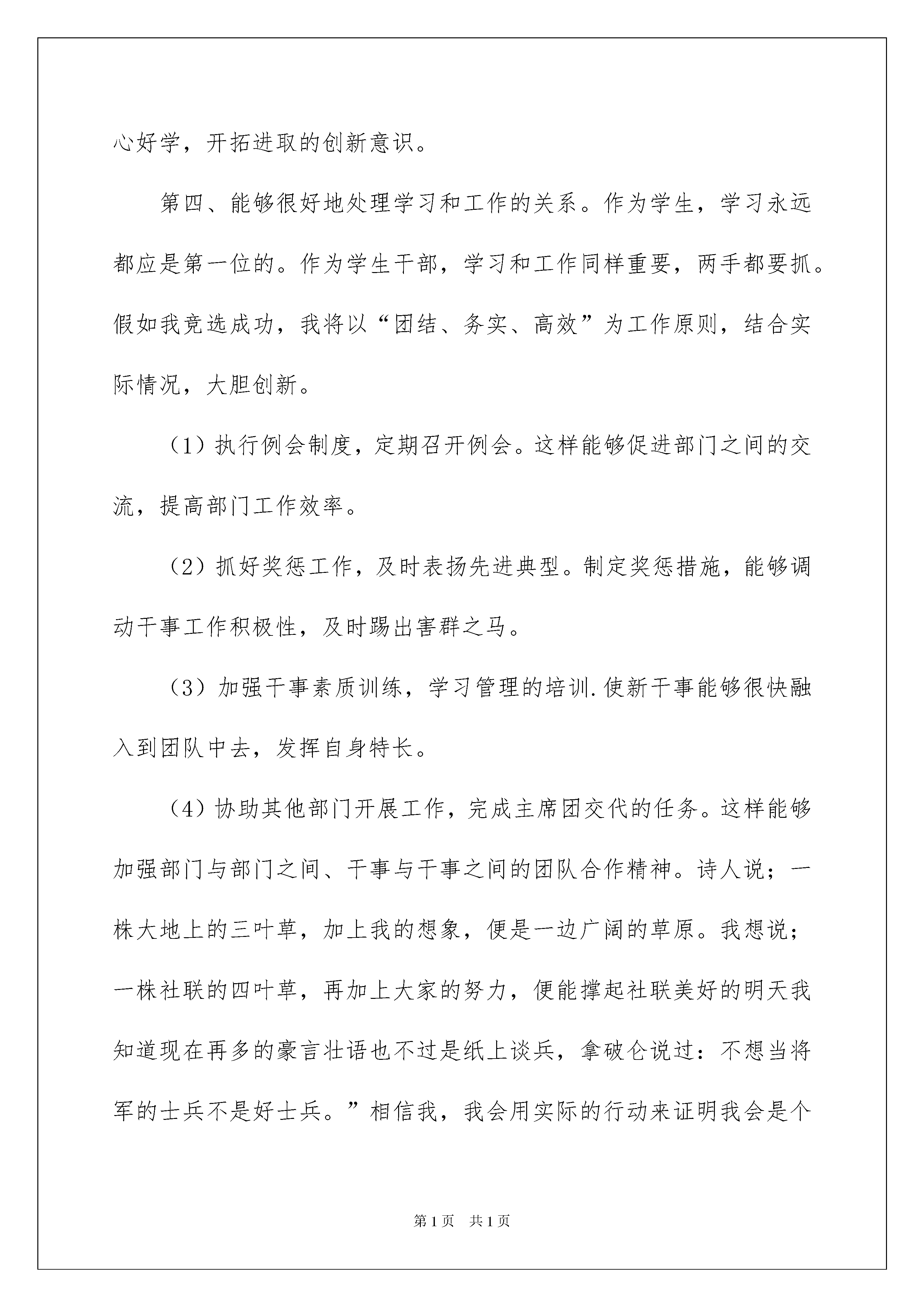 2022大学社团竞选演讲稿15篇大学社团竞选演讲稿15篇演讲稿具有观点鲜明,内容具有鼓动性的特点。在当下社会,很多地方都会使用到演讲稿,那么你有了解过演讲稿吗?以下是我为大家整理的大学社团竞选演讲稿,欢迎大家借鉴与参考,希望对大家有所帮助。大学社团竞选演讲稿1尊敬的老师、亲爱的同学:大家好!我是来自五一班的马姝涵。在这秋高气爽的季节我们又迎来了新的学期,同时也迎来了学校一年一度的少先队大队委竞选活动。我竞选的职务是组织部部长。我是一个活泼、开朗、充满自信的女孩子。今天我能站在这里,是因为我的实力得到了老师和同学们的肯定。我相信自己是非常合适的人选,因为:我有很强的责任心和使命感,珍惜集体每一分荣誉,愿意为大家服务。我在老师的教导下,在同学们的帮助支持下,我已当了四年的班干部,从中也积累了一些经验。能够为全校同学服务是我一直以来的梦想。我认为竞选大队干部不仅仅是一种荣誉,它更是一个人责任心的体现和培养。我觉得自己适任大队委的工作,因为我的性格宽容、豁达。大文学家雨果说“世界上最宽阔的是海洋,比海洋更宽阔的是天空,比天空更宽阔的是人的心灵。”这也是一个大队委所必备的。假如我进入大队委,我将严于律己,以身作则。时时鞭策自己,用一颗纯洁的心以及实际行动,出色地完成学校和大队部交给我的任务。同学们,请投我一票吧。我知道,每一票都包涵着信任与支持,我绝对不会辜负大家对我的期望。请让我在这两年里,为我的母校再多做些事情吧!我的演讲完毕,谢谢大家!大学社团竞选演讲稿2尊敬的领导、老师,以及亲爱的同学们:大家下午好!今天我很荣幸站在这个讲台上,参加社团联合会组织部的竞选。十分感谢社团联合会给我这次难得的竞选机会。我能够参加今天的竞选有说不出的激动和高兴,不仅为能参加这次竞选而感到十分荣幸,更为大家对我的信任和支持而自豪。现在请允许我做一下简单的自我介绍:我叫张荣坤,来自车辆工程系11检测一班。现在是社团联合会干事,我的性格外向开朗、处事沉着稳重、做事大胆细心,能顾全大局。之所以竞选组织部部长,是因为在社联工作,使我明白了,这是个团结的集体,也是为学生服务的集体,这一年在来社联,我体验到了兄弟姐妹般的情谊,感受到我的成长。不想美好生活成为回忆,只愿继续为同学服务,见证我的成长。也希望能够获得更多机会,锻炼自我能力,提高自身素质。还有就是我竞选组织部本身具有很大的优势:第一、我有丰富的工作经验。这一年来,,我参与组织了学院各项活动,和对各个协会的考核,让我积累了丰富的社团经验。同时在班级里担任组织委员的工作,使我的经历更加多样化。第二,我有较高的政治素养。家事、国事、天下事、事事关心,特别是上完党课后,我更加注重理论学习。第三、我具备良好的个人素质。有吃苦耐劳,默默奉献的敬业精神;有严于律己、诚信为本的为人品质;求真务实的工作作风;有虚心好学,开拓进取的创新意识。第四、能够很好地处理学习和工作的关系。作为学生,学习永远都应是第一位的。作为学生干部,学习和工作同样重要,两手都要抓。假如我竞选成功,我将以“团结、务实、高效”为工作原则,结合实际情况,大胆创新。(1)执行例会制度,定期召开例会。这样能够促进部门之间的交流,提高部门工作效率。(2)抓好奖惩工作,及时表扬先进典型。制定奖惩措施,能够调动干事工作积极性,及时踢出害群之马。(3)加强干事素质训练,学习管理的培训.使新干事能够很快融入到团队中去,发挥自身特长。(4)协助其他部门开展工作,完成主席团交代的任务。这样能够加强部门与部门之间、干事与干事之间的团队合作精神。诗人说;一株大地上的三叶草,加上我的想象,便是一边广阔的草原。我想说;一株社联的四叶草,再加上大家的努力,便能撑起社联美好的明天我知道现在再多的豪言壮语也不过是纸上谈兵,拿破仑说过:不想当将军的士兵不是好士兵。”相信我,我会用实际的行动来证明我会是个好士兵。希望我能有展现自己的机会。在此,衷心地祝愿社团联合会和兄弟社团越办越好!谢谢大家。大学社团竞选演讲稿3尊敬的老师、亲爱的同学们:大家好!很荣幸再次站在xx学院为我们搭建的平台,参加社团负责人的竞选。我们xx学院快x年了,各类社团活动都有参与,这些社团无不丰富着我们的校园生活,提升着我们的综合能力。有人问过我,如何会选择了xx社。我那时开玩笑的说:“因为有爱心的男人最可爱。”其实,任何有爱心的人不都是可爱的么。xx社,作为一个奉献爱心的社团,深深的吸引着我。我以自己是一个x人为傲,骨子里已经深深留下烙印。而且在xx社,我这个大男生看着也不再像最初那样突兀,我用自己的行动证明了,男生也可以做这些工作,我已经把自己融入了这个集体。社团
