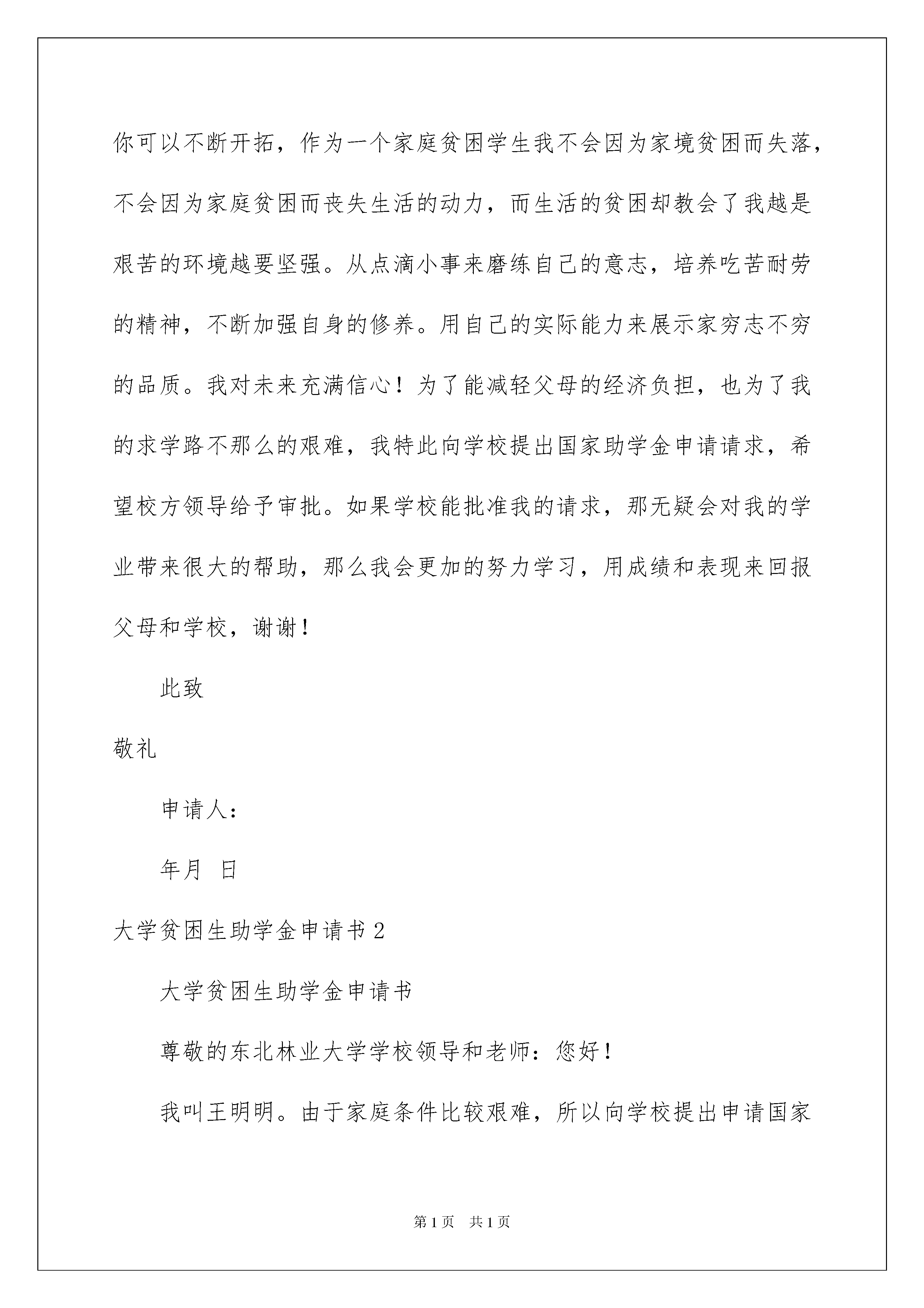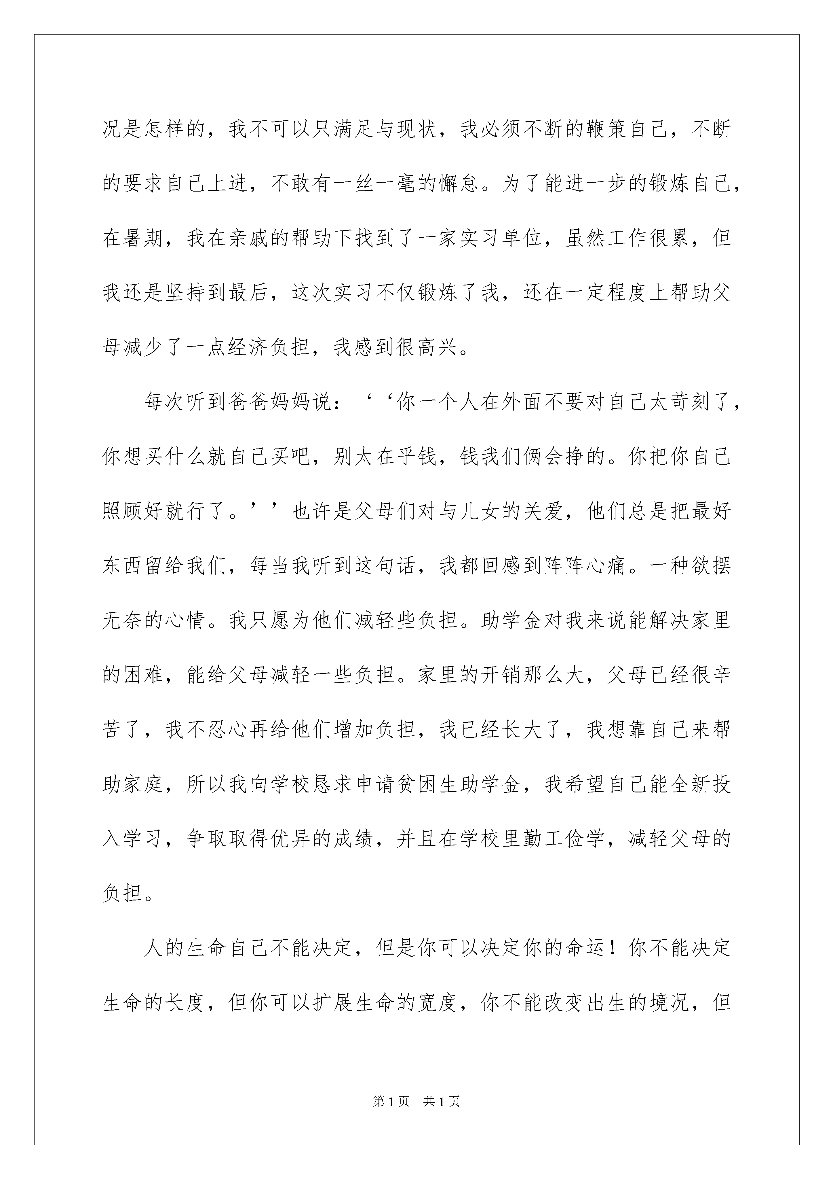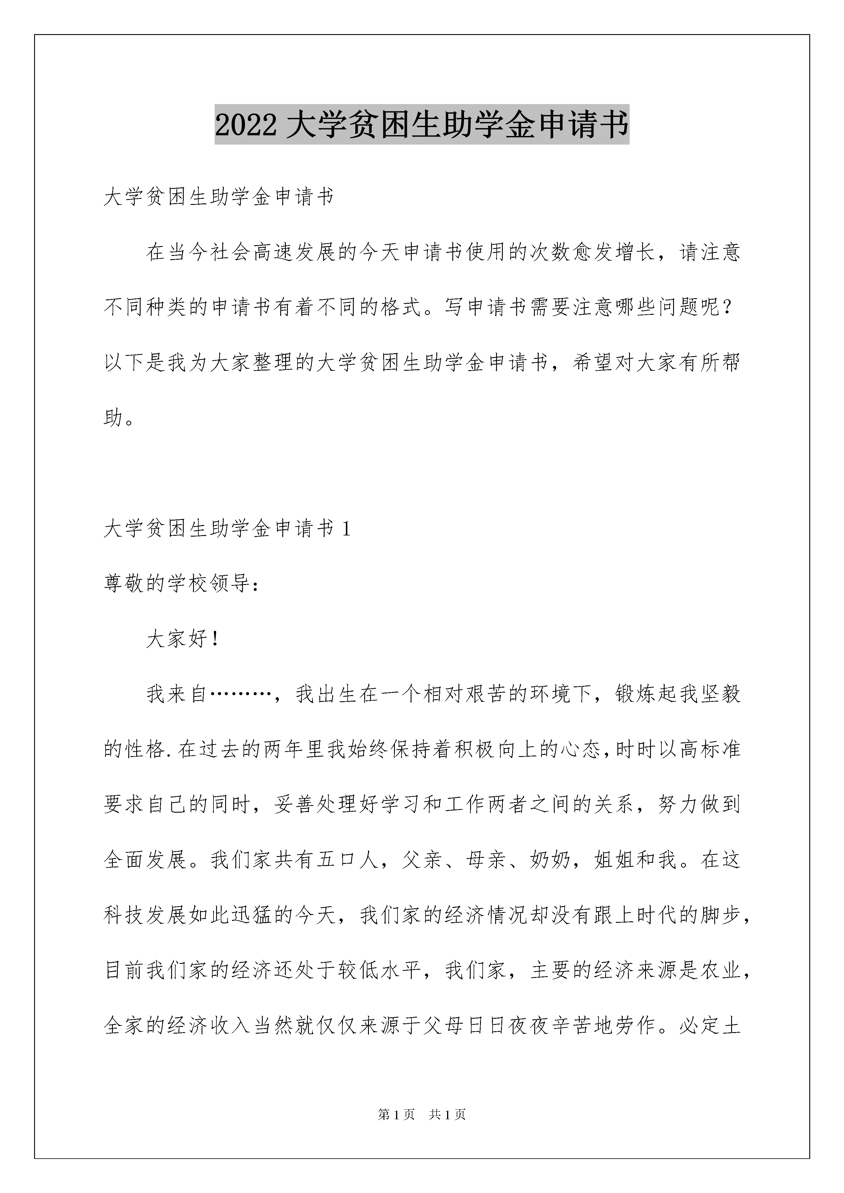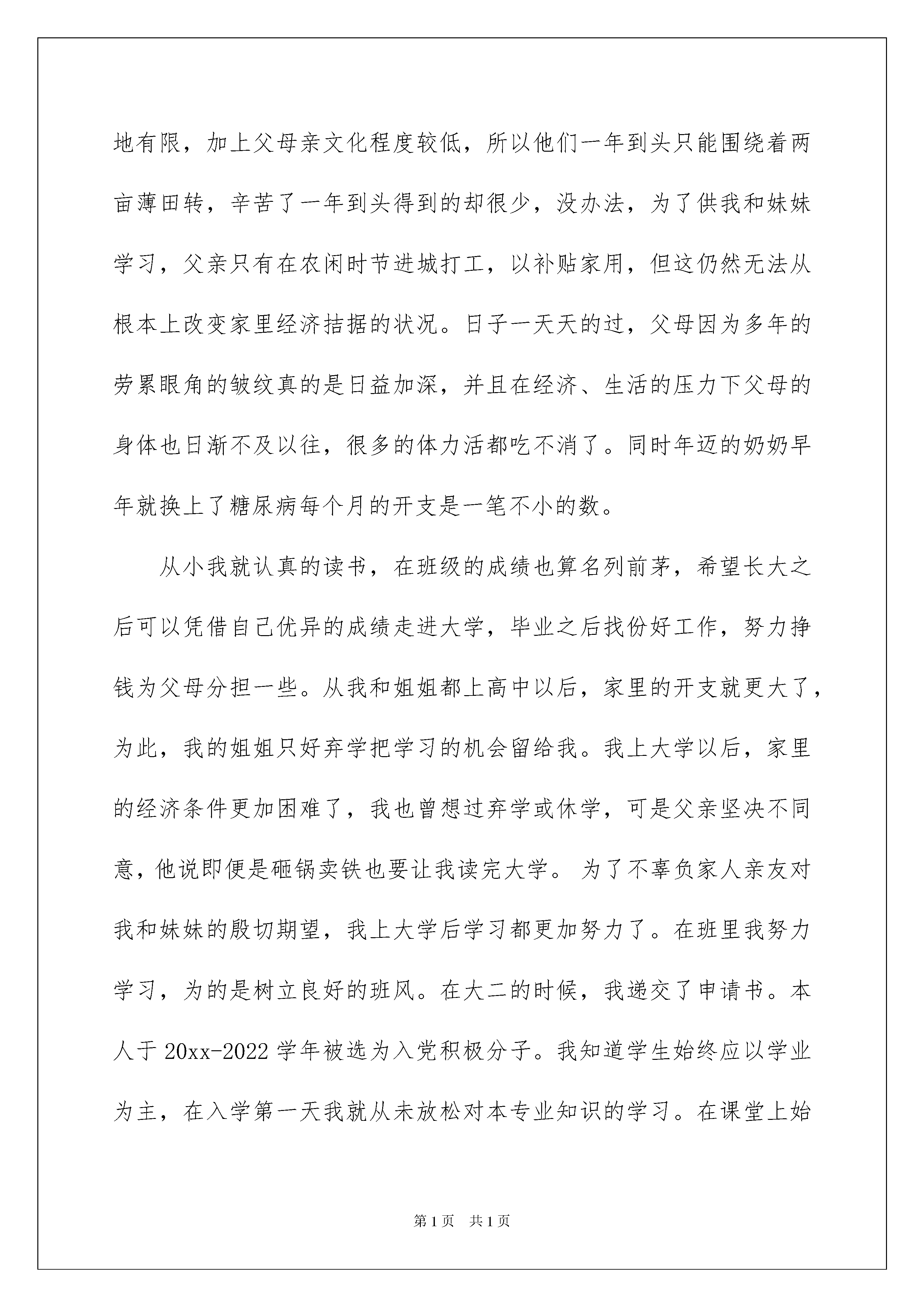 2022大学贫困生助学金申请书大学贫困生助学金申请书在当今社会高速发展的今天申请书使用的次数愈发增长,请注意不同种类的申请书有着不同的格式。写申请书需要注意哪些问题呢?以下是我为大家整理的大学贫困生助学金申请书,希望对大家有所帮助。大学贫困生助学金申请书1尊敬的学校领导:大家好!我来自………,我出生在一个相对艰苦的环境下,锻炼起我坚毅的性格.在过去的两年里我始终保持着积极向上的心态,时时以高标准要求自己的同时,妥善处理好学习和工作两者之间的关系,努力做到全面发展。我们家共有五口人,父亲、母亲、奶奶,姐姐和我。在这科技发展如此迅猛的今天,我们家的经济情况却没有跟上时代的脚步,目前我们家的经济还处于较低水平,我们家,主要的经济来源是农业,全家的经济收入当然就仅仅来源于父母日日夜夜辛苦地劳作。必定土地有限,加上父母亲文化程度较低,所以他们一年到头只能围绕着两亩薄田转,辛苦了一年到头得到的却很少,没办法,为了供我和妹妹学习,父亲只有在农闲时节进城打工,以补贴家用,但这仍然无法从根本上改变家里经济拮据的状况。日子一天天的过,父母因为多年的劳累眼角的皱纹真的是日益加深,并且在经济、生活的压力下父母的身体也日渐不及以往,很多的体力活都吃不消了。同时年迈的奶奶早年就换上了糖尿病每个月的开支是一笔不小的数。从小我就认真的读书,在班级的成绩也算名列前茅,希望长大之后可以凭借自己优异的成绩走进大学,毕业之后找份好工作,努力挣钱为父母分担一些。从我和姐姐都上高中以后,家里的开支就更大了,为此,我的姐姐只好弃学把学习的机会留给我。我上大学以后,家里的经济条件更加困难了,我也曾想过弃学或休学,可是父亲坚决不同意,他说即便是砸锅卖铁也要让我读完大学。为了不辜负家人亲友对我和妹妹的殷切期望,我上大学后学习都更加努力了。在班里我努力学习,为的是树立良好的班风。在大二的时候,我递交了申请书。本人于20xx-2022学年被选为入党积极分子。我知道学生始终应以学业为主,在入学第一天我就从未放松对本专业知识的学习。在课堂上始终保持端正、谦虚的学习态度,积极配合老师教学,努力提高自己的专业知识水平;课下虚心向同学请教,认真预习及完成老师所留的作业。通过不懈的努力我的成绩逐步的得到提高,经过一年的努力,自己在学习方面有取得了较大的进步,大二时,成绩名列班上第一,在学好专业课的同时,我积极地考取各类专业证书先后以优异的成绩通过了英语四级考试六级考试计算机二级考试。与此同时自觉扩展自己各方面的知识,课外长期坚持自学,在空余时间里经常在图书馆或通过上网的方式查阅资料来充实自己,及时补充课堂知识的不足,通过这些拓宽了我的视野,丰富了我的知识。大学期间取得了很大的进步,在成绩和荣誉背后,是学校的发展给我创造的良好条件,是老师的悉心指导与同学的默默支持,也有我踏踏实实的付出和永不言败的执着。生活情况:我朴素节俭,严于律己,宽于待人,尊敬师长,并在平时积极和同学交流沟通、融洽和睦地相处。大学的学习生活,是我人生中一个极为重要的阶段,在这期间,我不与同学比吃穿,只比在大学学到了什么、学到了多少,在各个方面都获得了巨大的进步,综合素质得到了很大的提高。在荣誉和成绩面前,我从来不敢骄傲,因为我知道自己的家庭状况是怎样的,我不可以只满足与现状,我必须不断的鞭策自己,不断的要求自己上进,不敢有一丝一毫的懈怠。为了能进一步的锻炼自己,在暑期,我在亲戚的帮助下找到了一家实习单位,虽然工作很累,但我还是坚持到最后,这次实习不仅锻炼了我,还在一定程度上帮助父母减少了一点经济负担,我感到很高兴。每次听到爸爸妈妈说:‘‘你一个人在外面不要对自己太苛刻了,你想买什么就自己买吧,别太在乎钱,钱我们俩会挣的。你把你自己照顾好就行了。’’也许是父母们对与儿女的关爱,他们总是把最好东西留给我们,每当我听到这句话,我都回感到阵阵心痛。一种欲摆无奈的心情。我只愿为他们减轻些负担。助学金对我来说能解决家里的困难,能给父母减轻一些负担。家里的开销那么大,父母已经很辛苦了,我不忍心再给他们增加负担,我已经长大了,我想靠自己来帮助家庭,所以我向学校恳求申请贫困生助学金,我希望自己能全新投入学习,争取取得优异的成绩,并且在学校里勤工俭学,减轻父母的负担。人的生命自己不能决定,但是你可以决定你的命运!你不能决定生命的长度,但你可以扩展生命的宽度,你不能改变出生的境况,但你可以不断开拓,作为一个家庭贫困学生我不会因为家境贫困而失落,不会因为家庭贫困而丧失生活的动力,而生活的贫困却教会了我越是艰苦的环境越要坚强。从点滴小事来磨练自己的意志,培养吃苦耐劳的精神,不断加强自身的修养。用