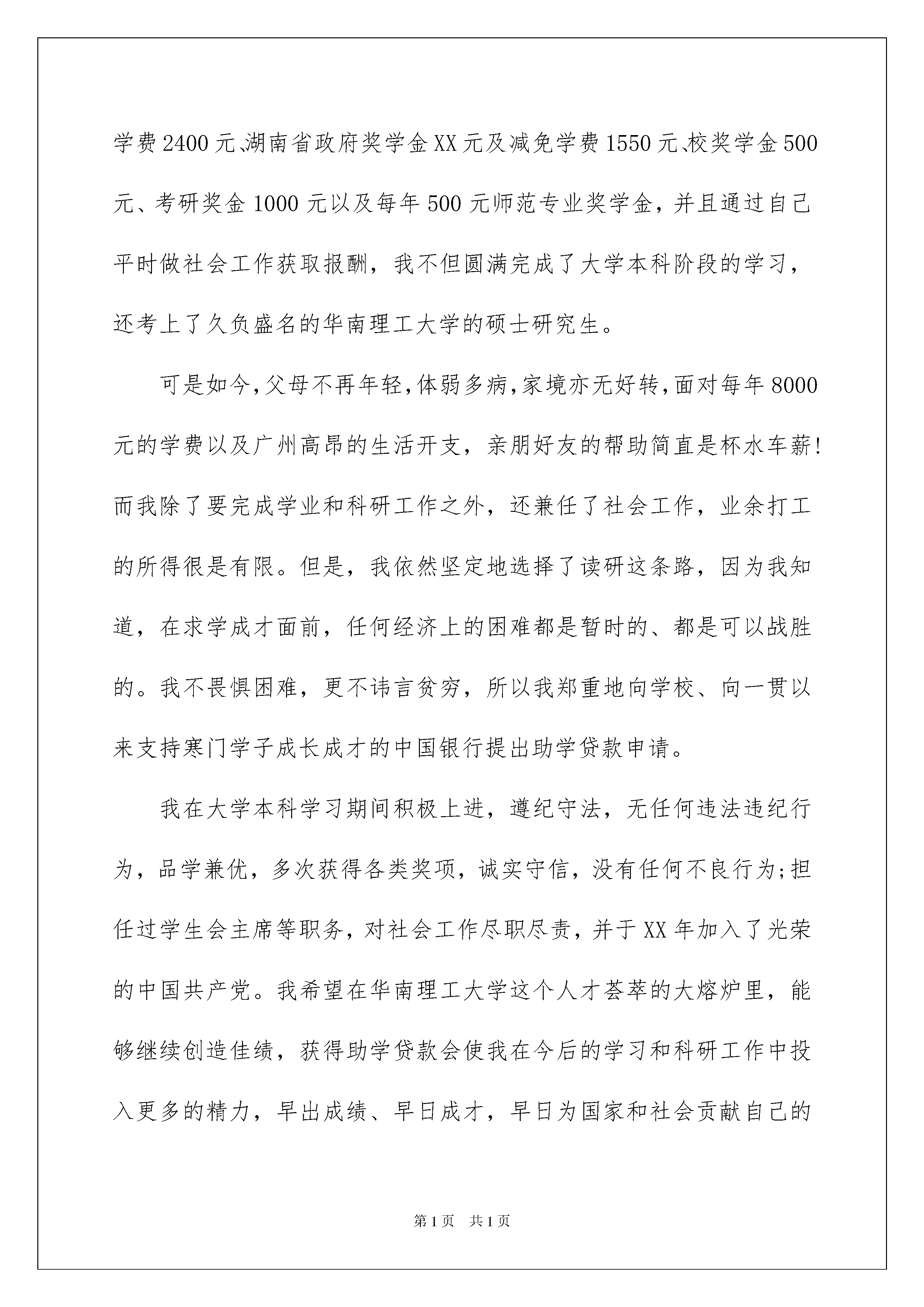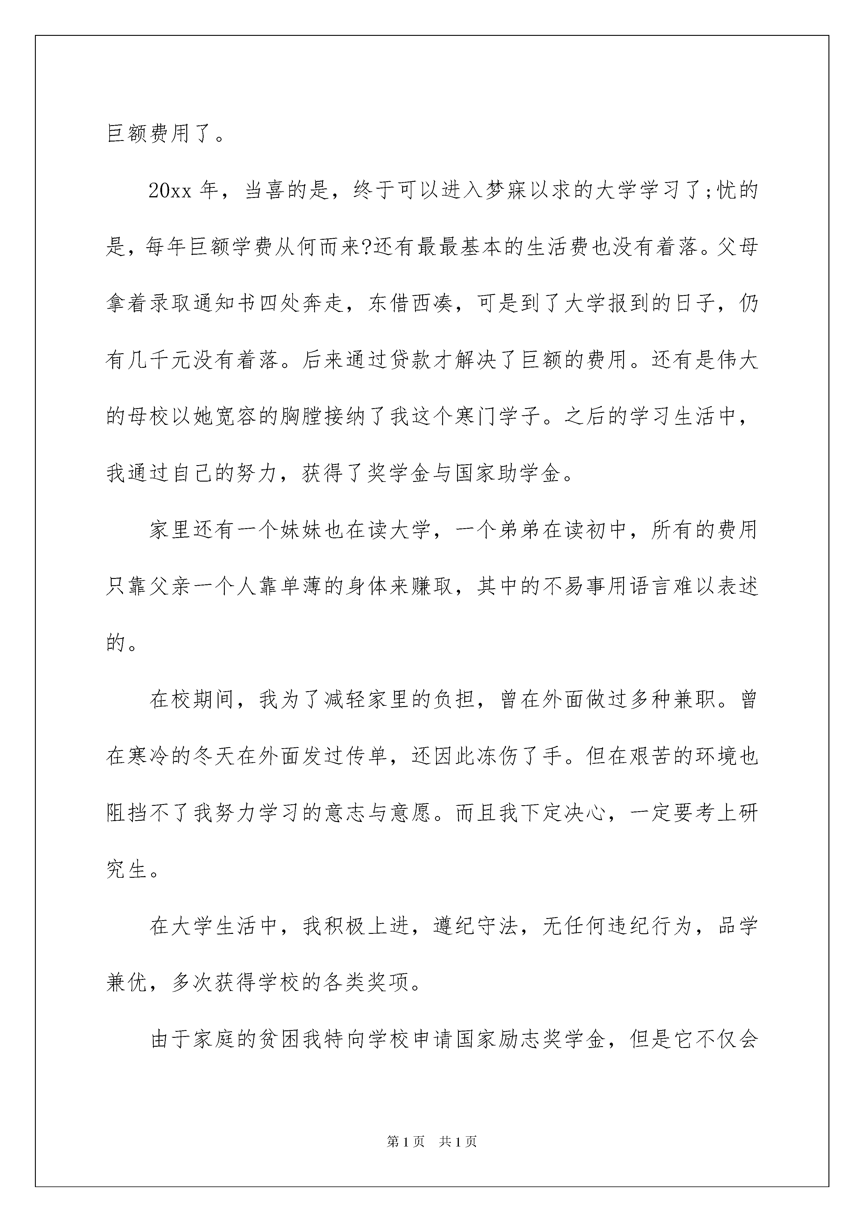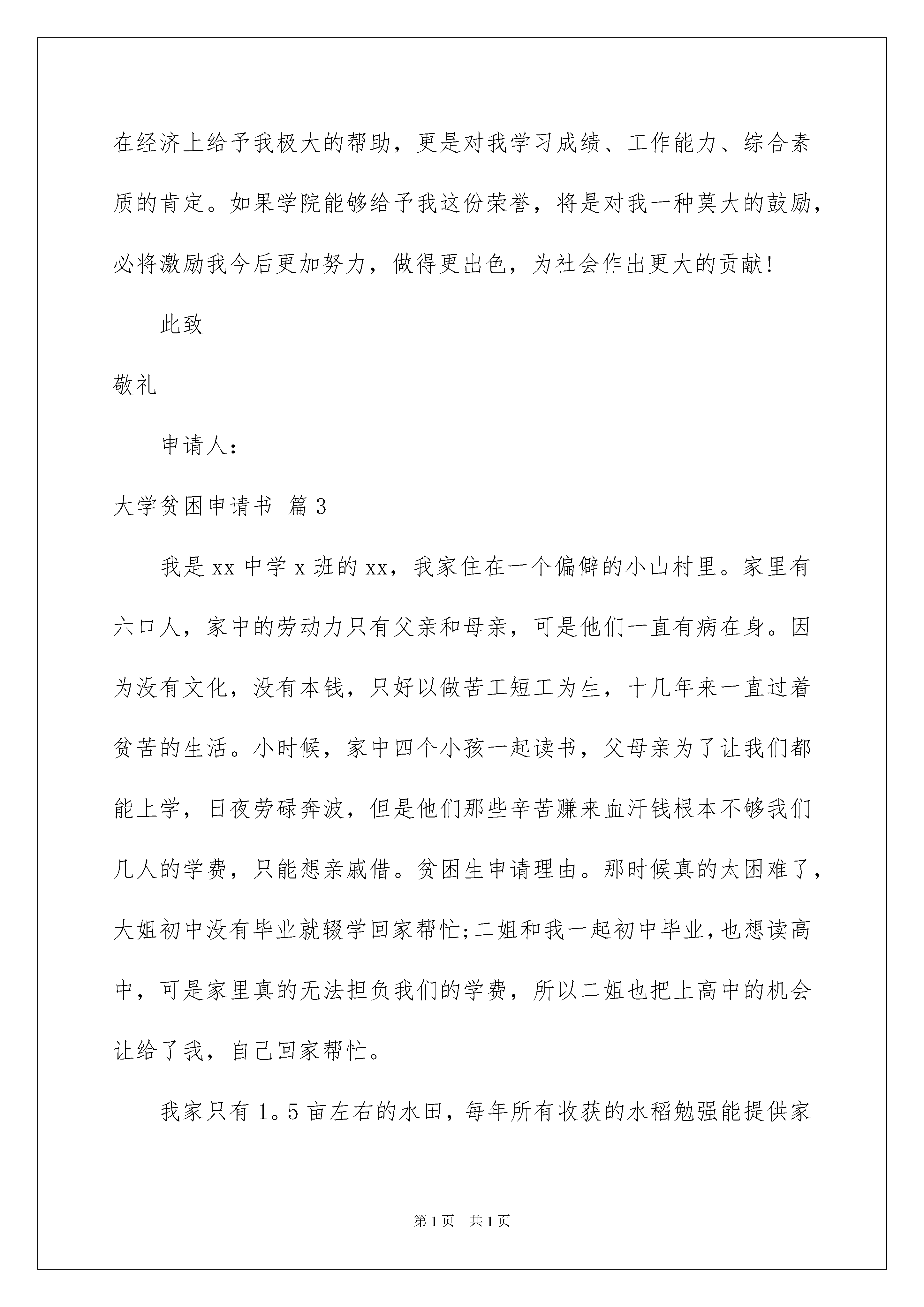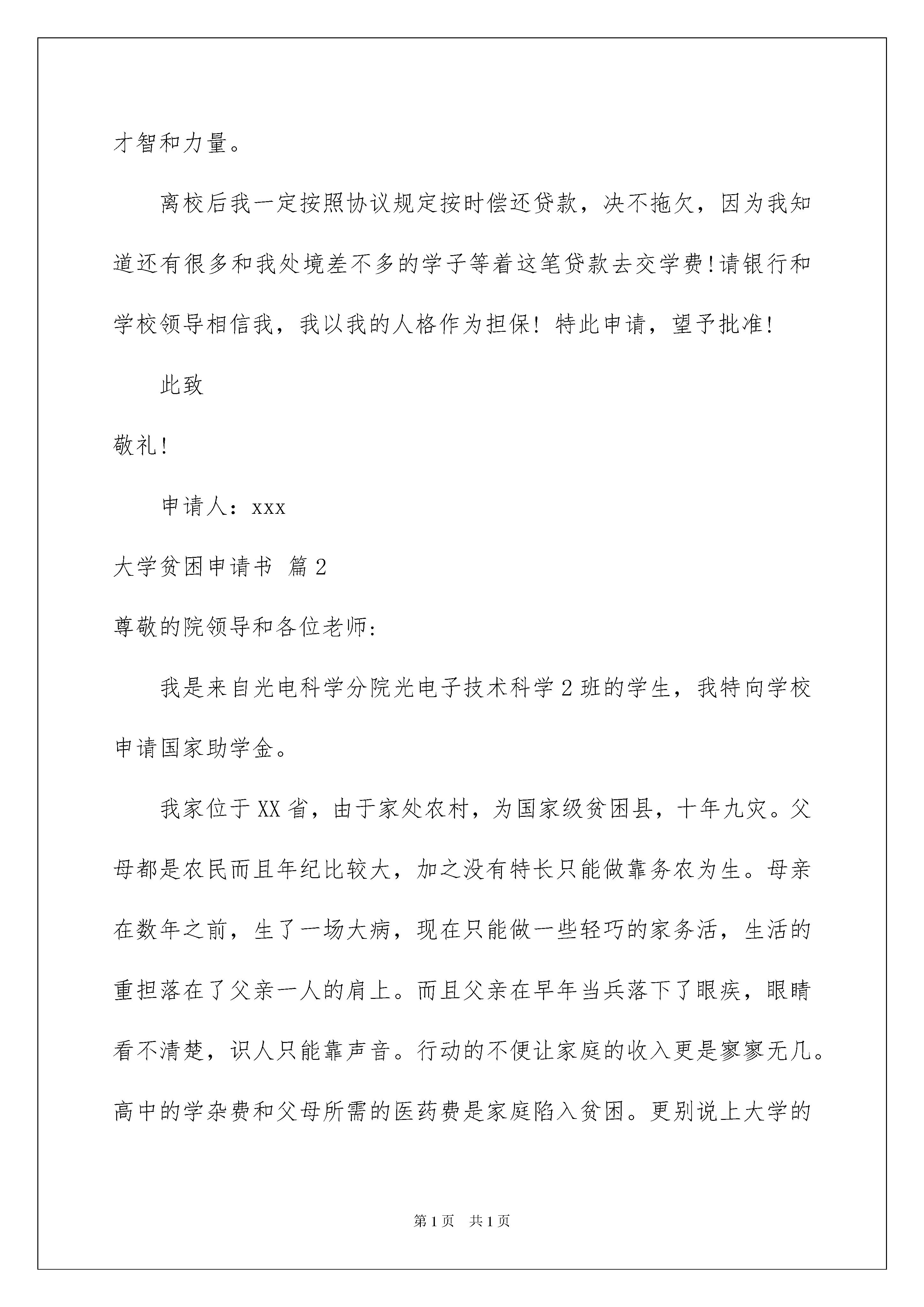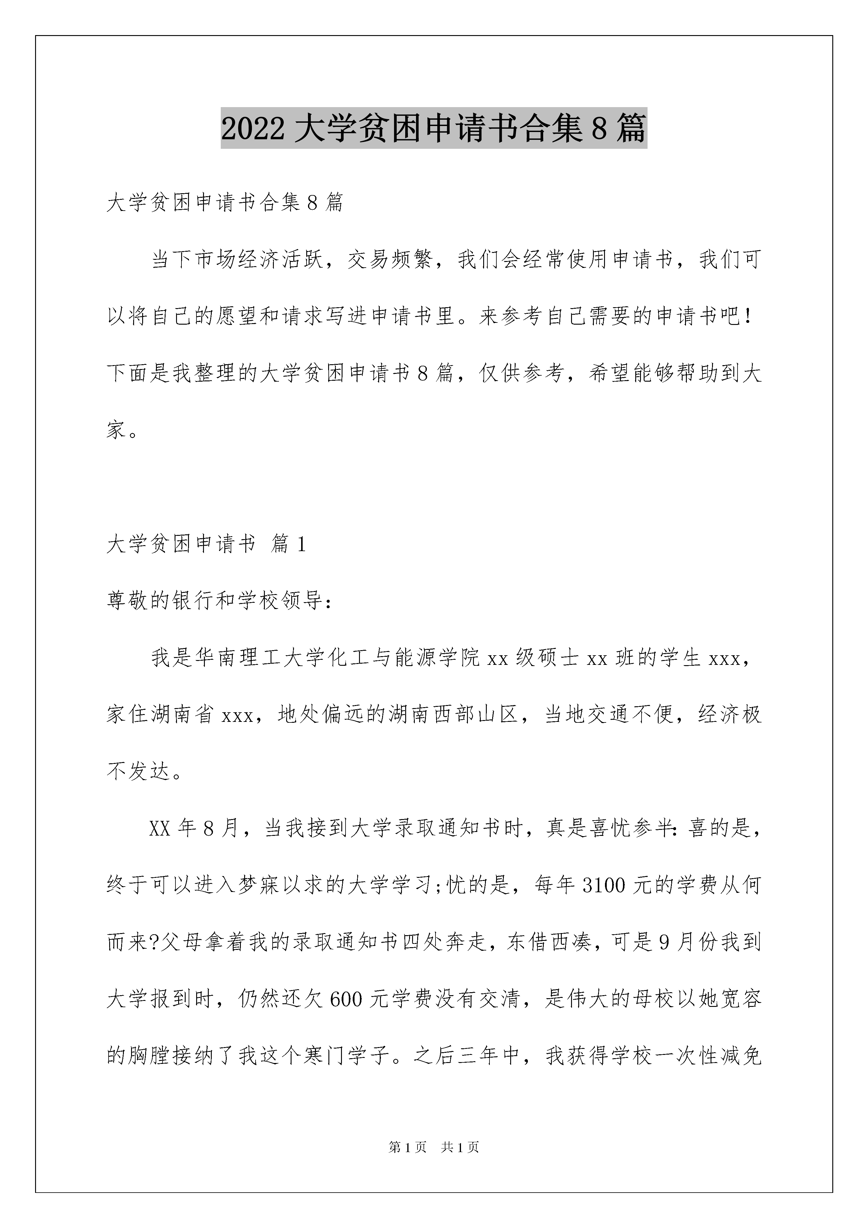 2022大学贫困申请书合集8篇大学贫困申请书合集8篇当下市场经济活跃,交易频繁,我们会经常使用申请书,我们可以将自己的愿望和请求写进申请书里。来参考自己需要的申请书吧!下面是我整理的大学贫困申请书8篇,仅供参考,希望能够帮助到大家。大学贫困申请书篇1尊敬的银行和学校领导:我是华南理工大学化工与能源学院xx级硕士xx班的学生xxx,家住湖南省xxx,地处偏远的湖南西部山区,当地交通不便,经济极不发达。XX年8月,当我接到大学录取通知书时,真是喜忧参半:喜的是,终于可以进入梦寐以求的大学学习;忧的是,每年3100元的学费从何而来?父母拿着我的录取通知书四处奔走,东借西凑,可是9月份我到大学报到时,仍然还欠600元学费没有交清,是伟大的母校以她宽容的胸膛接纳了我这个寒门学子。之后三年中,我获得学校一次性减免学费2400元、湖南省政府奖学金XX元及减免学费1550元、校奖学金500元、考研奖金1000元以及每年500元师范专业奖学金,并且通过自己平时做社会工作获取报酬,我不但圆满完成了大学本科阶段的学习,还考上了久负盛名的华南理工大学的硕士研究生。可是如今,父母不再年轻,体弱多病,家境亦无好转,面对每年8000元的学费以及广州高昂的生活开支,亲朋好友的帮助简直是杯水车薪!而我除了要完成学业和科研工作之外,还兼任了社会工作,业余打工的所得很是有限。但是,我依然坚定地选择了读研这条路,因为我知道,在求学成才面前,任何经济上的困难都是暂时的、都是可以战胜的。我不畏惧困难,更不讳言贫穷,所以我郑重地向学校、向一贯以来支持寒门学子成长成才的中国银行提出助学贷款申请。我在大学本科学习期间积极上进,遵纪守法,无任何违法违纪行为,品学兼优,多次获得各类奖项,诚实守信,没有任何不良行为;担任过学生会主席等职务,对社会工作尽职尽责,并于XX年加入了光荣的中国共产党。我希望在华南理工大学这个人才荟萃的大熔炉里,能够继续创造佳绩,获得助学贷款会使我在今后的学习和科研工作中投入更多的精力,早出成绩、早日成才,早日为国家和社会贡献自己的才智和力量。离校后我一定按照协议规定按时偿还贷款,决不拖欠,因为我知道还有很多和我处境差不多的学子等着这笔贷款去交学费!请银行和学校领导相信我,我以我的人格作为担保!特此申请,望予批准!此致敬礼!申请人:xxx大学贫困申请书篇2尊敬的院领导和各位老师:我是来自光电科学分院光电子技术科学2班的学生,我特向学校申请国家助学金。我家位于XX省,由于家处农村,为国家级贫困县,十年九灾。父母都是农民而且年纪比较大,加之没有特长只能做靠务农为生。母亲在数年之前,生了一场大病,现在只能做一些轻巧的家务活,生活的重担落在了父亲一人的肩上。而且父亲在早年当兵落下了眼疾,眼睛看不清楚,识人只能靠声音。行动的不便让家庭的收入更是寥寥无几。高中的学杂费和父母所需的医药费是家庭陷入贫困。更别说上大学的巨额费用了。20xx年,当喜的是,终于可以进入梦寐以求的大学学习了;忧的是,每年巨额学费从何而来?还有最最基本的生活费也没有着落。父母拿着录取通知书四处奔走,东借西凑,可是到了大学报到的日子,仍有几千元没有着落。后来通过贷款才解决了巨额的费用。还有是伟大的母校以她宽容的胸膛接纳了我这个寒门学子。之后的学习生活中,我通过自己的努力,获得了奖学金与国家助学金。家里还有一个妹妹也在读大学,一个弟弟在读初中,所有的费用只靠父亲一个人靠单薄的身体来赚取,其中的不易事用语言难以表述的。在校期间,我为了减轻家里的负担,曾在外面做过多种兼职。曾在寒冷的冬天在外面发过传单,还因此冻伤了手。但在艰苦的环境也阻挡不了我努力学习的意志与意愿。而且我下定决心,一定要考上研究生。在大学生活中,我积极上进,遵纪守法,无任何违纪行为,品学兼优,多次获得学校的各类奖项。由于家庭的贫困我特向学校申请国家励志奖学金,但是它不仅会在经济上给予我极大的帮助,更是对我学习成绩、工作能力、综合素质的肯定。如果学院能够给予我这份荣誉,将是对我一种莫大的鼓励,必将激励我今后更加努力,做得更出色,为社会作出更大的贡献!此致敬礼申请人:大学贫困申请书篇3我是xx中学x班的xx,我家住在一个偏僻的小山村里。家里有六口人,家中的劳动力只有父亲和母亲,可是他们一直有病在身。因为没有文化,没有本钱,只好以做苦工短工为生,十几年来一直过着贫苦的生活。小时候,家中四个小孩一起读书,父母亲为了让我们都能上学,日夜劳碌奔波,但是他们那些辛苦赚来血汗钱根本不够我们几人的学费,只能想亲戚借。贫困生申请理由。那时候真的太困难了,大姐初中没有毕业就辍学回家帮忙;二姐和我一起初中毕业
