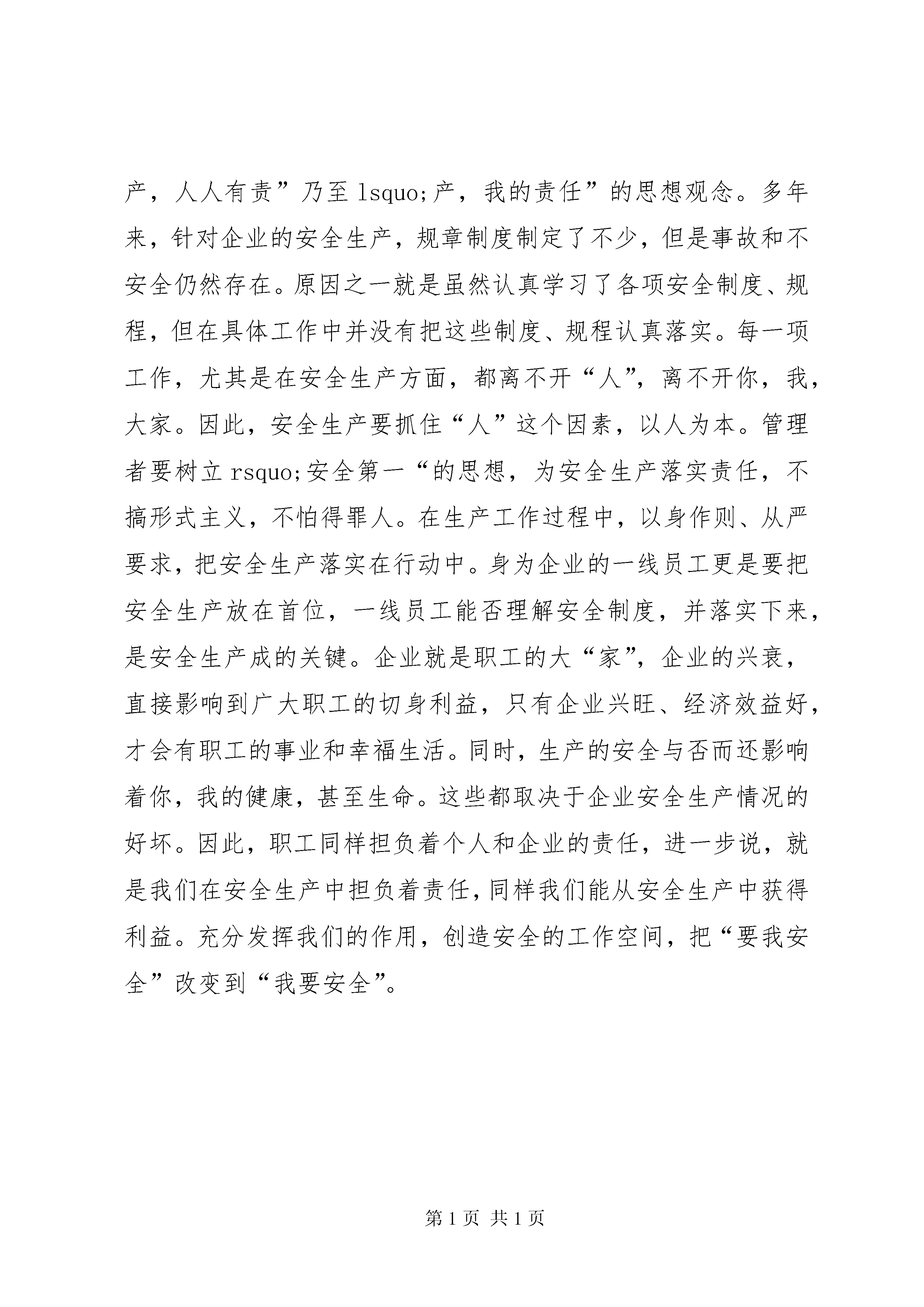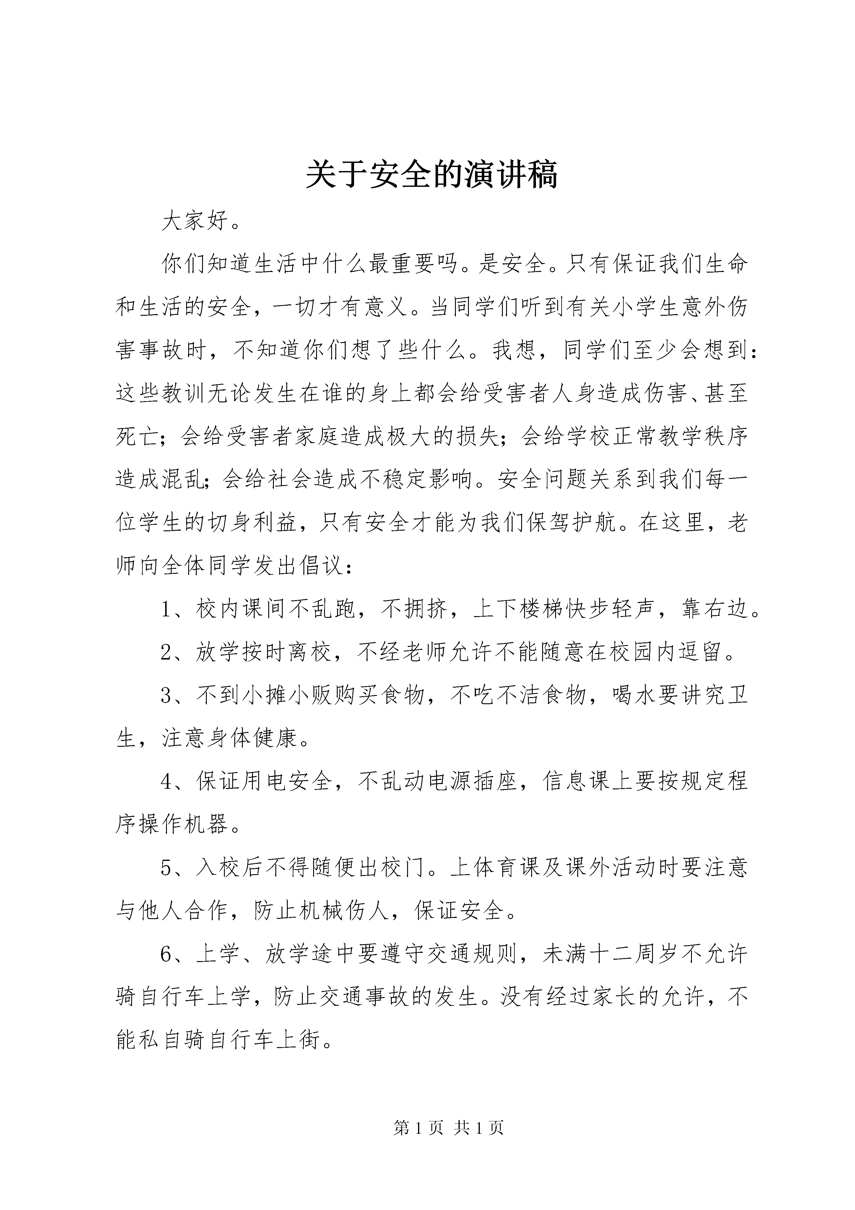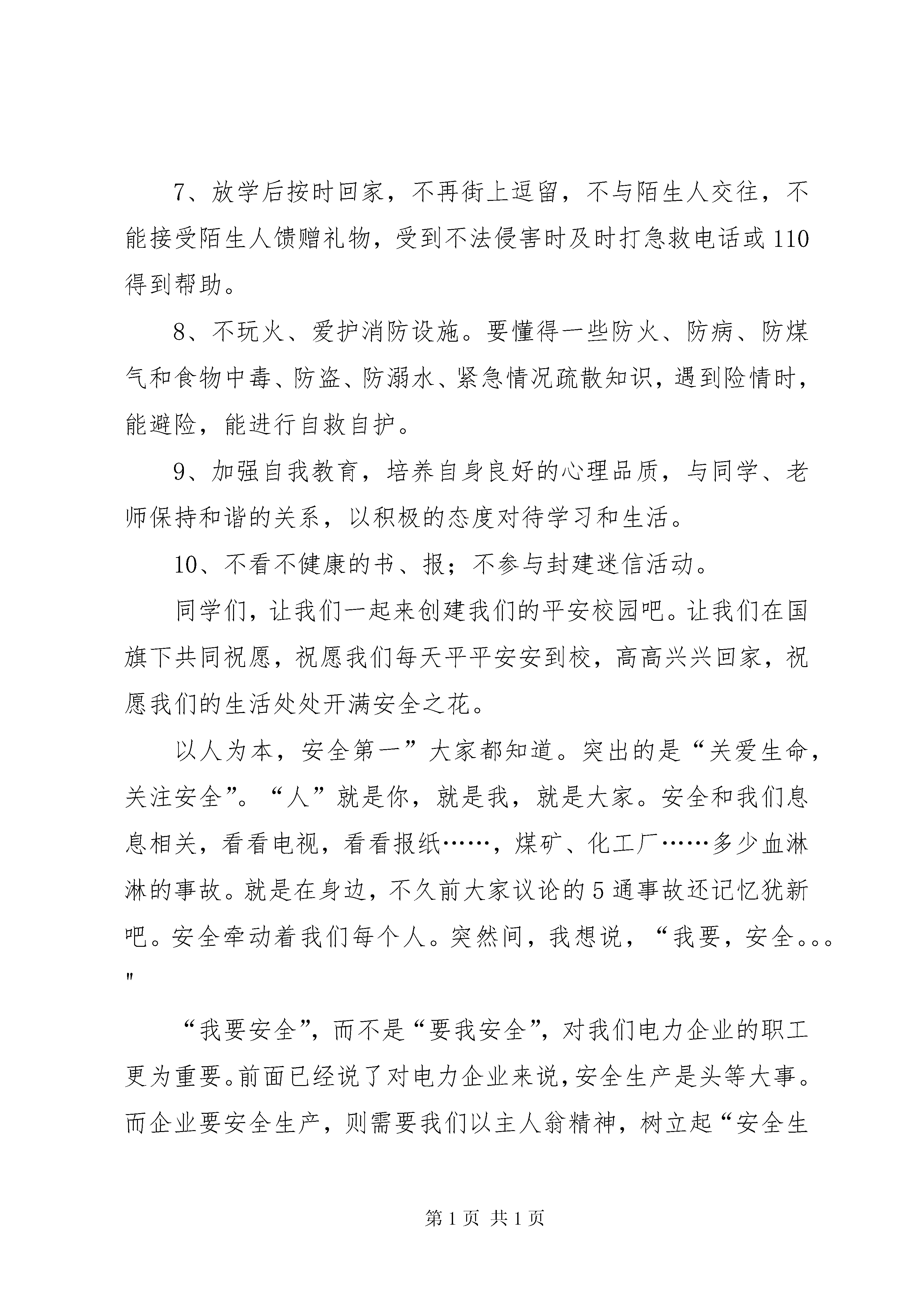 关于安全的演讲稿大家好。你们知道生活中什么最重要吗。是安全。只有保证我们生命和生活的安全,一切才有意义。当同学们听到有关小学生意外伤害事故时,不知道你们想了些什么。我想,同学们至少会想到:这些教训无论发生在谁的身上都会给受害者人身造成伤害、甚至死亡;会给受害者家庭造成极大的损失;会给学校正常教学秩序造成混乱;会给社会造成不稳定影响。安全问题关系到我们每一位学生的切身利益,只有安全才能为我们保驾护航。在这里,老师向全体同学发出倡议:1、校内课间不乱跑,不拥挤,上下楼梯快步轻声,靠右边。2、放学按时离校,不经老师允许不能随意在校园内逗留。3、不到小摊小贩购买食物,不吃不洁食物,喝水要讲究卫生,注意身体健康。4、保证用电安全,不乱动电源插座,信息课上要按规定程序操作机器。5、入校后不得随便出校门。上体育课及课外活动时要注意与他人合作,防止机械伤人,保证安全。6、上学、放学途中要遵守交通规则,未满十二周岁不允许骑自行车上学,防止交通事故的发生。没有经过家长的允许,不能私自骑自行车上街。7、放学后按时回家,不再街上逗留,不与陌生人交往,不能接受陌生人馈赠礼物,受到不法侵害时及时打急救电话或110得到帮助。8、不玩火、爱护消防设施。要懂得一些防火、防病、防煤气和食物中毒、防盗、防溺水、紧急情况疏散知识,遇到险情时,能避险,能进行自救自护。9、加强自我教育,培养自身良好的心理品质,与同学、老师保持和谐的关系,以积极的态度对待学习和生活。10、不看不健康的书、报;不参与封建迷信活动。同学们,让我们一起来创建我们的平安校园吧。让我们在国旗下共同祝愿,祝愿我们每天平平安安到校,高高兴兴回家,祝愿我们的生活处处开满安全之花。以人为本,安全第一”大家都知道。突出的是“关爱生命,关注安全”。“人”就是你,就是我,就是大家。安全和我们息息相关,看看电视,看看报纸……,煤矿、化工厂……多少血淋淋的事故。就是在身边,不久前大家议论的5通事故还记忆犹新吧。安全牵动着我们每个人。突然间,我想说,“我要,安全。。。"“我要安全”,而不是“要我安全”,对我们电力企业的职工更为重要。前面已经说了对电力企业来说,安全生产是头等大事。而企业要安全生产,则需要我们以主人翁精神,树立起“安全生产,人人有责”乃至lsquo;产,我的责任”的思想观念。多年来,针对企业的安全生产,规章制度制定了不少,但是事故和不安全仍然存在。原因之一就是虽然认真学习了各项安全制度、规程,但在具体工作中并没有把这些制度、规程认真落实。每一项工作,尤其是在安全生产方面,都离不开“人”,离不开你,我,大家。因此,安全生产要抓住“人”这个因素,以人为本。管理者要树立rsquo;安全第一“的思想,为安全生产落实责任,不搞形式主义,不怕得罪人。在生产工作过程中,以身作则、从严要求,把安全生产落实在行动中。身为企业的一线员工更是要把安全生产放在首位,一线员工能否理解安全制度,并落实下来,是安全生产成的关键。企业就是职工的大“家”,企业的兴衰,直接影响到广大职工的切身利益,只有企业兴旺、经济效益好,才会有职工的事业和幸福生活。同时,生产的安全与否而还影响着你,我的健康,甚至生命。这些都取决于企业安全生产情况的好坏。因此,职工同样担负着个人和企业的责任,进一步说,就是我们在安全生产中担负着责任,同样我们能从安全生产中获得利益。充分发挥我们的作用,创造安全的工作空间,把“要我安全”改变到“我要安全”。