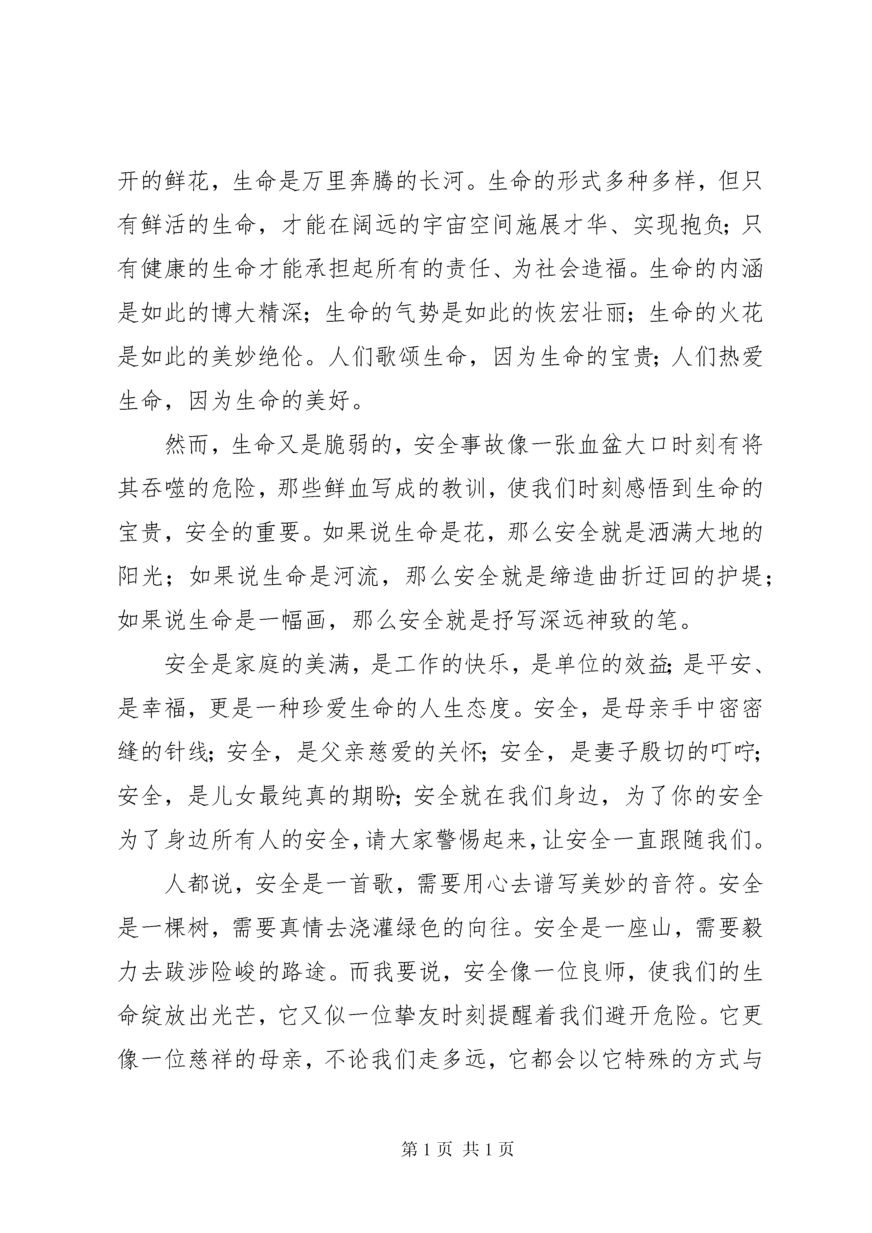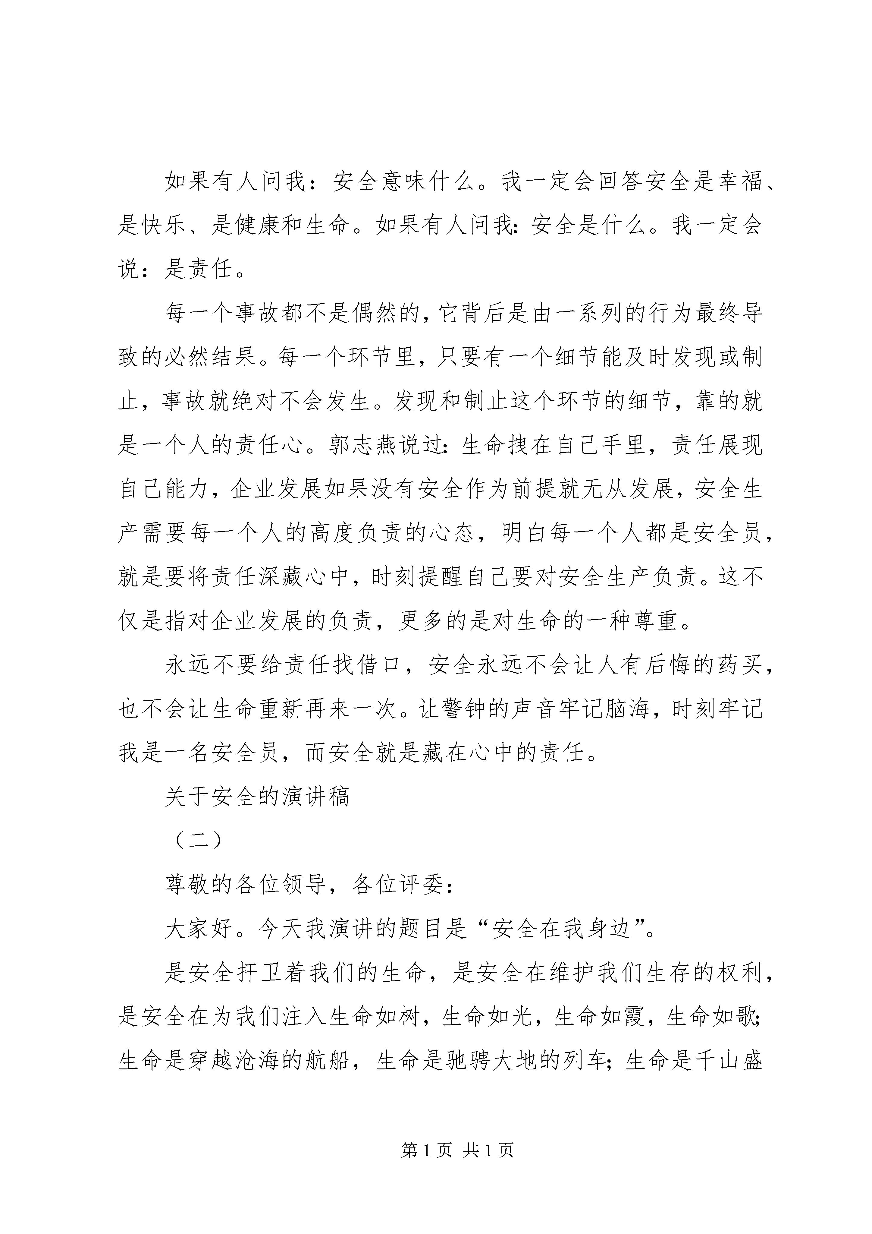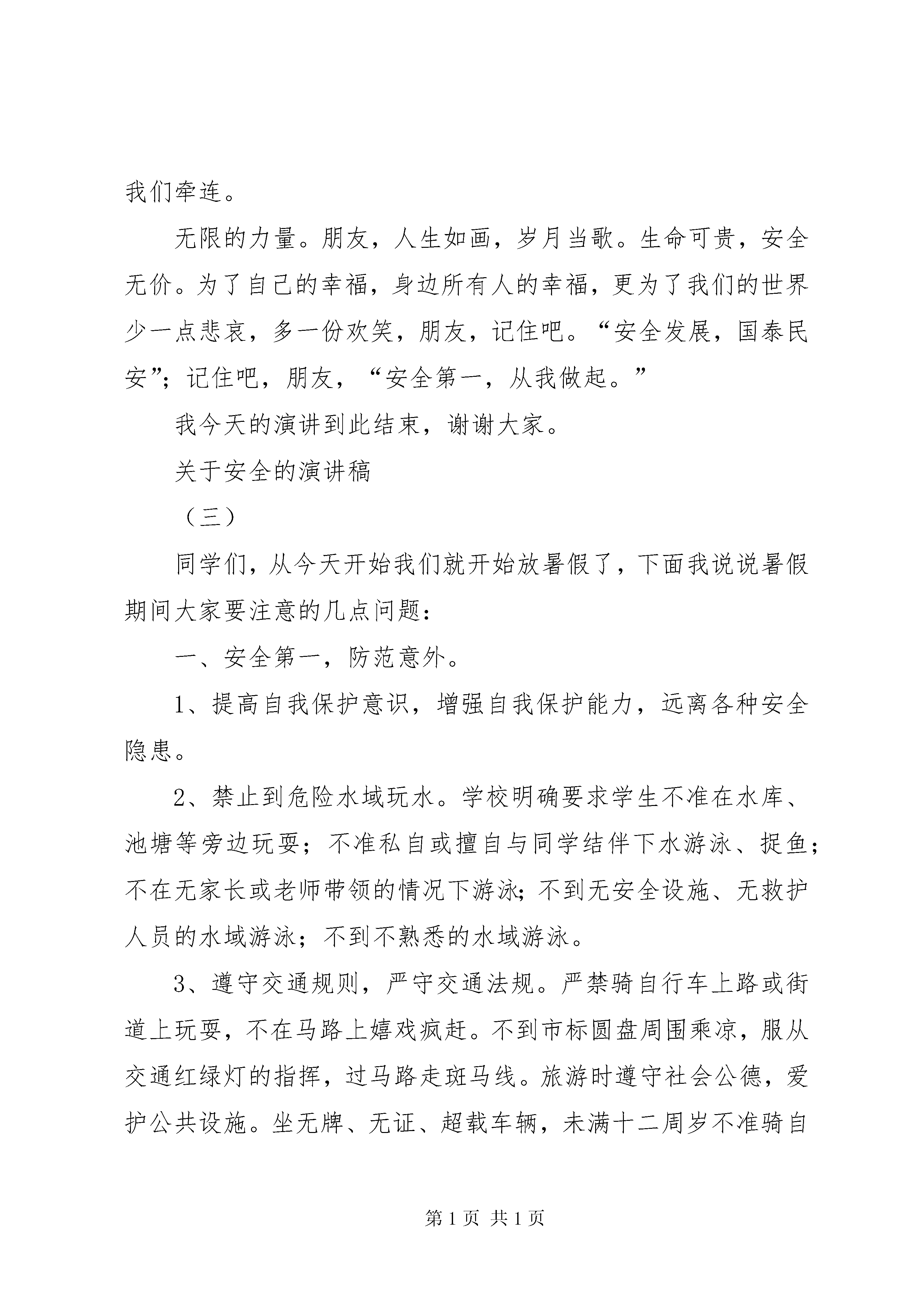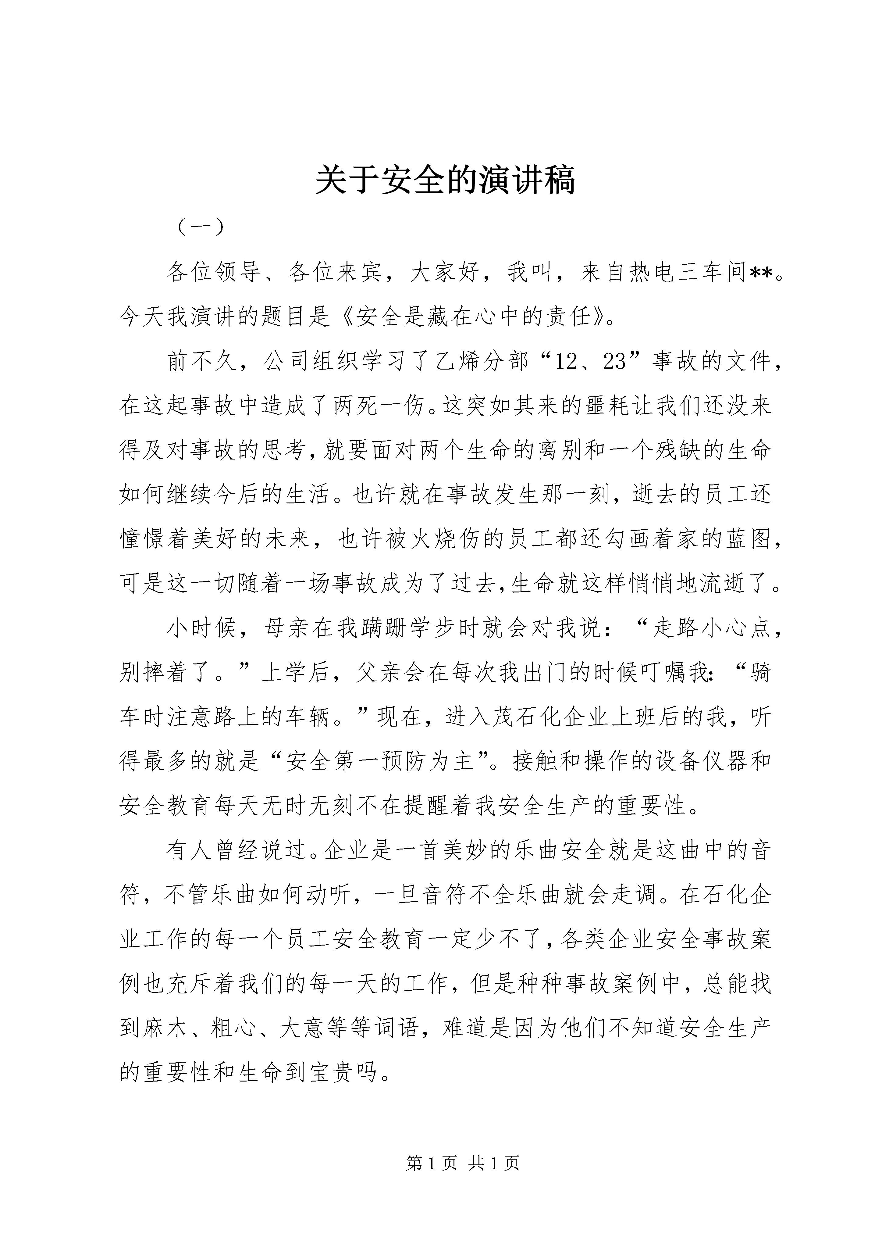关于安全的演讲稿(一)各位领导、各位来宾,大家好,我叫,来自热电三车间**。今天我演讲的题目是《安全是藏在心中的责任》。前不久,公司组织学习了乙烯分部“12、23”事故的文件,在这起事故中造成了两死一伤。这突如其来的噩耗让我们还没来得及对事故的思考,就要面对两个生命的离别和一个残缺的生命如何继续今后的生活。也许就在事故发生那一刻,逝去的员工还憧憬着美好的未来,也许被火烧伤的员工都还勾画着家的蓝图,可是这一切随着一场事故成为了过去,生命就这样悄悄地流逝了。小时候,母亲在我蹒跚学步时就会对我说:“走路小心点,别摔着了。”上学后,父亲会在每次我出门的时候叮嘱我:“骑车时注意路上的车辆。”现在,进入茂石化企业上班后的我,听得最多的就是“安全第一预防为主”。接触和操作的设备仪器和安全教育每天无时无刻不在提醒着我安全生产的重要性。有人曾经说过。企业是一首美妙的乐曲安全就是这曲中的音符,不管乐曲如何动听,一旦音符不全乐曲就会走调。在石化企业工作的每一个员工安全教育一定少不了,各类企业安全事故案例也充斥着我们的每一天的工作,但是种种事故案例中,总能找到麻木、粗心、大意等等词语,难道是因为他们不知道安全生产的重要性和生命到宝贵吗。如果有人问我:安全意味什么。我一定会回答安全是幸福、是快乐、是健康和生命。如果有人问我:安全是什么。我一定会说:是责任。每一个事故都不是偶然的,它背后是由一系列的行为最终导致的必然结果。每一个环节里,只要有一个细节能及时发现或制止,事故就绝对不会发生。发现和制止这个环节的细节,靠的就是一个人的责任心。郭志燕说过:生命拽在自己手里,责任展现自己能力,企业发展如果没有安全作为前提就无从发展,安全生产需要每一个人的高度负责的心态,明白每一个人都是安全员,就是要将责任深藏心中,时刻提醒自己要对安全生产负责。这不仅是指对企业发展的负责,更多的是对生命的一种尊重。永远不要给责任找借口,安全永远不会让人有后悔的药买,也不会让生命重新再来一次。让警钟的声音牢记脑海,时刻牢记我是一名安全员,而安全就是藏在心中的责任。关于安全的演讲稿(二)尊敬的各位领导,各位评委:大家好。今天我演讲的题目是“安全在我身边”。是安全扞卫着我们的生命,是安全在维护我们生存的权利,是安全在为我们注入生命如树,生命如光,生命如霞,生命如歌;生命是穿越沧海的航船,生命是驰骋大地的列车;生命是千山盛开的鲜花,生命是万里奔腾的长河。生命的形式多种多样,但只有鲜活的生命,才能在阔远的宇宙空间施展才华、实现抱负;只有健康的生命才能承担起所有的责任、为社会造福。生命的内涵是如此的博大精深;生命的气势是如此的恢宏壮丽;生命的火花是如此的美妙绝伦。人们歌颂生命,因为生命的宝贵;人们热爱生命,因为生命的美好。然而,生命又是脆弱的,安全事故像一张血盆大口时刻有将其吞噬的危险,那些鲜血写成的教训,使我们时刻感悟到生命的宝贵,安全的重要。如果说生命是花,那么安全就是洒满大地的阳光;如果说生命是河流,那么安全就是缔造曲折迂回的护堤;如果说生命是一幅画,那么安全就是抒写深远神致的笔。安全是家庭的美满,是工作的快乐,是单位的效益;是平安、是幸福,更是一种珍爱生命的人生态度。安全,是母亲手中密密缝的针线;安全,是父亲慈爱的关怀;安全,是妻子殷切的叮咛;安全,是儿女最纯真的期盼;安全就在我们身边,为了你的安全为了身边所有人的安全,请大家警惕起来,让安全一直跟随我们。人都说,安全是一首歌,需要用心去谱写美妙的音符。安全是一棵树,需要真情去浇灌绿色的向往。安全是一座山,需要毅力去跋涉险峻的路途。而我要说,安全像一位良师,使我们的生命绽放出光芒,它又似一位挚友时刻提醒着我们避开危险。它更像一位慈祥的母亲,不论我们走多远,它都会以它特殊的方式与我们牵连。无限的力量。朋友,人生如画,岁月当歌。生命可贵,安全无价。为了自己的幸福,身边所有人的幸福,更为了我们的世界少一点悲哀,多一份欢笑,朋友,记住吧。“安全发展,国泰民安”;记住吧,朋友,“安全第一,从我做起。”我今天的演讲到此结束,谢谢大家。关于安全的演讲稿(三)同学们,从今天开始我们就开始放暑假了,下面我说说暑假期间大家要注意的几点问题:一、安全第一,防范意外。1、提高自我保护意识,增强自我保护能力,远离各种安全隐患。2、禁止到危险水域玩水。学校明确要求学生不准在水库、池塘等旁边玩耍;不准私自或擅自与同学结伴下水游泳、捉鱼;不在无家长或老师带领的情况下游泳;不到无安全设施、无救护人员的水域游泳;不到不熟悉的水域游泳。3、遵守交通规则,严守交通法规。严禁骑自行车上路或街道上玩耍,不在马路上嬉戏疯赶。不到市标圆盘周围乘凉,服从交通红绿灯的指挥,过马路走斑马线。旅游时遵守社会公德,爱护公共设施。坐无牌、无证、超载车辆,未满十二周岁不准